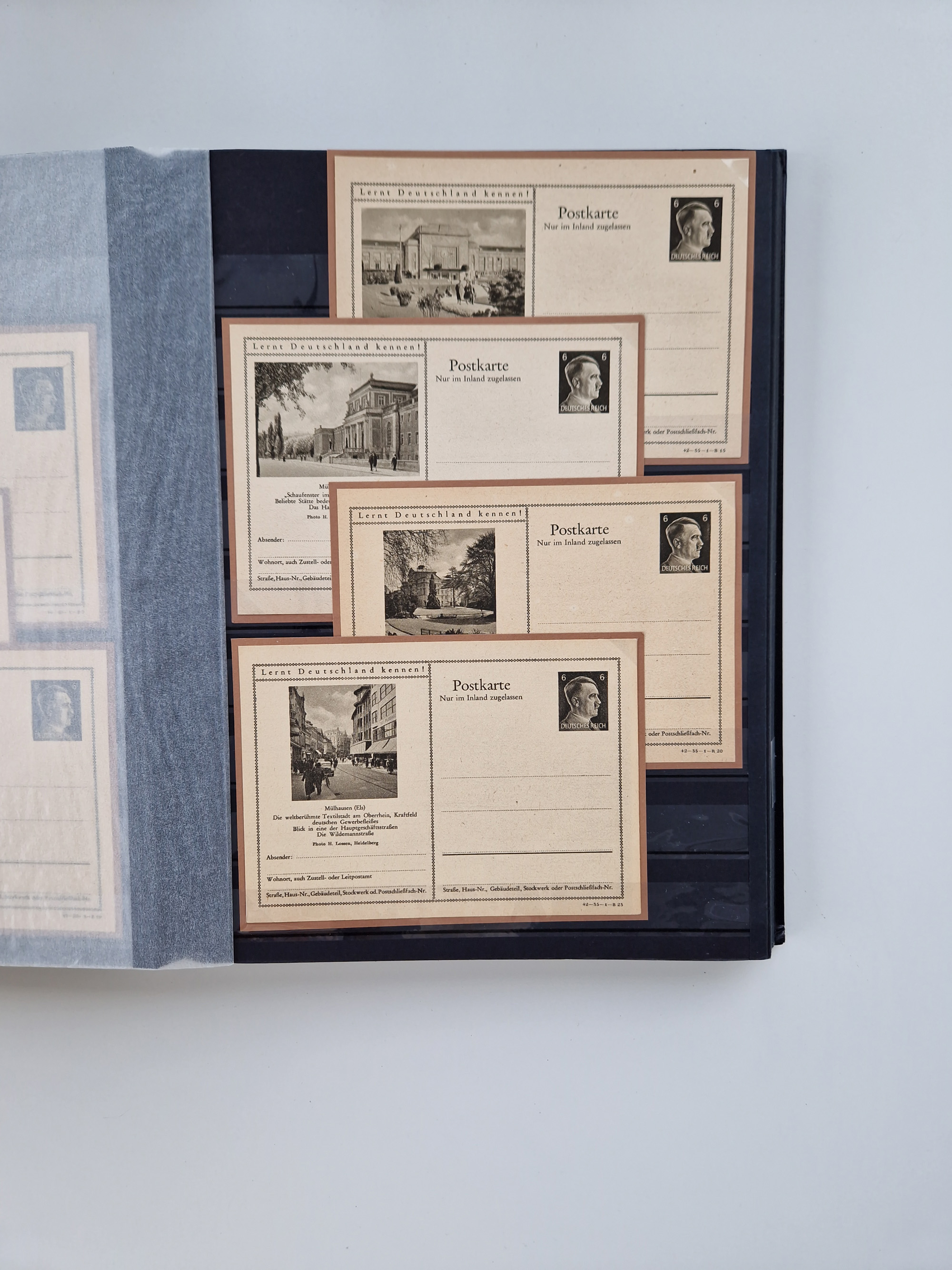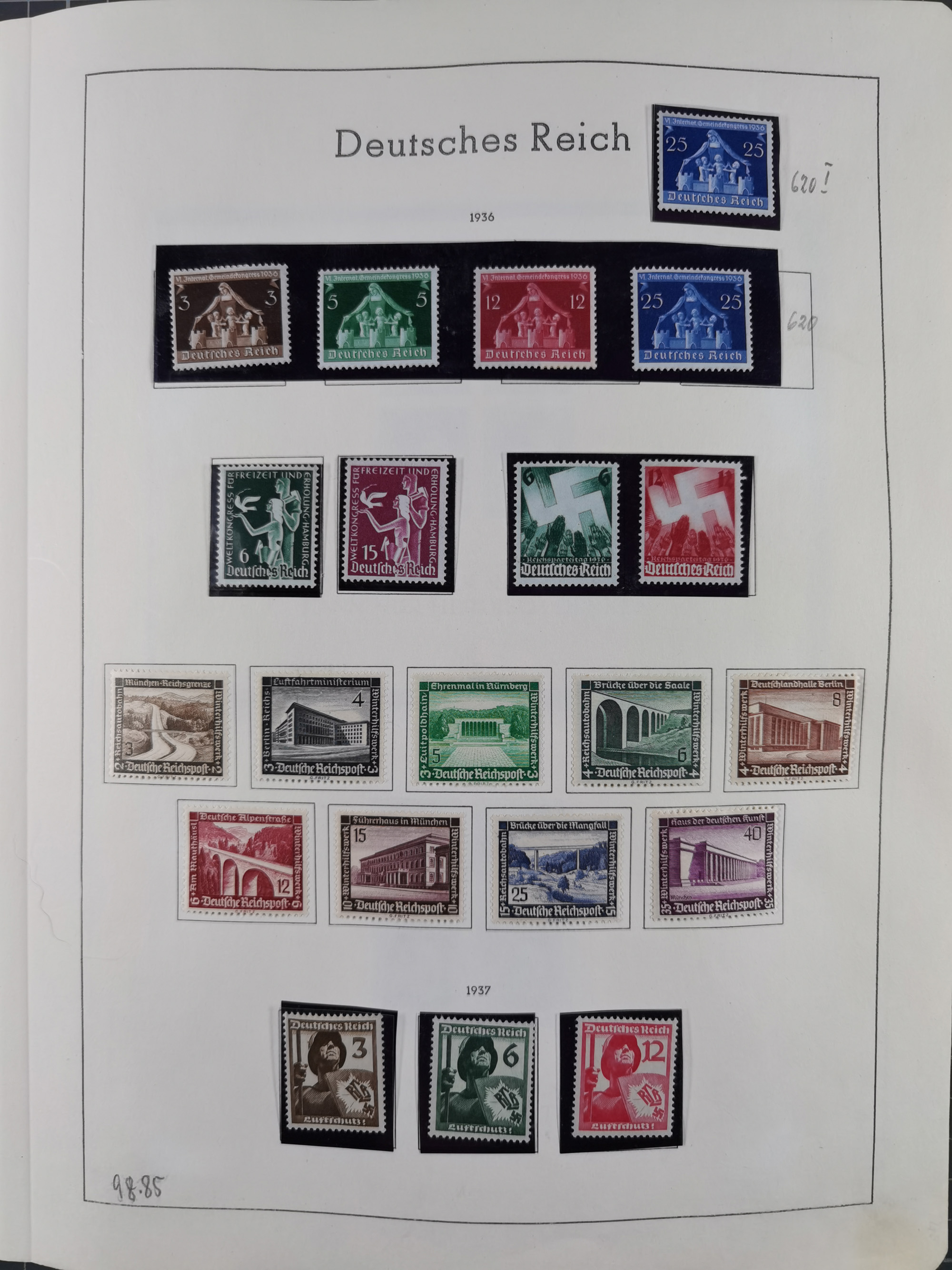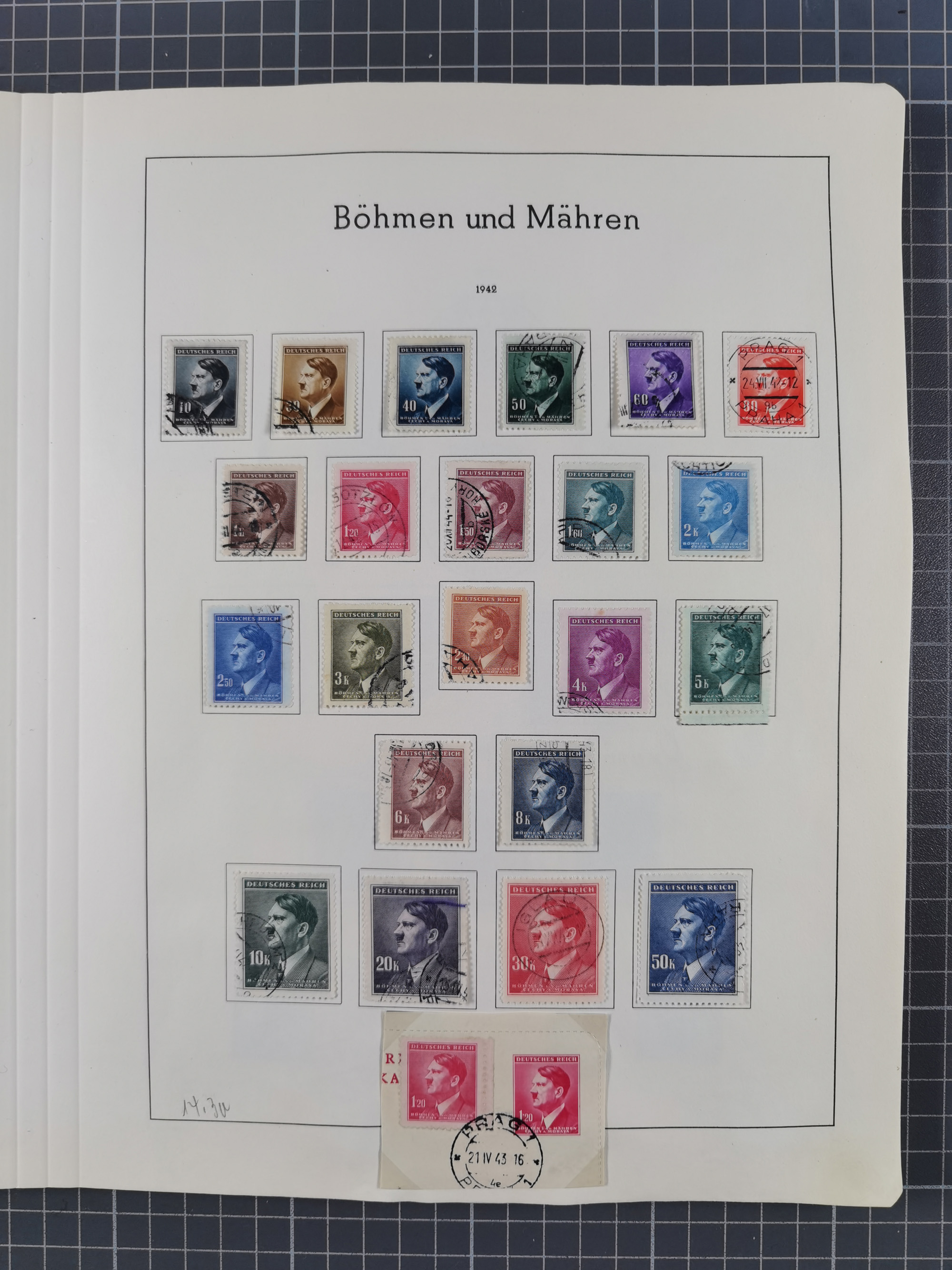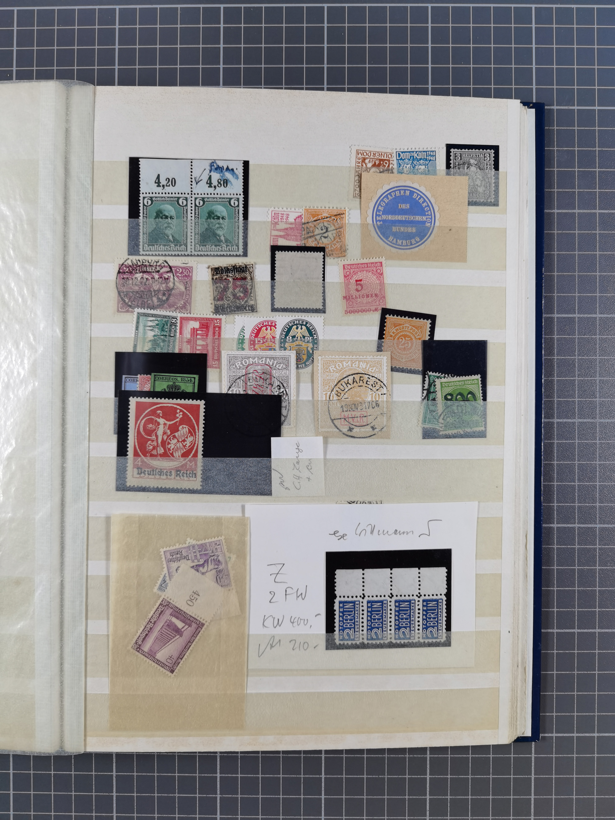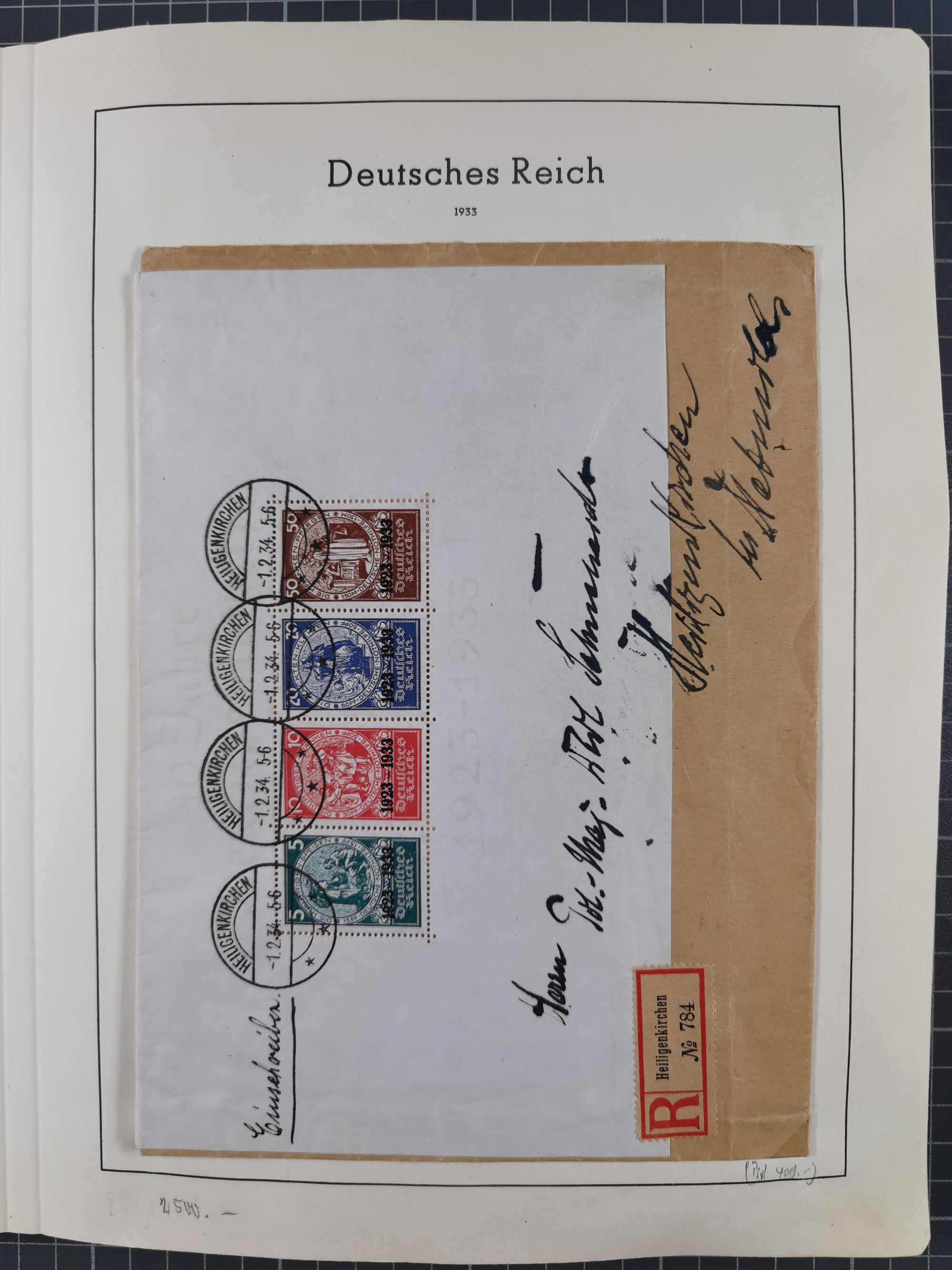 1932/44, meist gestempelte, in den Hauptnummern fast komplette Sammlung Deutsches Reich und Besetzungsausgaben, dabei bessere Werte, Randstücke und Zusammendrucke, aufgelockert durch etliche R-Briefe und Blankoumschläge mit Sonderstempeln, dabei u.a. Mi.-Nr. 628-31 auf Zeppelinbrief mit Fahrt zur Leipziger Messe, Blocks 4-11, Bl. 11 mit SSt. “MARSCHSTAFFEL ZUM RPT DER NSDAP GAU SACHSEN”, ferner Dienst- und Feldpostmarken mit u.a. Mi.-Nr. 2 auf Feldpostadresse, Böhmen und Mähren mit Zusammendrucken, Mi.-Nr. 29 auf NSDAP-Brief mit rotem V-Werbestempel “OLMÜTZ -8.VIII.41”, rotem L2 und blauem L1 “Victoria siegt…” und rückseitiger Vignette, etc., meist gute Erhaltung, im KaBe-Album