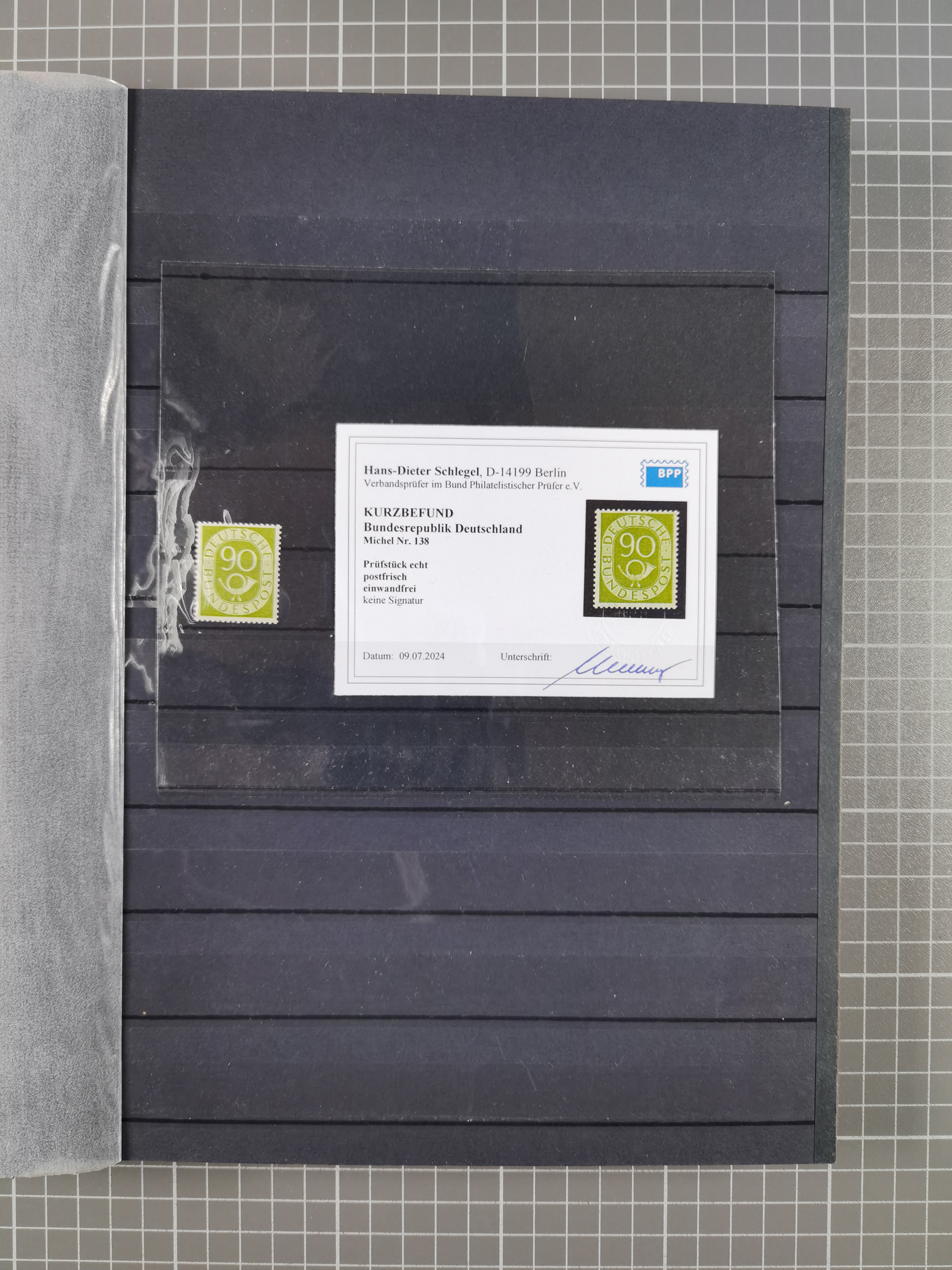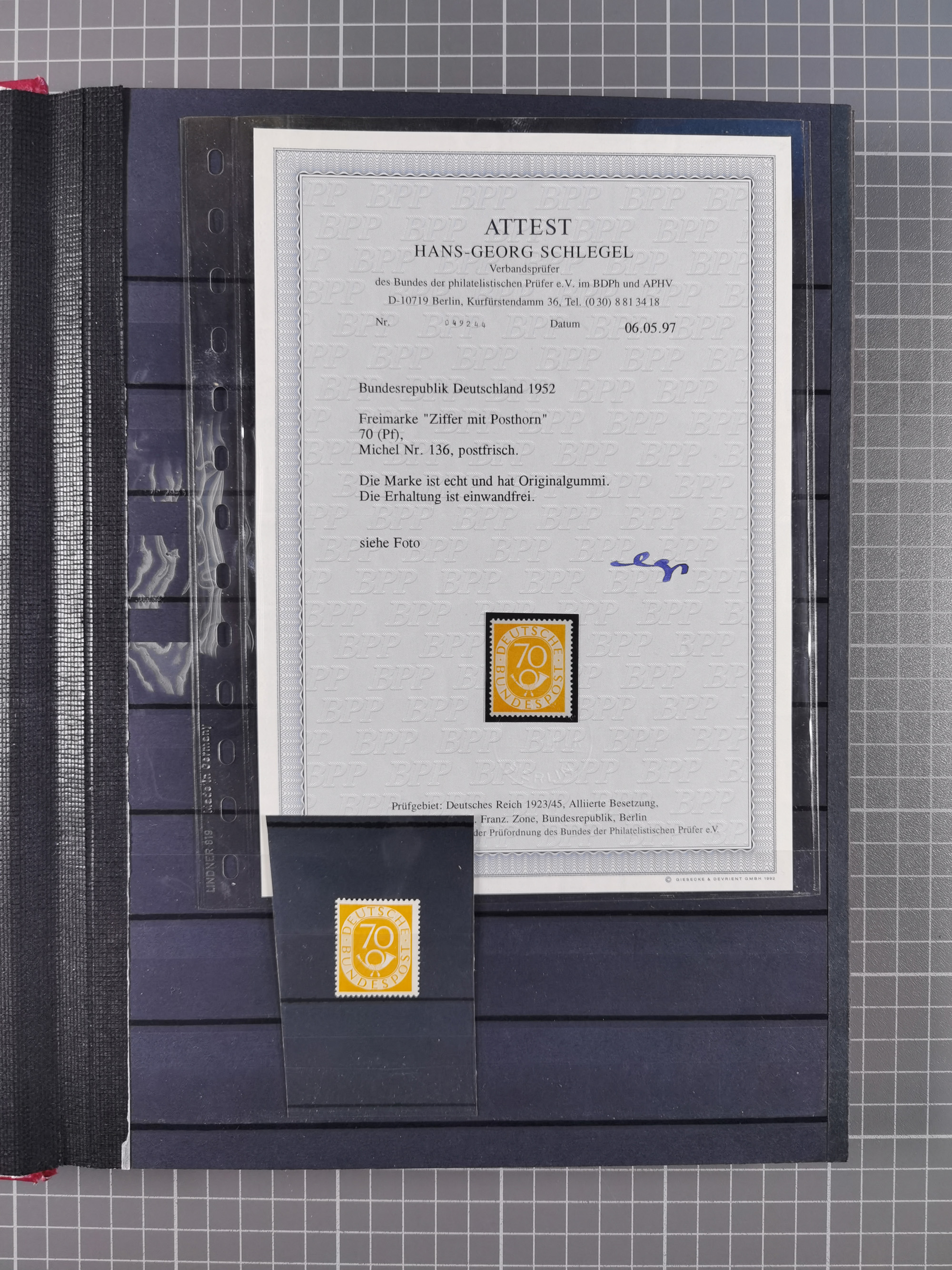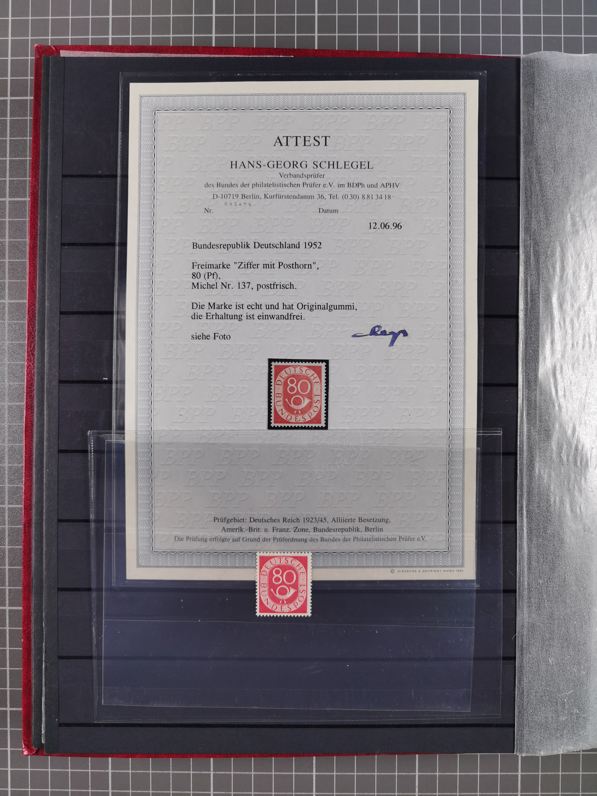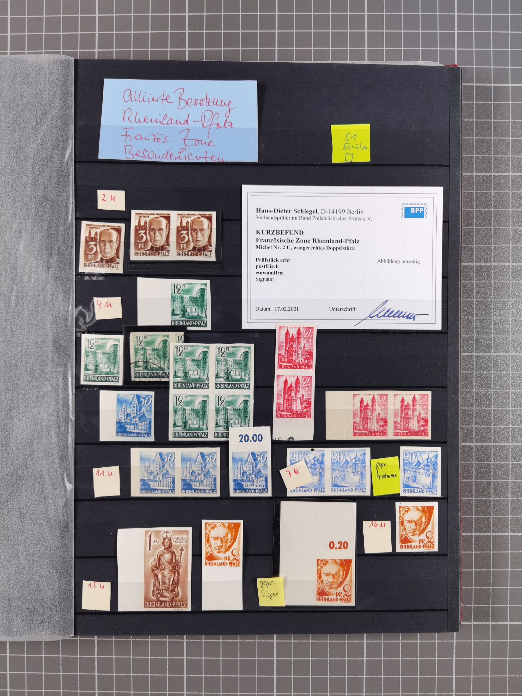 1948/51, meist postfrischer und gestempelter Bestand, angefangen ab Posthornsatz kpl. postfrisch sign. bzw. 70-90 Pfg. unsigniert mit Kurzbefund/Fotoattest Schlegel BPP, ferner 50 Pfg. (1) und 60 (2) doppelt, sowie Französische Zone mit Baden Bl. 1B gestempelt, 1A (2) und 1B postfrisch, Rheinland-Pfalz mit u.a. Mi.-Nr. 36 gestempelt sign. Schlegel BPP, 42-45A Eckrand postfrisch, Bl. 1 (2), sowie unzählige ungezähnte Werte, teils mehrfach, dabei u.a. 2U im Paar (KB D. Schlegel BPP), 7PU sign., 1yL im Paar gestempelt (KB Wehner BPP), etc., im Steckbuch