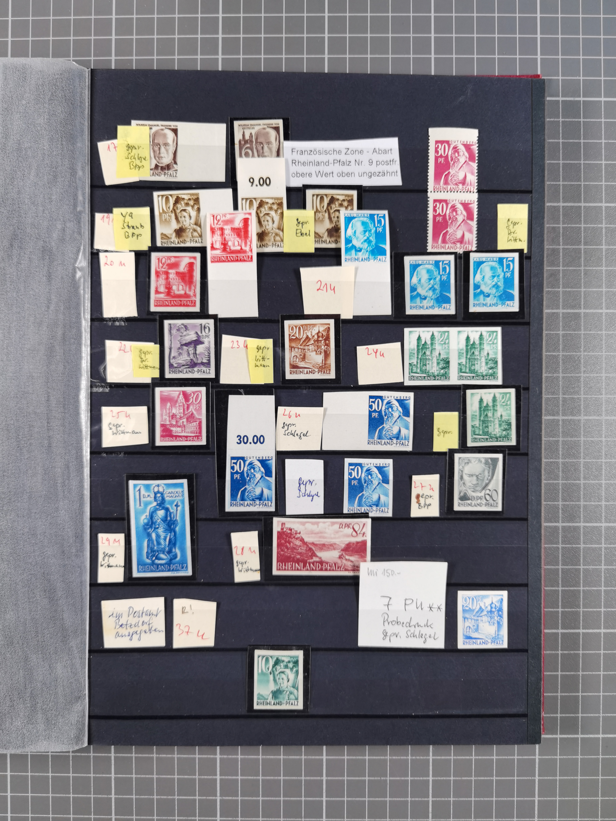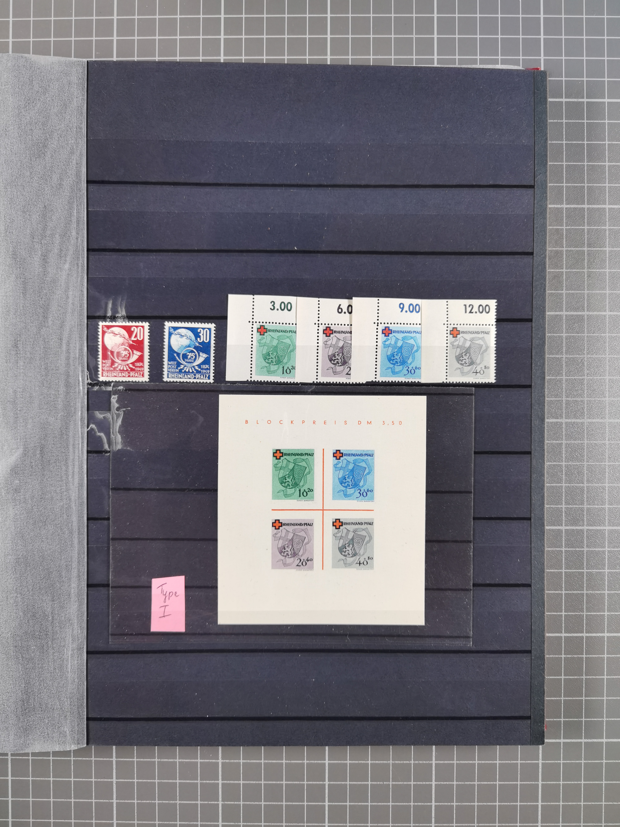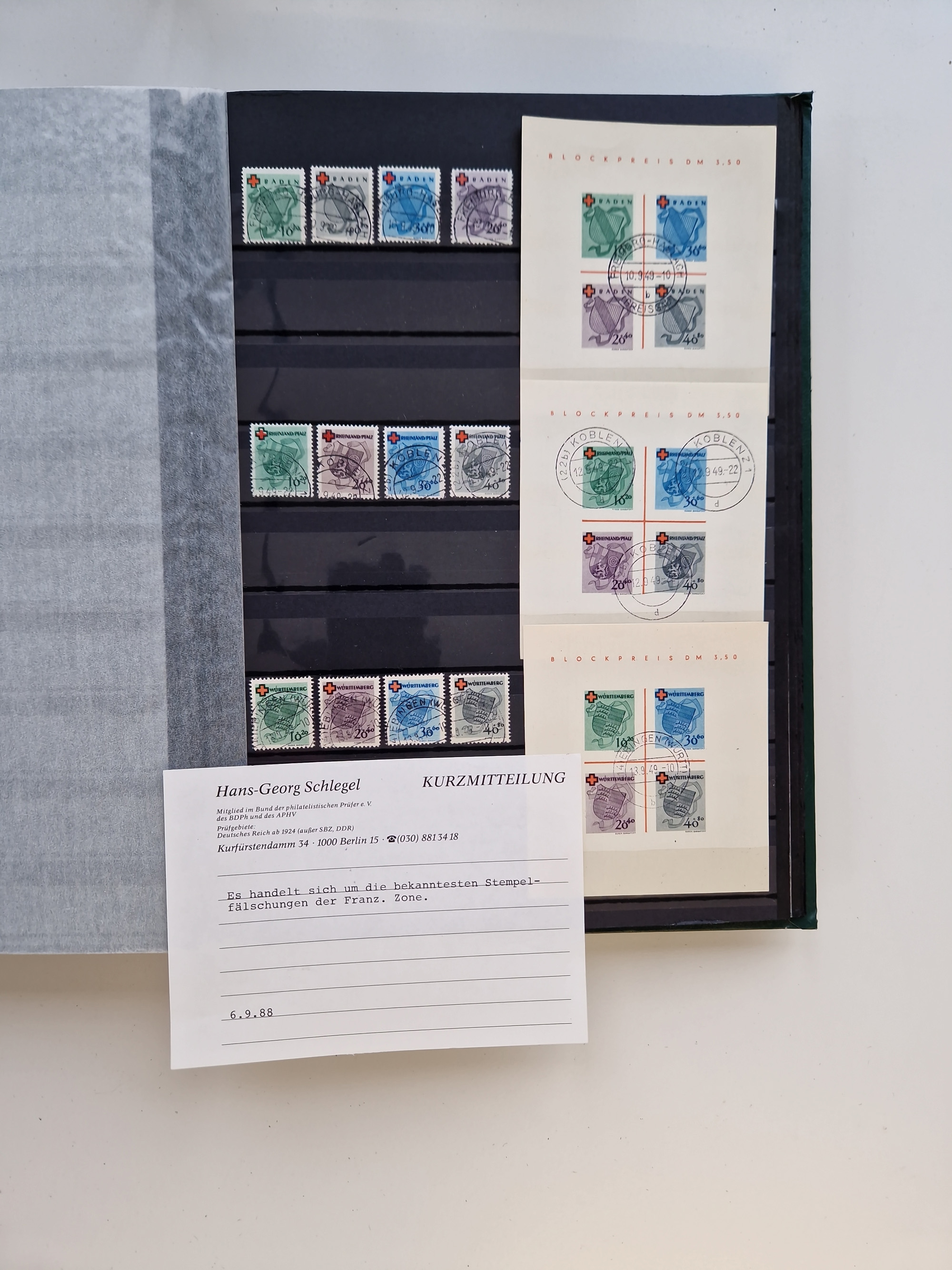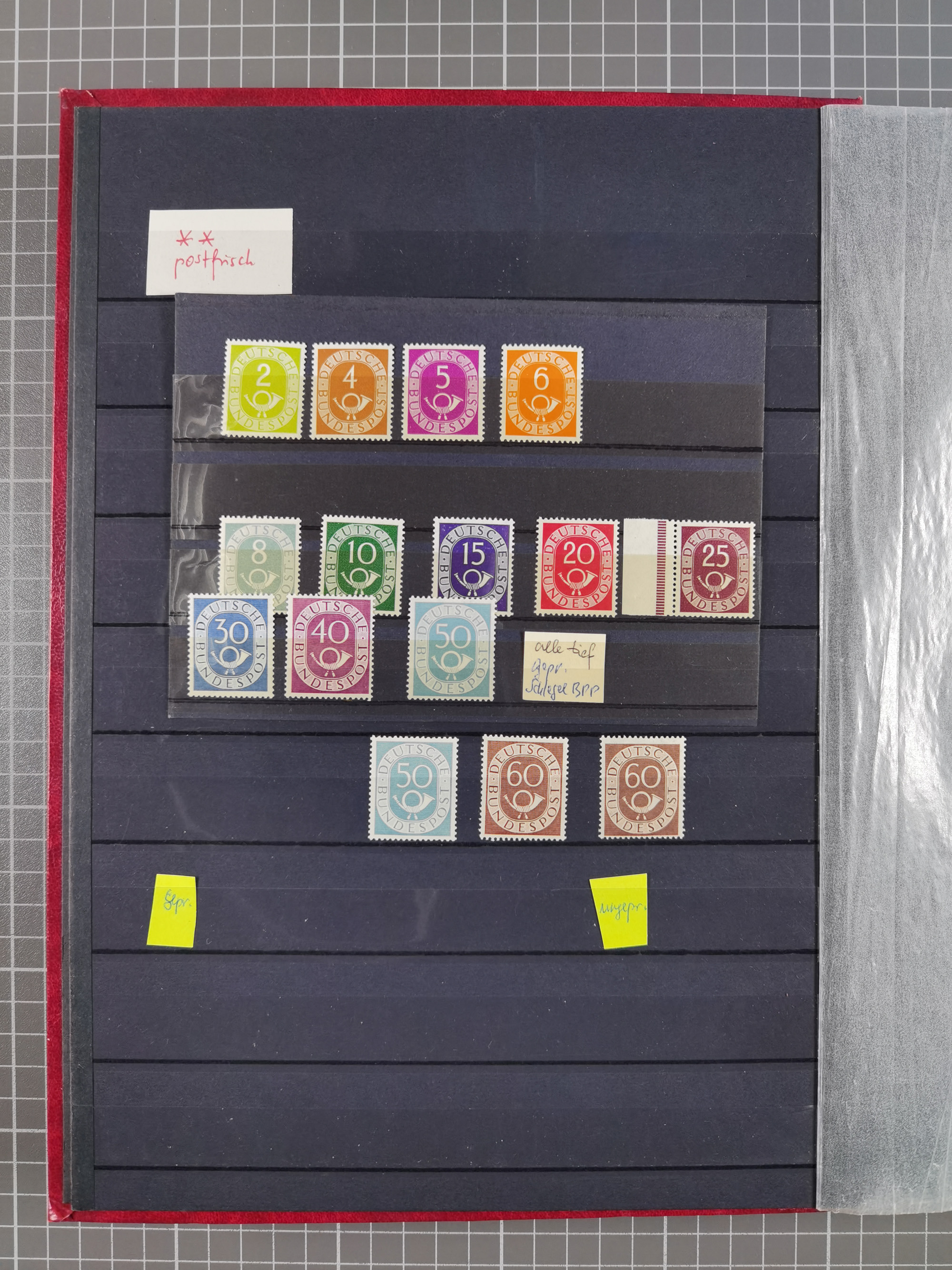1948/51, meist postfrischer und gestempelter Bestand, angefangen ab Posthornsatz kpl. postfrisch sign. bzw. 70-90 Pfg. unsigniert mit Kurzbefund/Fotoattest Schlegel BPP, ferner 50 Pfg. (1) und 60 (2) doppelt, sowie Französische Zone mit Baden Bl. 1B gestempelt, 1A (2) und 1B postfrisch, Rheinland-Pfalz mit u.a. Mi.-Nr. 36 gestempelt sign. Schlegel BPP, 42-45A Eckrand postfrisch, Bl. 1 (2), sowie unzählige ungezähnte Werte, teils mehrfach, dabei u.a. 2U im Paar (KB D. Schlegel BPP), 7PU sign., 1yL im Paar gestempelt (KB Wehner BPP), etc., im Steckbuch
