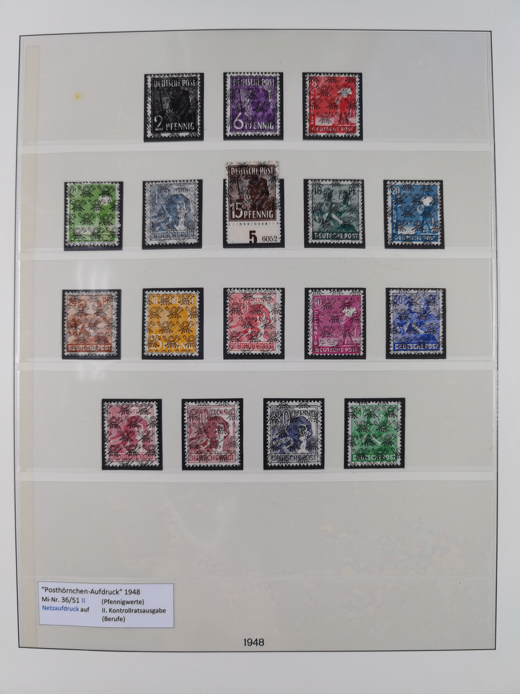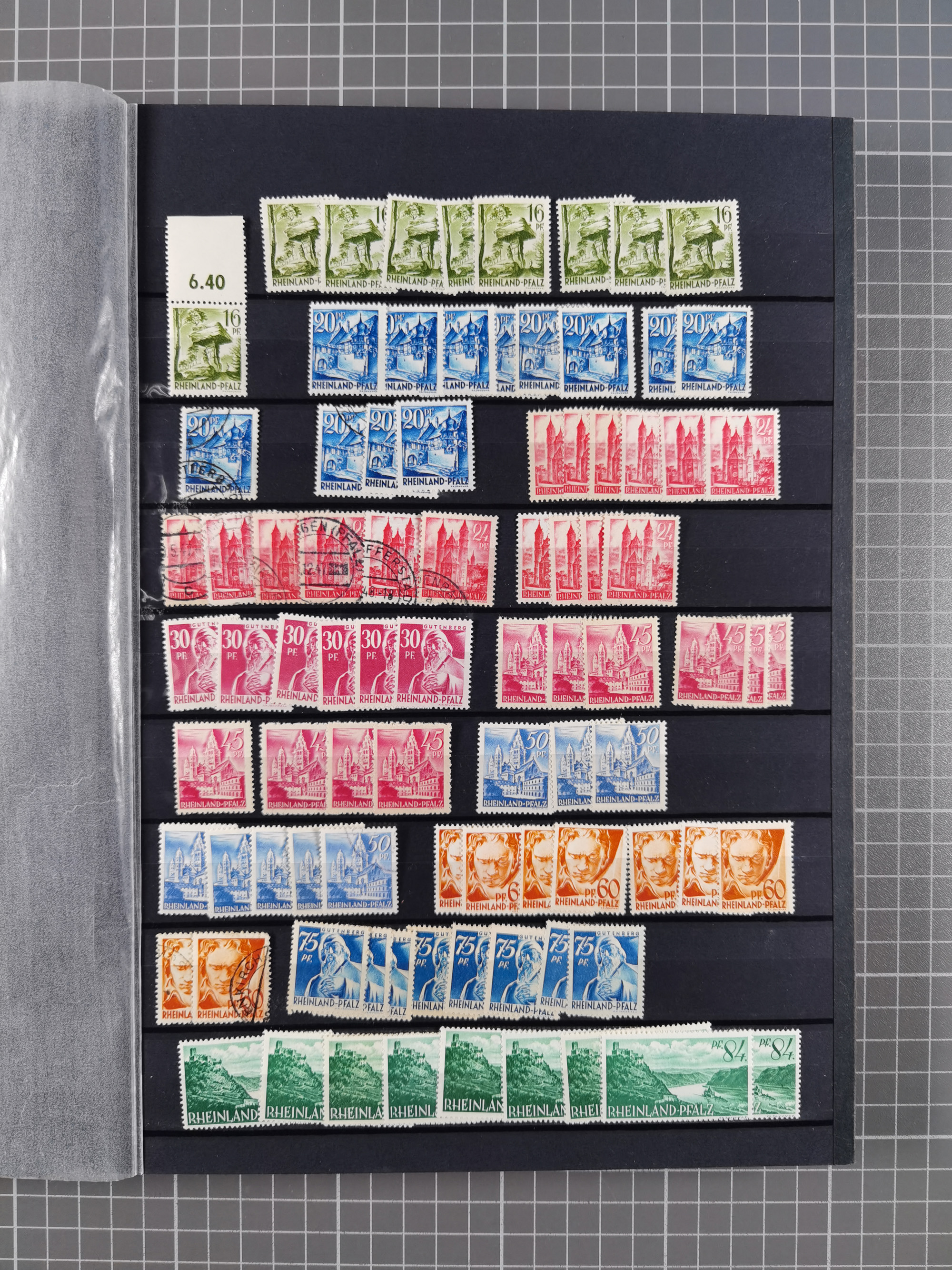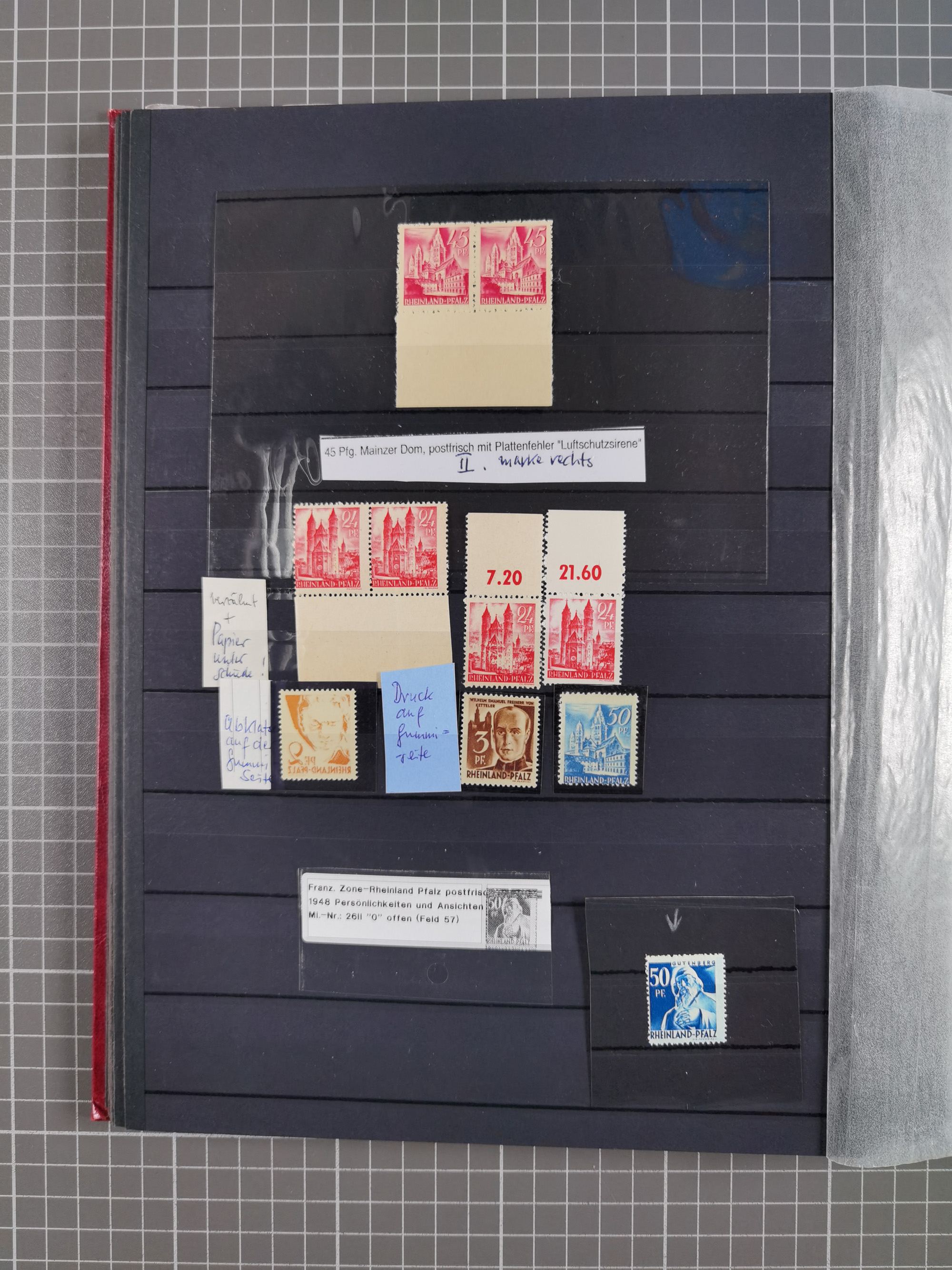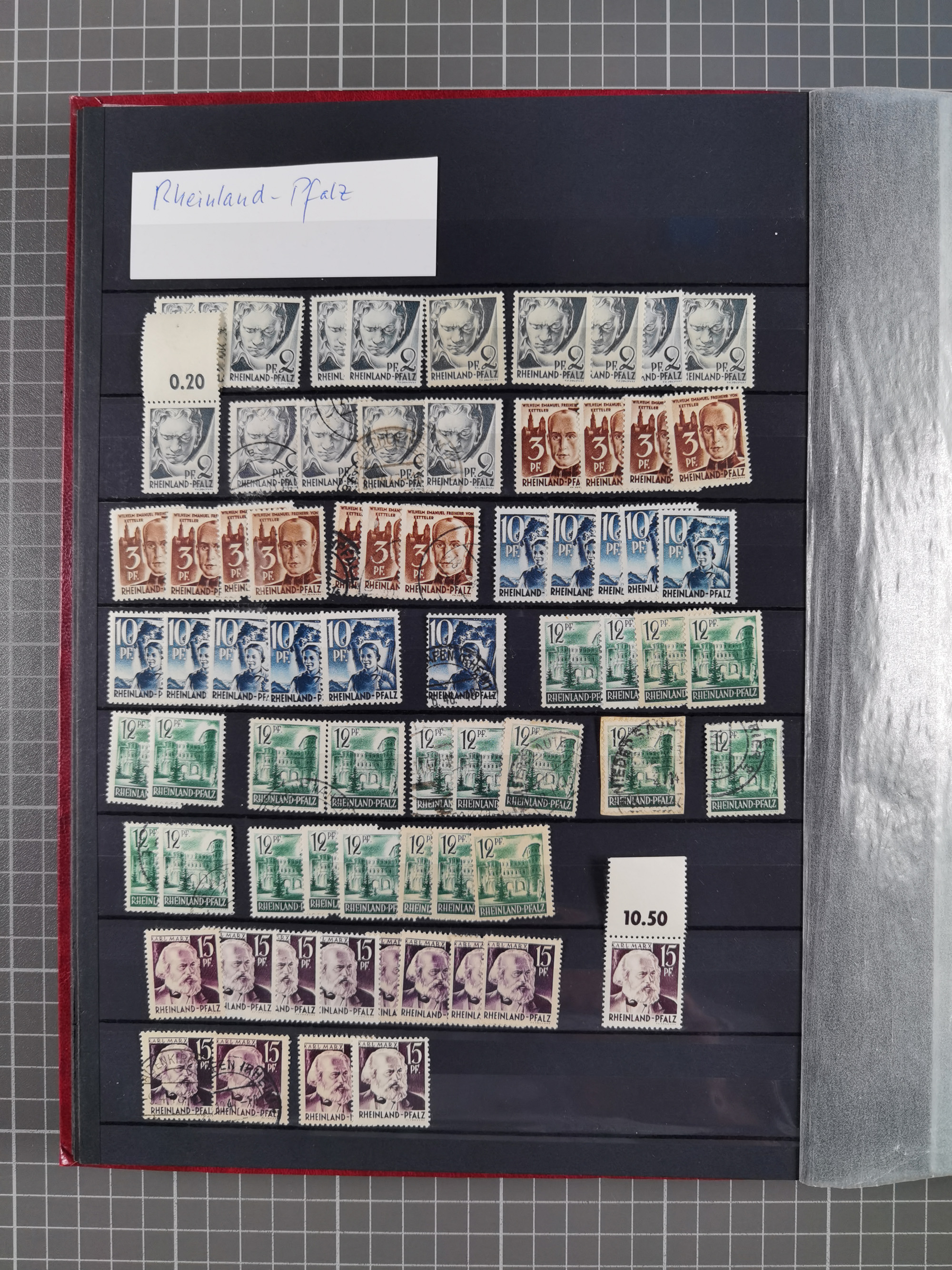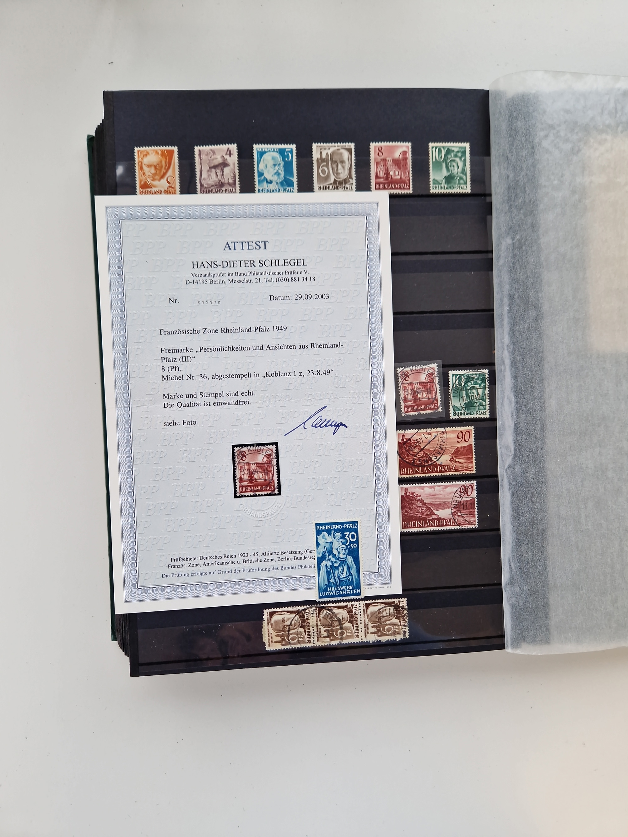 1948/51, meist postfrischer und gestempelter Bestand, angefangen ab Posthornsatz kpl. postfrisch sign. bzw. 70-90 Pfg. unsigniert mit Kurzbefund/Fotoattest Schlegel BPP, ferner 50 Pfg. (1) und 60 (2) doppelt, sowie Französische Zone mit Baden Bl. 1B gestempelt, 1A (2) und 1B postfrisch, Rheinland-Pfalz mit u.a. Mi.-Nr. 36 gestempelt sign. Schlegel BPP, 42-45A Eckrand postfrisch, Bl. 1 (2), sowie unzählige ungezähnte Werte, teils mehrfach, dabei u.a. 2U im Paar (KB D. Schlegel BPP), 7PU sign., 1yL im Paar gestempelt (KB Wehner BPP), etc., im Steckbuch