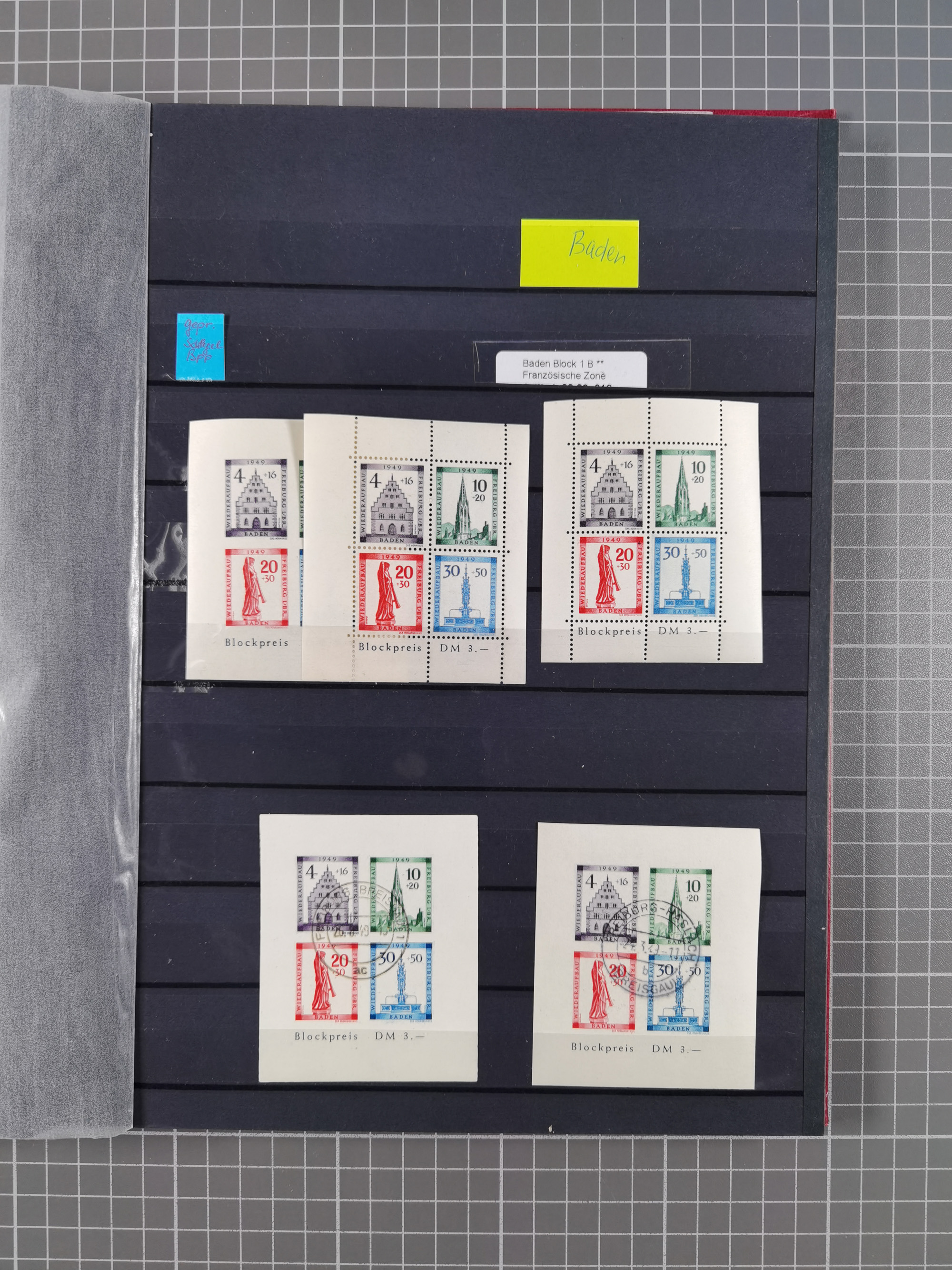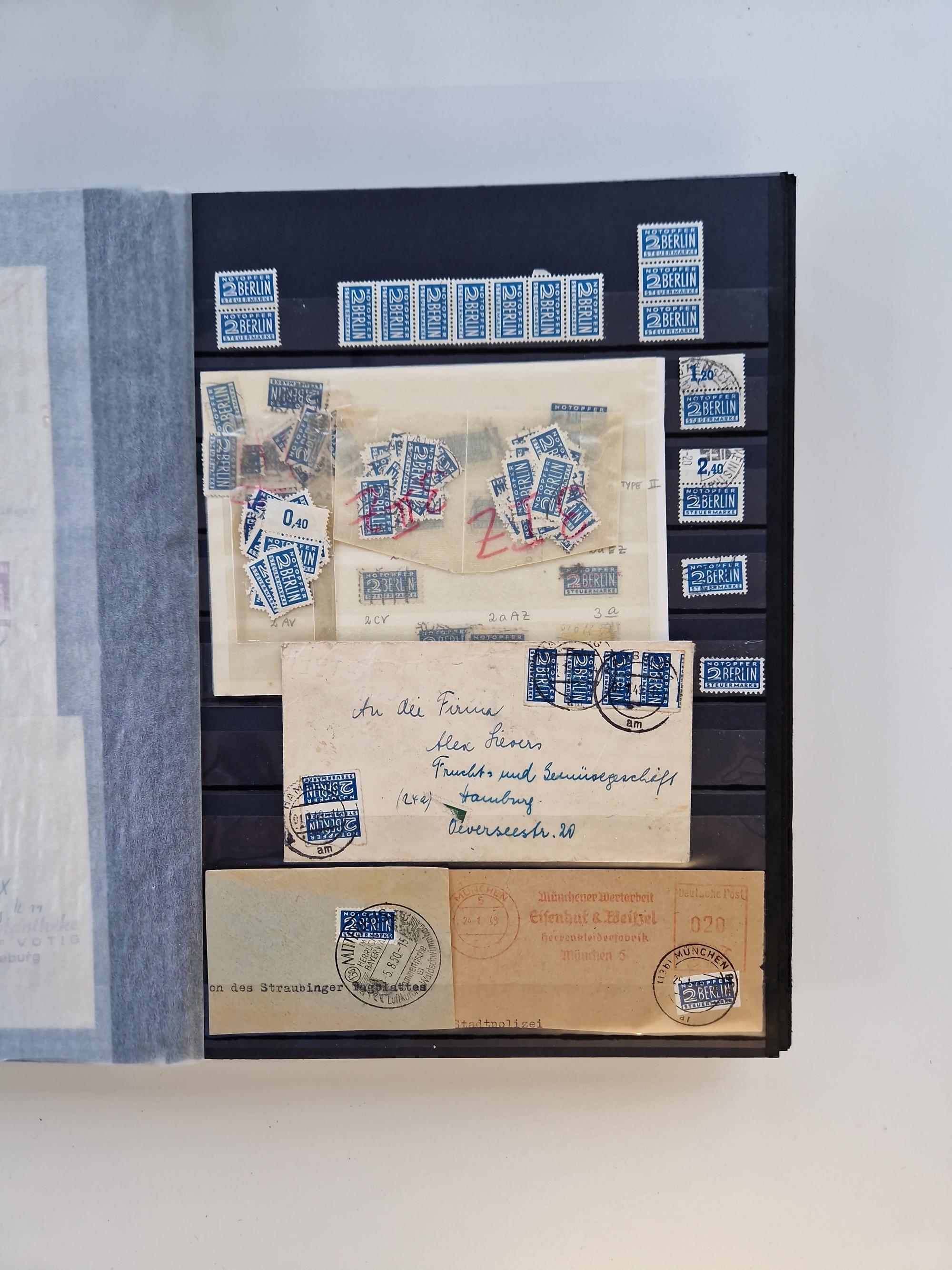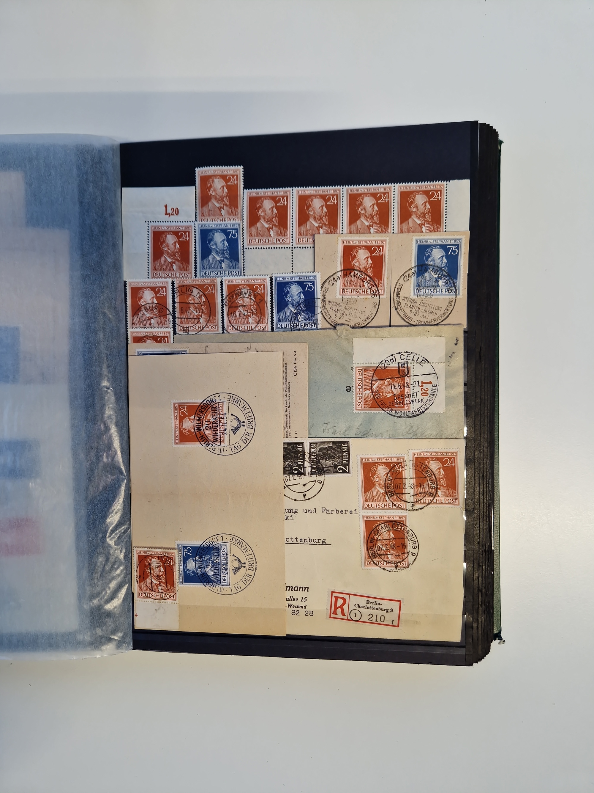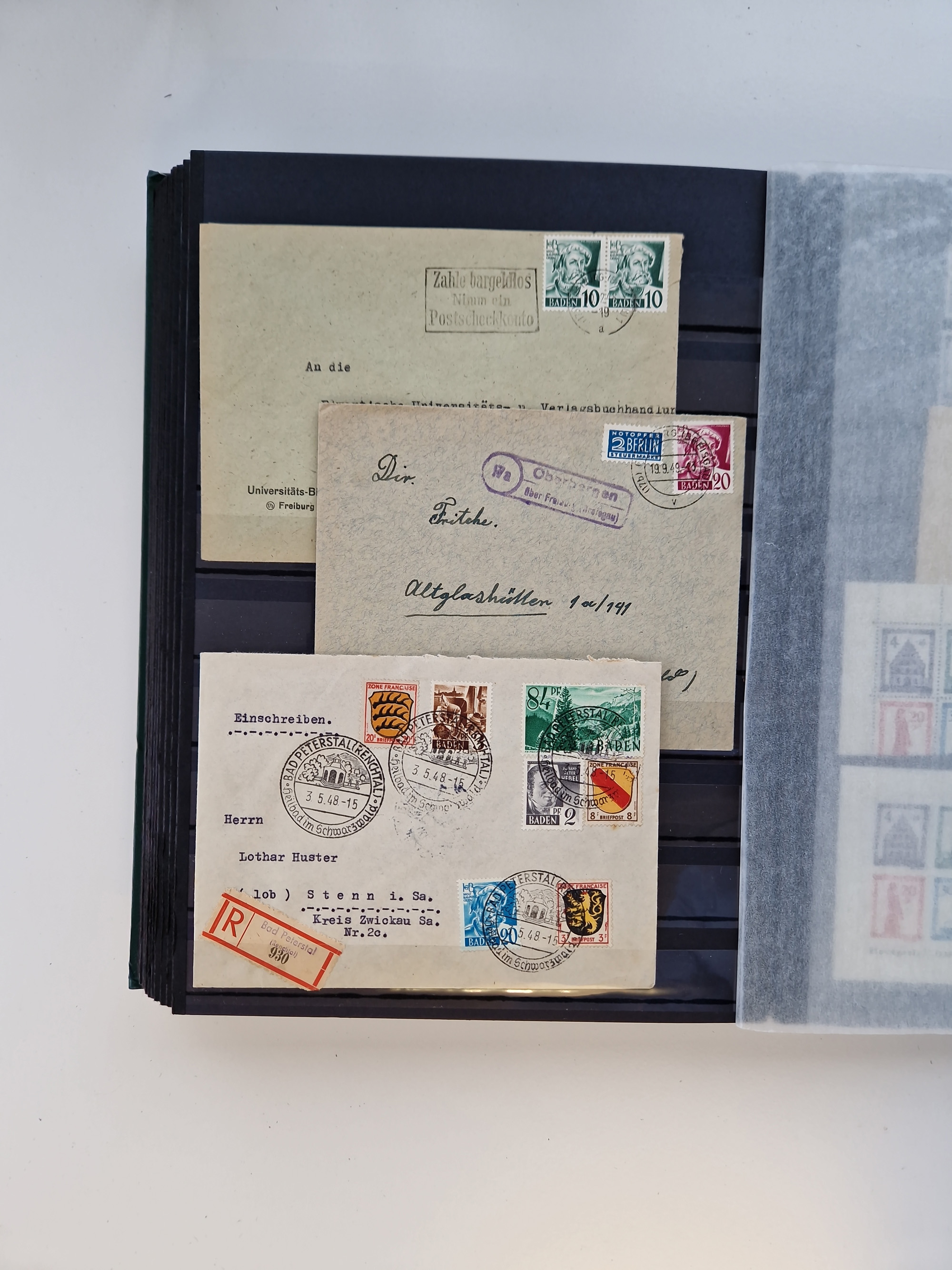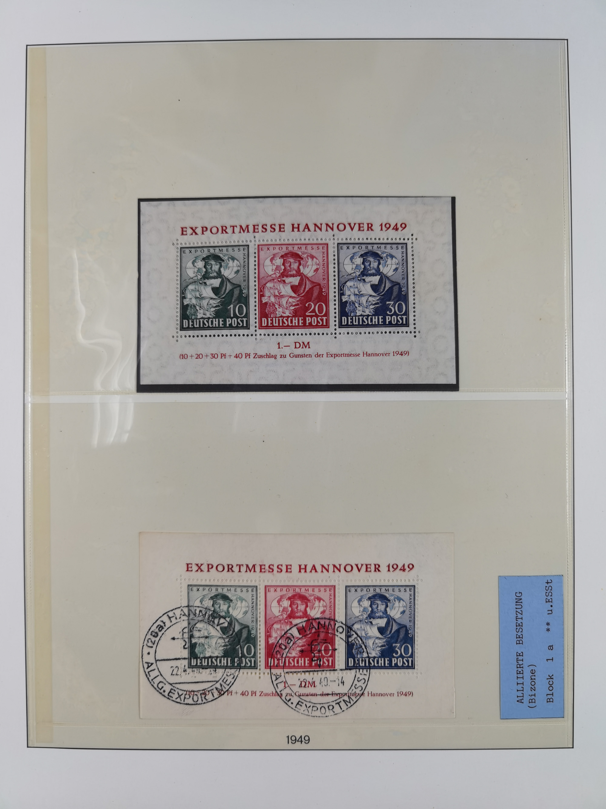 1945/50, interessanter Bestand mit fast nur besseren Sätzen, Block-Ausgaben und Briefen. Dabei u.a. SBZ Bl.1xa postfrisch (FA Ströh BPP), Bl.2t gestempelt (FA Dr. Jasch BPP) und Bl. 4ay gestempelt (FA Ströh BPP), Berlin Mi.-Nr. 1-20 gestempelt (sign. Schlegel BPP mit FA) und Bl. 1I gestempelt (FA D. Schlegel BPP), Saarland Bl.1-2 postfrisch (sign. Ney BPP), Baden Bl. 2 mit rotem SST (sign. Schlegel BPP) und Bund mit besseren Anfangsausgaben und Briefen mit u.a. Mi.-Nr. 116 Br.