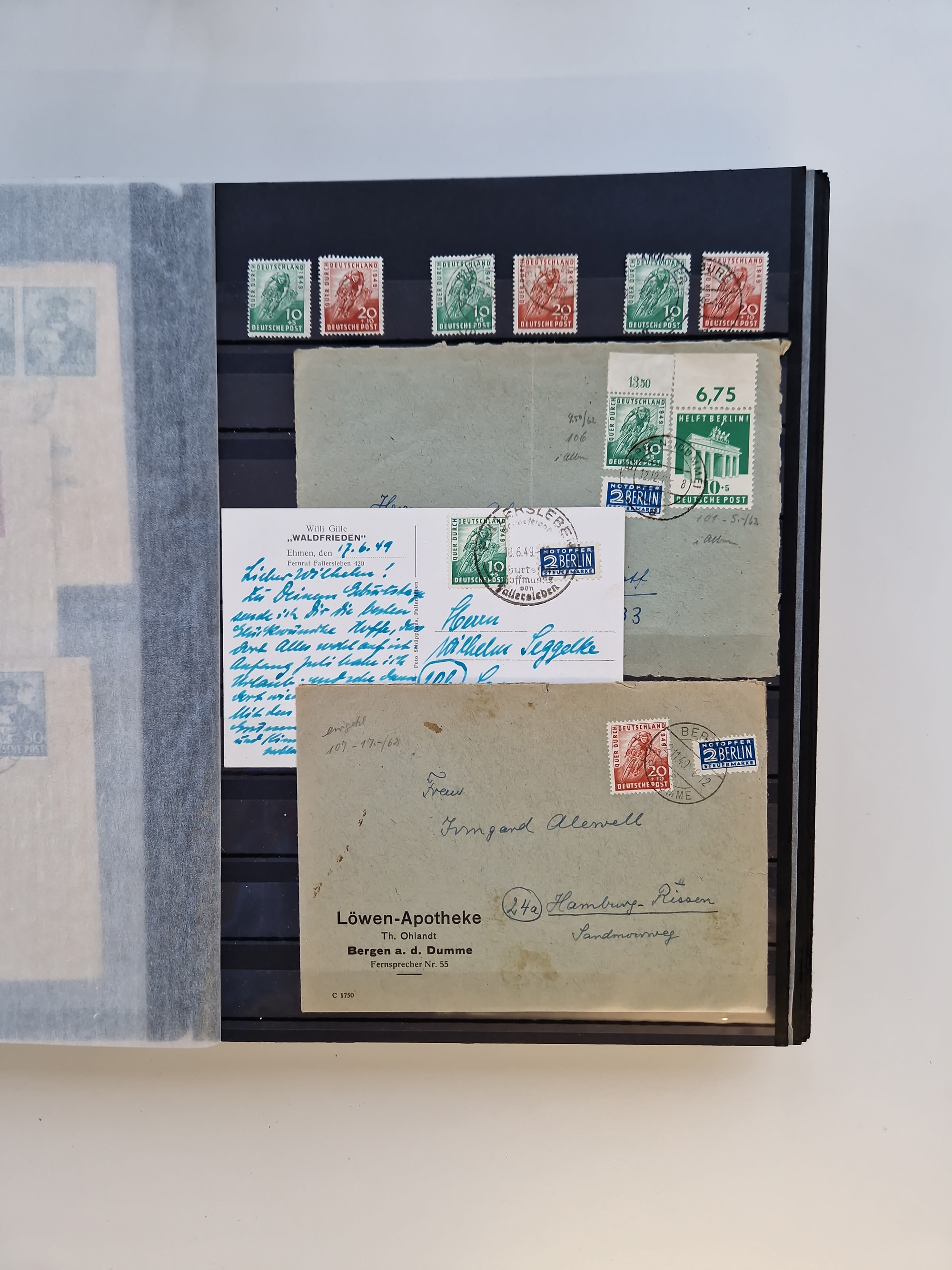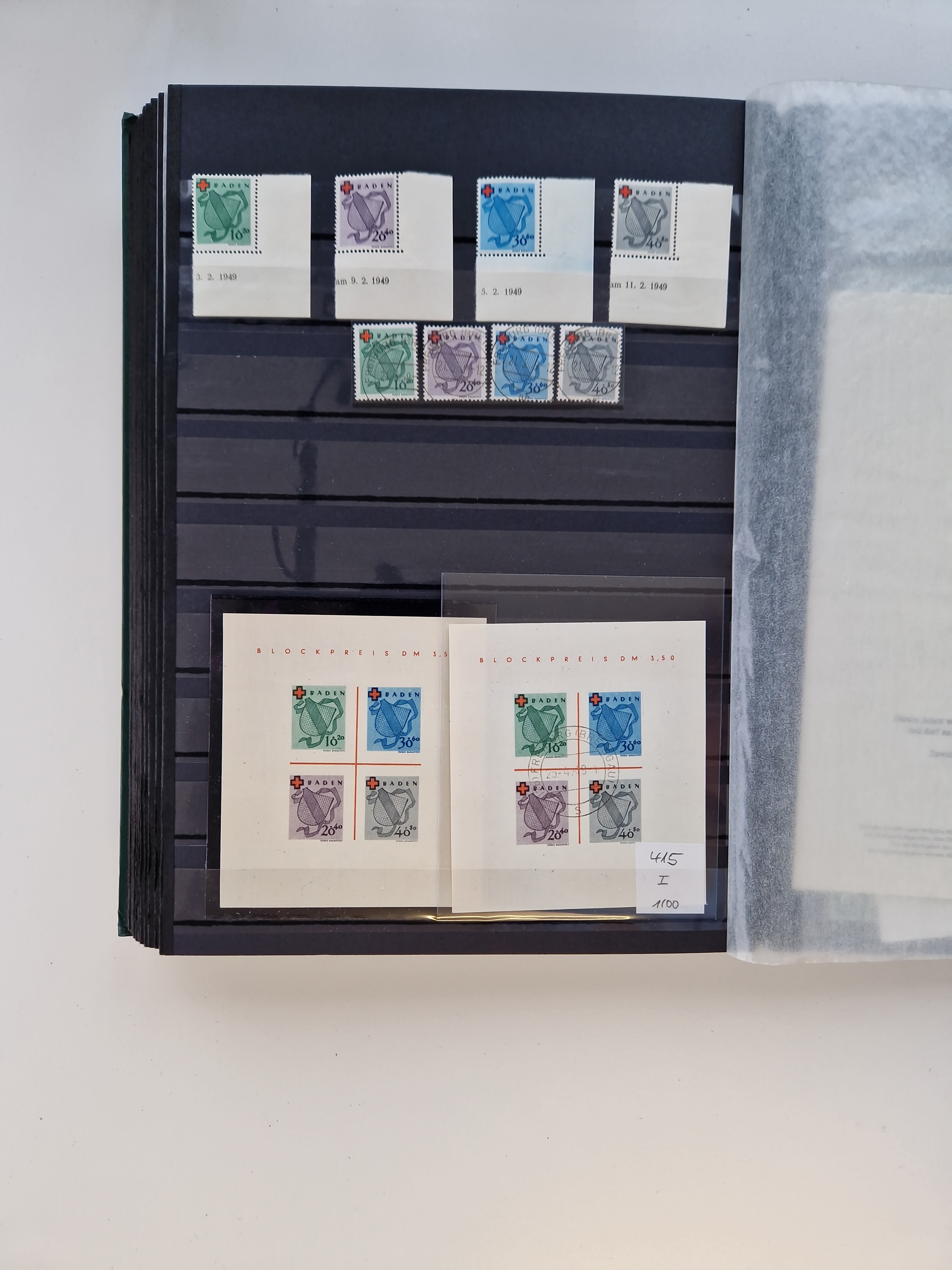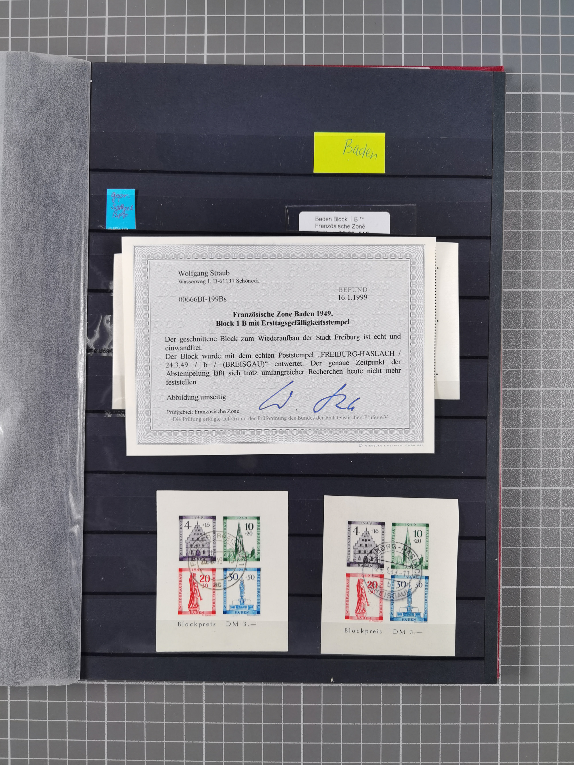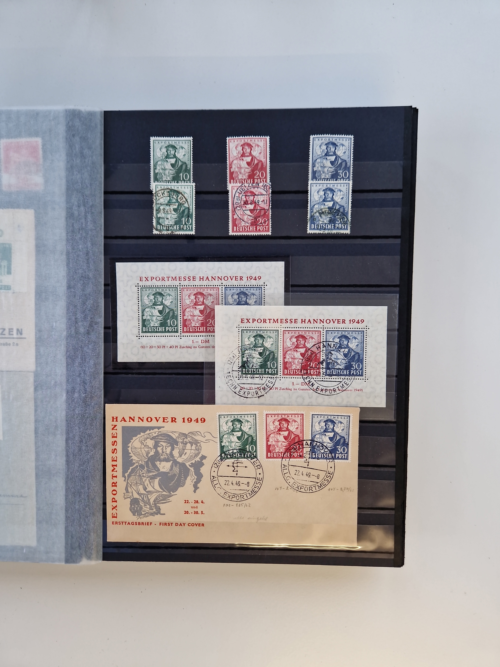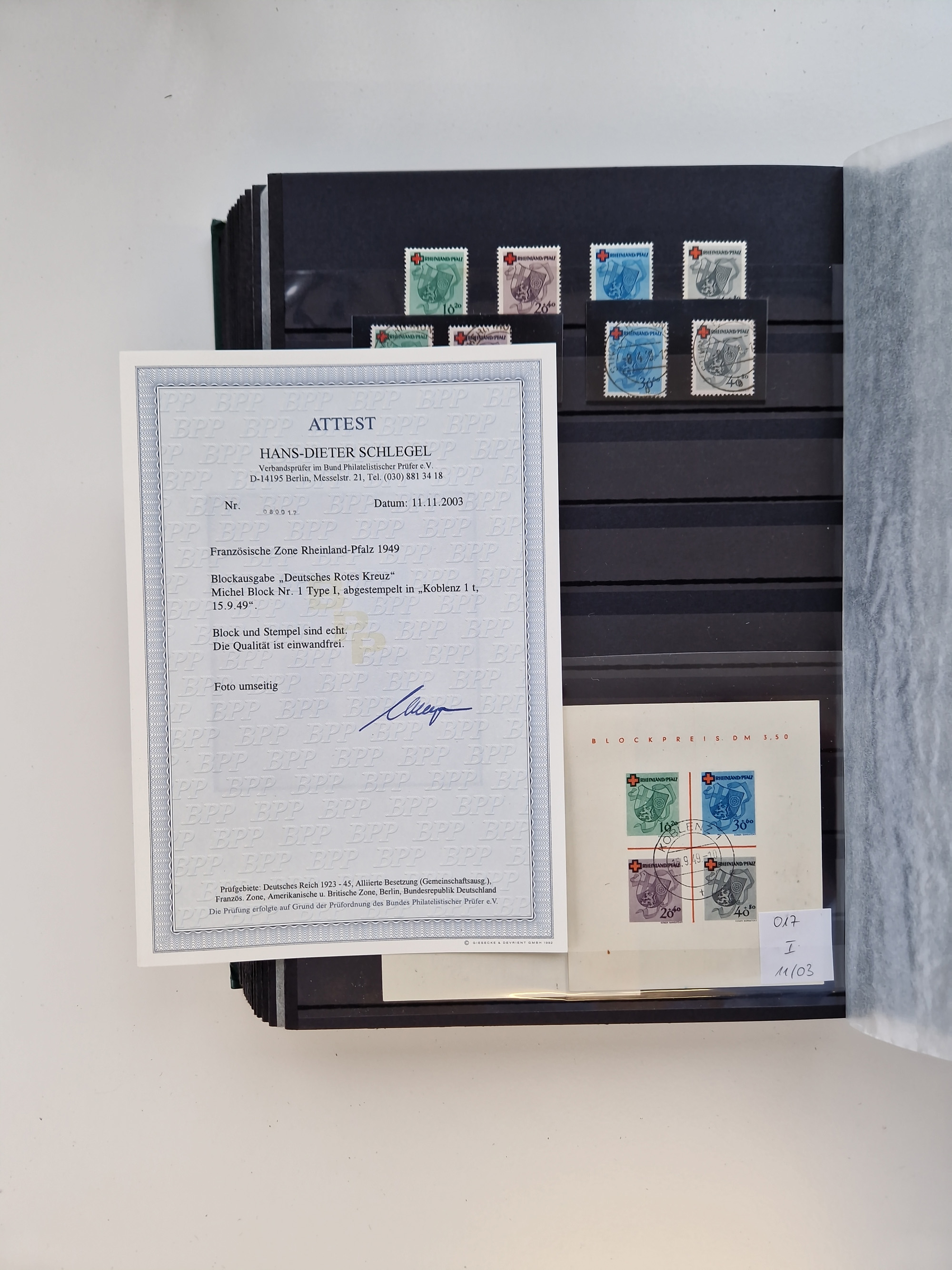 1945/50, interessanter Bestand mit fast nur besseren Sätzen, Block-Ausgaben und Briefen. Dabei u.a. SBZ Bl.1xa postfrisch (FA Ströh BPP), Bl.2t gestempelt (FA Dr. Jasch BPP) und Bl. 4ay gestempelt (FA Ströh BPP), Berlin Mi.-Nr. 1-20 gestempelt (sign. Schlegel BPP mit FA) und Bl. 1I gestempelt (FA D. Schlegel BPP), Saarland Bl.1-2 postfrisch (sign. Ney BPP), Baden Bl. 2 mit rotem SST (sign. Schlegel BPP) und Bund mit besseren Anfangsausgaben und Briefen mit u.a. Mi.-Nr. 116 Br.