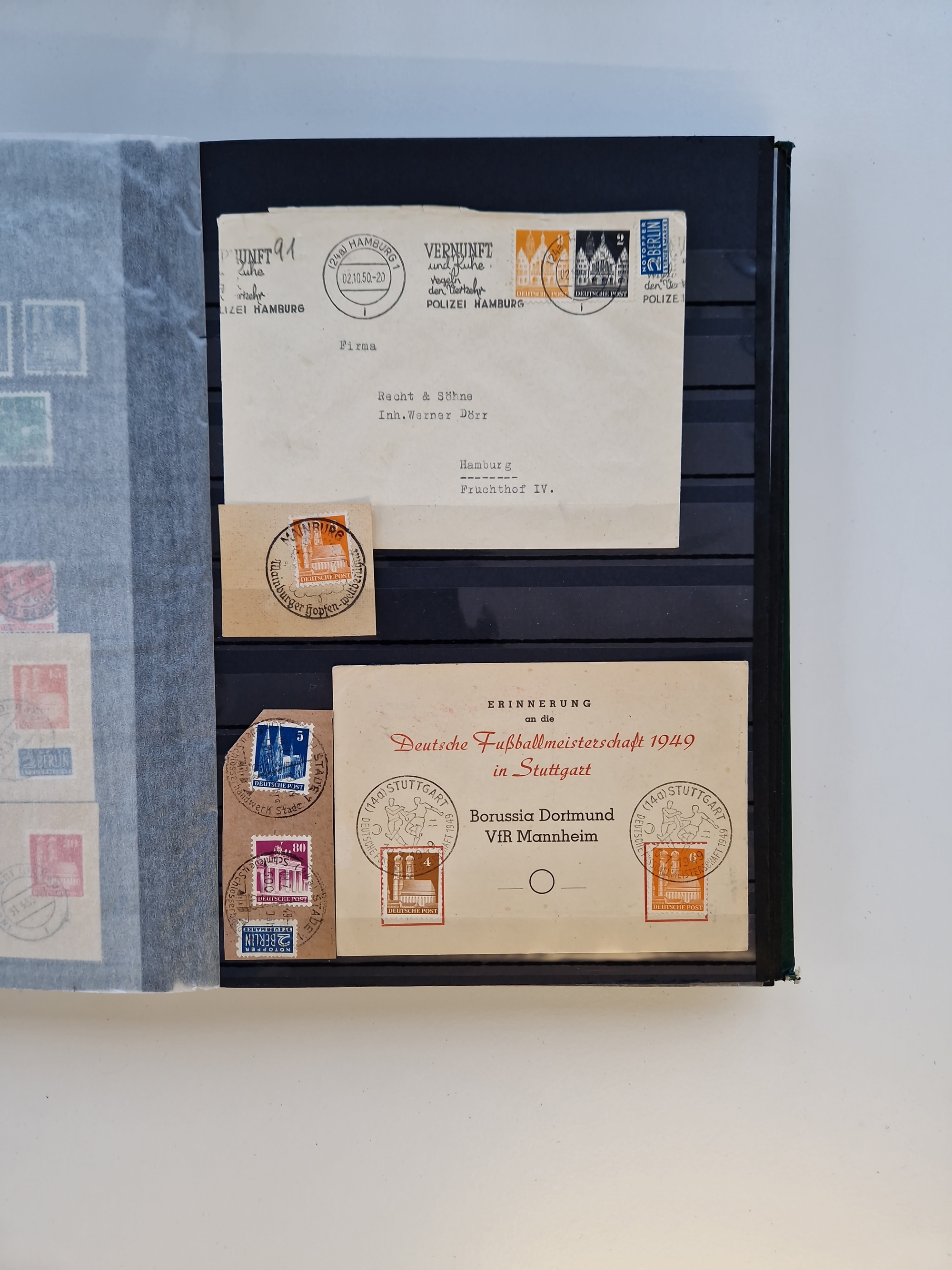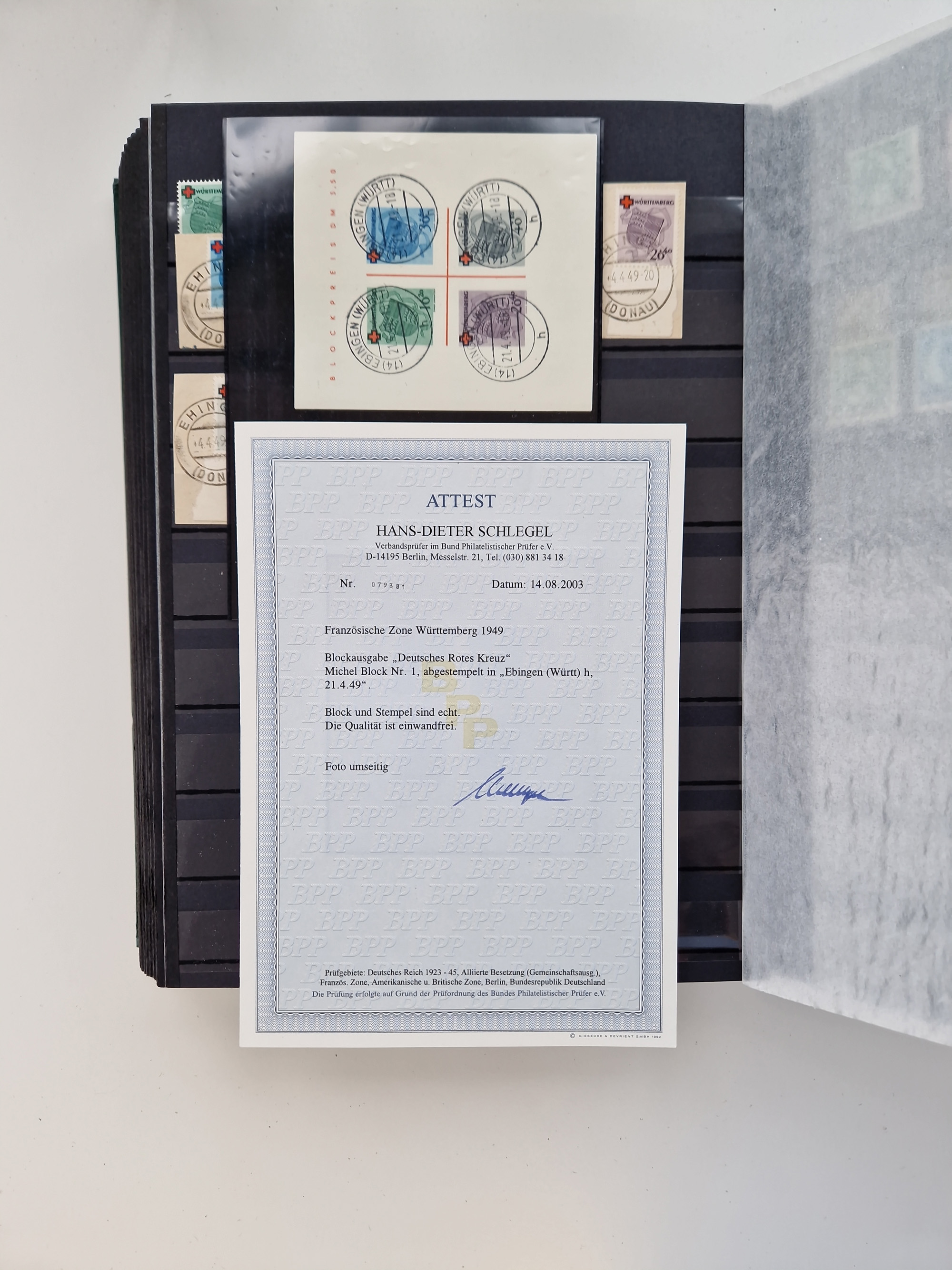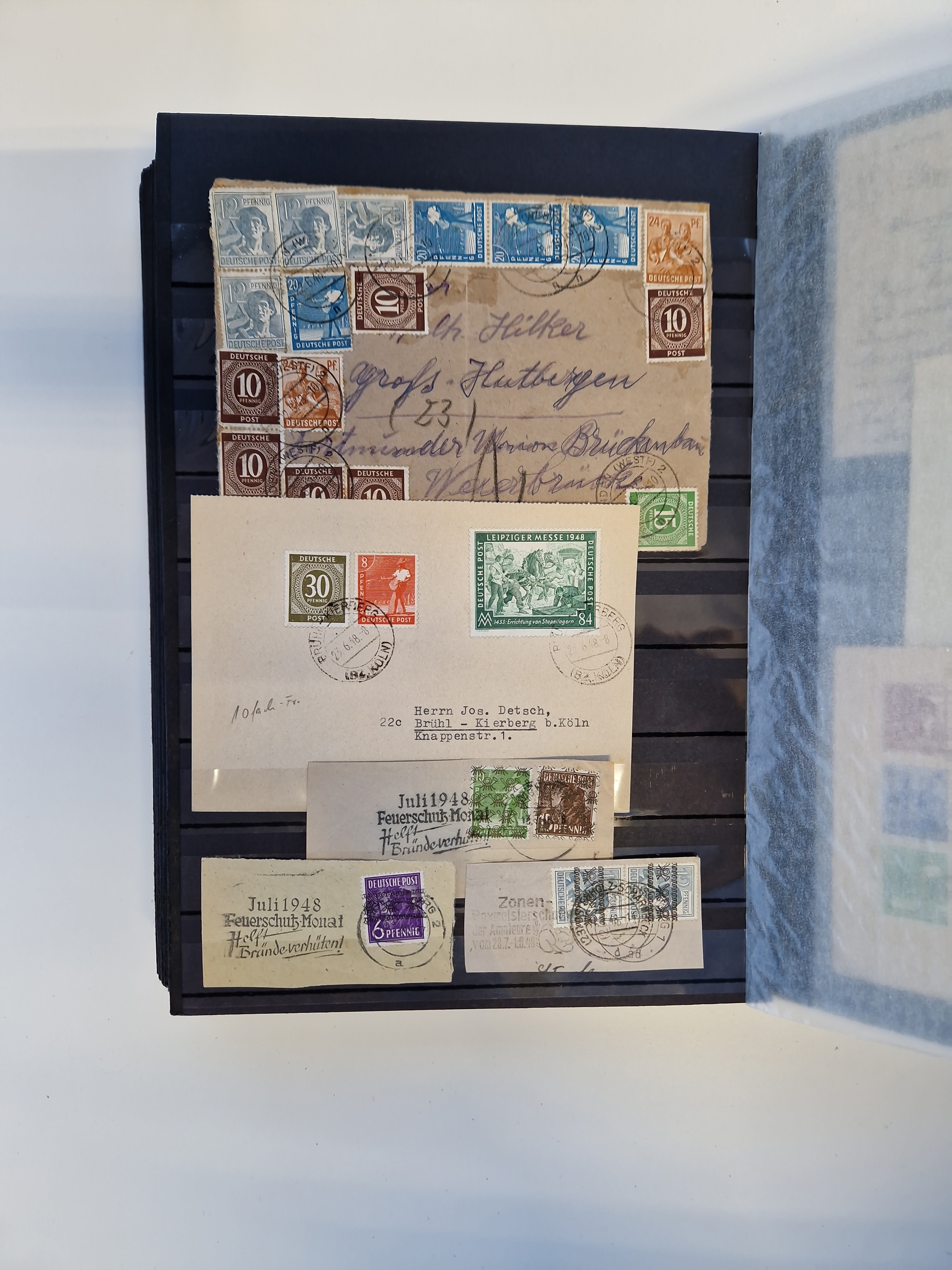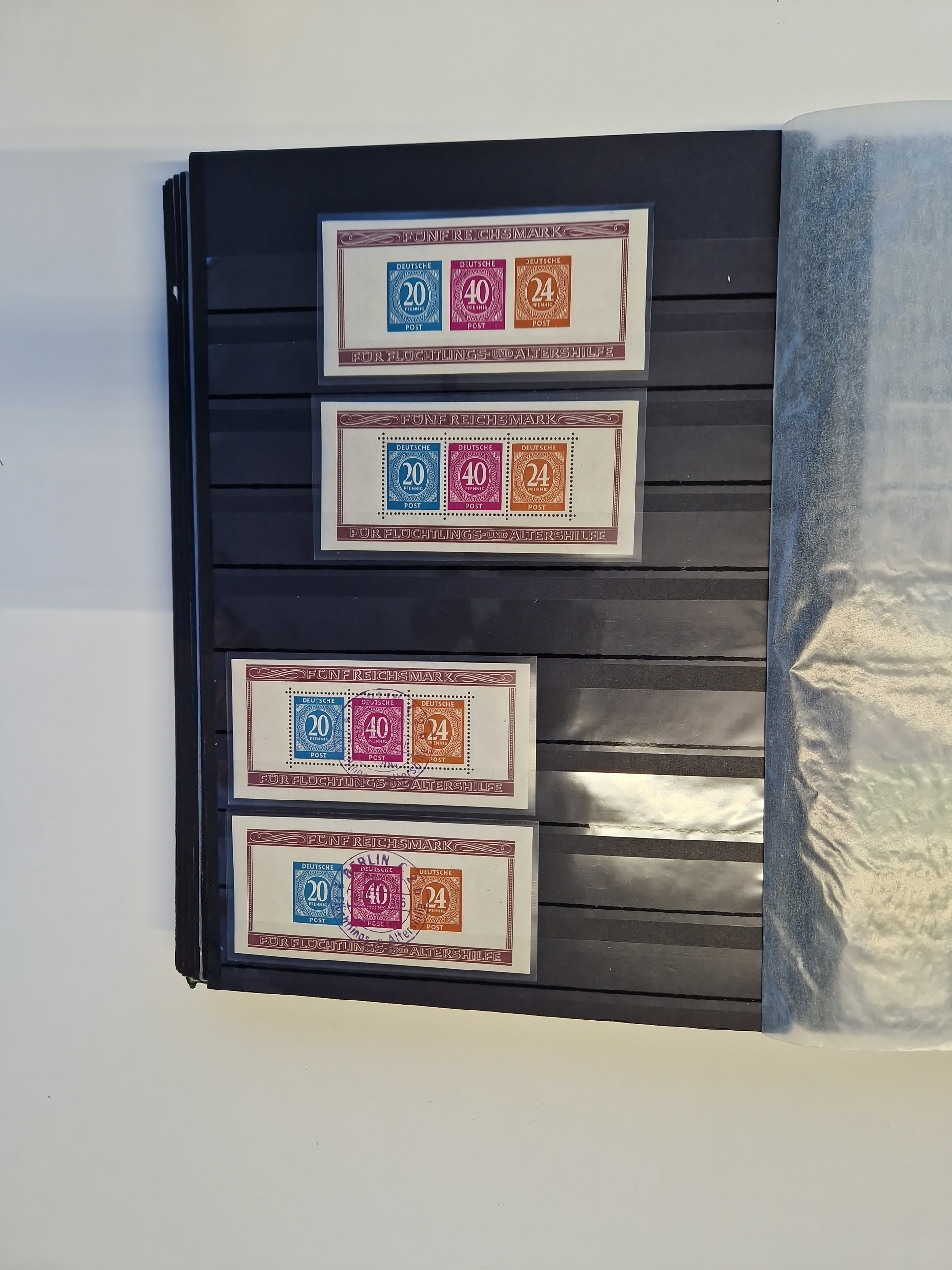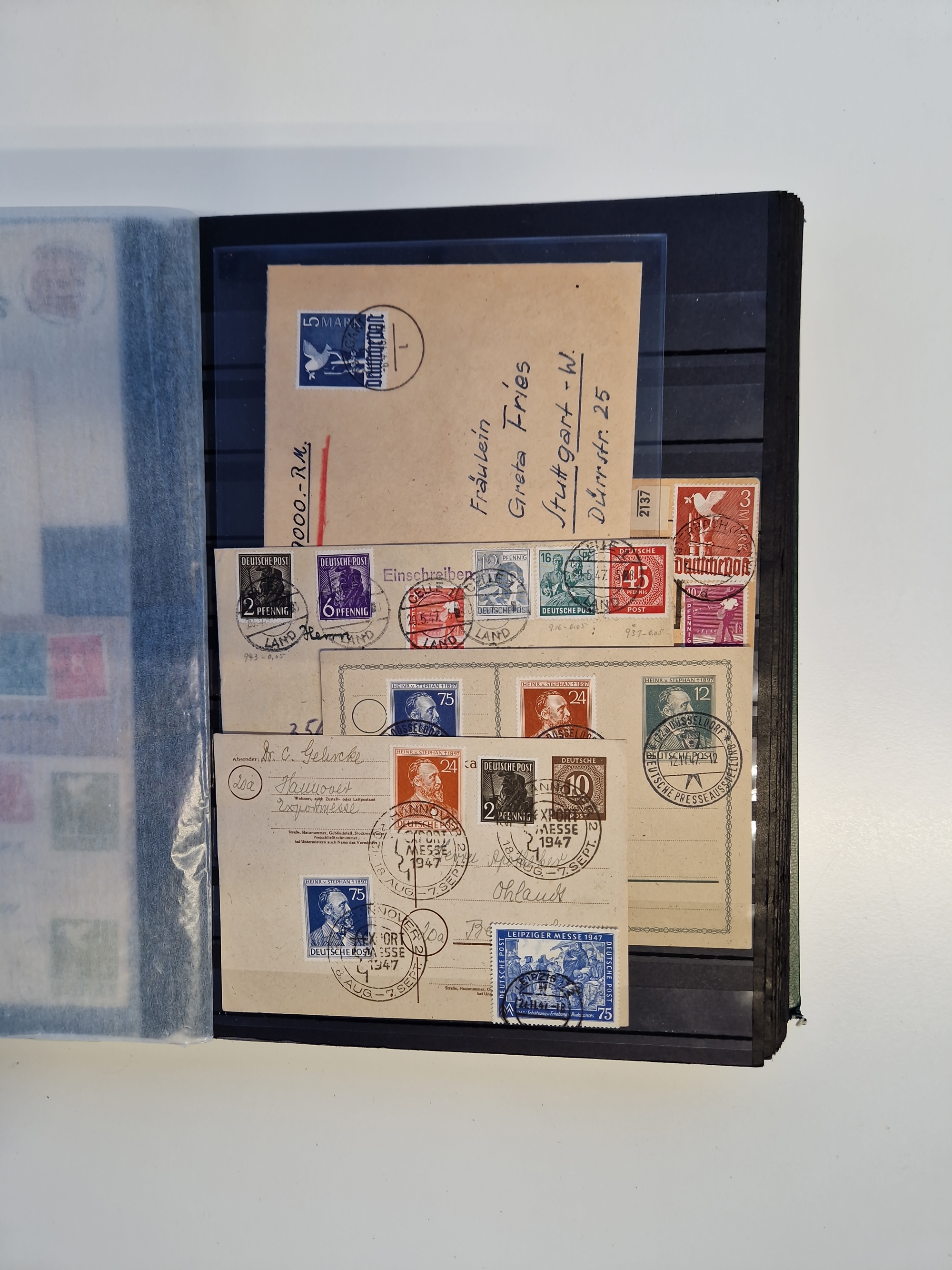 1945/50, interessanter Bestand mit fast nur besseren Sätzen, Block-Ausgaben und Briefen. Dabei u.a. SBZ Bl.1xa postfrisch (FA Ströh BPP), Bl.2t gestempelt (FA Dr. Jasch BPP) und Bl. 4ay gestempelt (FA Ströh BPP), Berlin Mi.-Nr. 1-20 gestempelt (sign. Schlegel BPP mit FA) und Bl. 1I gestempelt (FA D. Schlegel BPP), Saarland Bl.1-2 postfrisch (sign. Ney BPP), Baden Bl. 2 mit rotem SST (sign. Schlegel BPP) und Bund mit besseren Anfangsausgaben und Briefen mit u.a. Mi.-Nr. 116 Br.
