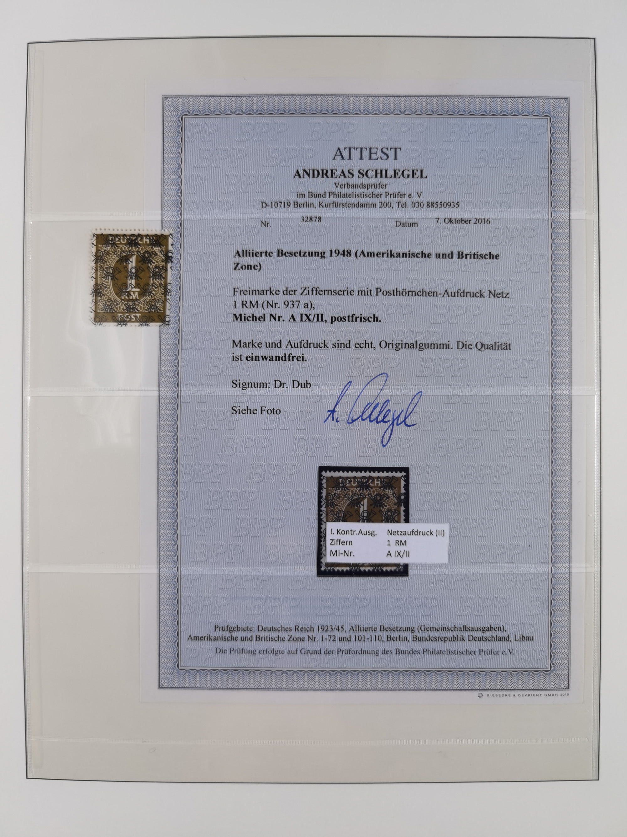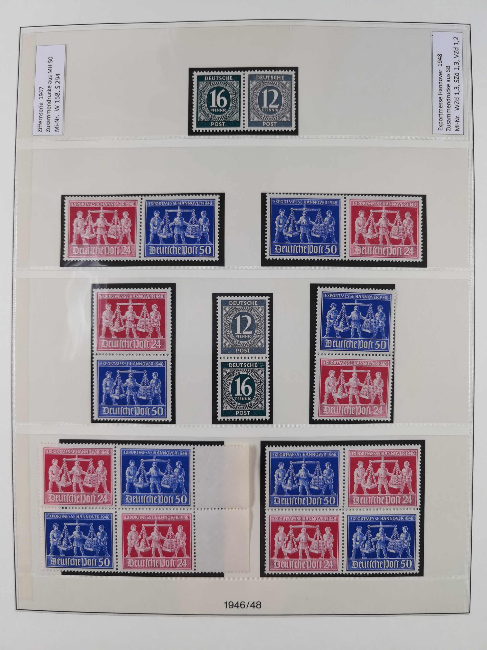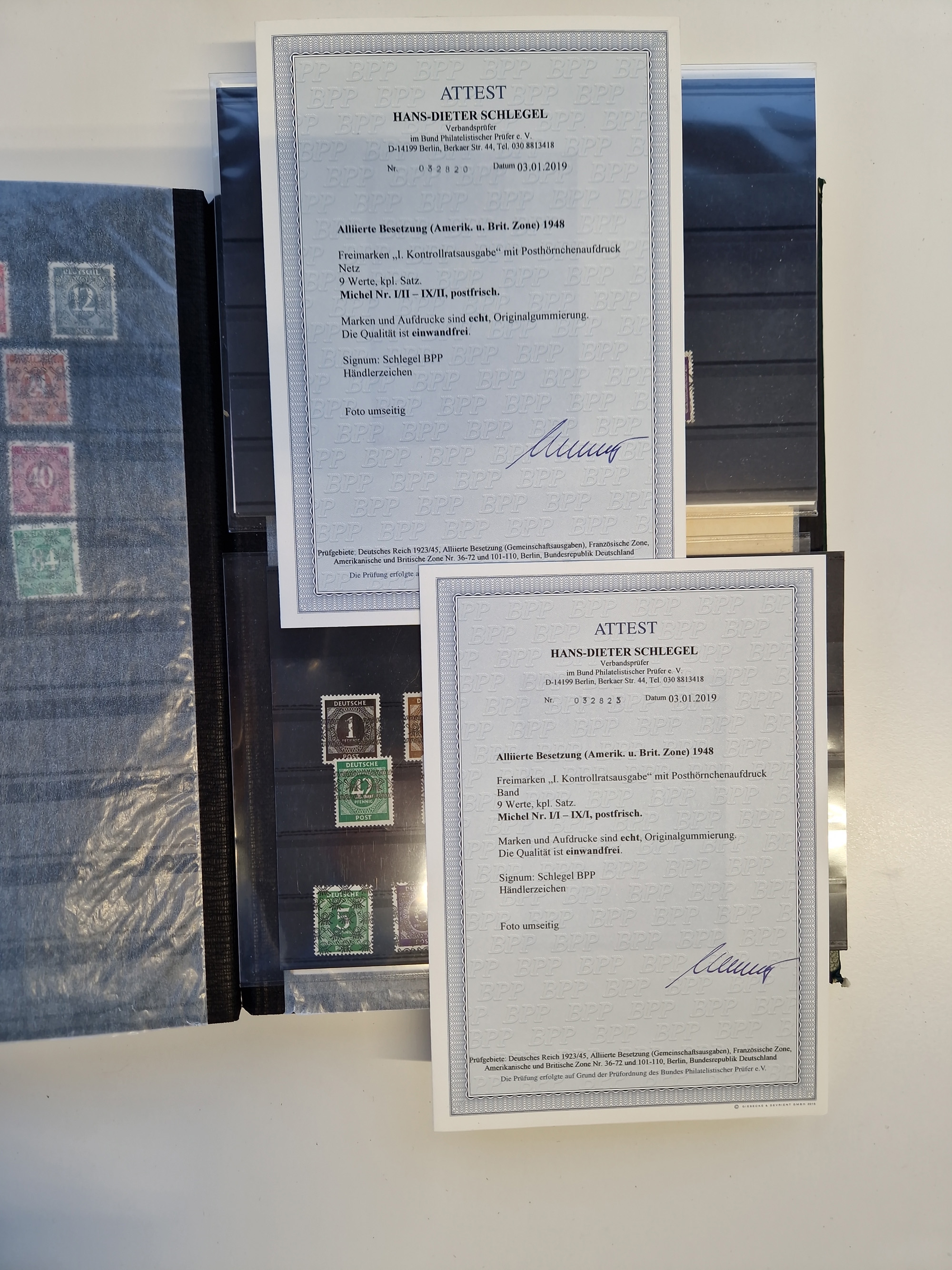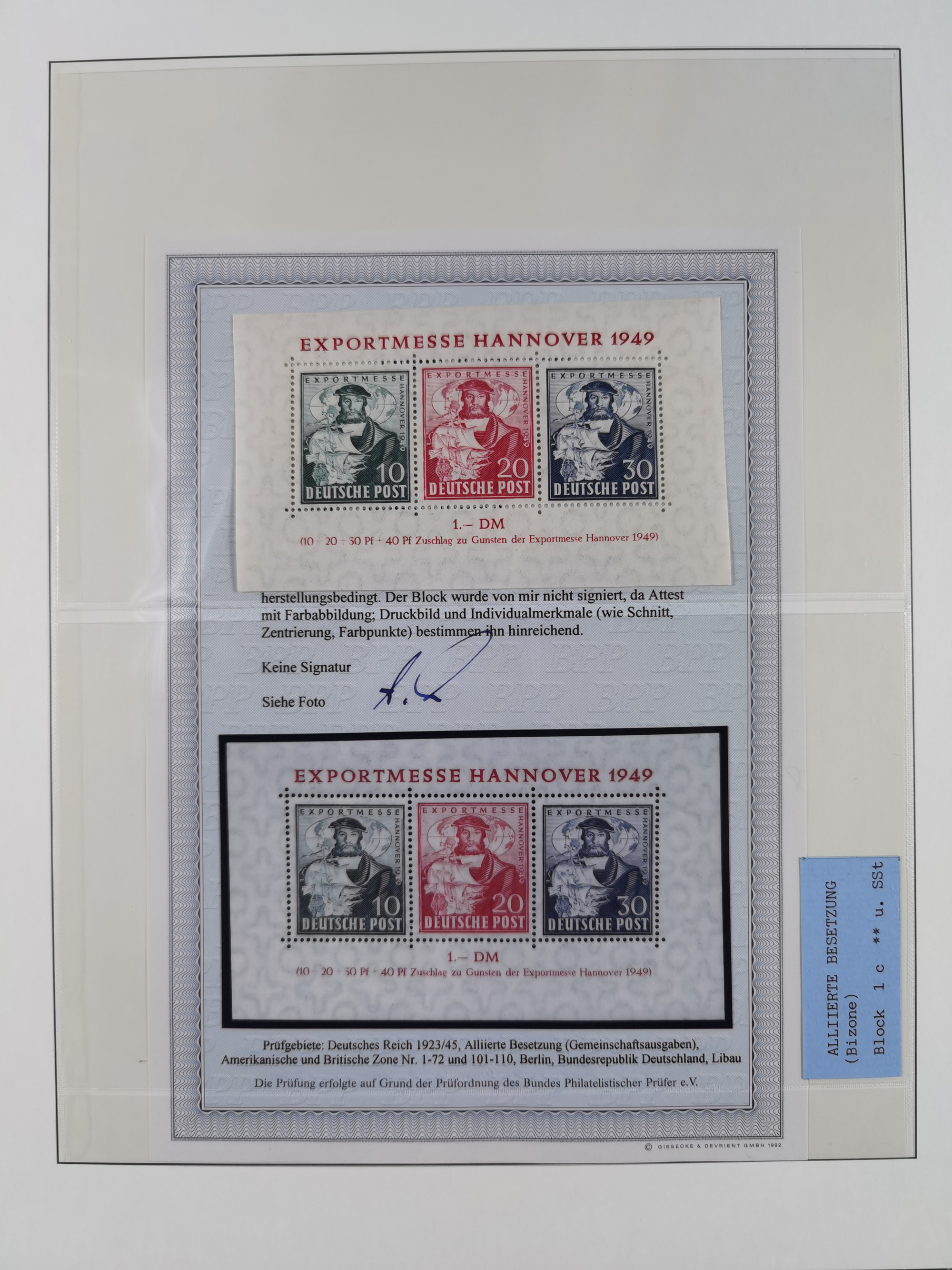 1945/49, postfrische in den Hauptnummern komplette Sammlungen Alliierte Besetzung und Bizone, dabei u.a. Mi.-Nr. A IX/II und Bl. 1c postfrisch je mit Fotoattest A. Schlegel BPP, Bl. 1a postfrisch und gestempelt sign. Schlegel BPP sowie Bauten weit gezähnt mit Oberrand und eng gezähnt teils sign. Salomon BPP, sowie Zusammendrucke, gute Erhaltung