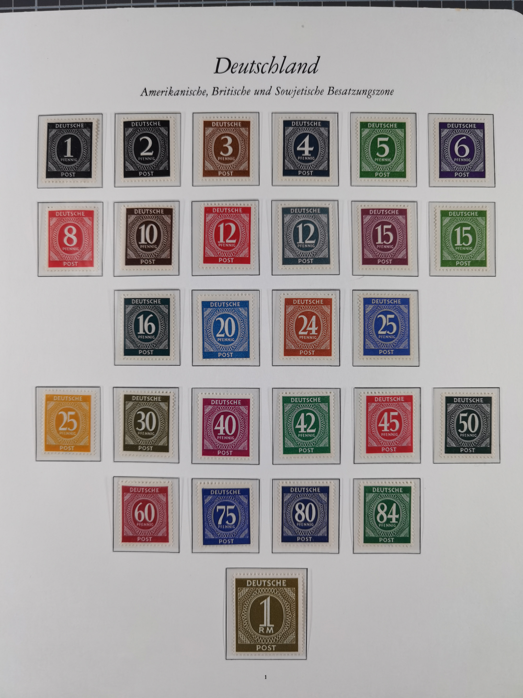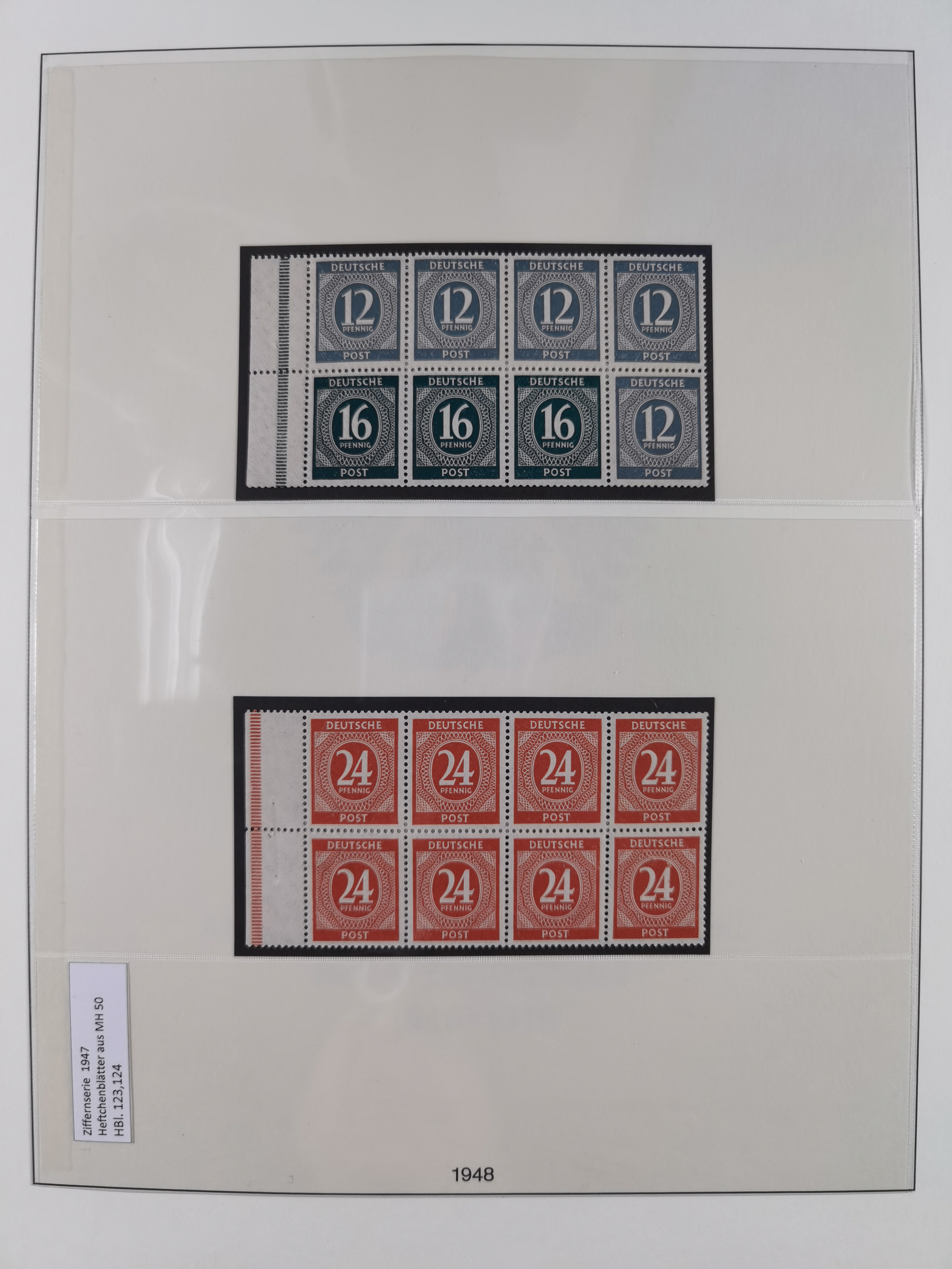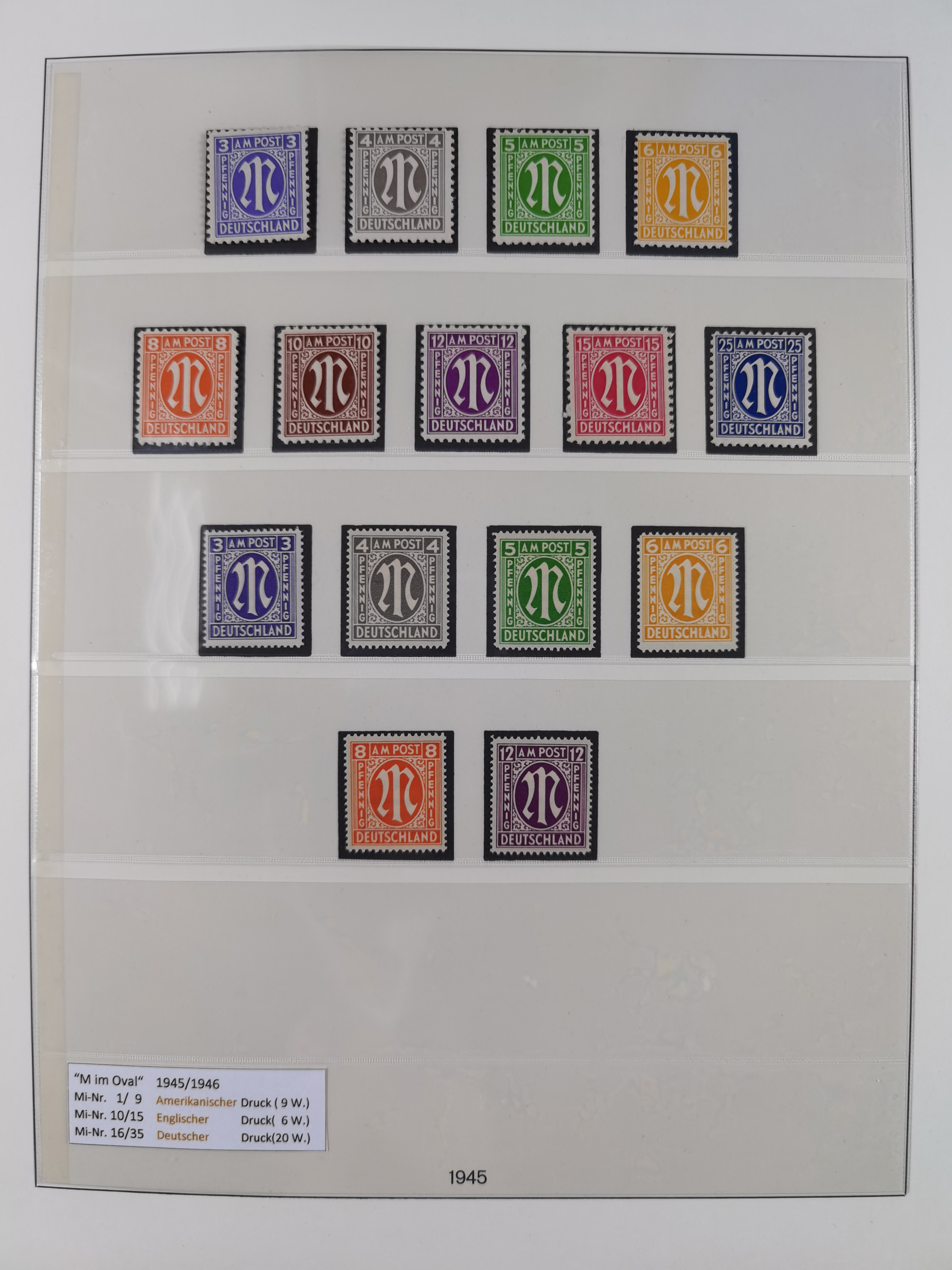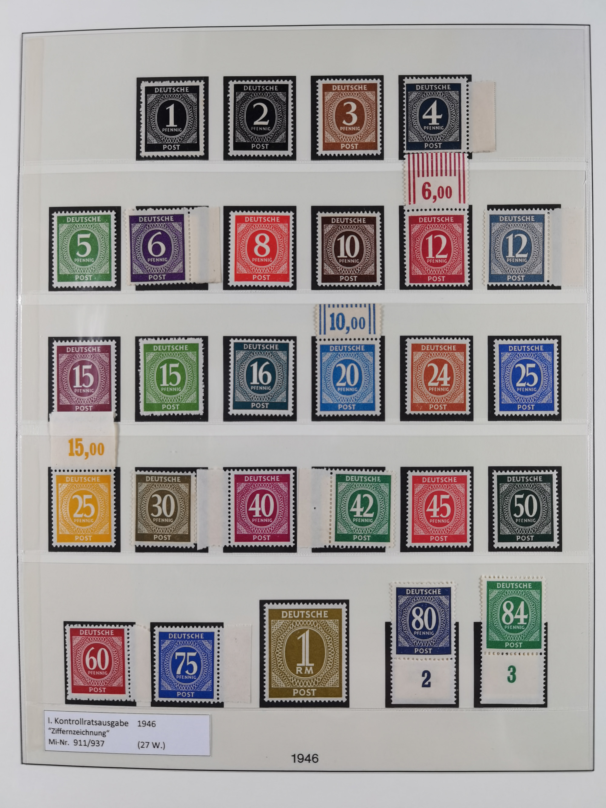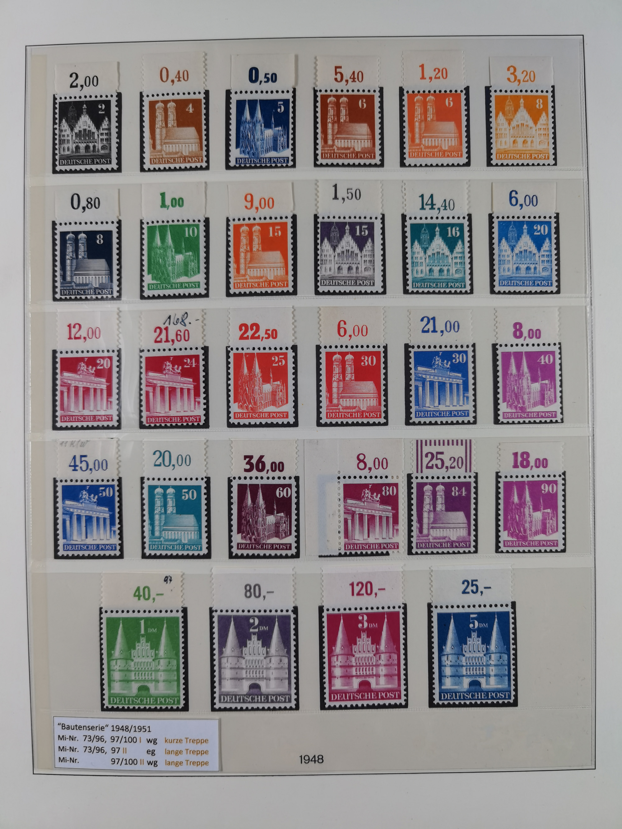 1945/49, postfrische in den Hauptnummern komplette Sammlungen Alliierte Besetzung und Bizone, dabei u.a. Mi.-Nr. A IX/II und Bl. 1c postfrisch je mit Fotoattest A. Schlegel BPP, Bl. 1a postfrisch und gestempelt sign. Schlegel BPP sowie Bauten weit gezähnt mit Oberrand und eng gezähnt teils sign. Salomon BPP, sowie Zusammendrucke, gute Erhaltung