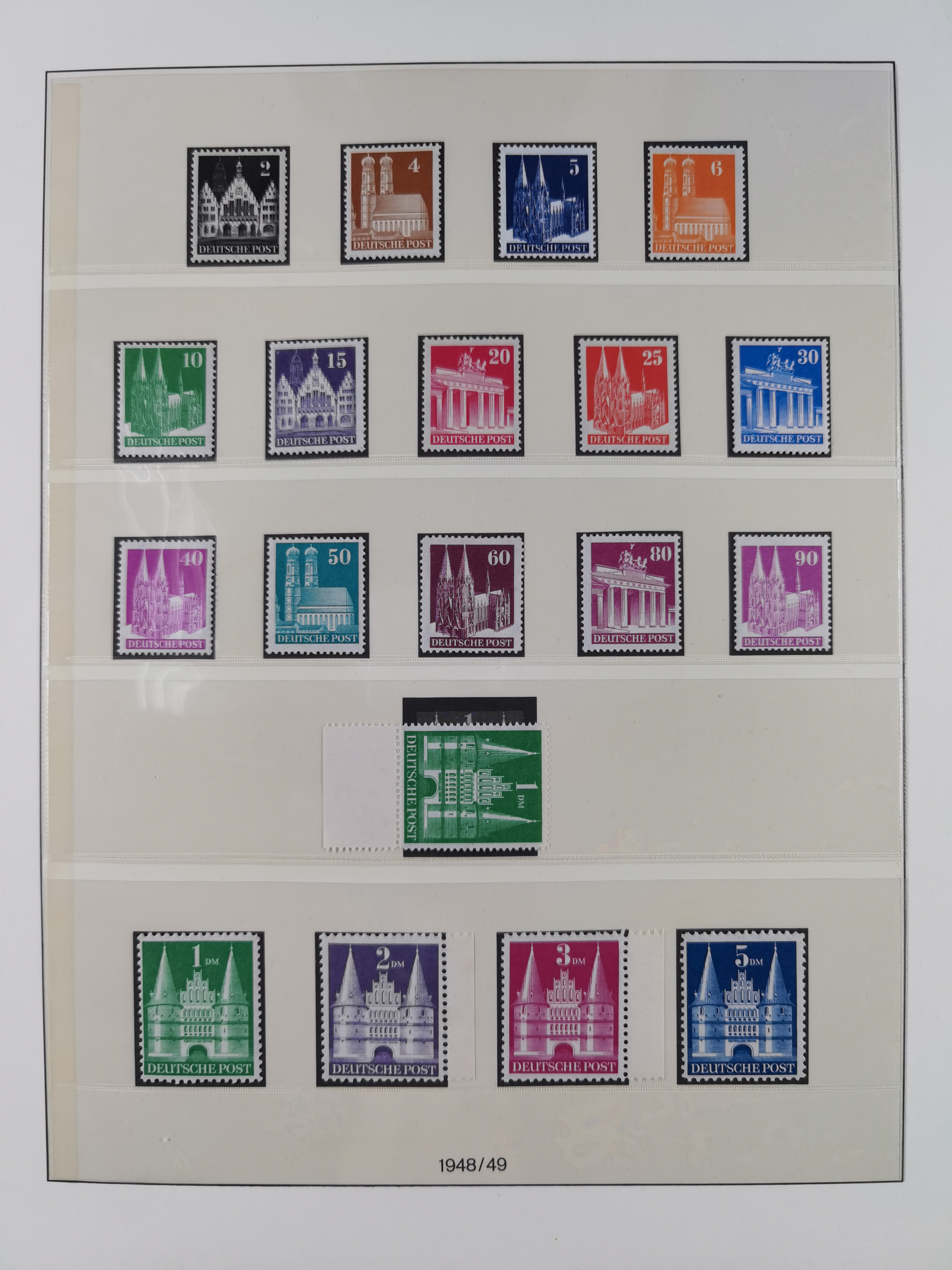 1948/2000, fast ausschließlich postfrischer Sammlungsbestand ab Berlin mit u.a. zwei Schwarzaufdruck-Sätzen, Bl. 1 je ungebraucht und nachgummiert, Bauten, Währungsgeschädigte, sowie besseren Ausgaben, Bundesrepublik 1951-2000 mit u.a. Posthorn 30, 50 und 70 Pfg. postfrisch, Heuss in großen Einheiten und mit Bogenrand, sowie einer fast kompletten Sammlung DDR, etliches mehrfach und mit Bogen- bzw. Eckrand, gute Erhaltung, in 17 Vordruckalben