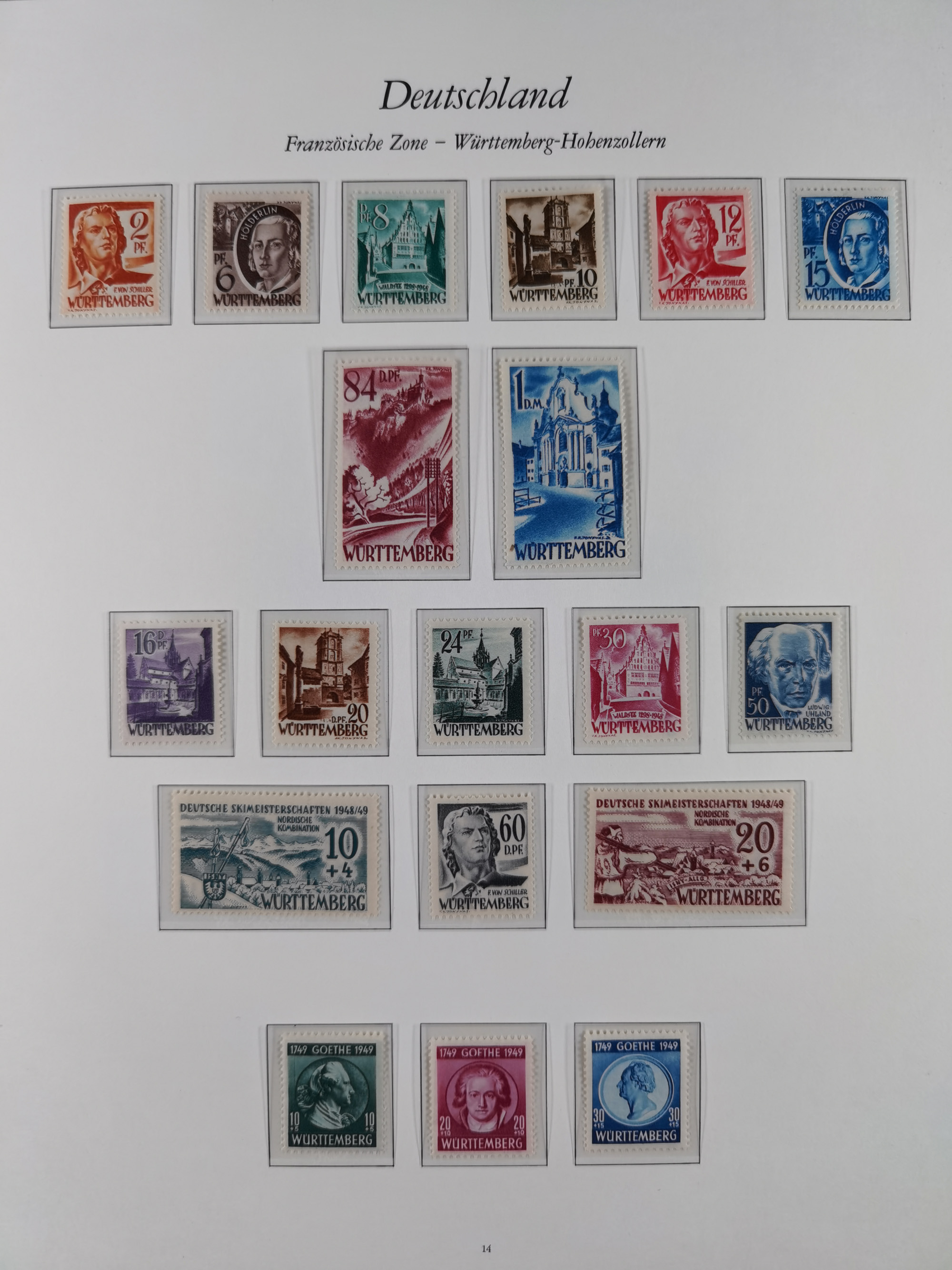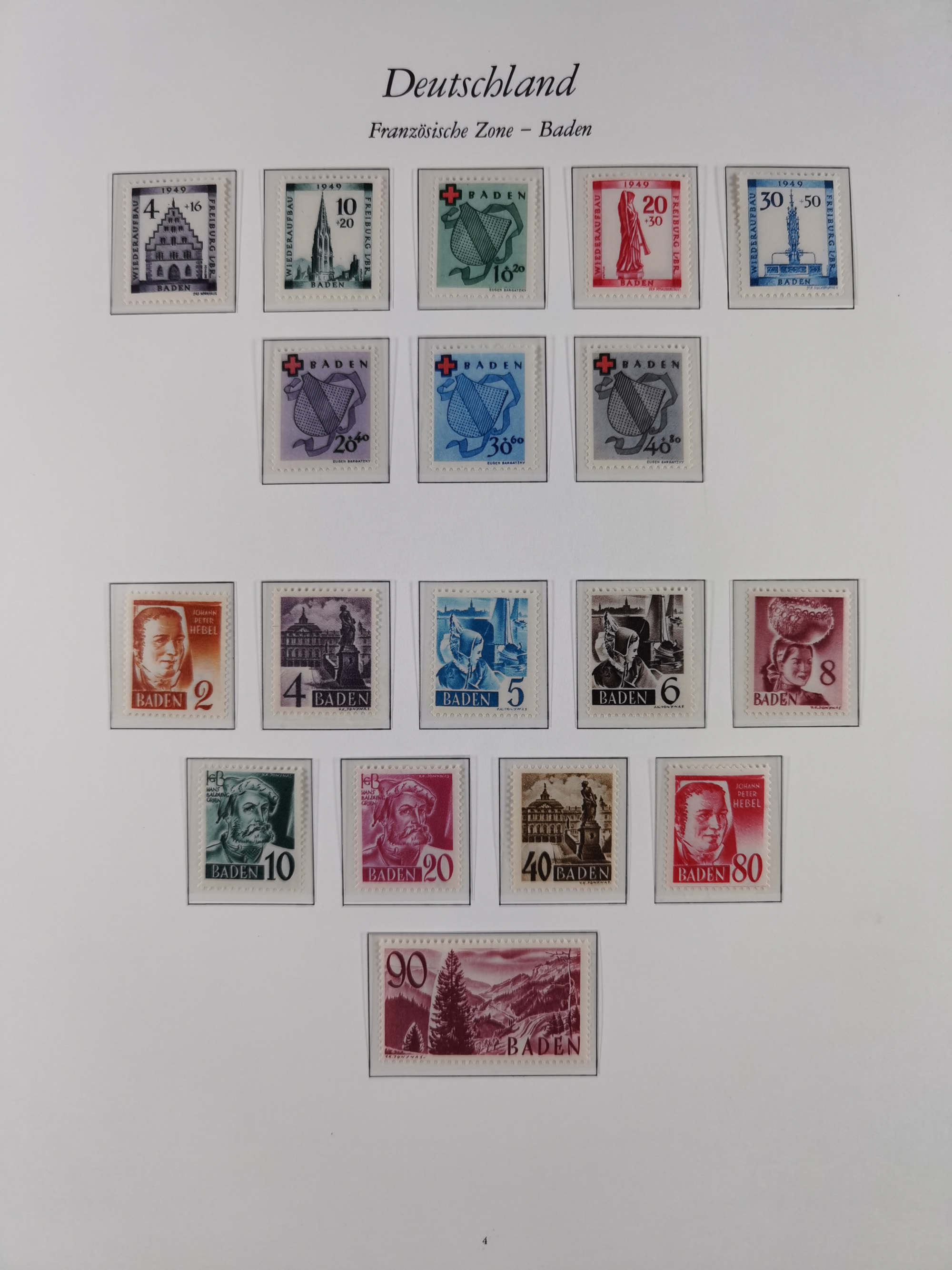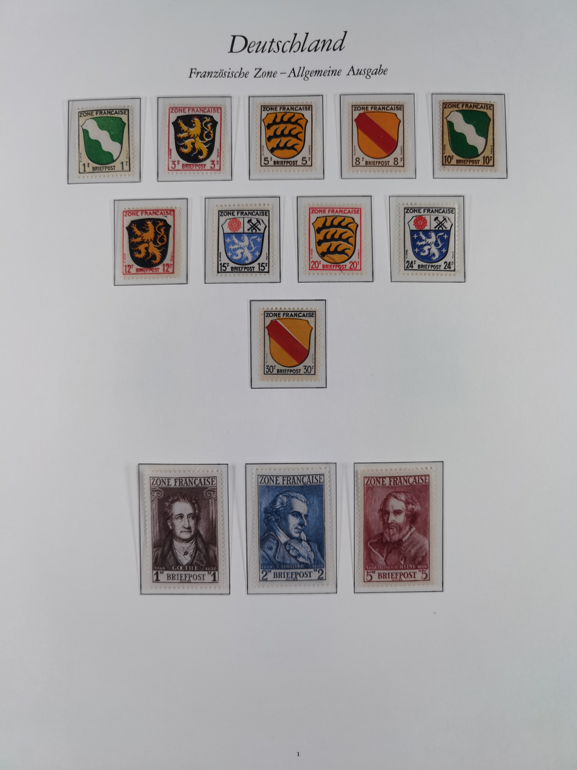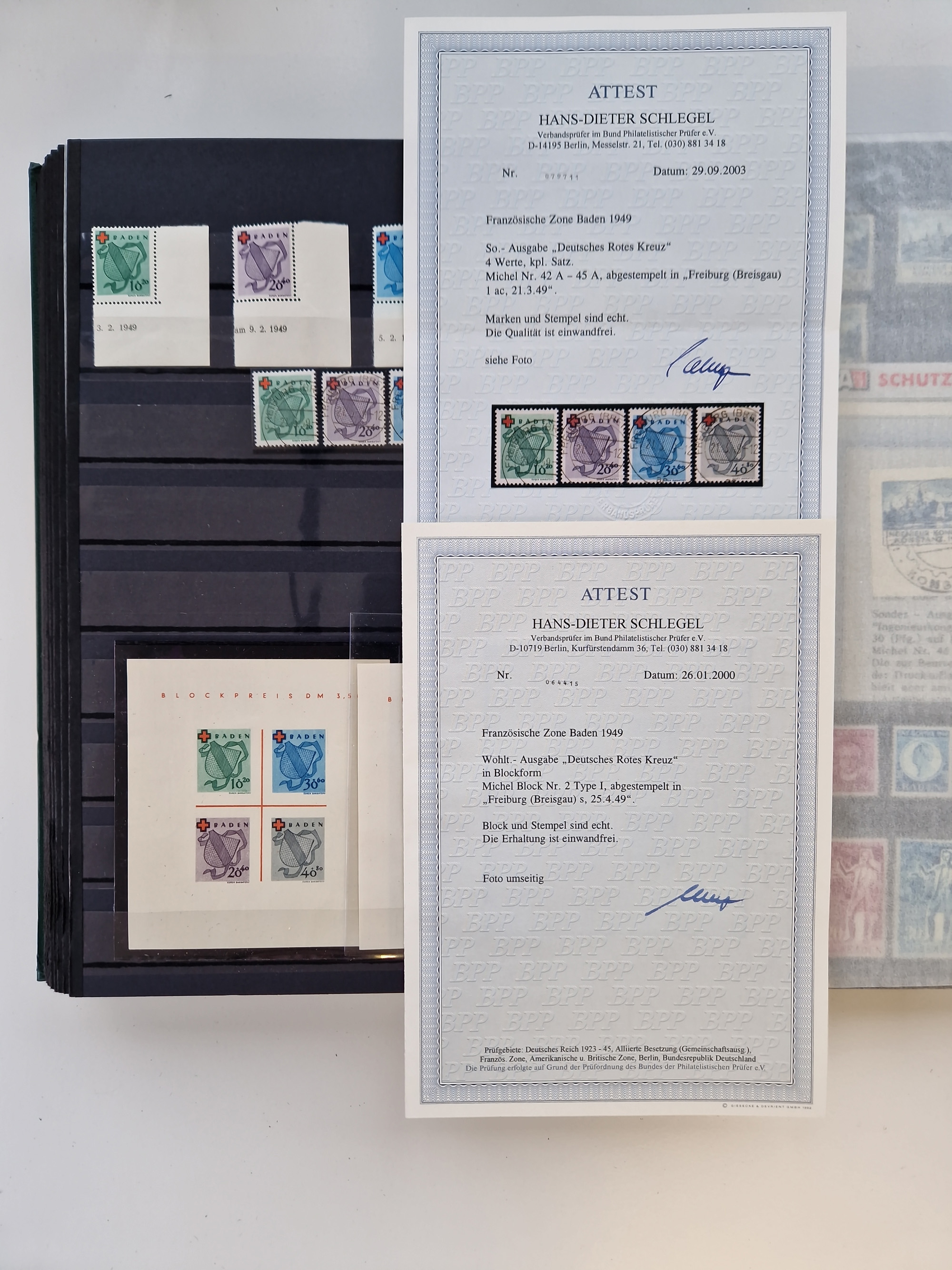 1945/49, in den Hauptnummern augenscheinlich bis auf Potschta (verlaufene Gummierung) postfrische komplette Sammlungen SBZ inkl. Blocks mit Bl. 1t und Französische Zone, inkl. Blocks mit Baden Mi.-Nr. 46II postfrisch sign. Schlegel BPP, dort einiges sign. Schlegel BPP, gute Erhaltung, im Vordruckalbum