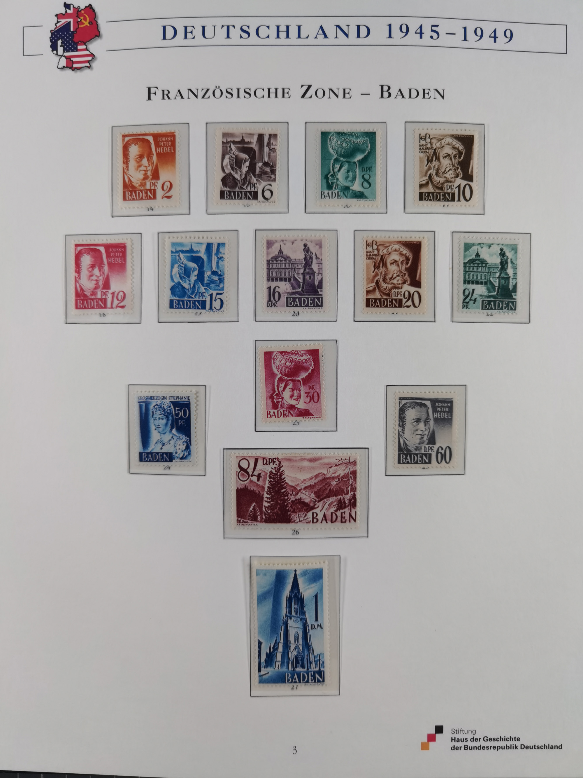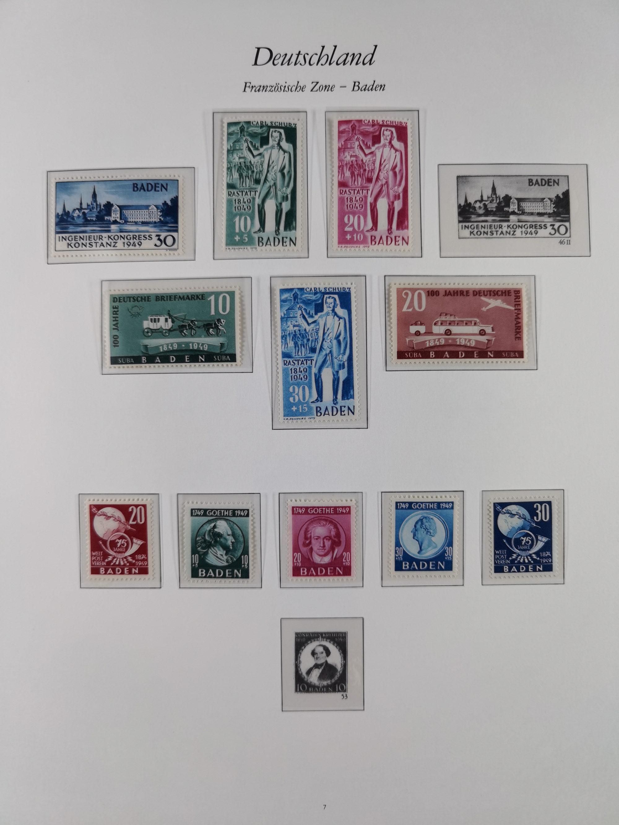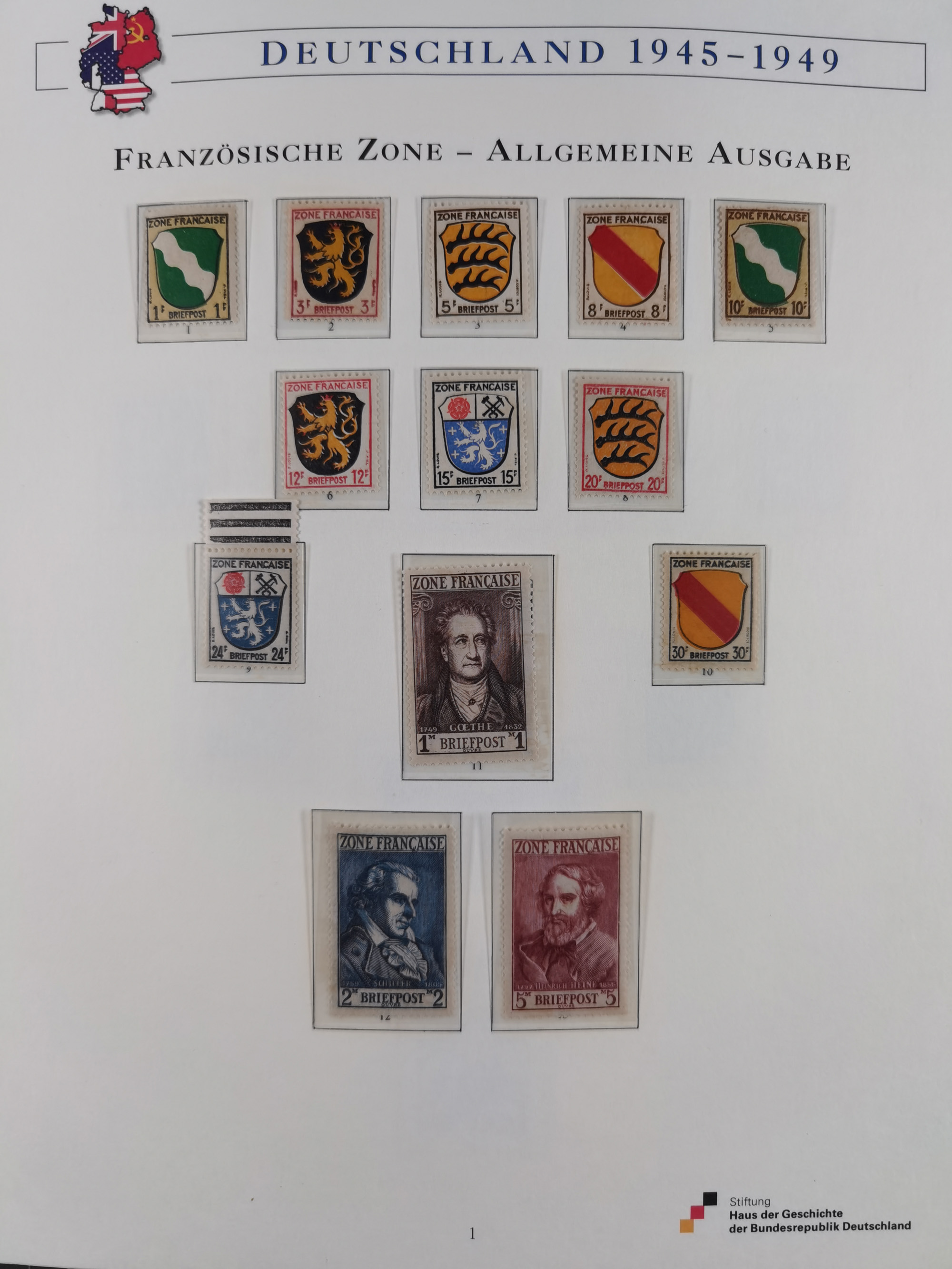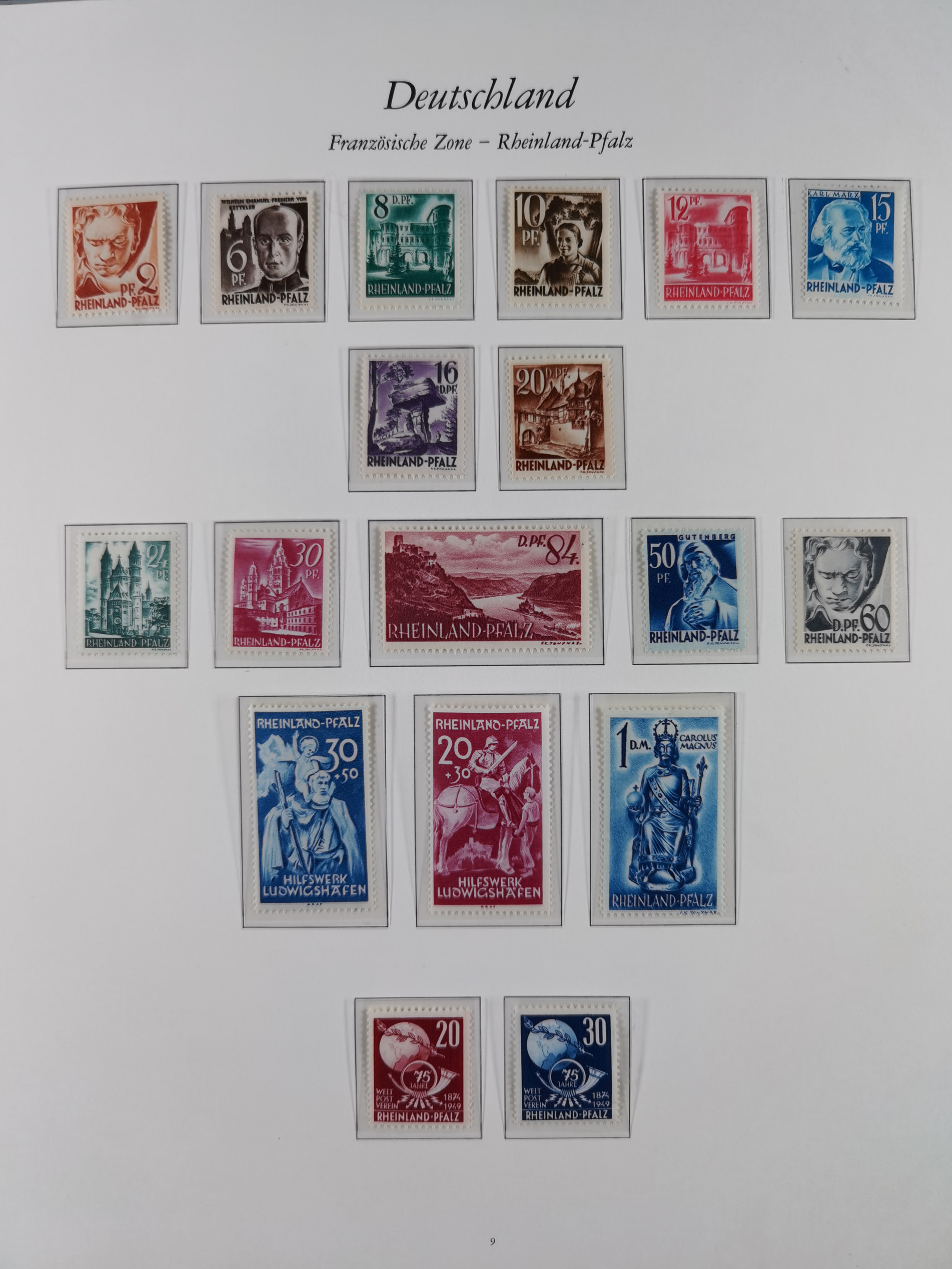 1945/49, in den Hauptnummern augenscheinlich bis auf Potschta (verlaufene Gummierung) postfrische komplette Sammlungen SBZ inkl. Blocks mit Bl. 1t und Französische Zone, inkl. Blocks mit Baden Mi.-Nr. 46II postfrisch sign. Schlegel BPP, dort einiges sign. Schlegel BPP, gute Erhaltung, im Vordruckalbum