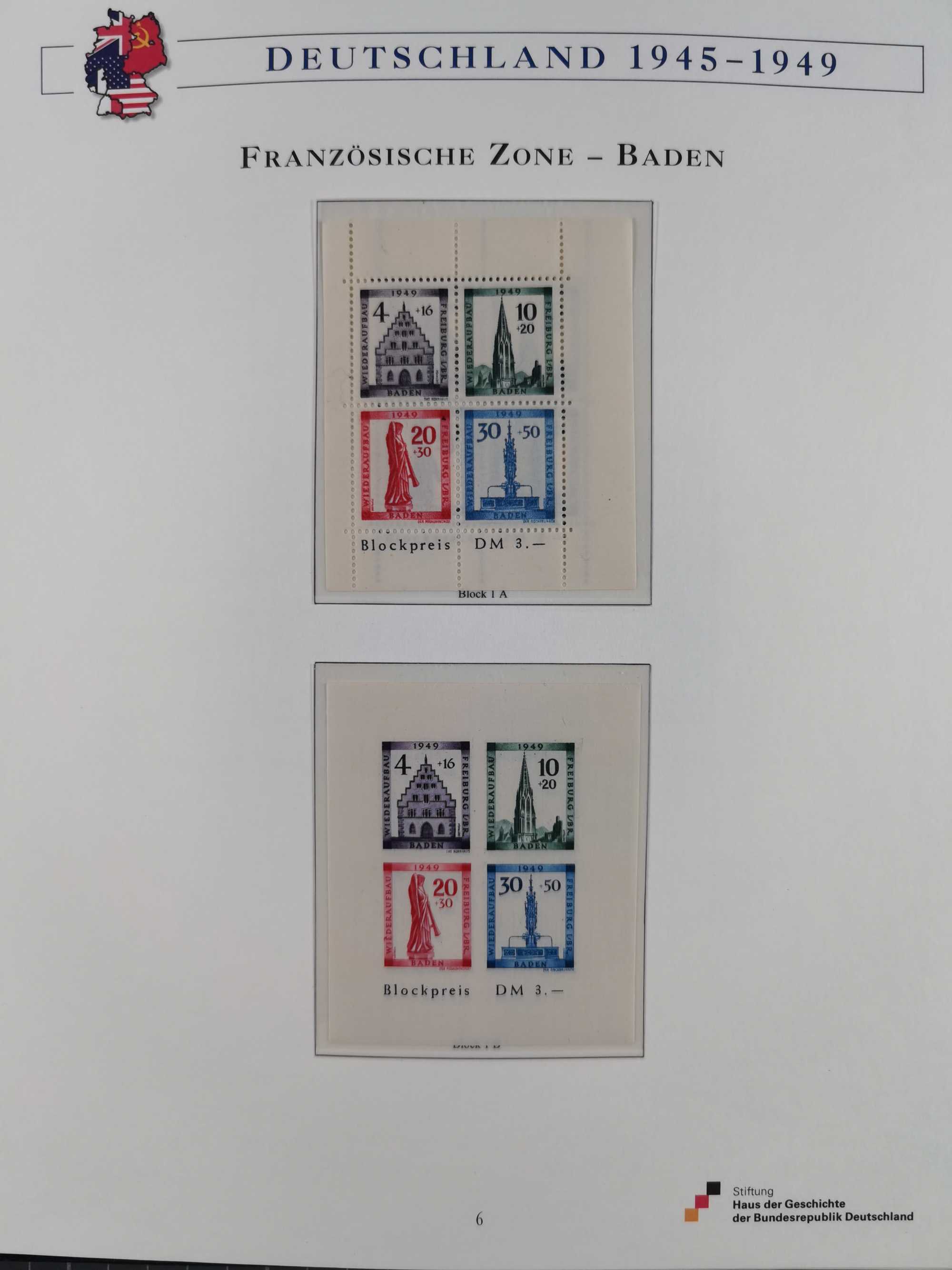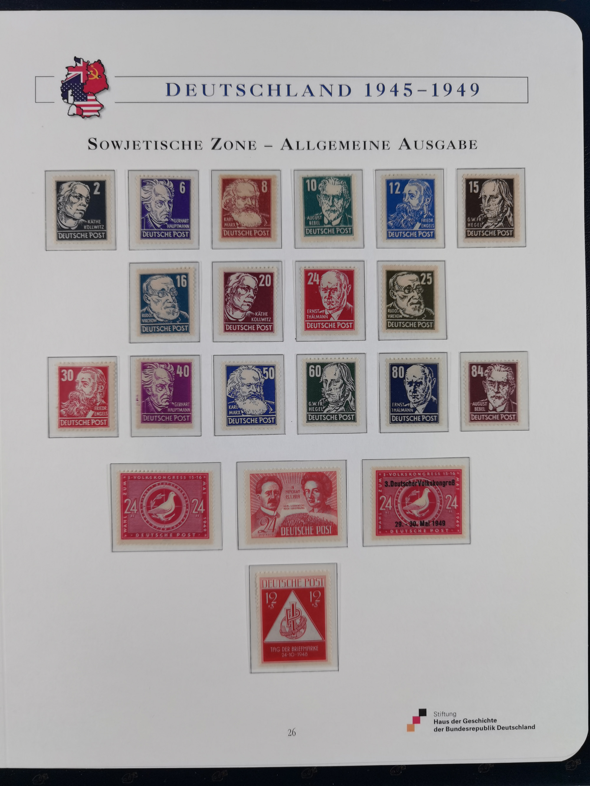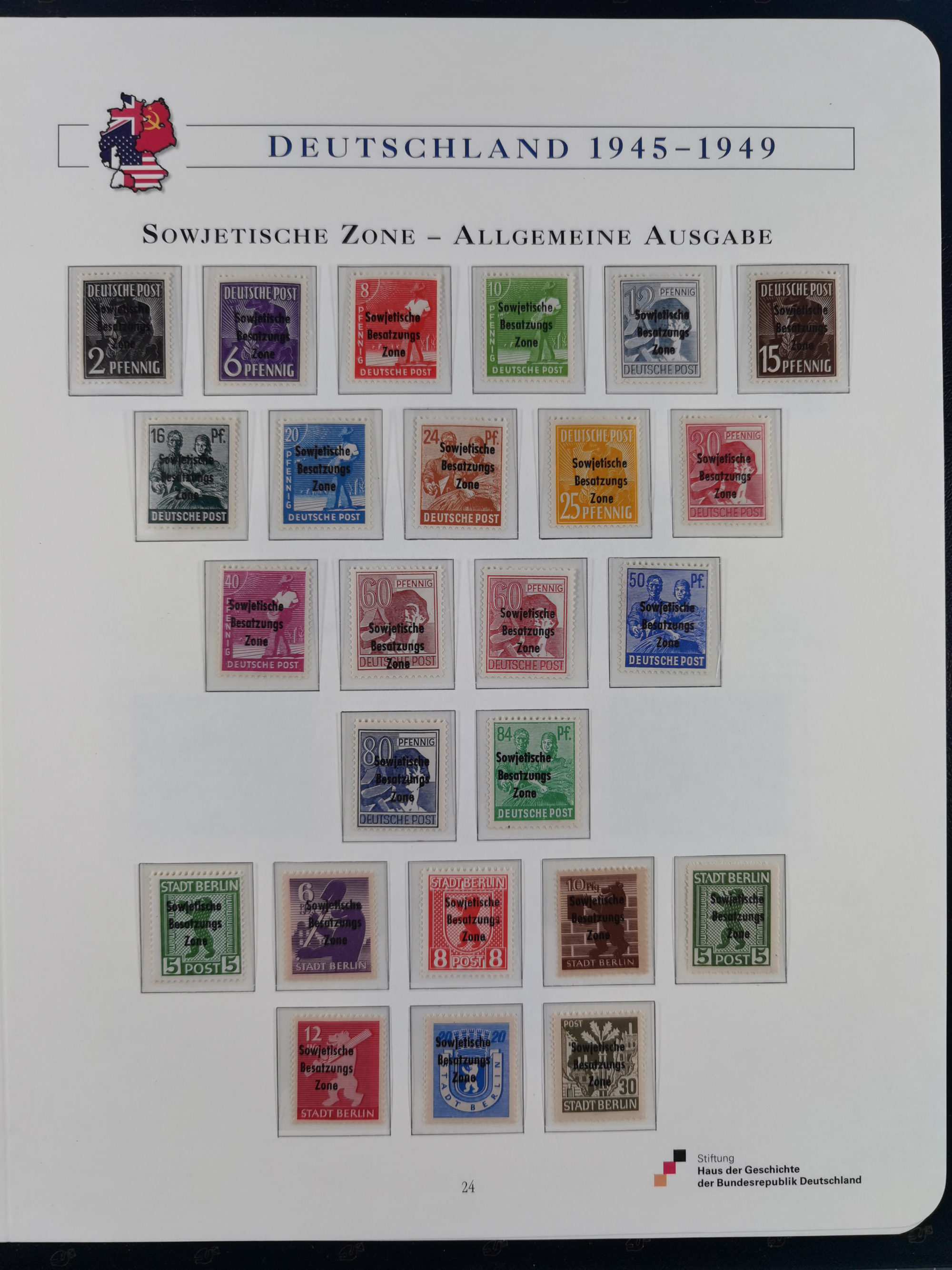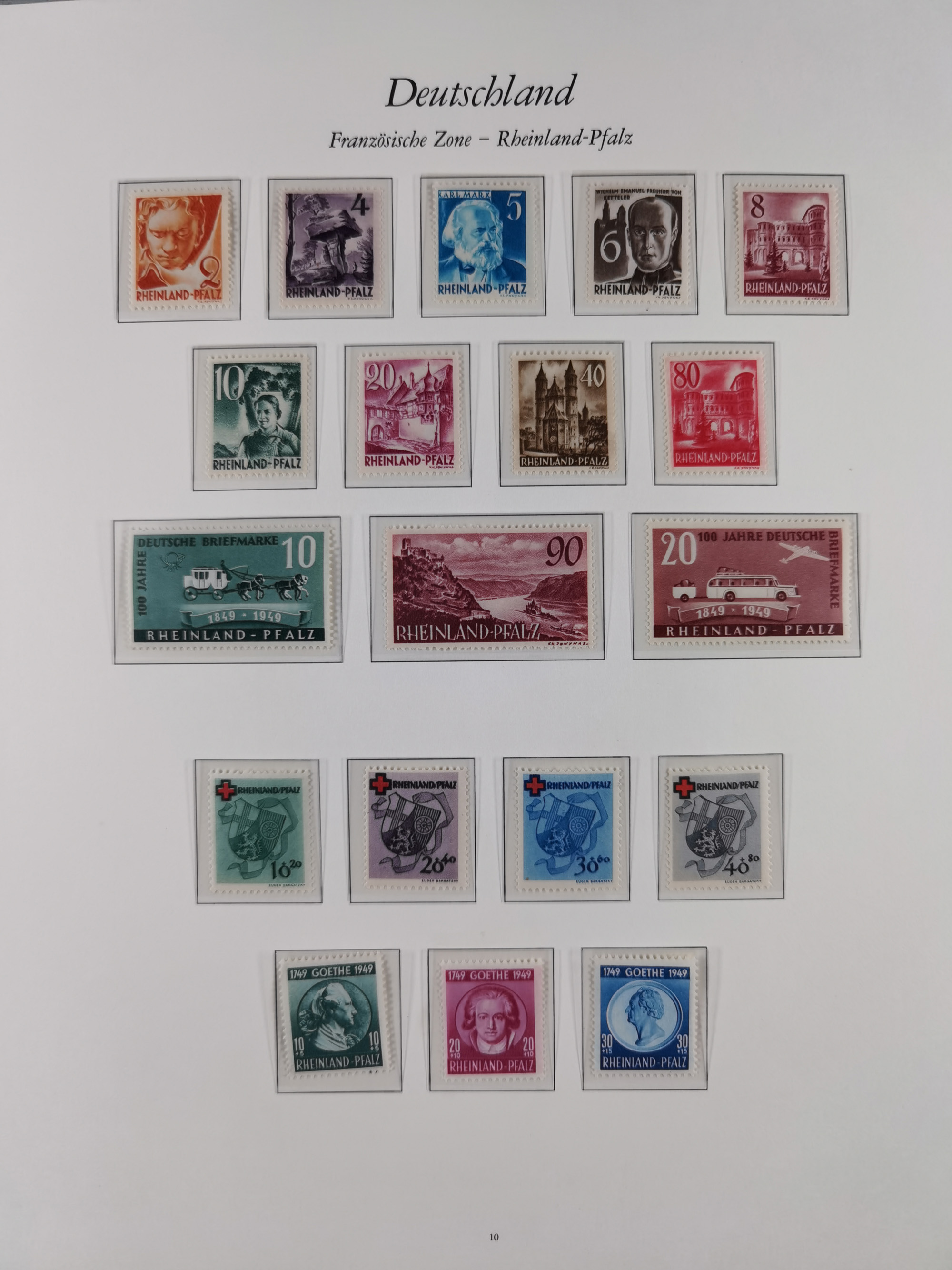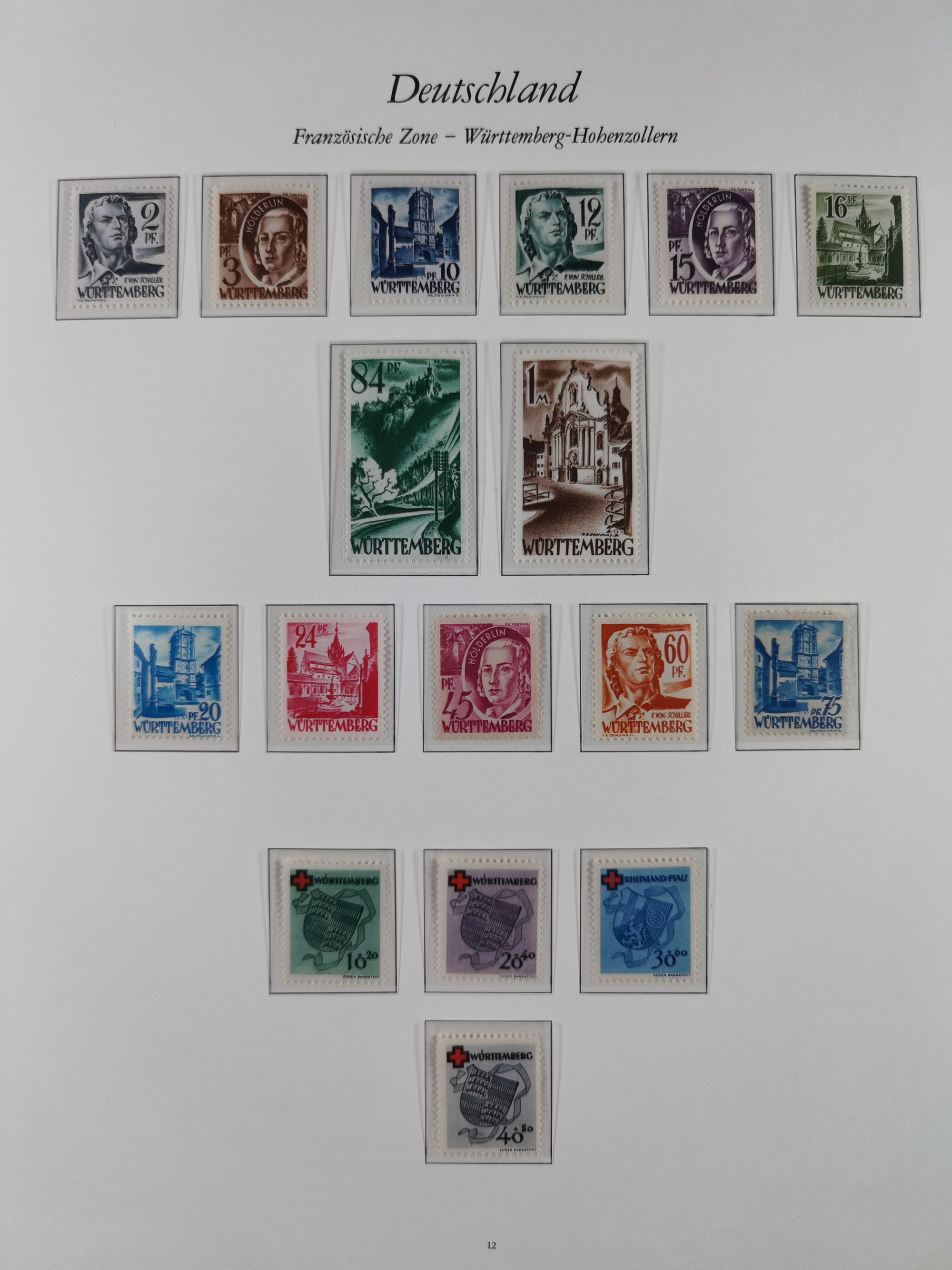 1945/49, in den Hauptnummern augenscheinlich bis auf Potschta (verlaufene Gummierung) postfrische komplette Sammlungen SBZ inkl. Blocks mit Bl. 1t und Französische Zone, inkl. Blocks mit Baden Mi.-Nr. 46II postfrisch sign. Schlegel BPP, dort einiges sign. Schlegel BPP, gute Erhaltung, im Vordruckalbum