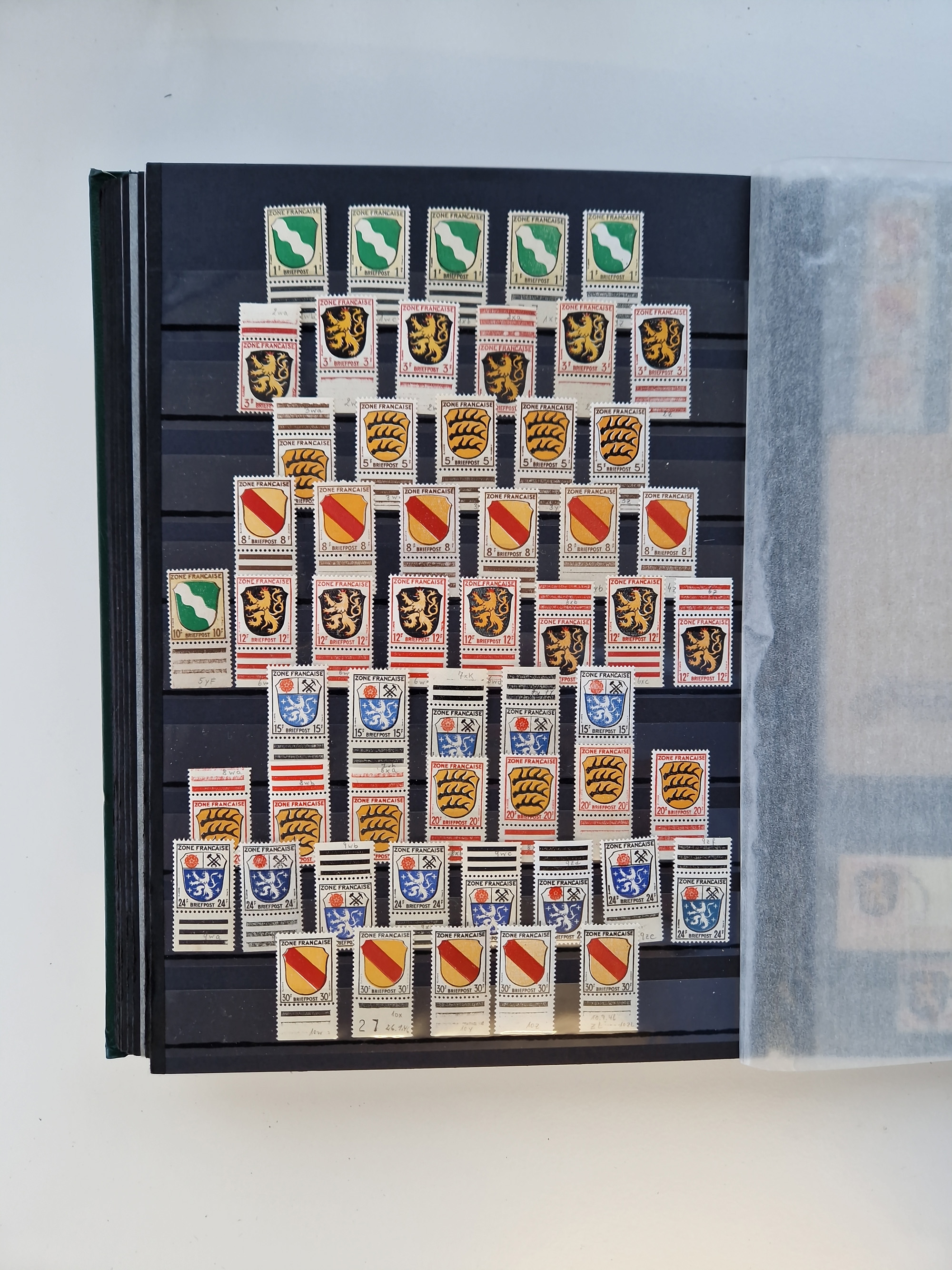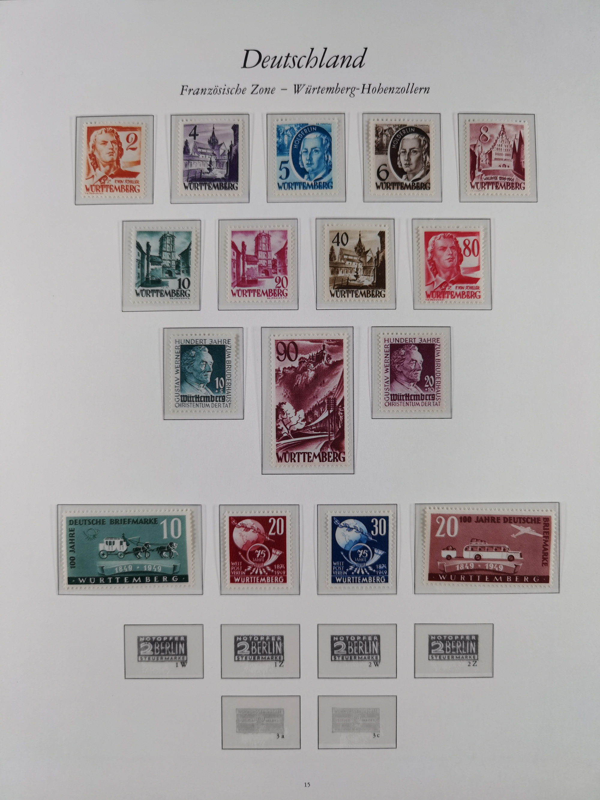 1945/49, postfrische Sammlungen Französische Zone bis auf Baden Mi.-Nr. 53 kpl. inkl. Blocks sowie Bizone in den Hauptnummern kpl. inkl. Mi.-Nr. 52-68I/II sign. Dub, Mi.-Nr. I-XI I/II sign. Dub und Schlegel BPP, sowie Bauten eng und weit gezähnt inkl. 97-100I/II, gute Erhaltung