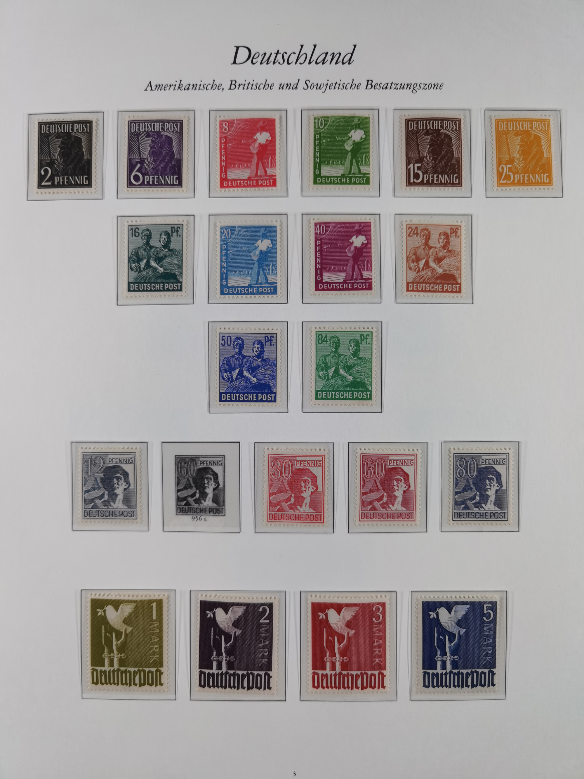 1948/2001, vorwiegend postfrische Sammlung, dabei Bund, Berlin und DDR in den Hauptnummern augenscheinlich komplett, außerdem Französische Zone und Saarland, bis auf einen Rot-Kreuz-Block komplett, SBZ mit besseren inkl. Blockausgaben, Bizone inkl. 52 Werte usw., wenige Werte ungebraucht bzw. nachgummiert, meist gute Erhaltung