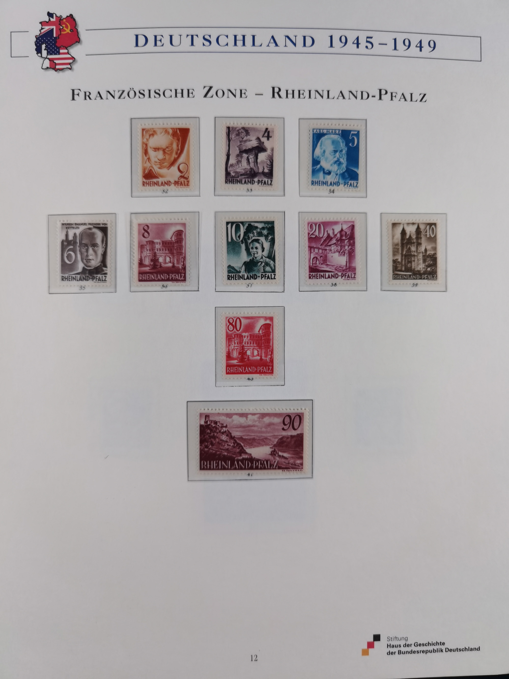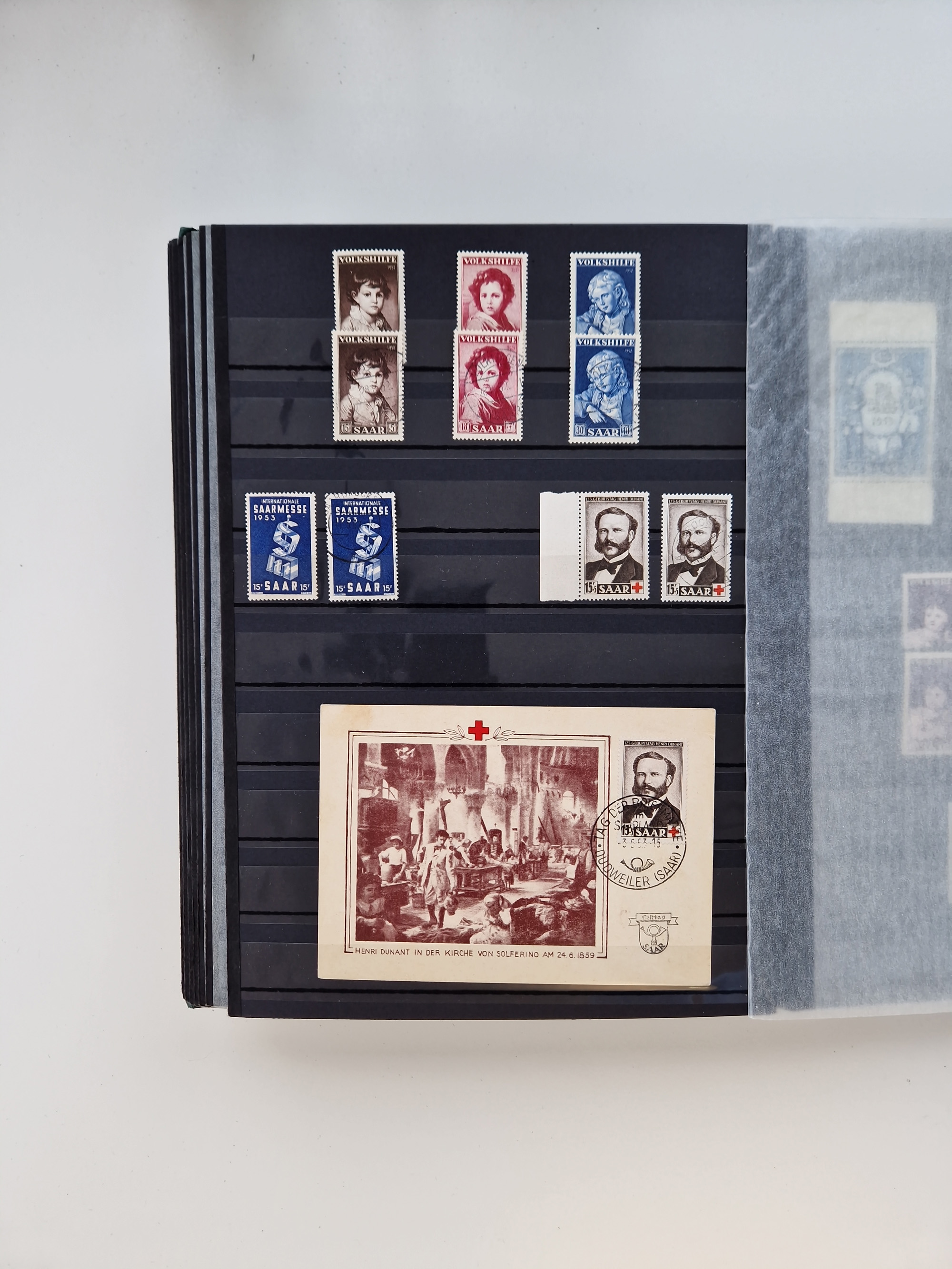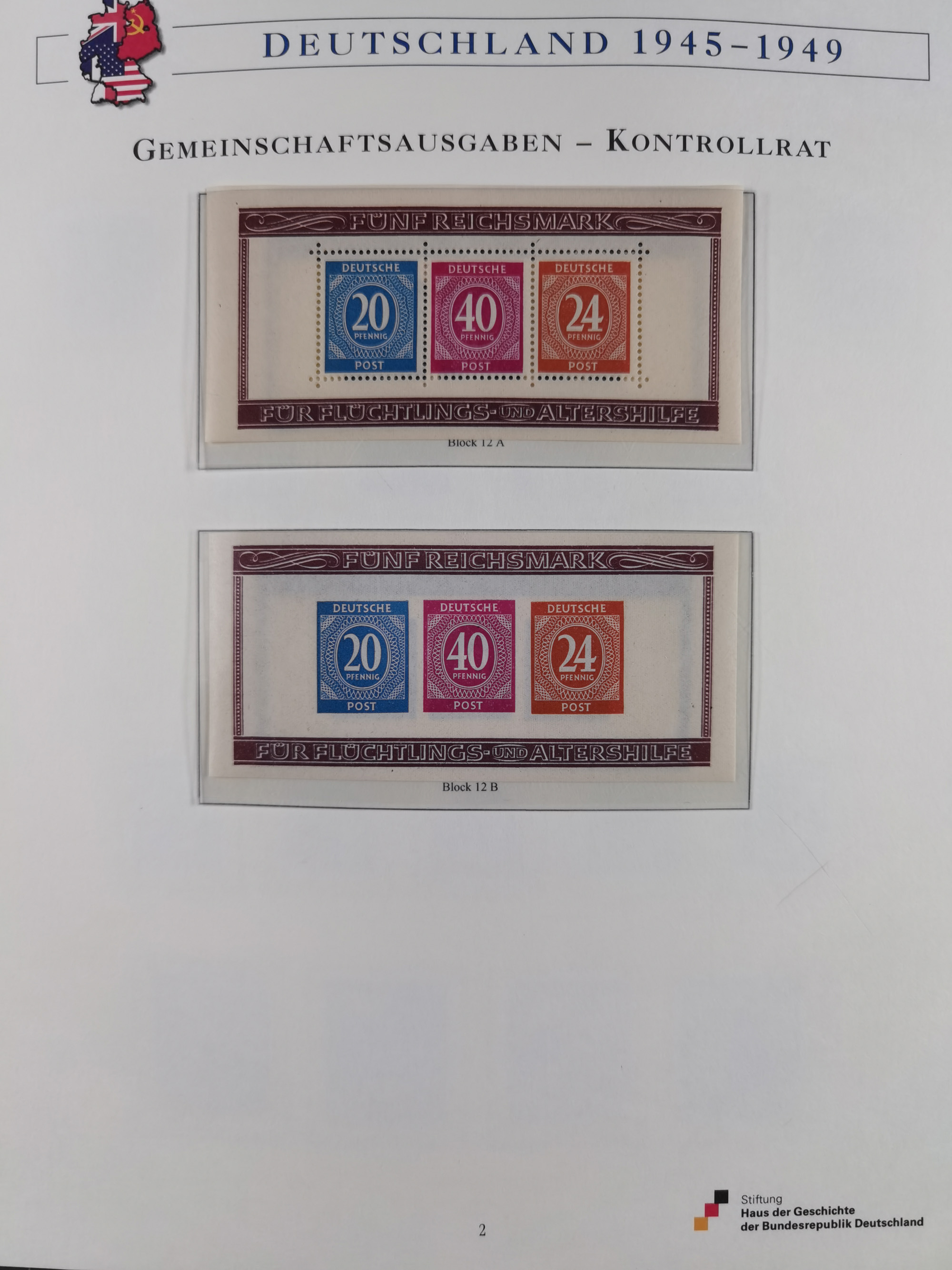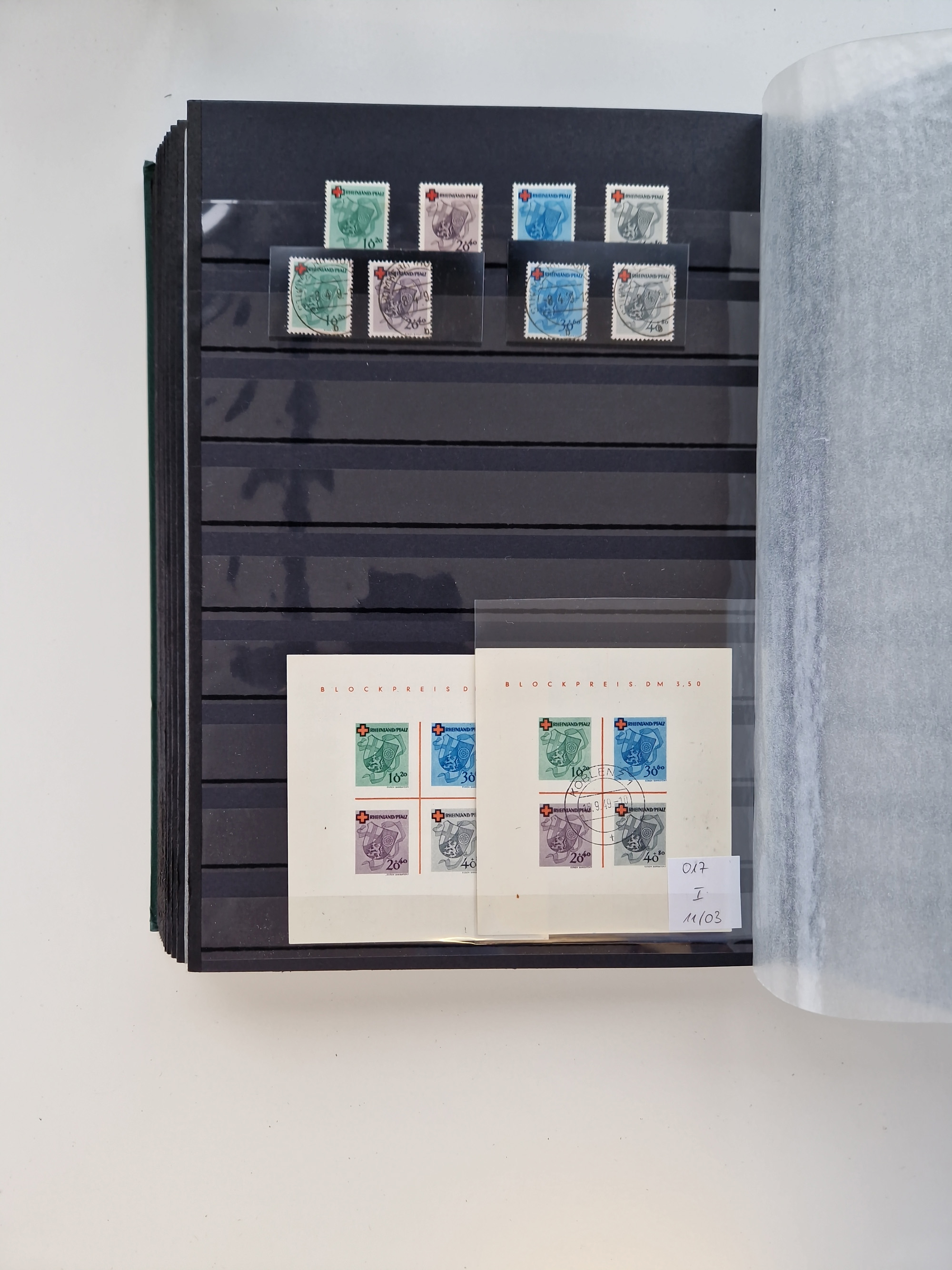1945/59, Gemeinschaftsausgaben, FZ, Bizone und Saarland, Sammlung in zwei Vordruckalben mit u.a. Bl. 12 A/B, gutem Teil Bauten, 2 Rotes Kreuz-Blocks, etc.