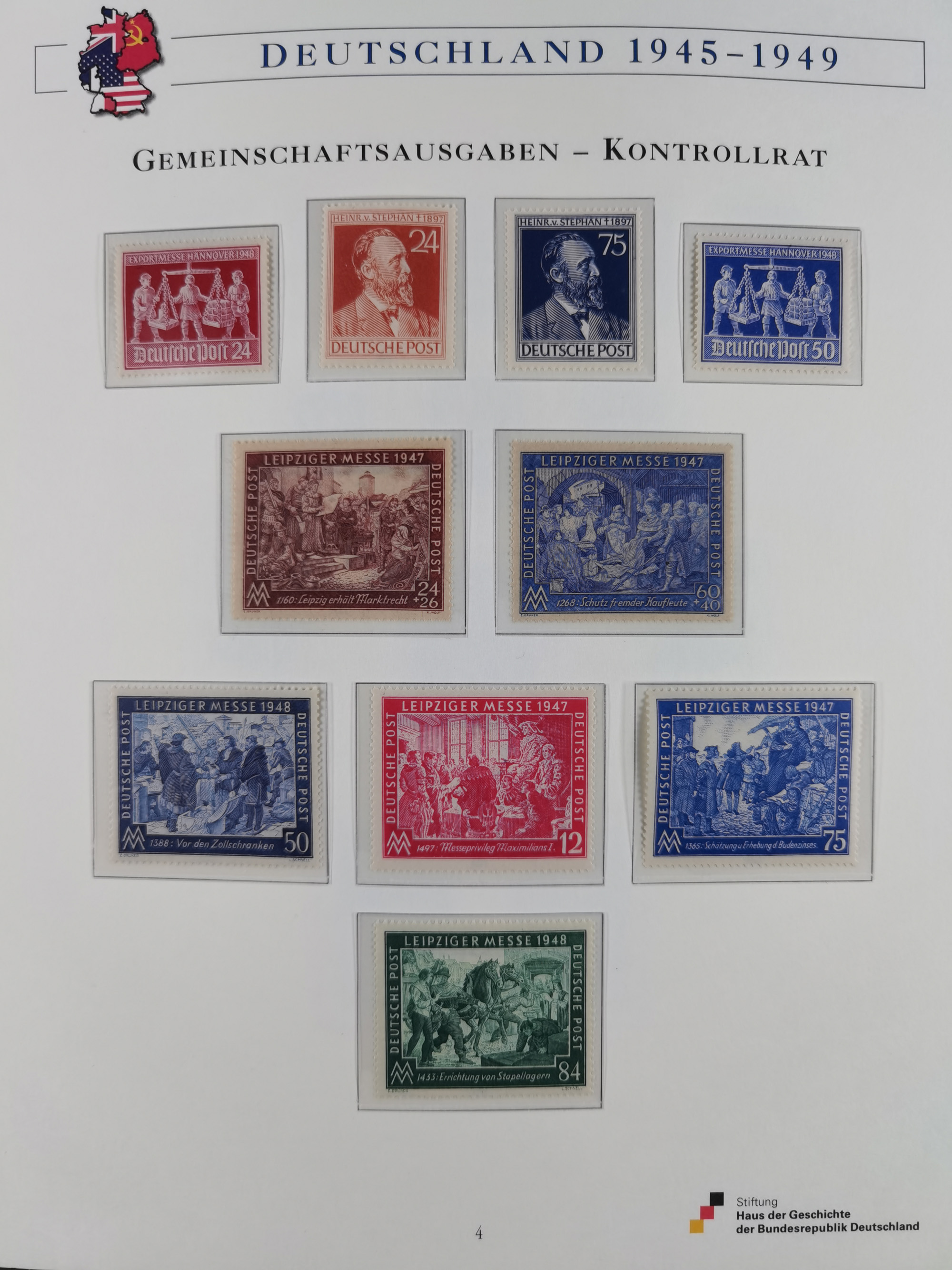 1945/48, Kontrollrat und Bizone, postfrische, ungebrauchte und gestempelte reichhaltige Partie in vier Steckbüchern, dabei mehrere Sätze Mi.52-68, div. Bauten weit und eng gezähnt, rund 40 Marken mit Platten-Nummern, Bl. 12A/B (10), über zwanzig Bl.1, etc.