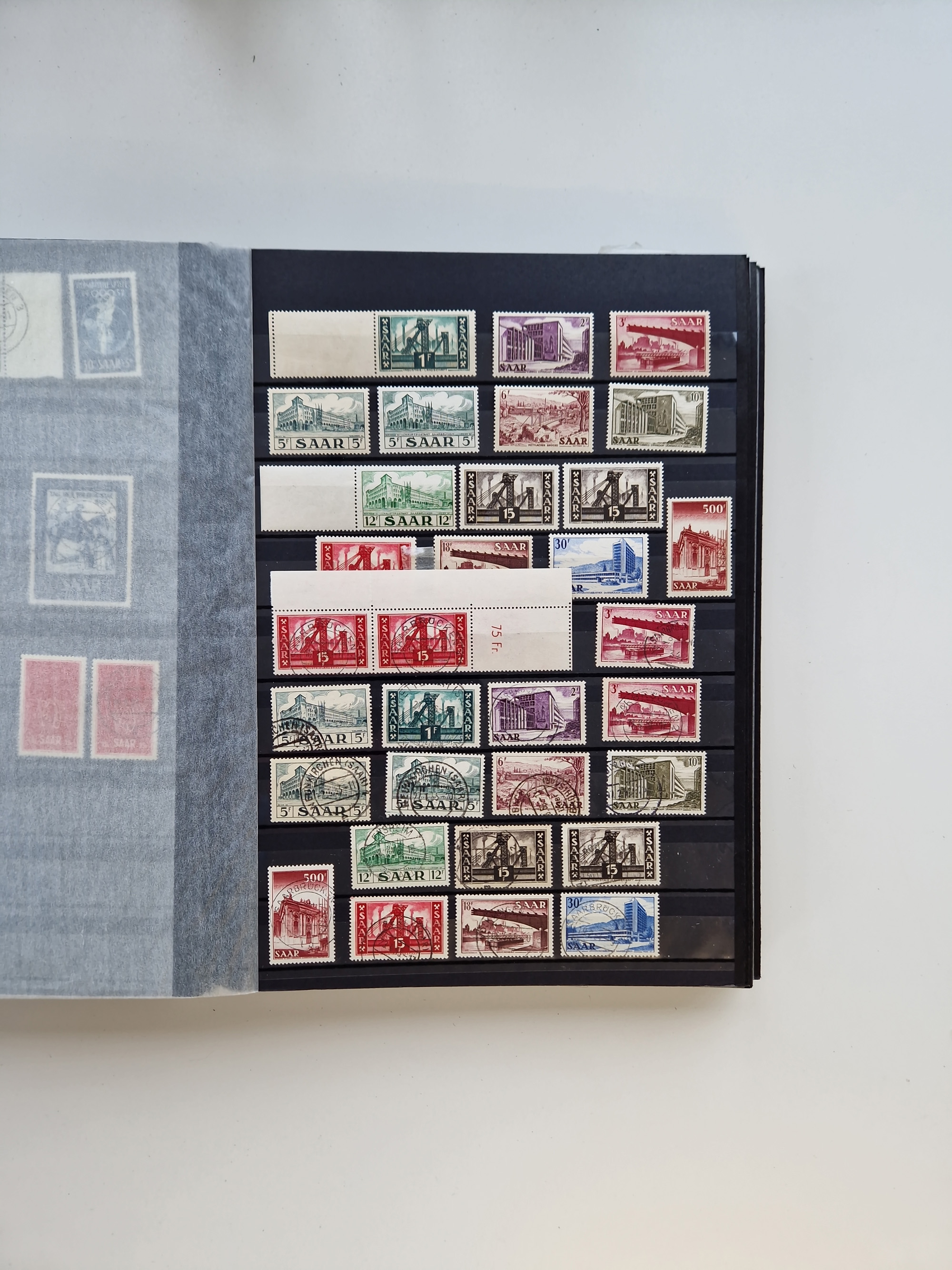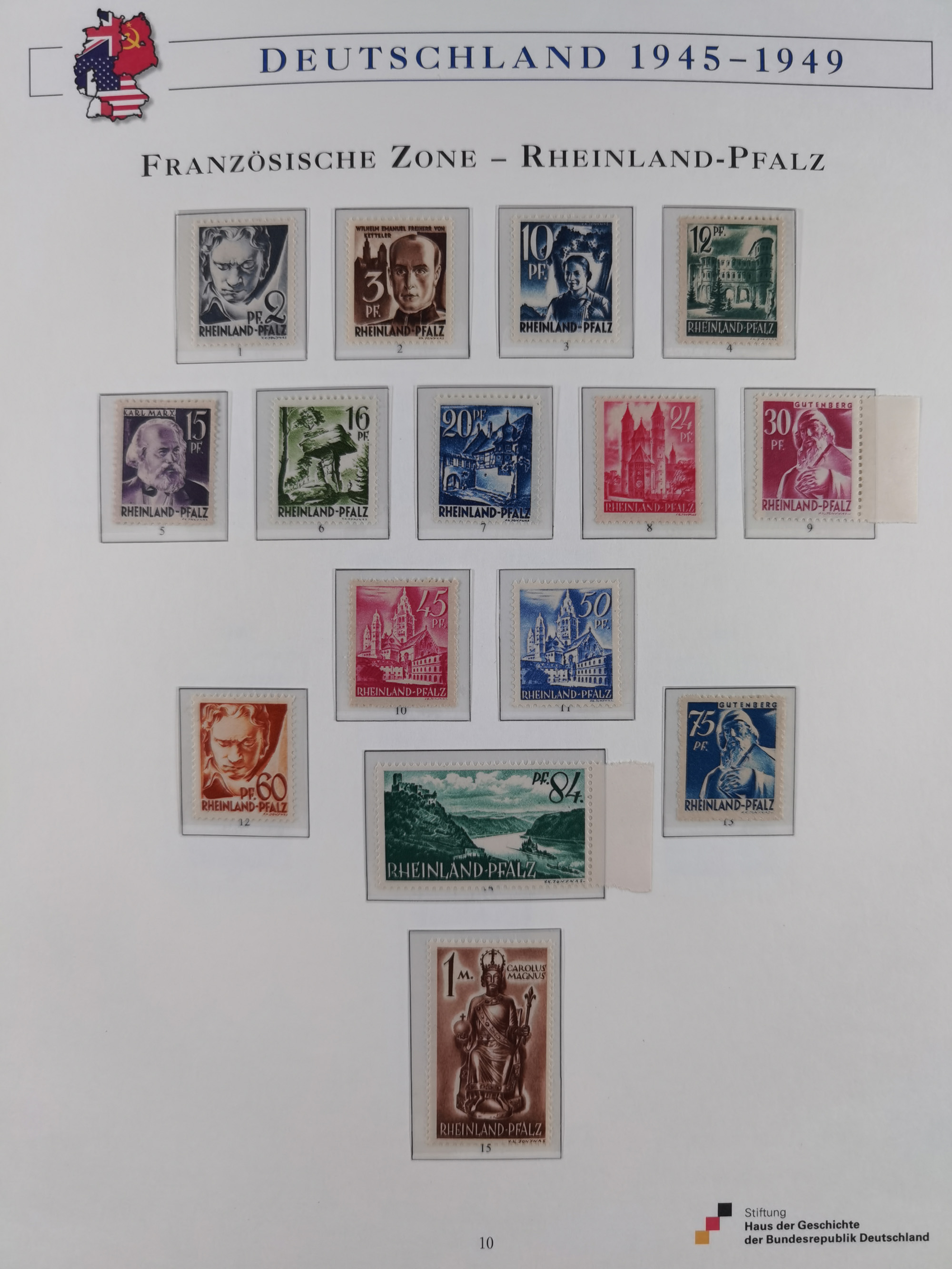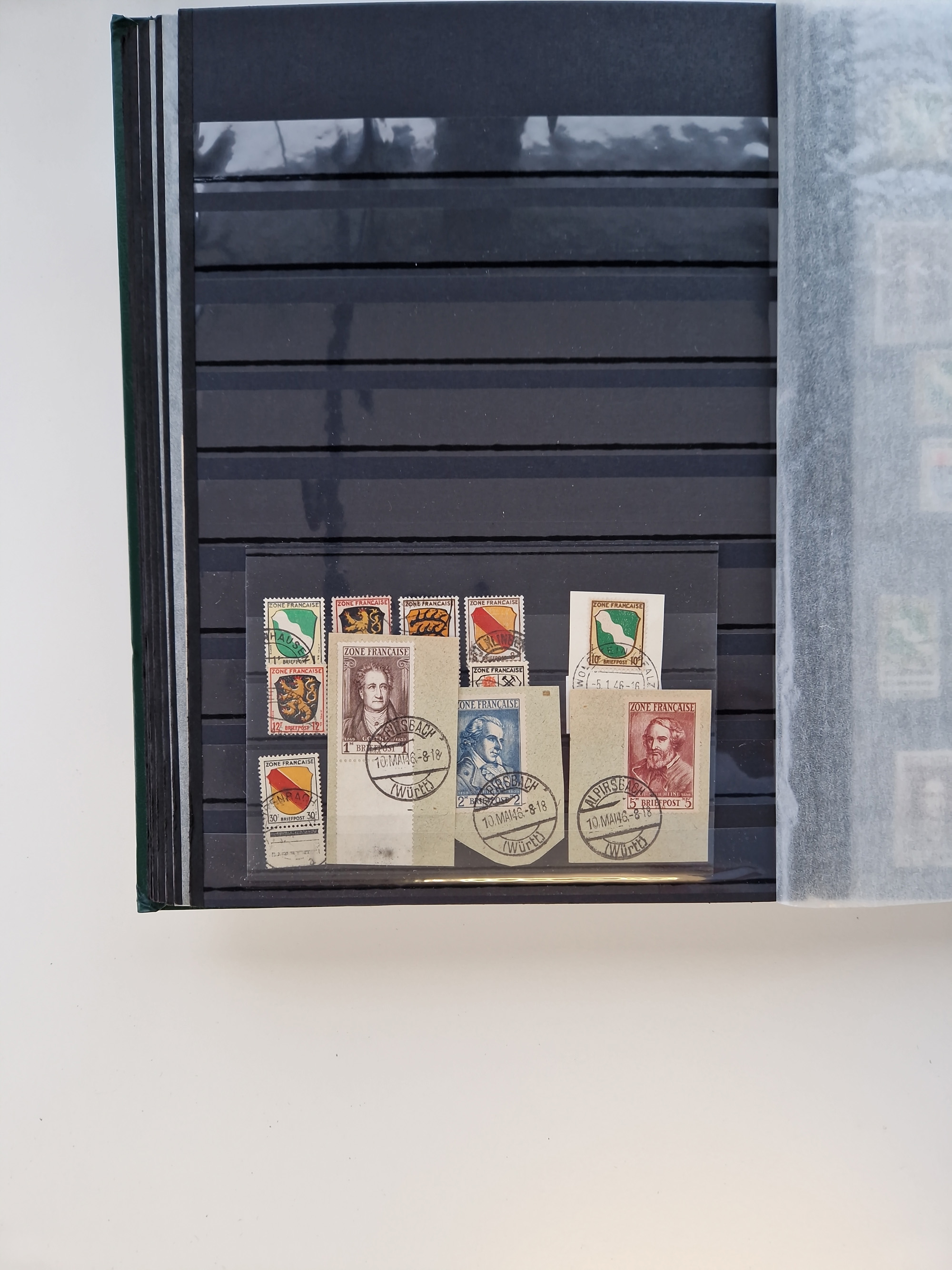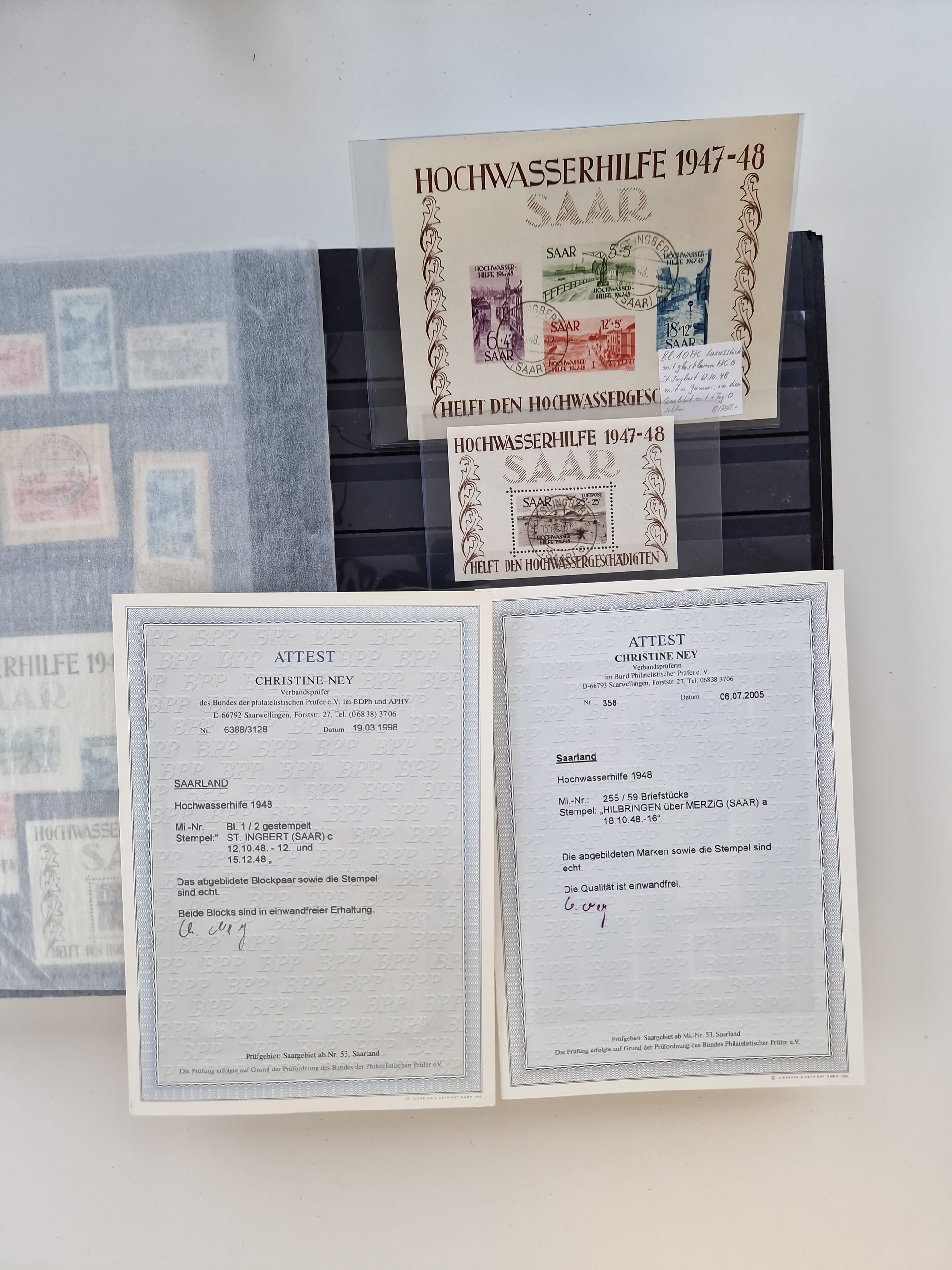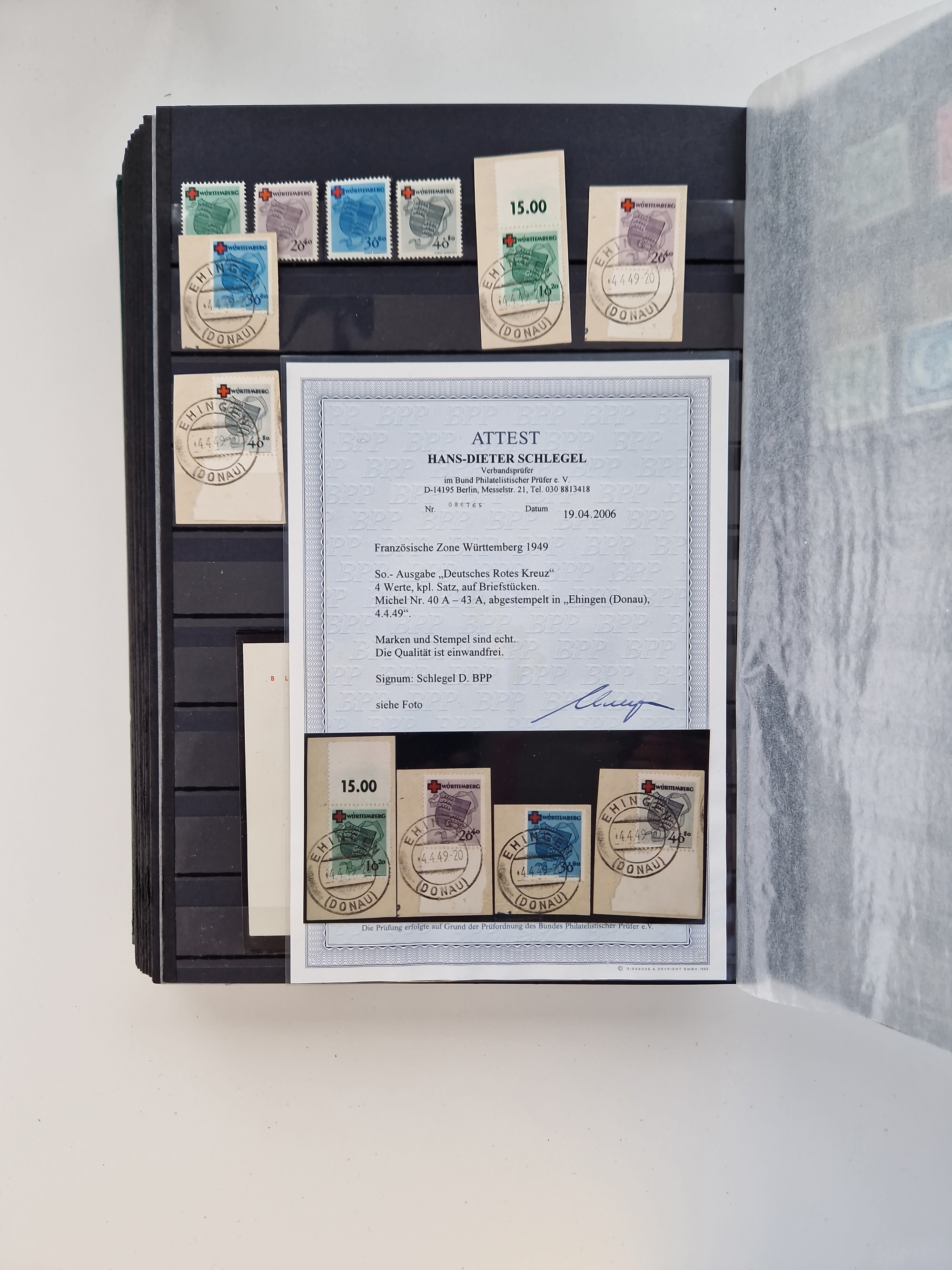 1945/59, postfrische und gestempelte Sammlung ohne SBZ aber mit Saarland mit vielen besseren und kpl. Ausgaben, diversen Briefstücken und einigen Briefen, Karten und GSK. Dabei u.a. Frz. Zone in den Hauptnummer kpl. postfrisch und zusätzlich gestempelt (bessere signiert oder FA Schlegel BPP bzw. D. Schlegel BPP) mit Konstanz II mit SST auf Brieftück (FA Schlegel BPP), Bizone mit u.a. Mi.-Nr. I/I-IX/I und 1/II-IX/II postfrisch (je FA D. Schlegel BPP) und Saarland postfrisch in den Hauptnummern kpl. und zusätzlich gestempelt mit u.a. Hochwasser-Blockpaar (je FA Ney BPP). Die Marken sind fast durchgehend in einwandfreier Erhaltung, bessere oft signiert bzw. mit FB und Fotoattesten, sauber in drei Alben