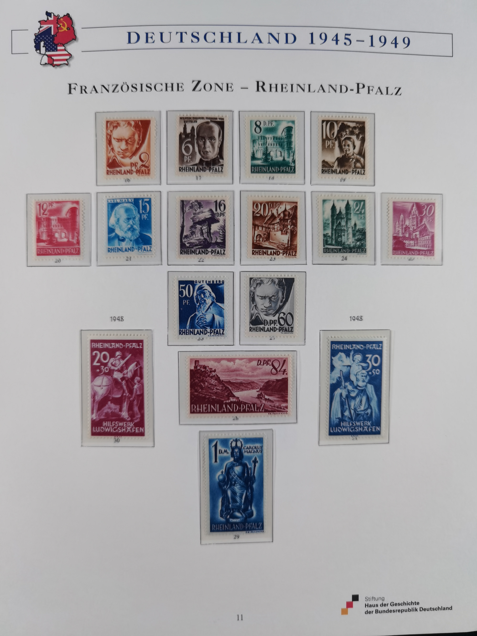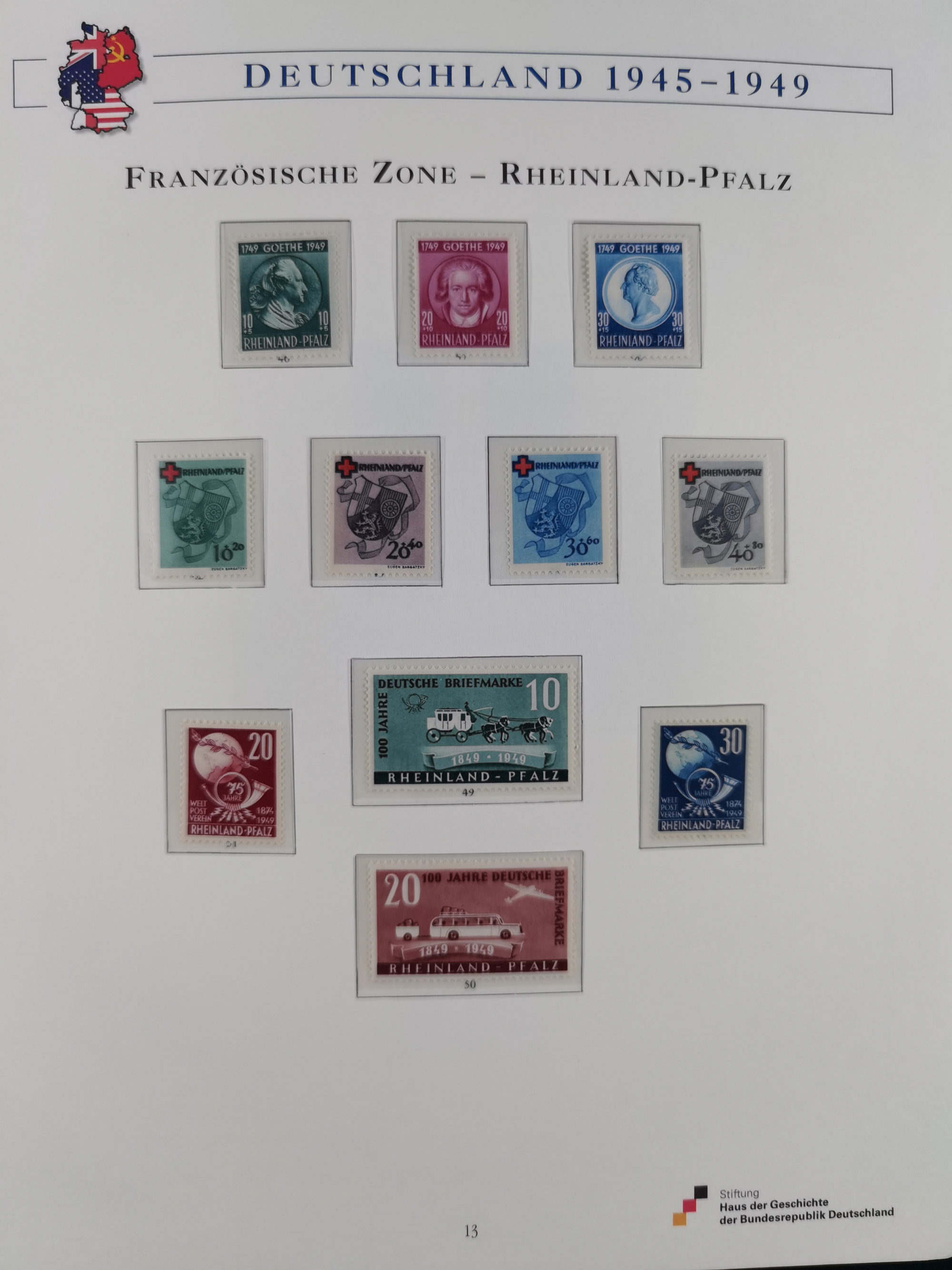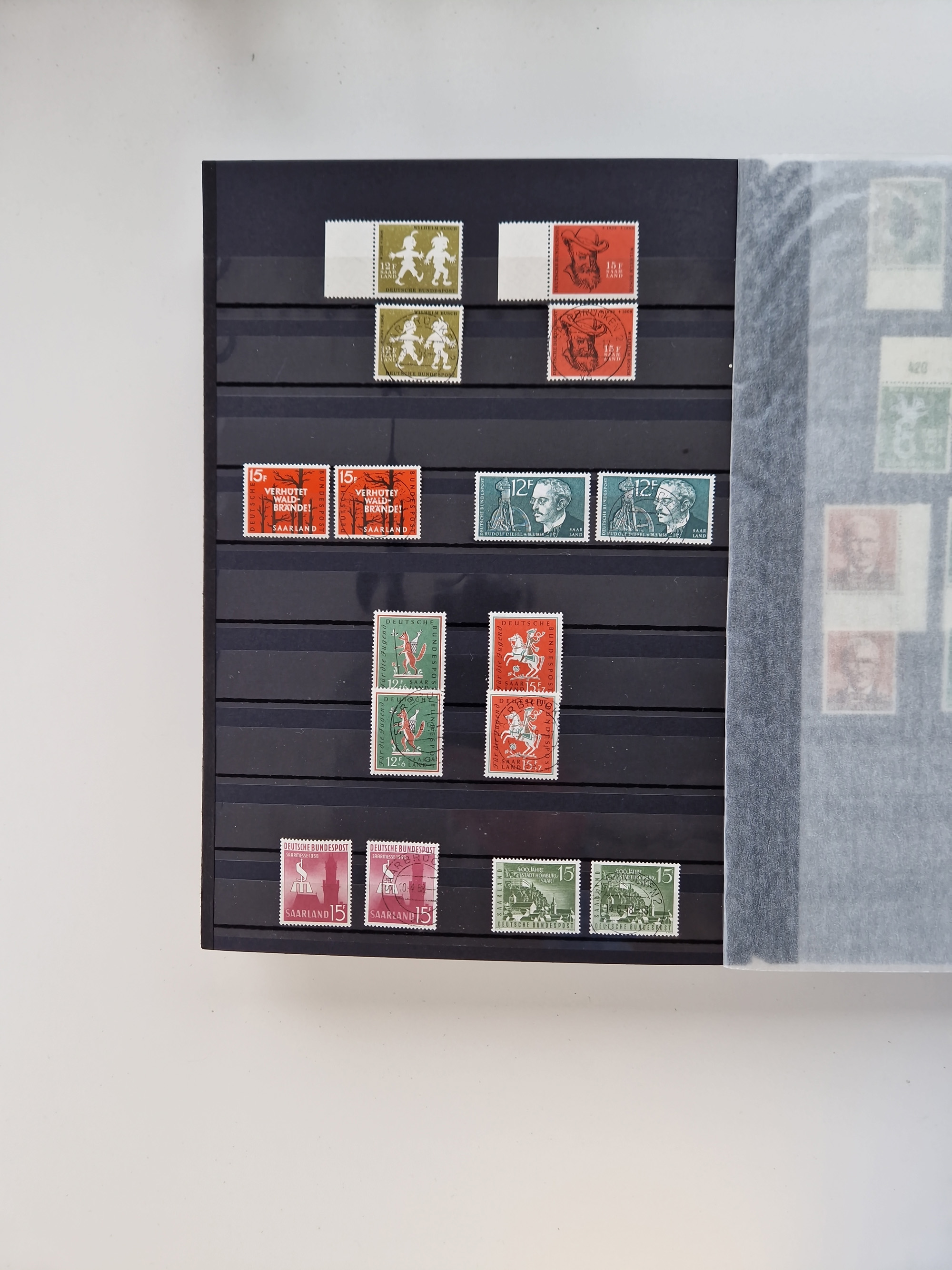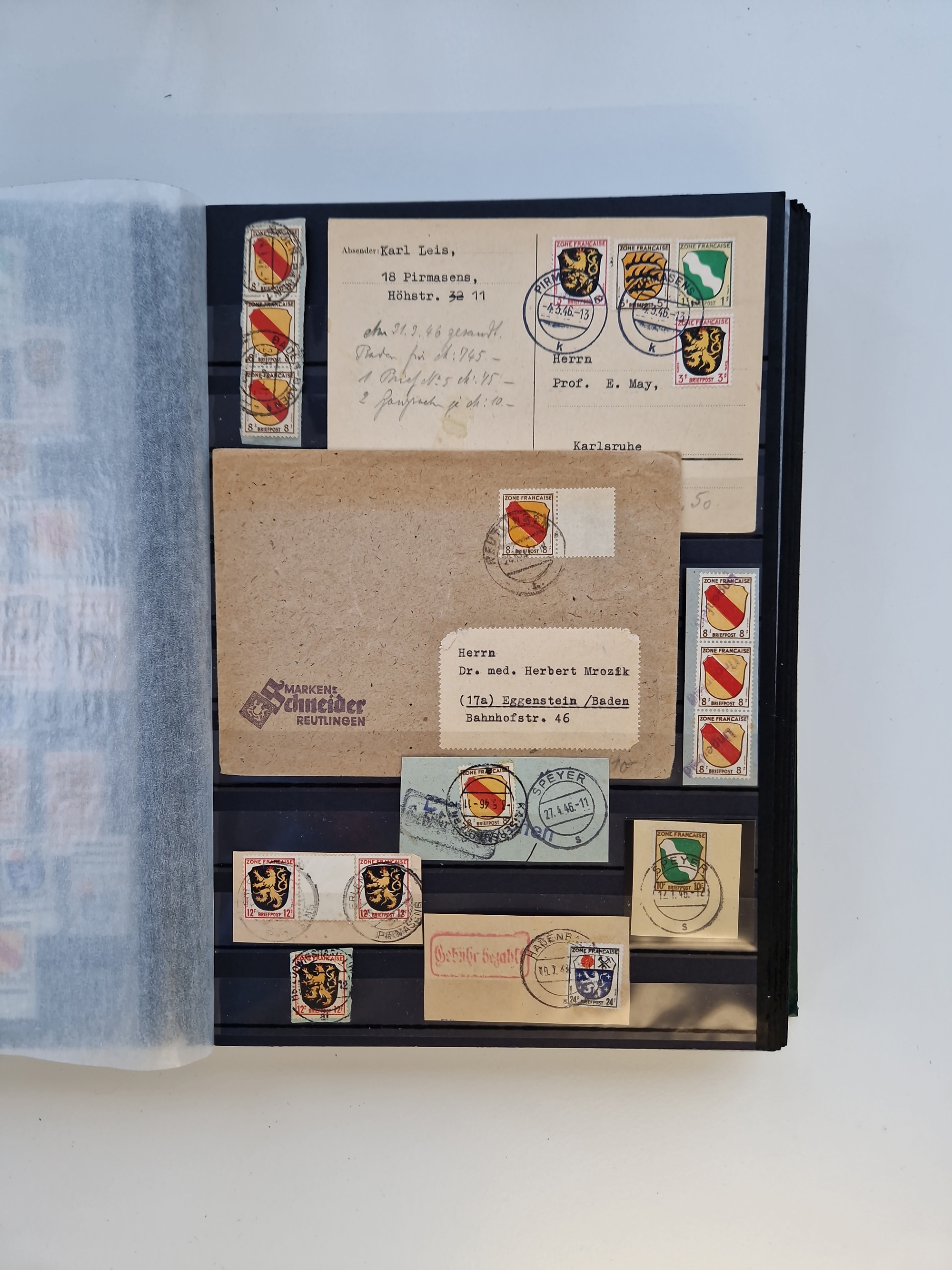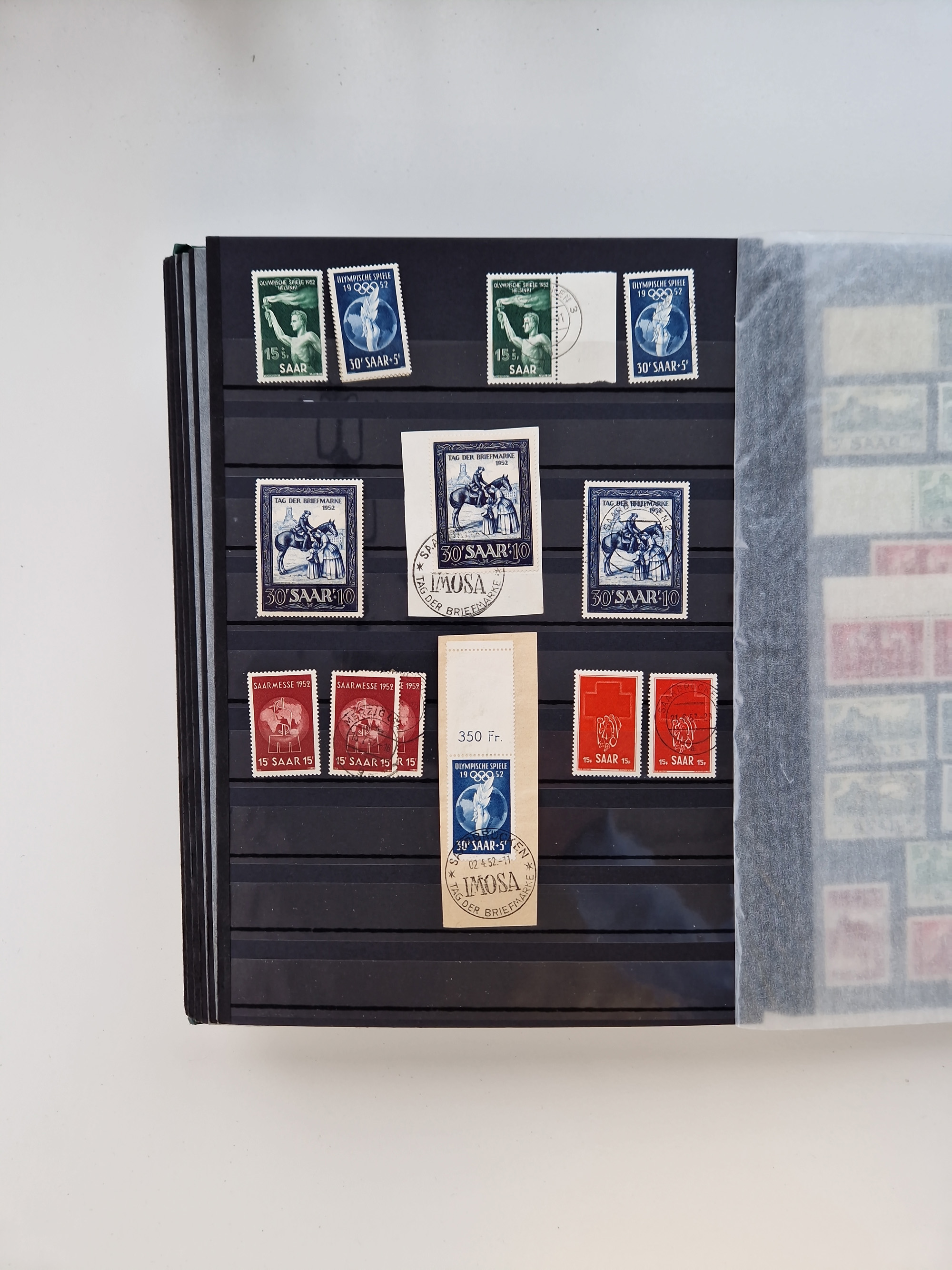 1945/59, postfrische und gestempelte Sammlung ohne SBZ aber mit Saarland mit vielen besseren und kpl. Ausgaben, diversen Briefstücken und einigen Briefen, Karten und GSK. Dabei u.a. Frz. Zone in den Hauptnummer kpl. postfrisch und zusätzlich gestempelt (bessere signiert oder FA Schlegel BPP bzw. D. Schlegel BPP) mit Konstanz II mit SST auf Brieftück (FA Schlegel BPP), Bizone mit u.a. Mi.-Nr. I/I-IX/I und 1/II-IX/II postfrisch (je FA D. Schlegel BPP) und Saarland postfrisch in den Hauptnummern kpl. und zusätzlich gestempelt mit u.a. Hochwasser-Blockpaar (je FA Ney BPP). Die Marken sind fast durchgehend in einwandfreier Erhaltung, bessere oft signiert bzw. mit FB und Fotoattesten, sauber in drei Alben