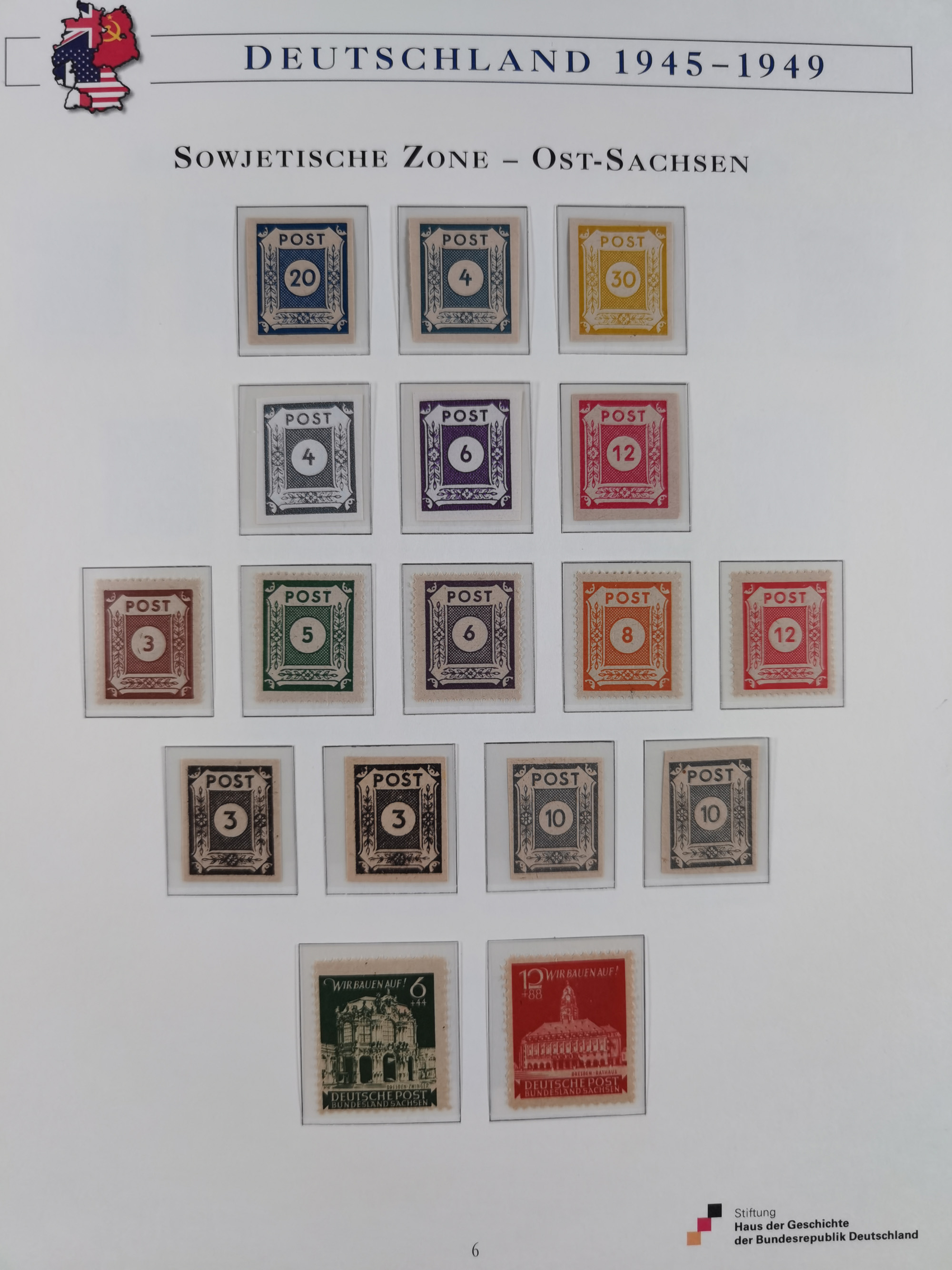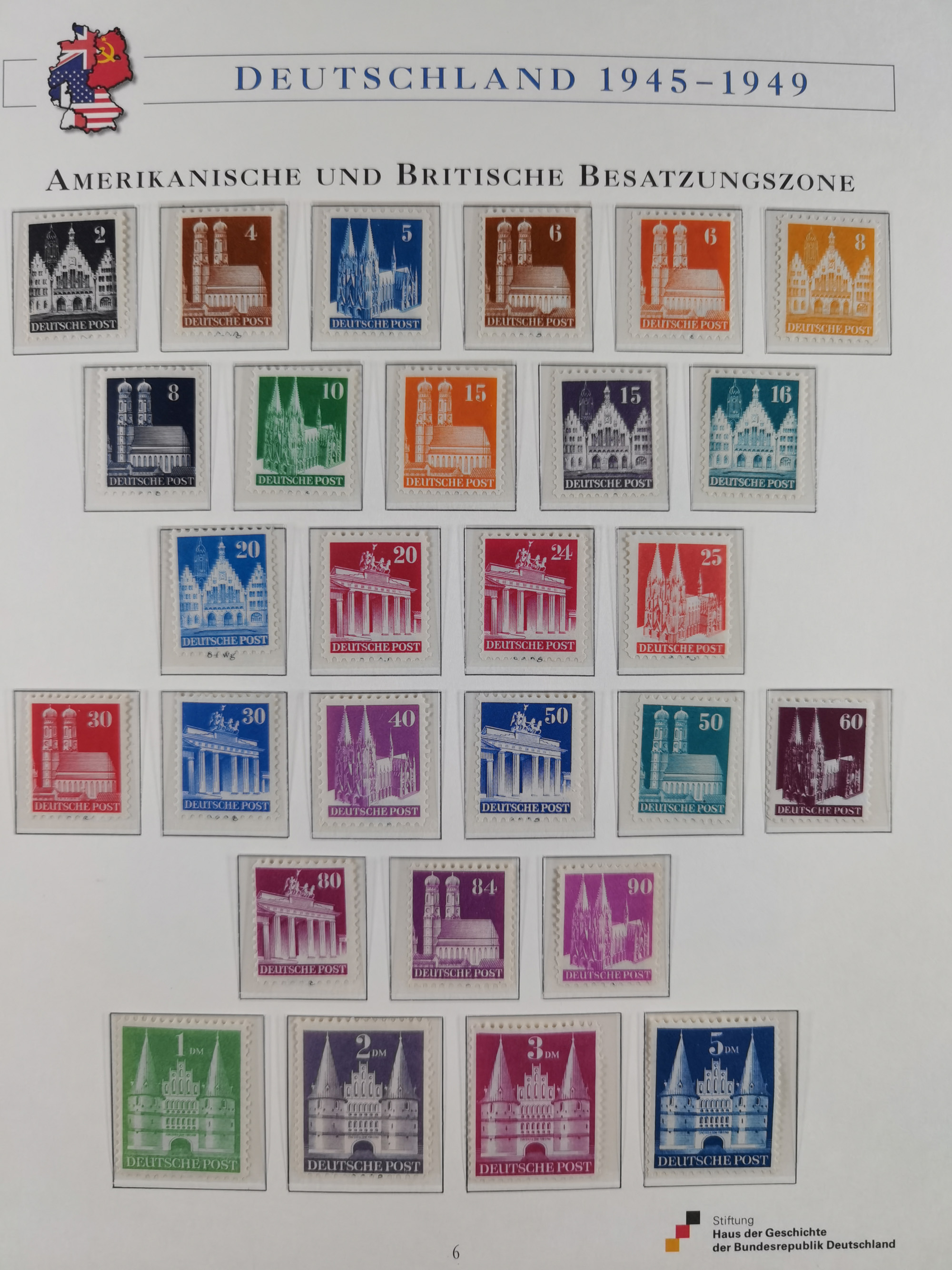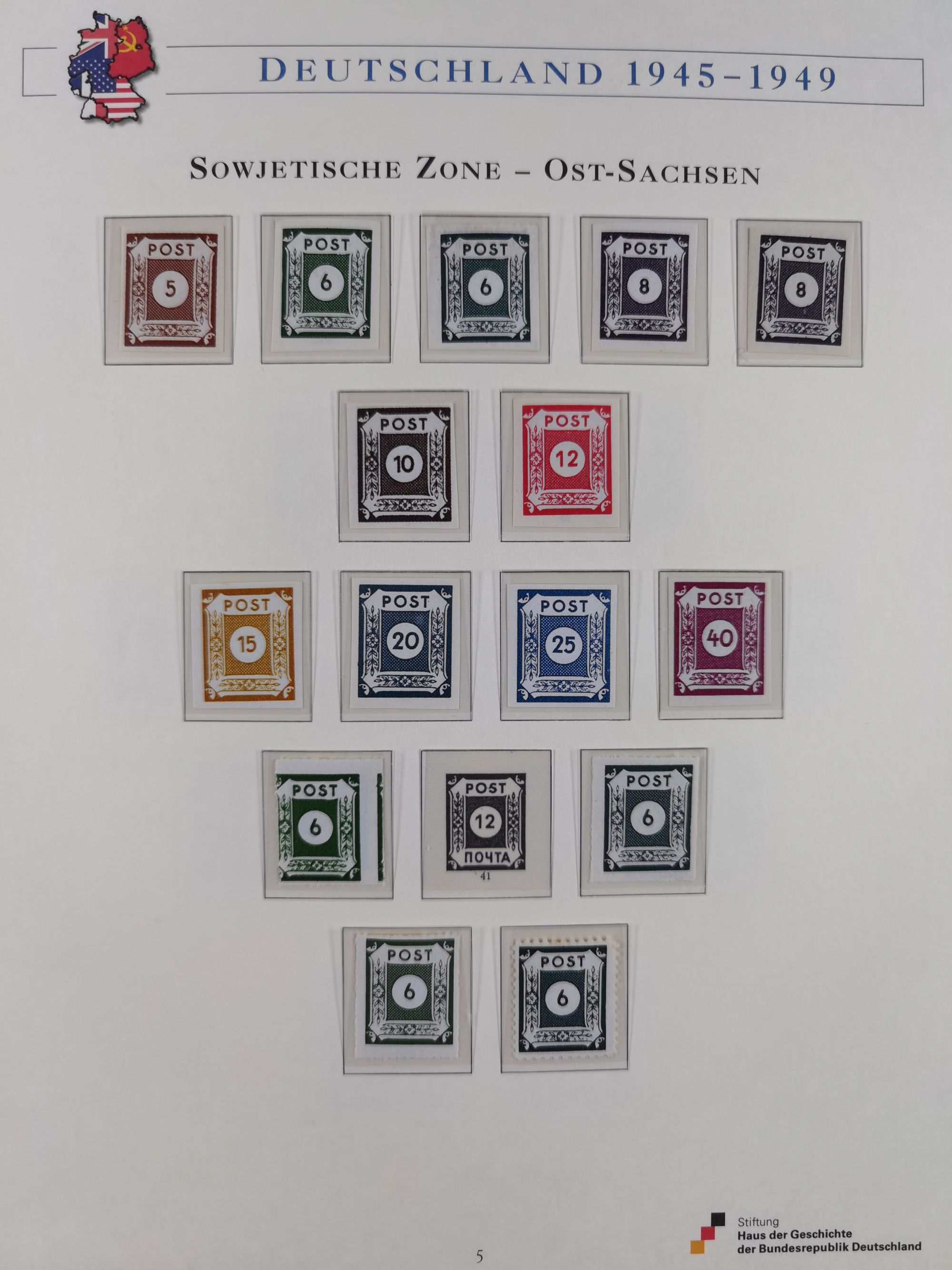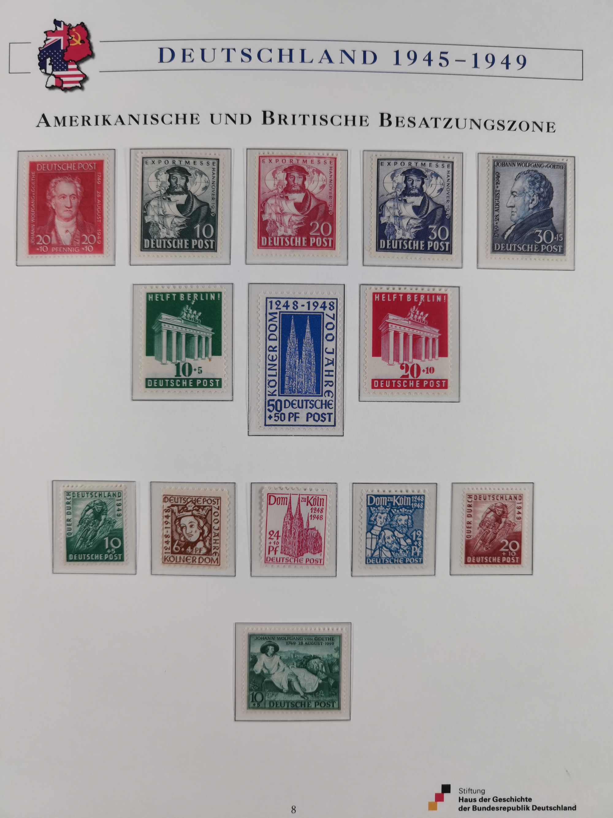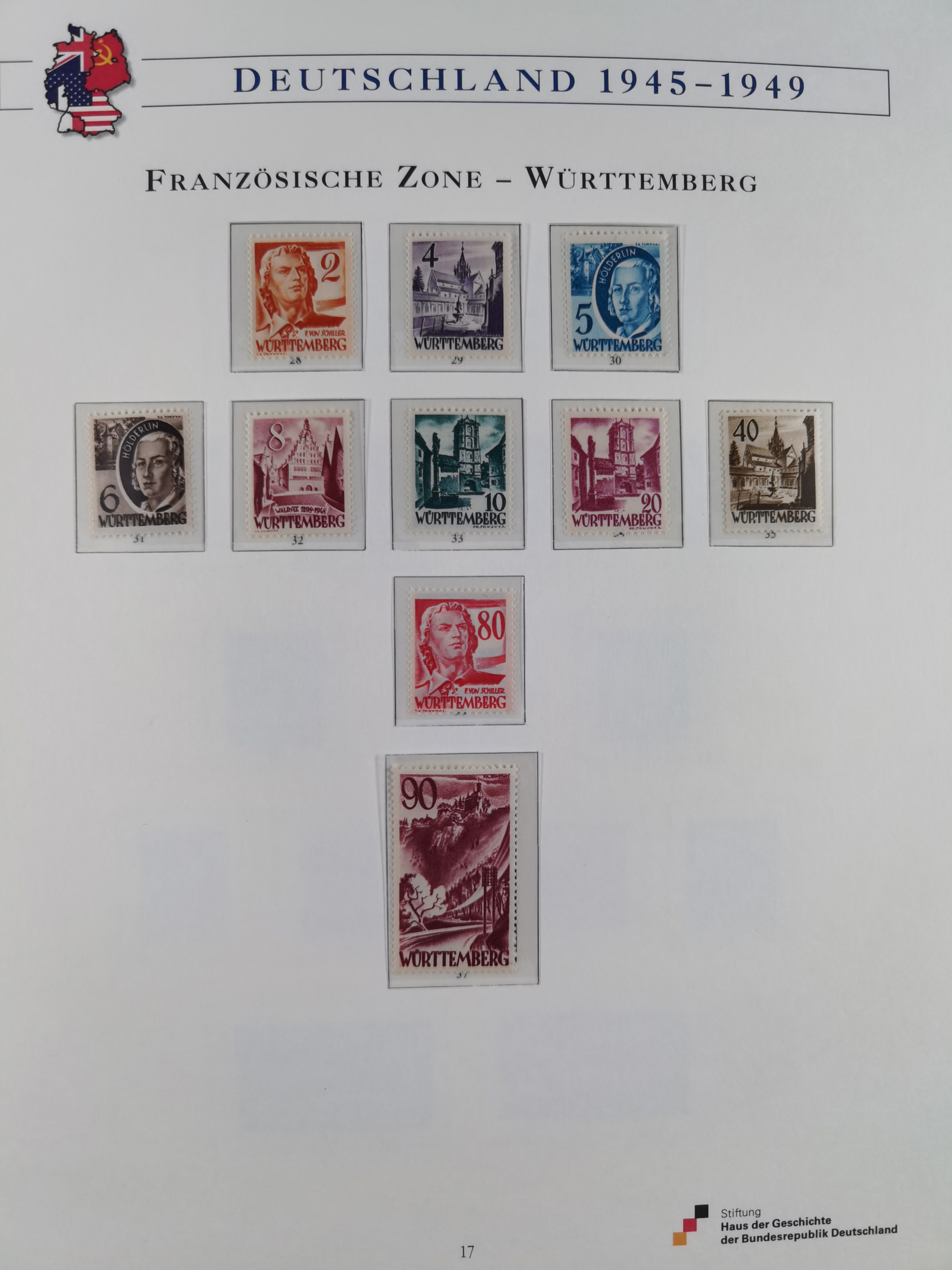 1945/53, ungebrauchte und postfrische Sammlung Zonen mit besseren und kpl. Ausgaben. Dabei u.a. Frz. Zone in den Hauptnummern bis auf einen Block postfrisch kpl. und Bizone mit Oberrandstück Mi.- 97eg postfrisch. Dazu einige postfrische Anfangsausgaben DDR mit u.a. Mi.-Nr. 261-70, 327-31, Bl.7 und Block 8-9A/B, sauber in zwei Vordruckalben