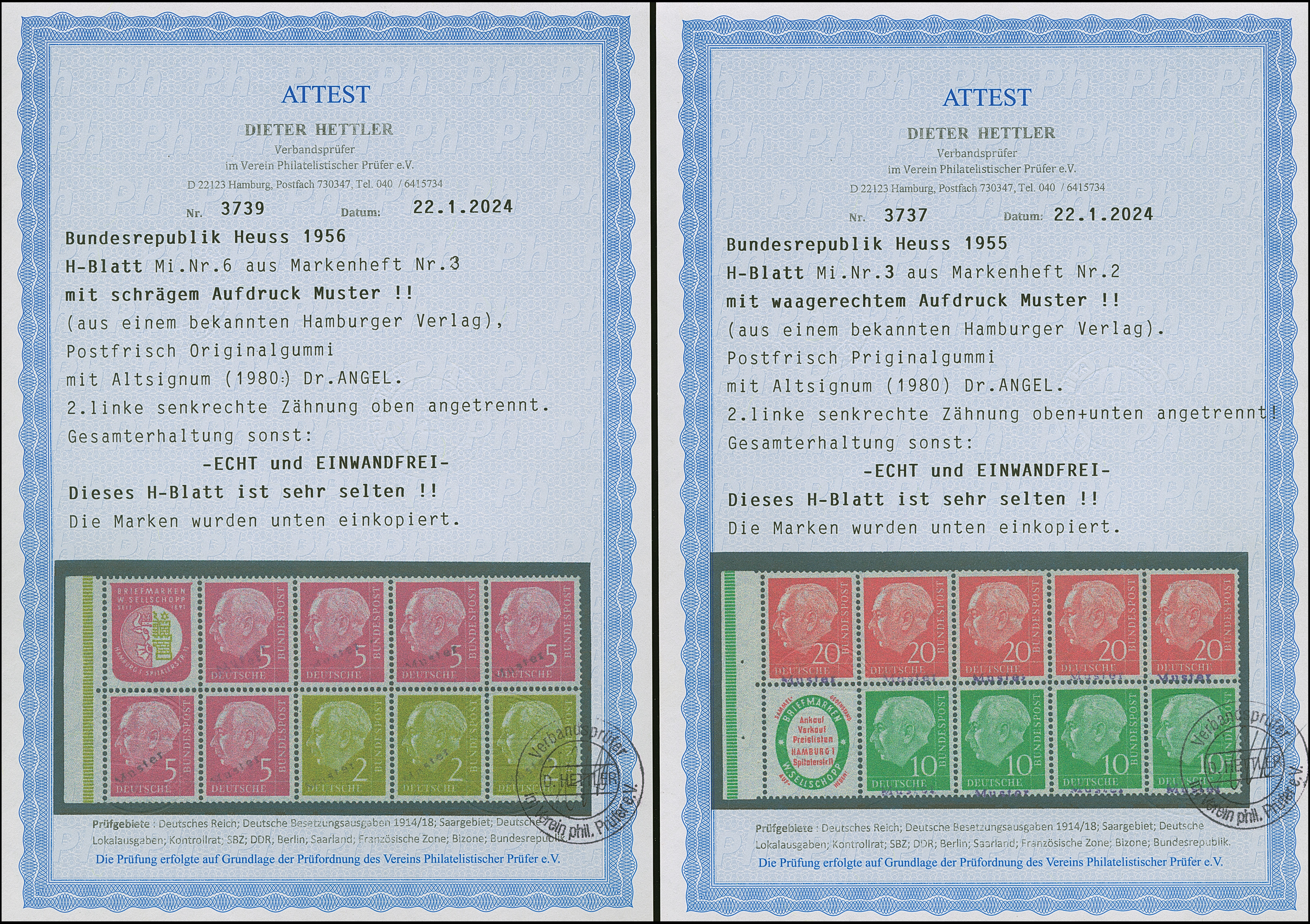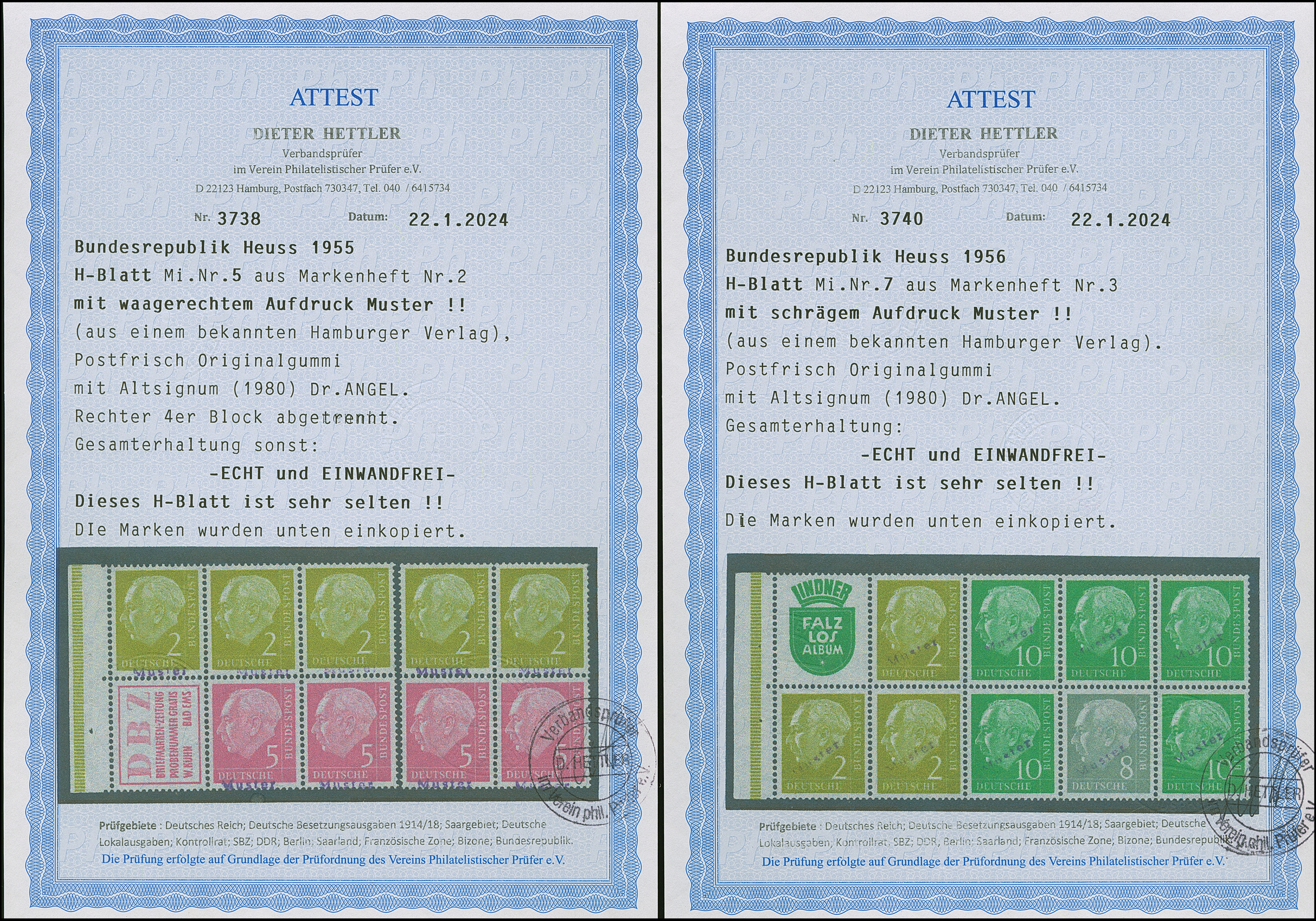 1955/56, Heuss H-Blatt 3,5, 6 und 7 (teils stärker angetrennt, H-Bl. 5 ein Viererblock rechts abgetrennt), jeder Wert mit Handstempel "Muster", postfrisch. Diese Vorlagestücke sind außerordentlich selten; PROFI hat kein weiteres registriert. Jeder Wert signiert Dr. Angel und jedes H-Blatt Fotoattest Hettler (2024)