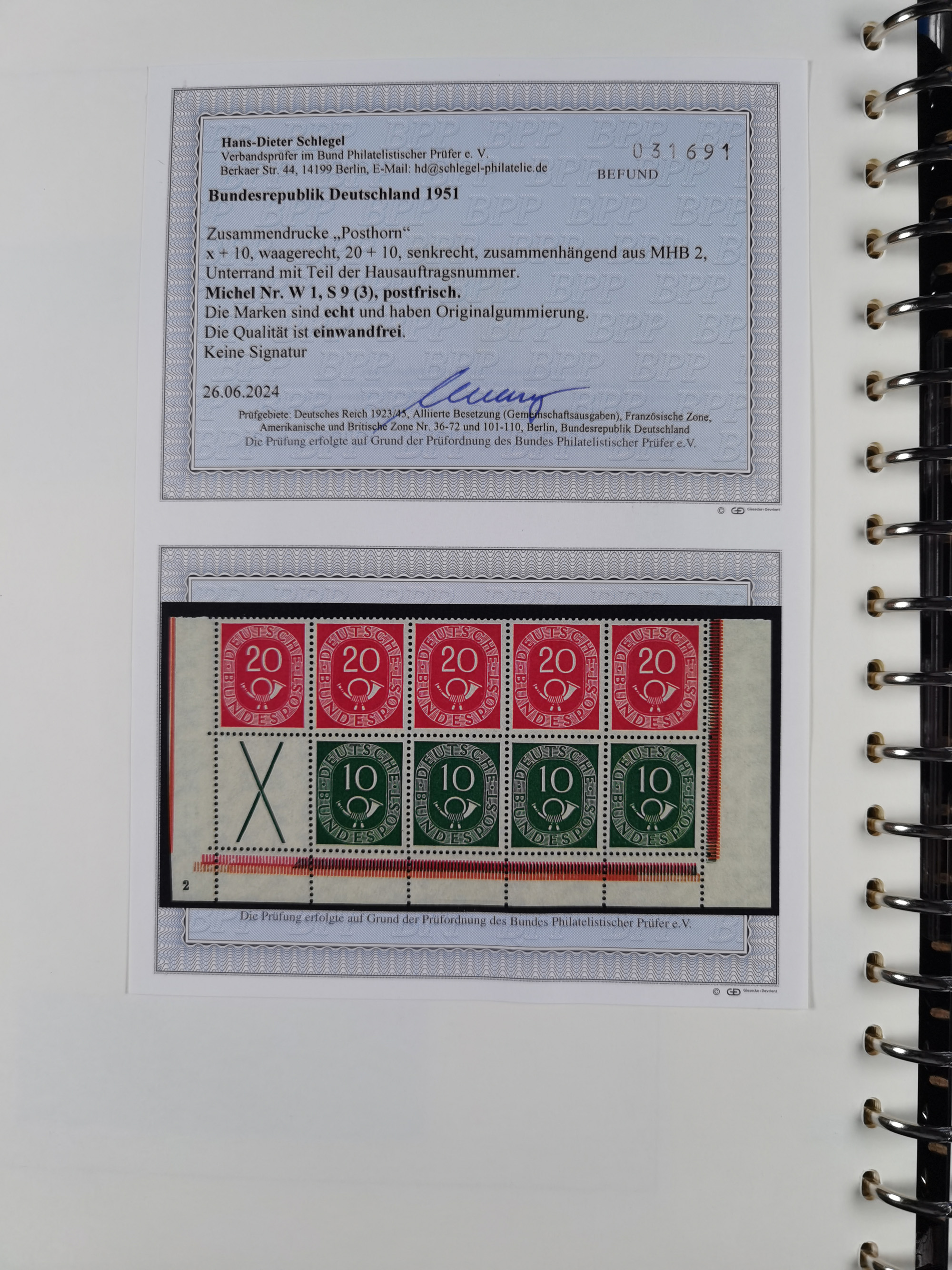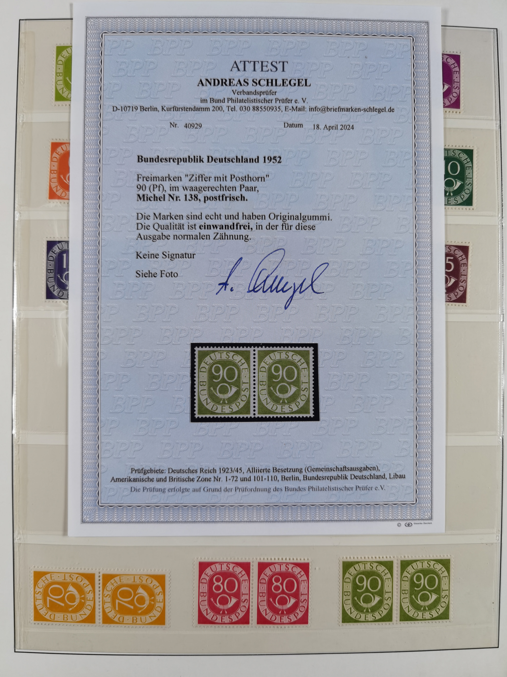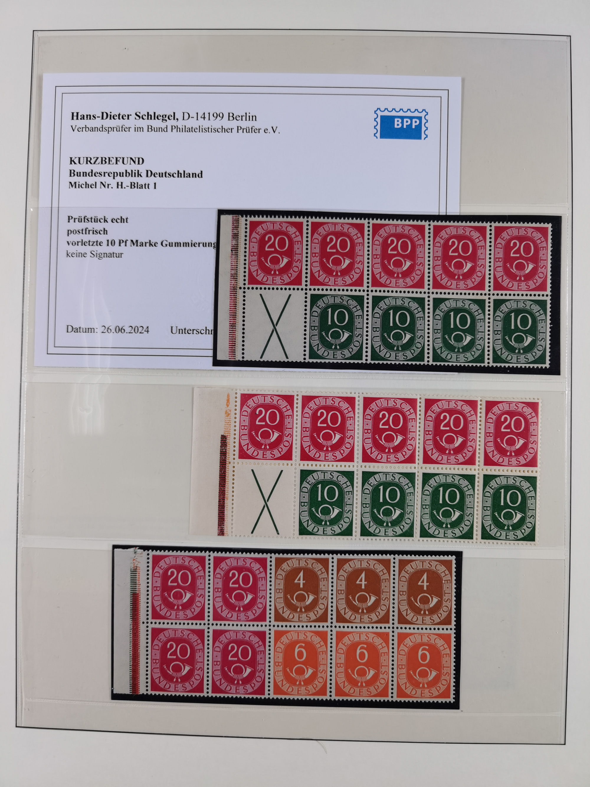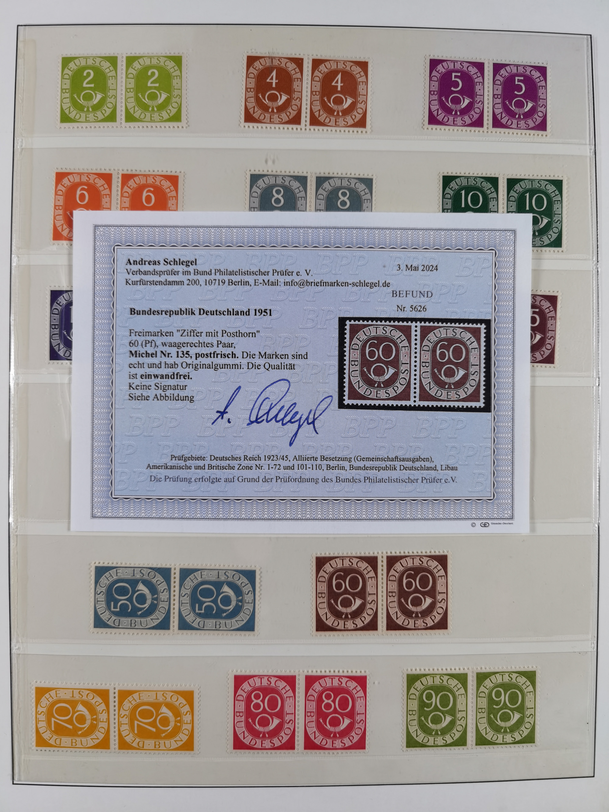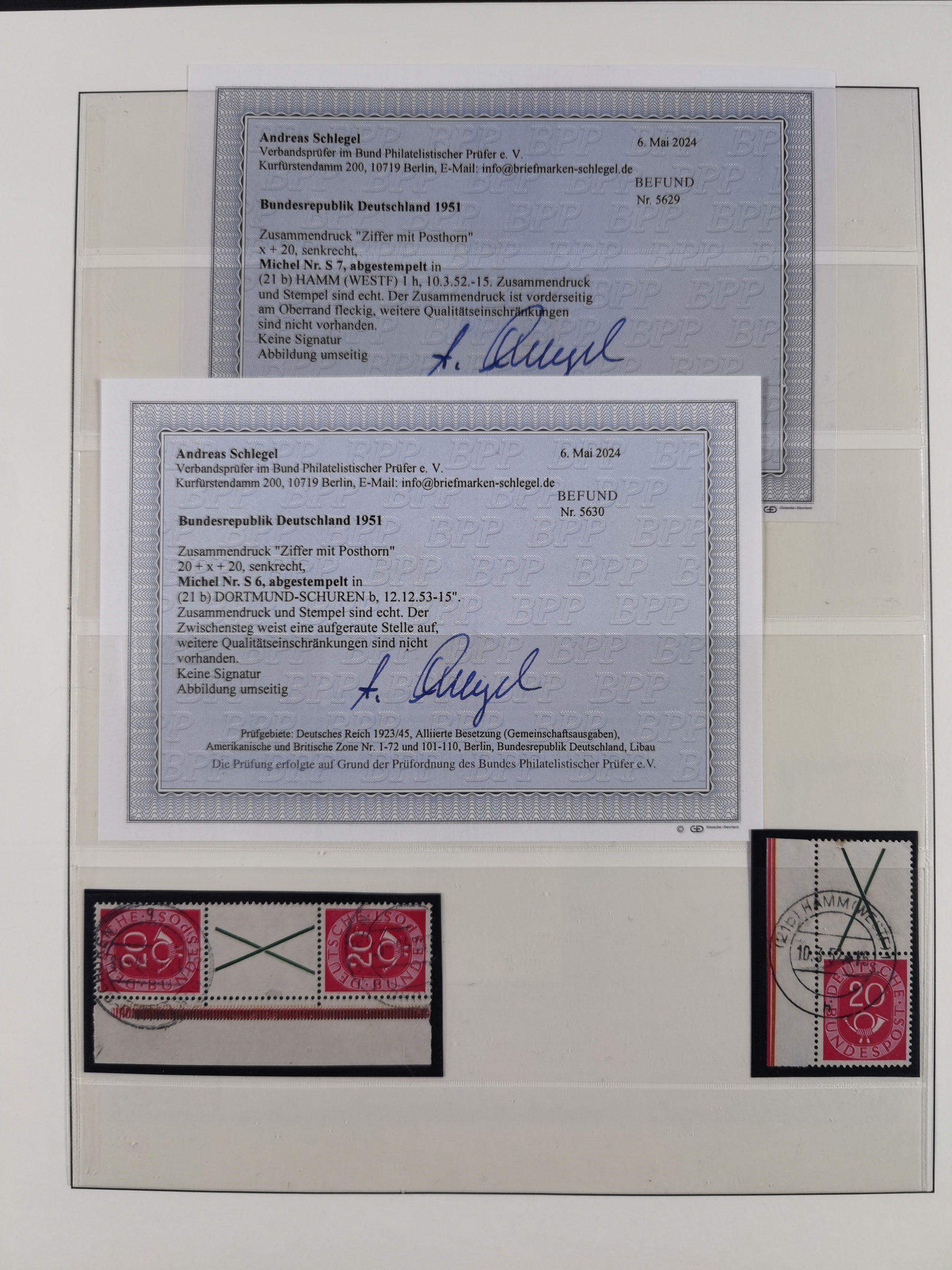 1951/54, gestempelte und meist postfrische Sammlung Zusammendrucke Posthorn und Heuss mit vielen geprüften Stücken wie H-Bl. 1 gestempelt Attest A. Schlegel BPP, S8PFI postfrisch, Attest H-D. Schlegel BPP, Mi. S6 postfrisch, Attest H.-D. Schlegel BPP, Mi. S6 und S7 gestempelt, je Befund A. Schlegel BPP, H.-Bl. 2 Befund H.- D. Schlegel BPP, WZ4 postfrisch, Befund H.-D. Schlegel BPP und W1/S9 postfrisch Befund H.-D. Schlegel BPP.