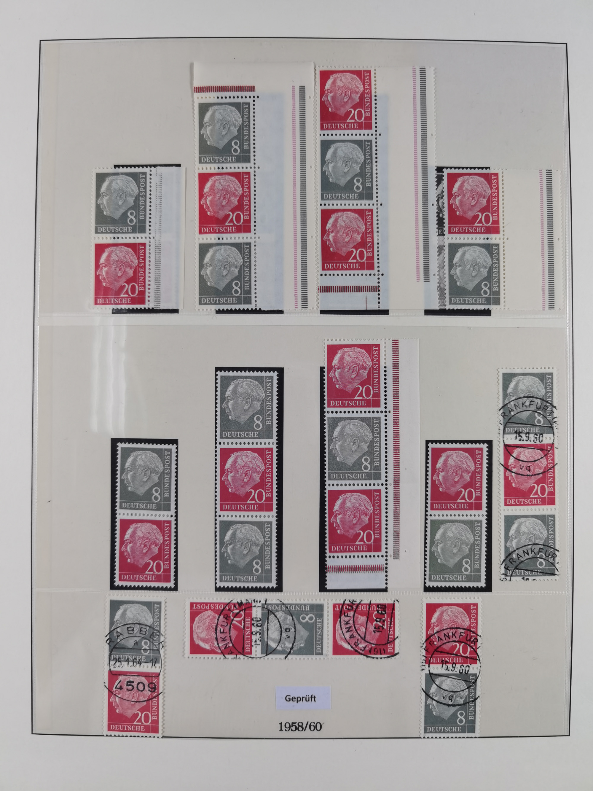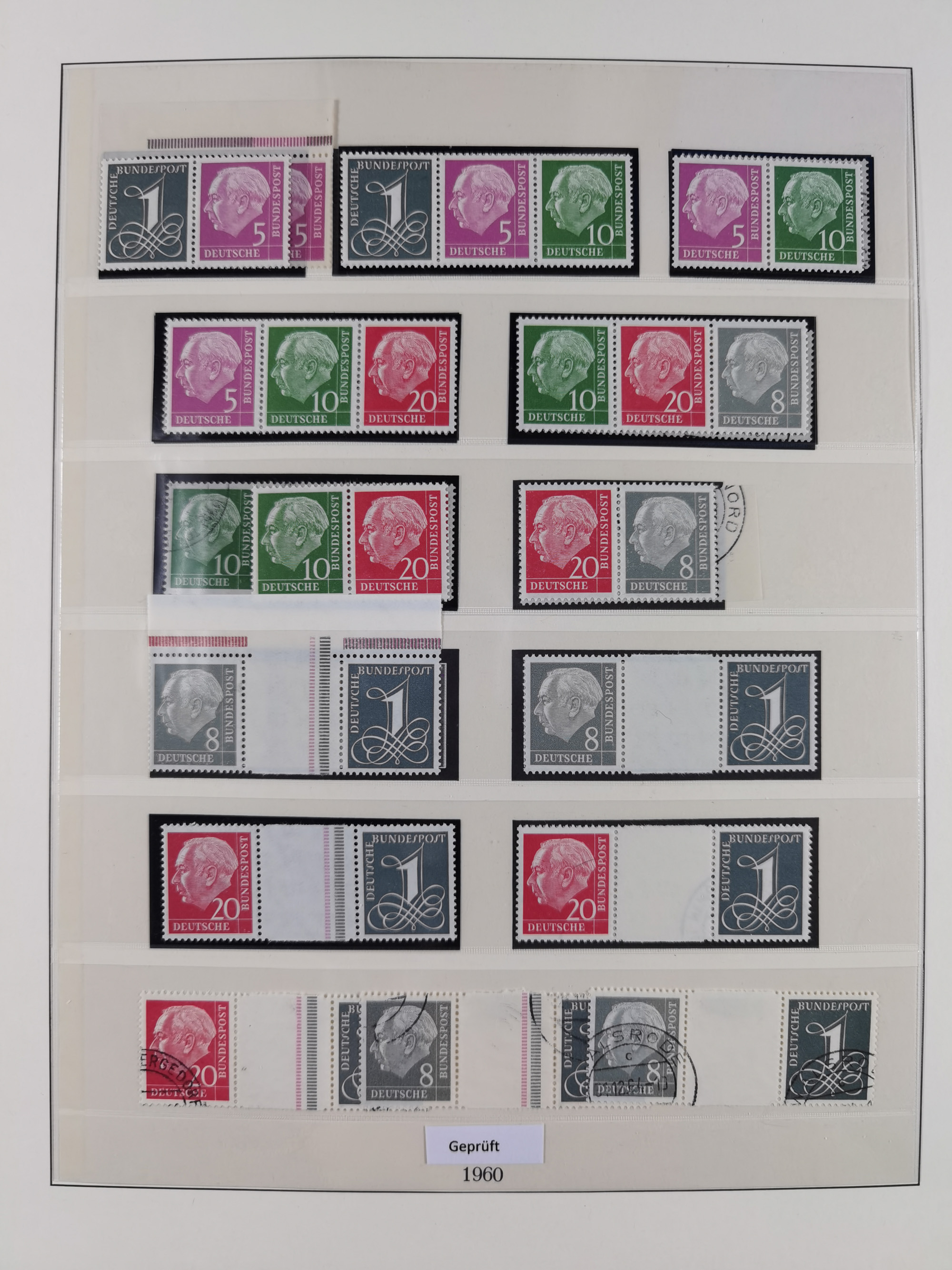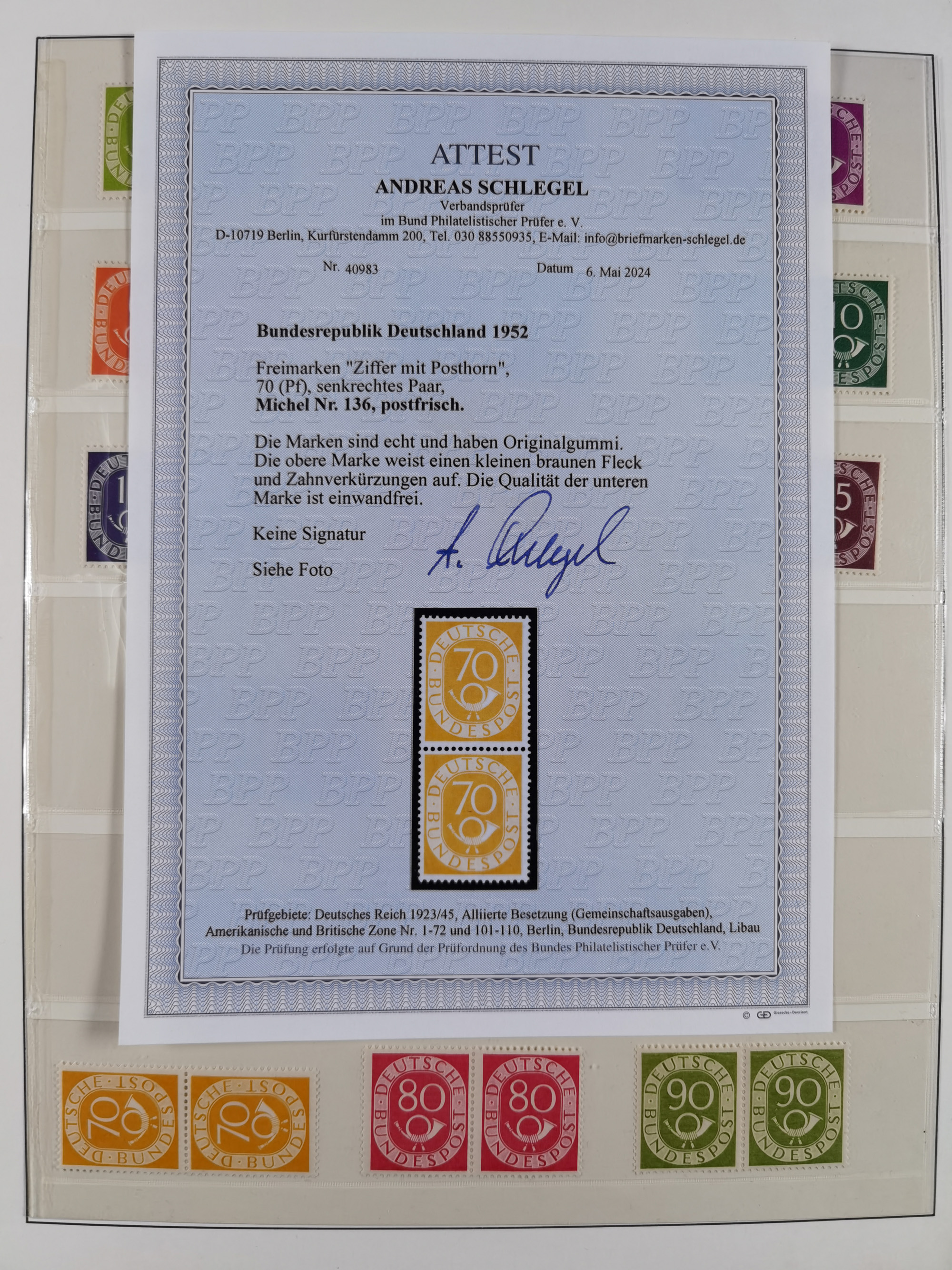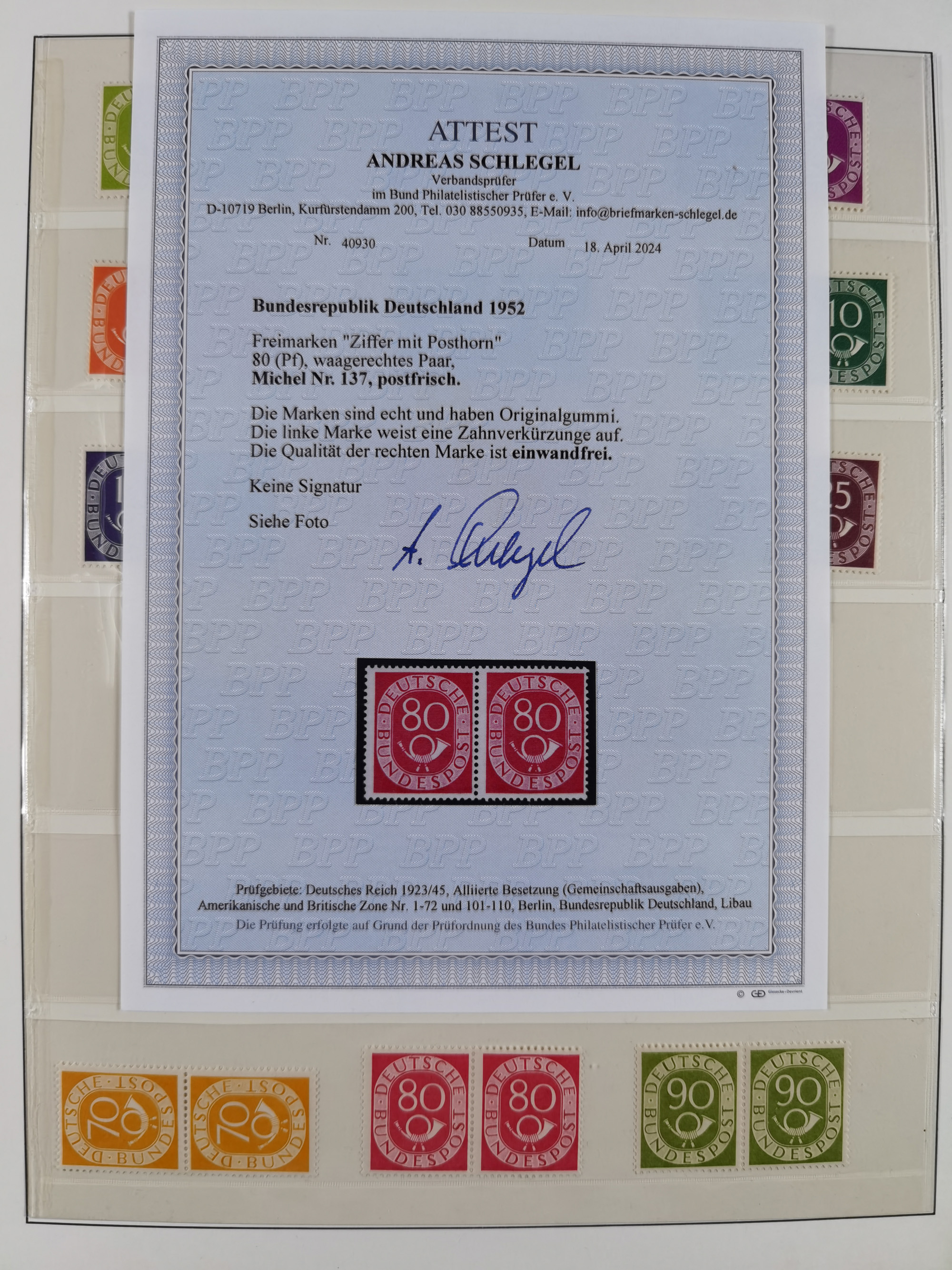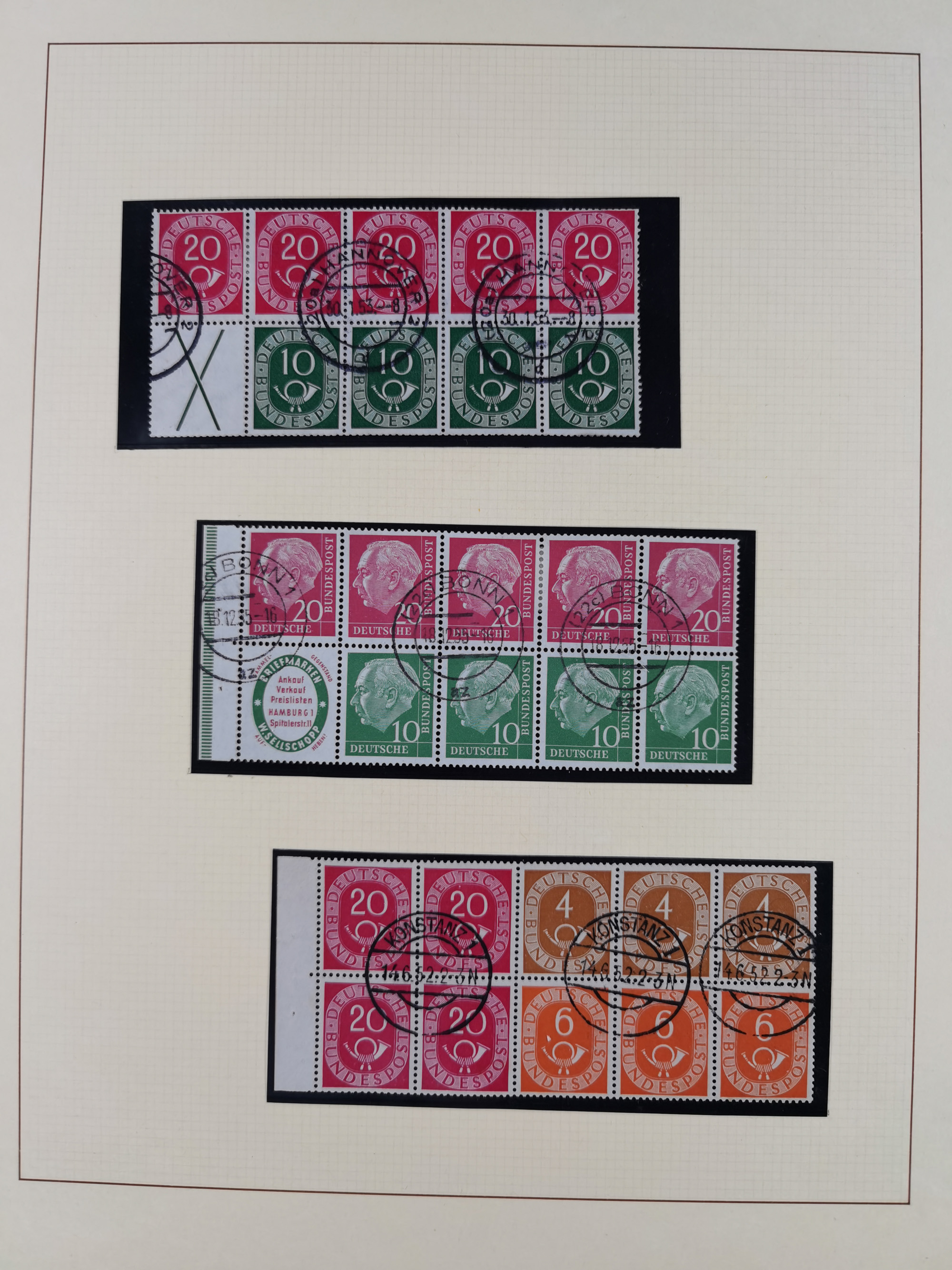 1951/54, gestempelte und meist postfrische Sammlung Zusammendrucke Posthorn und Heuss mit vielen geprüften Stücken wie H-Bl. 1 gestempelt Attest A. Schlegel BPP, S8PFI postfrisch, Attest H-D. Schlegel BPP, Mi. S6 postfrisch, Attest H.-D. Schlegel BPP, Mi. S6 und S7 gestempelt, je Befund A. Schlegel BPP, H.-Bl. 2 Befund H.- D. Schlegel BPP, WZ4 postfrisch, Befund H.-D. Schlegel BPP und W1/S9 postfrisch Befund H.-D. Schlegel BPP.