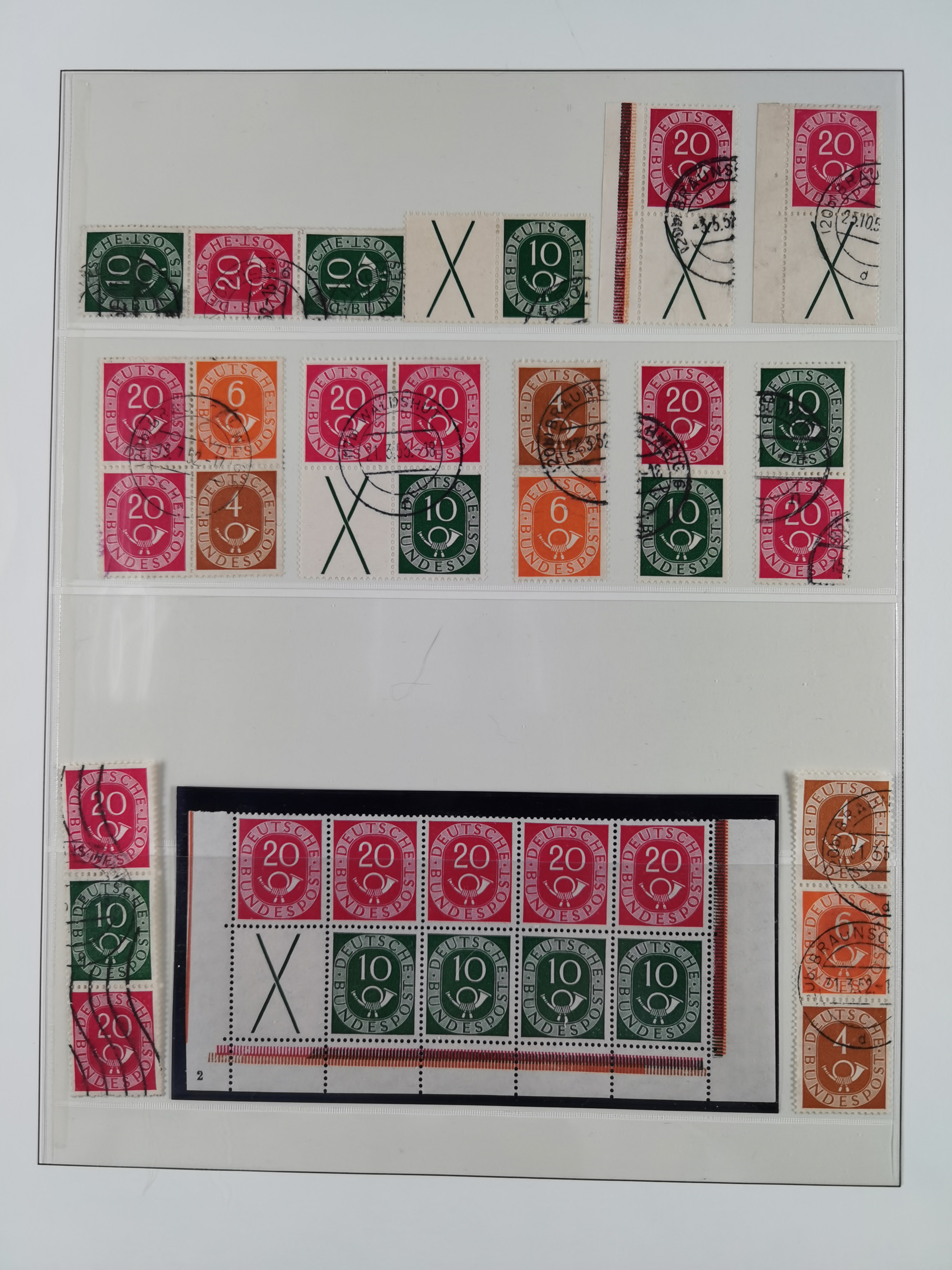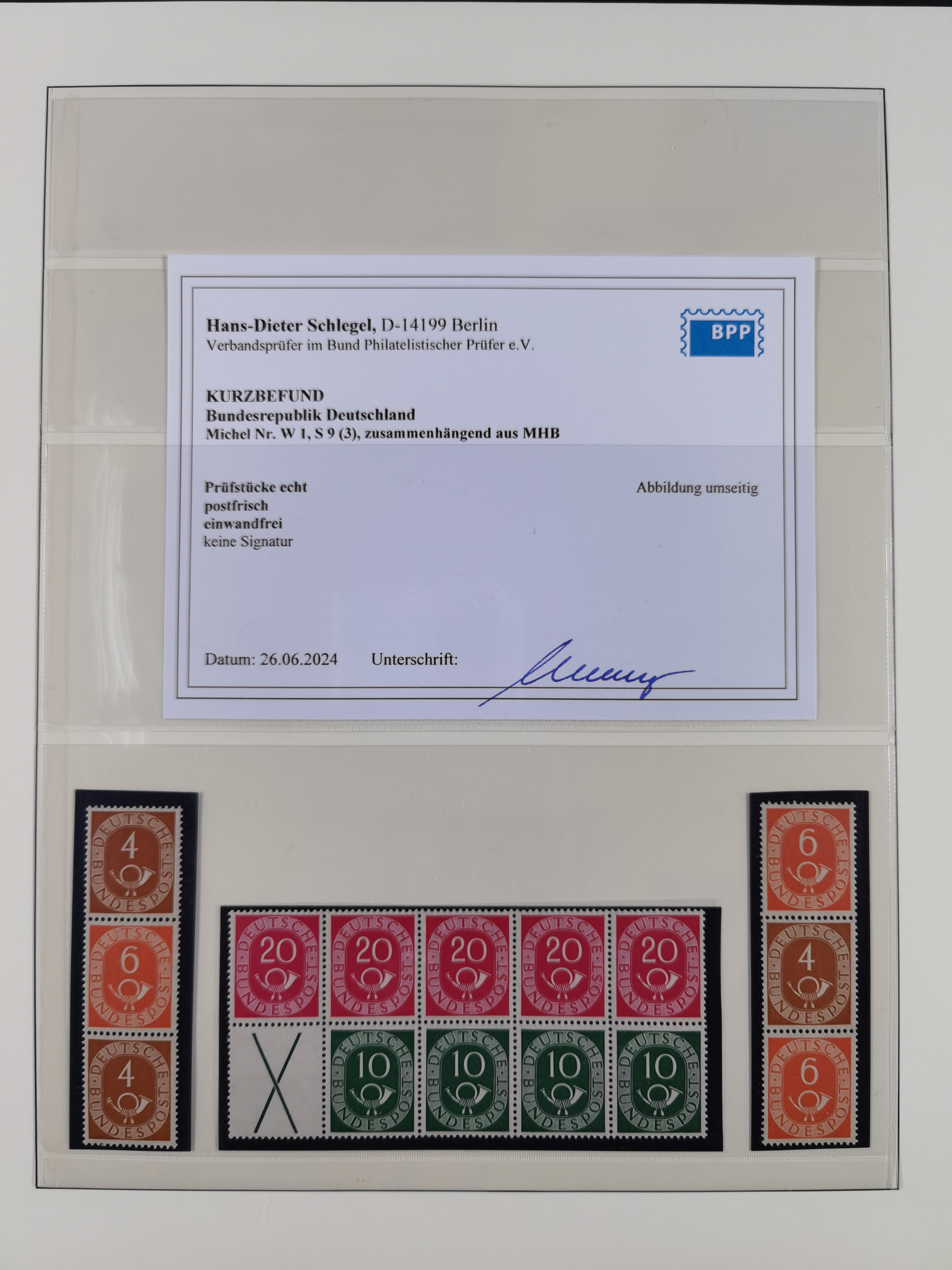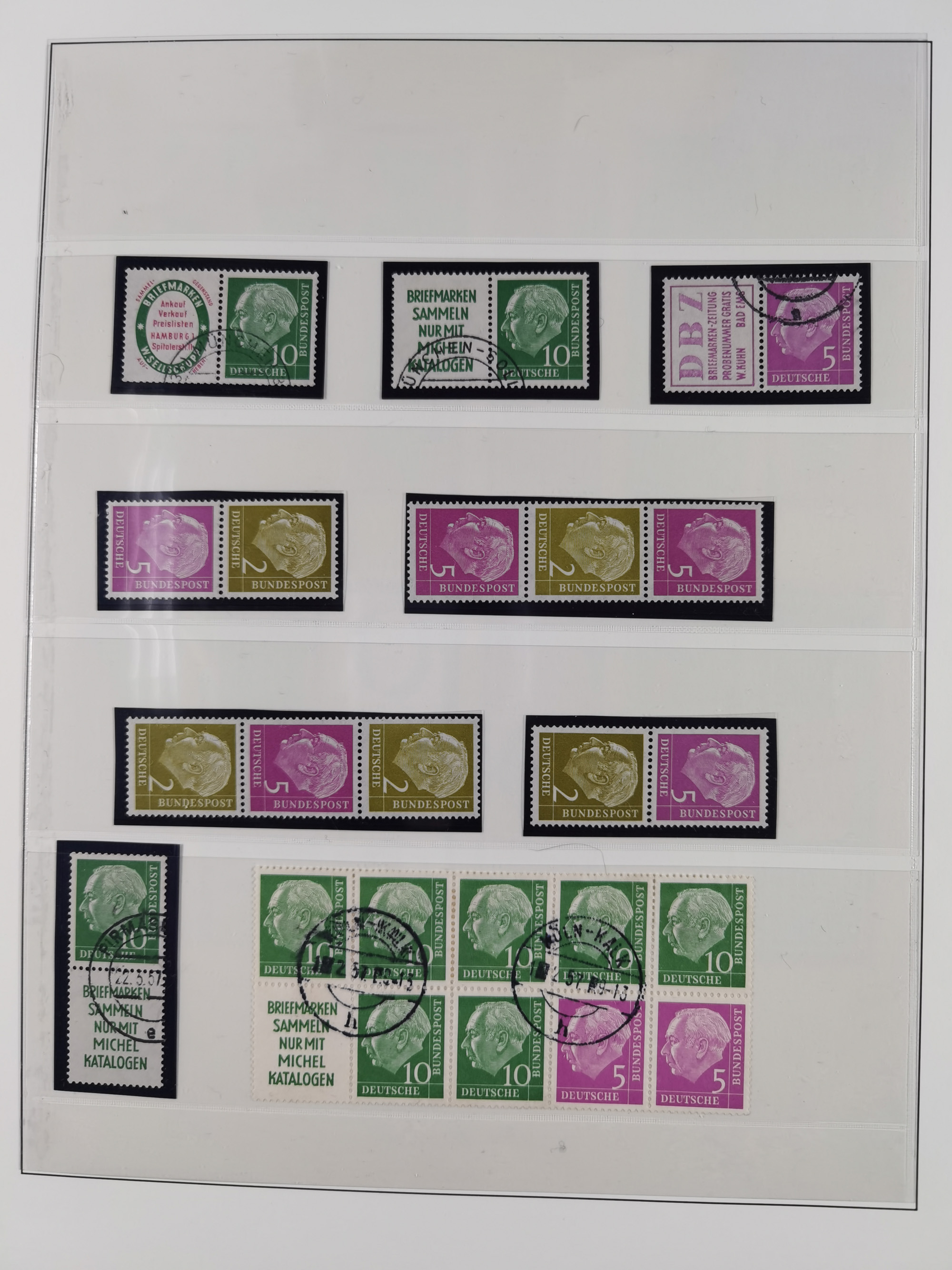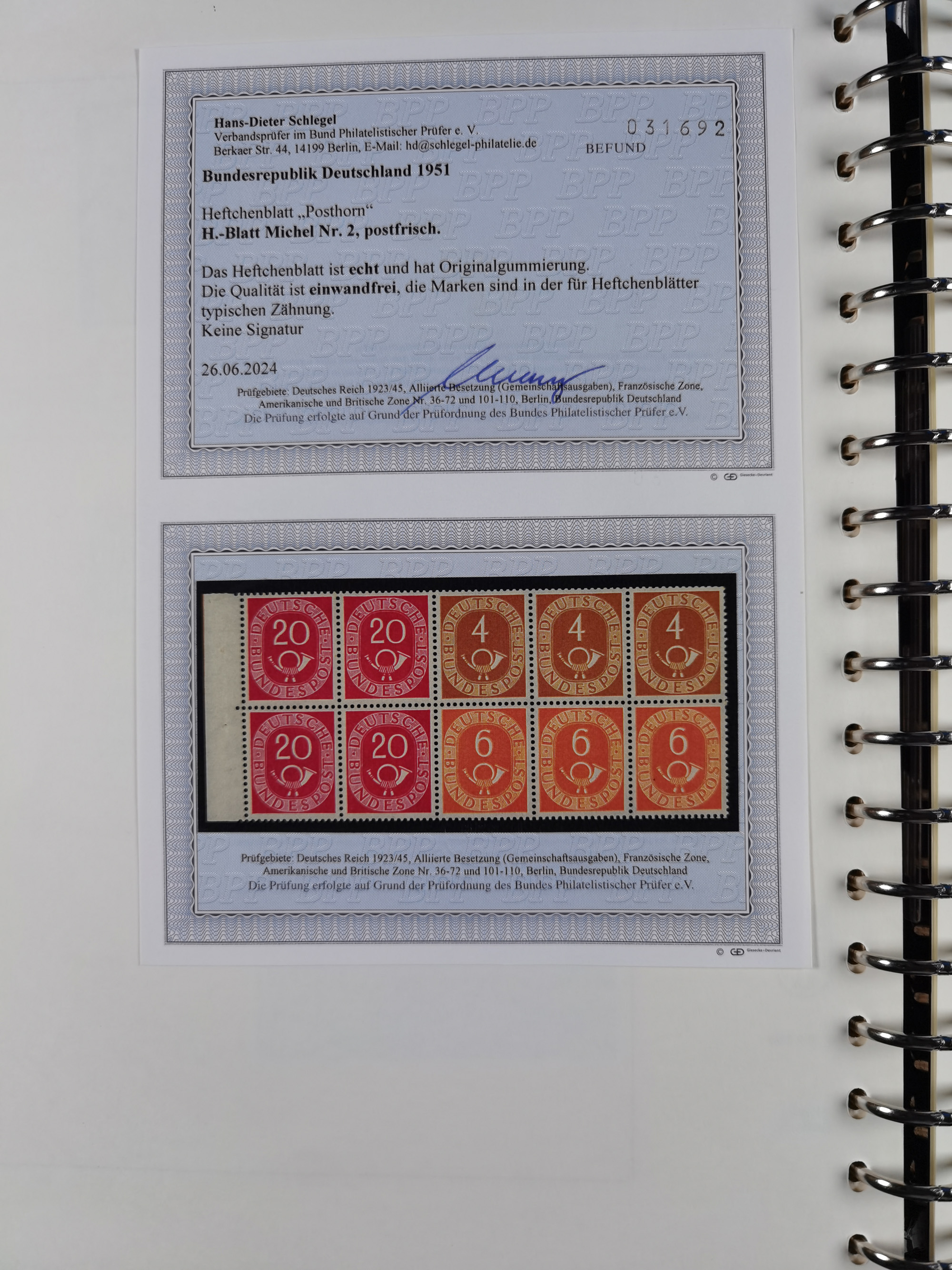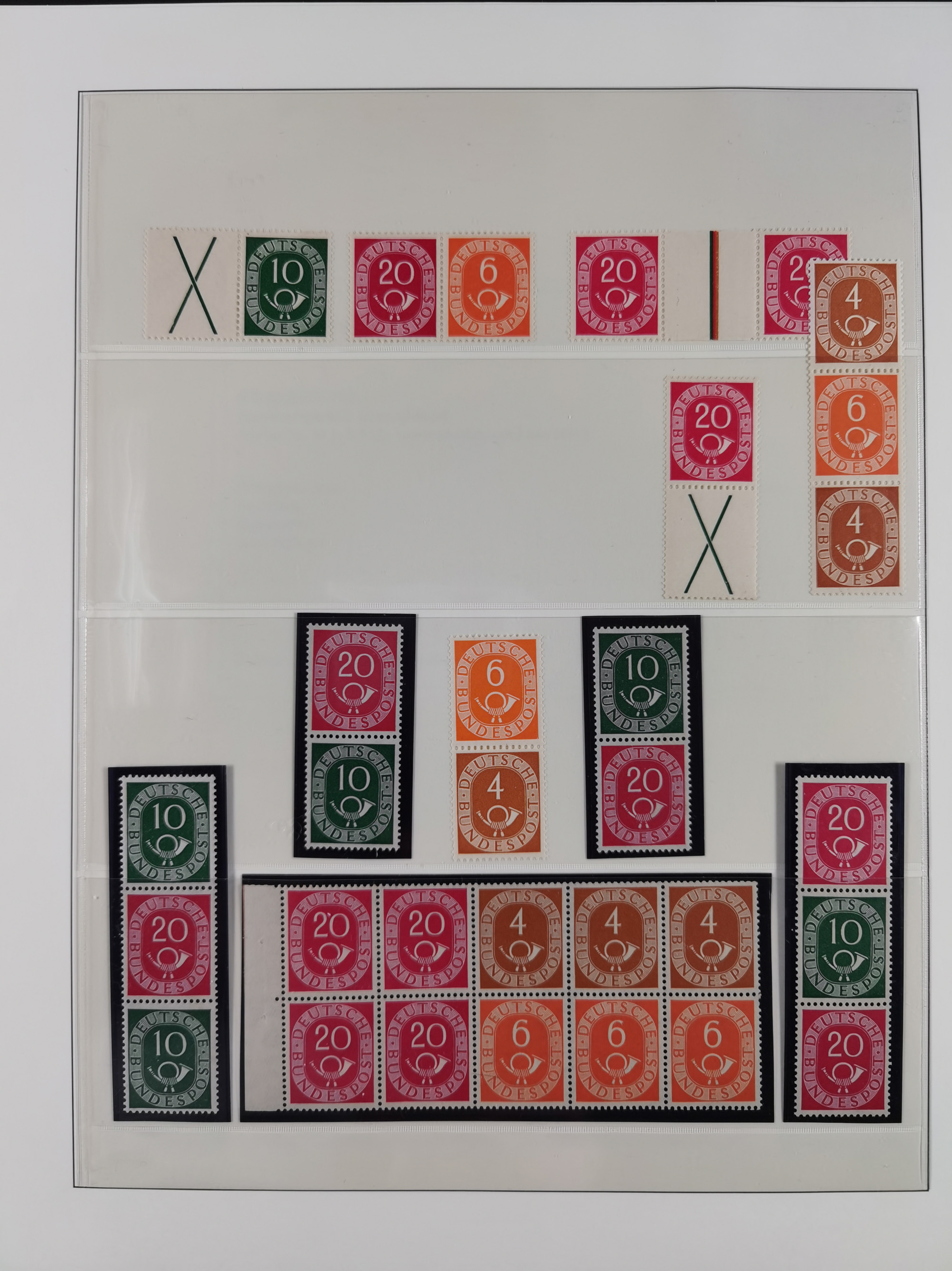 1951/54, gestempelte und meist postfrische Sammlung Zusammendrucke Posthorn und Heuss mit vielen geprüften Stücken wie H-Bl. 1 gestempelt Attest A. Schlegel BPP, S8PFI postfrisch, Attest H-D. Schlegel BPP, Mi. S6 postfrisch, Attest H.-D. Schlegel BPP, Mi. S6 und S7 gestempelt, je Befund A. Schlegel BPP, H.-Bl. 2 Befund H.- D. Schlegel BPP, WZ4 postfrisch, Befund H.-D. Schlegel BPP und W1/S9 postfrisch Befund H.-D. Schlegel BPP.