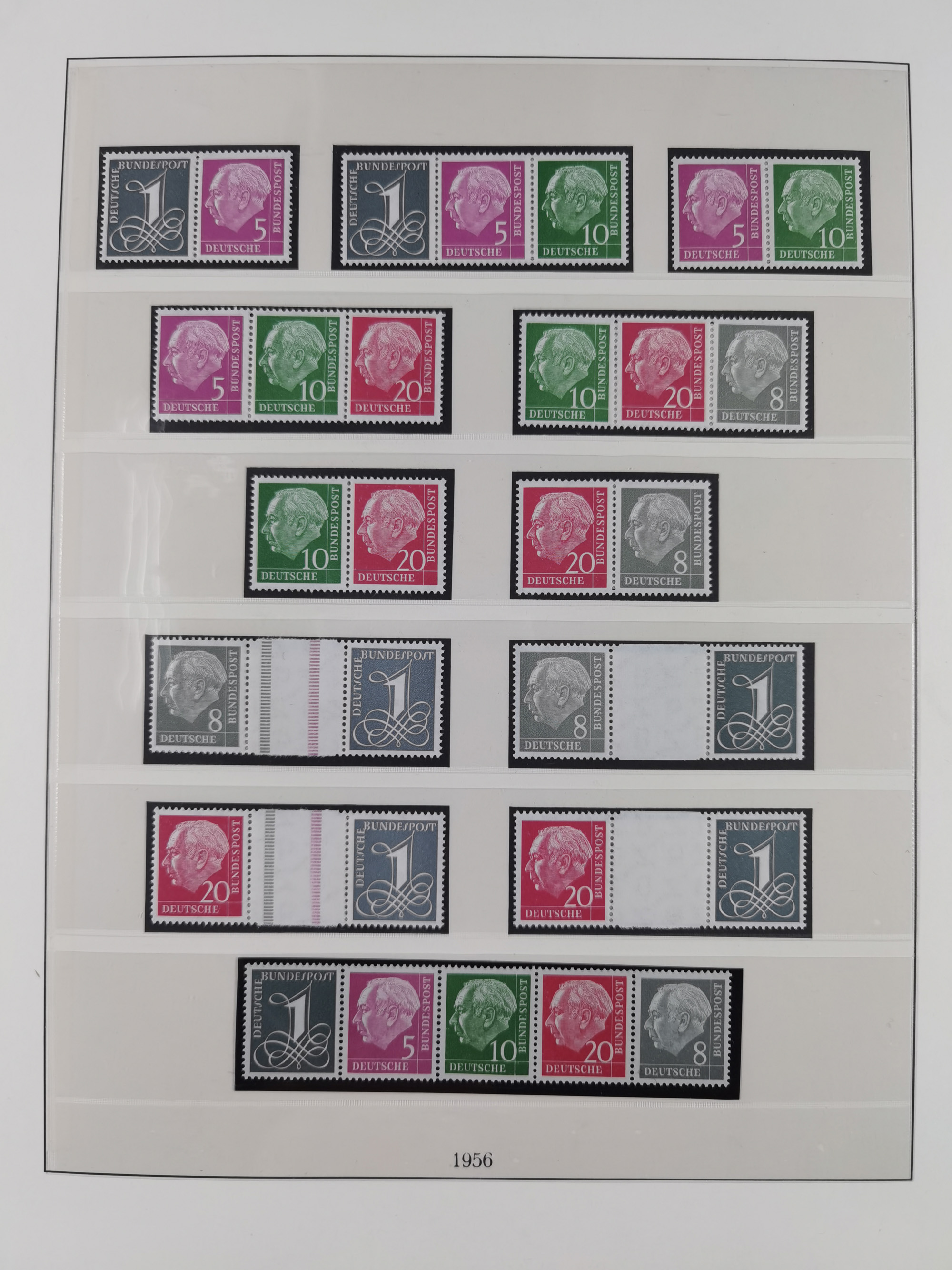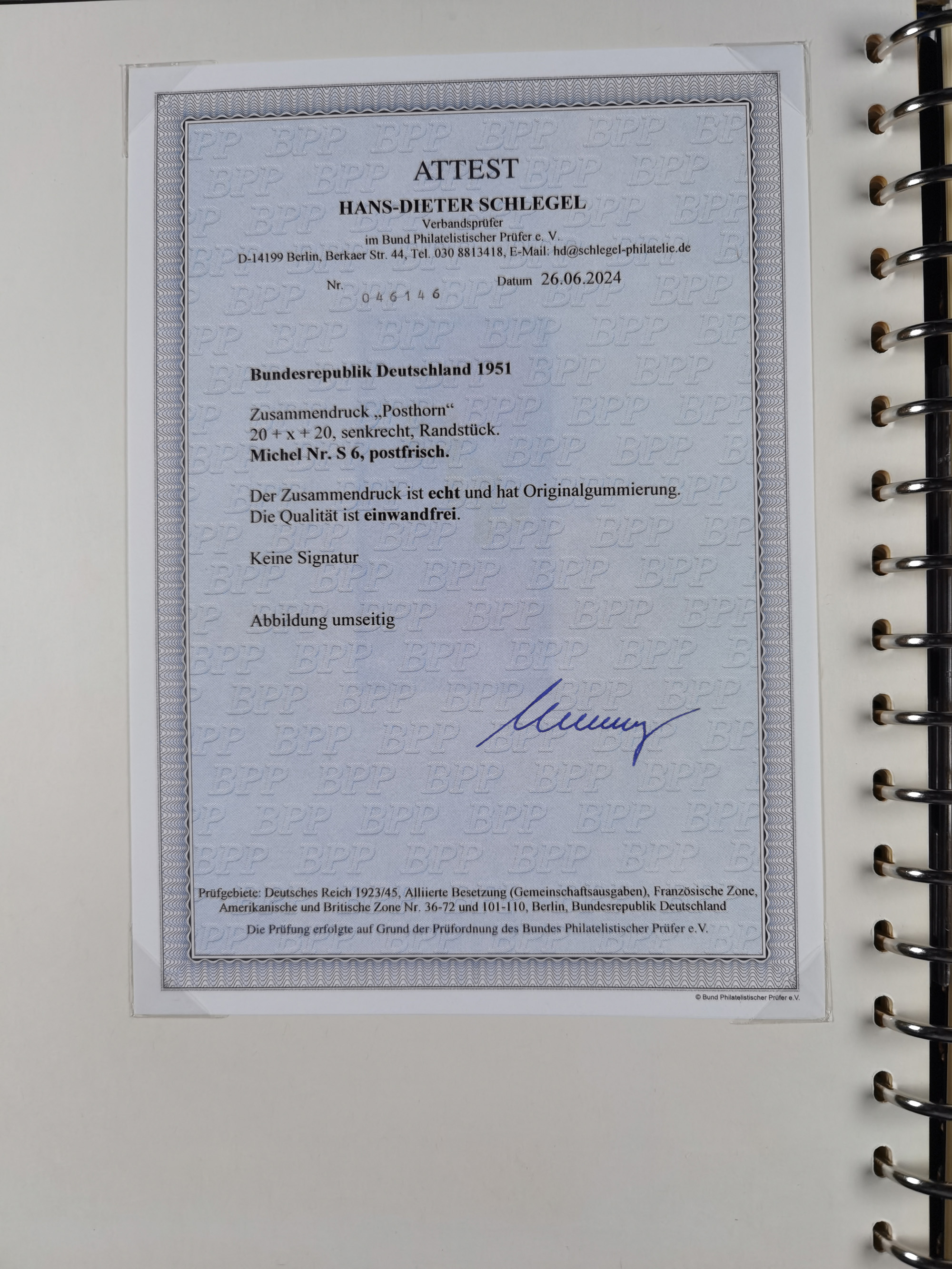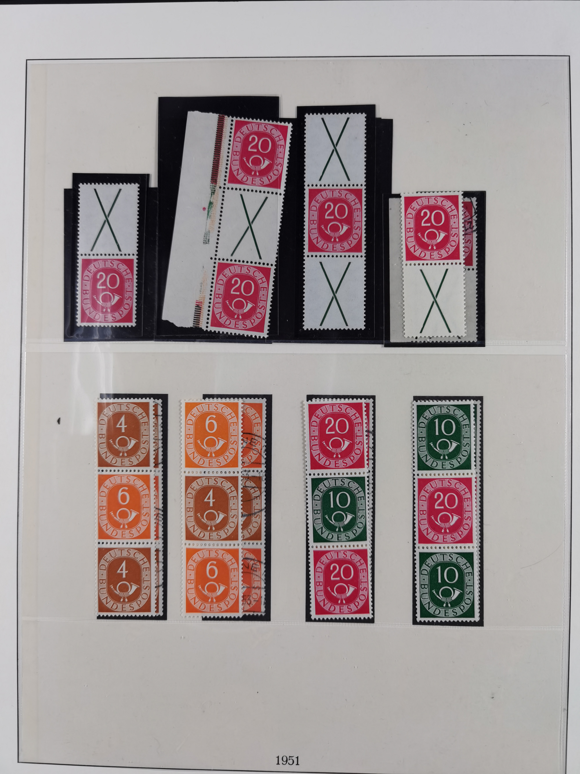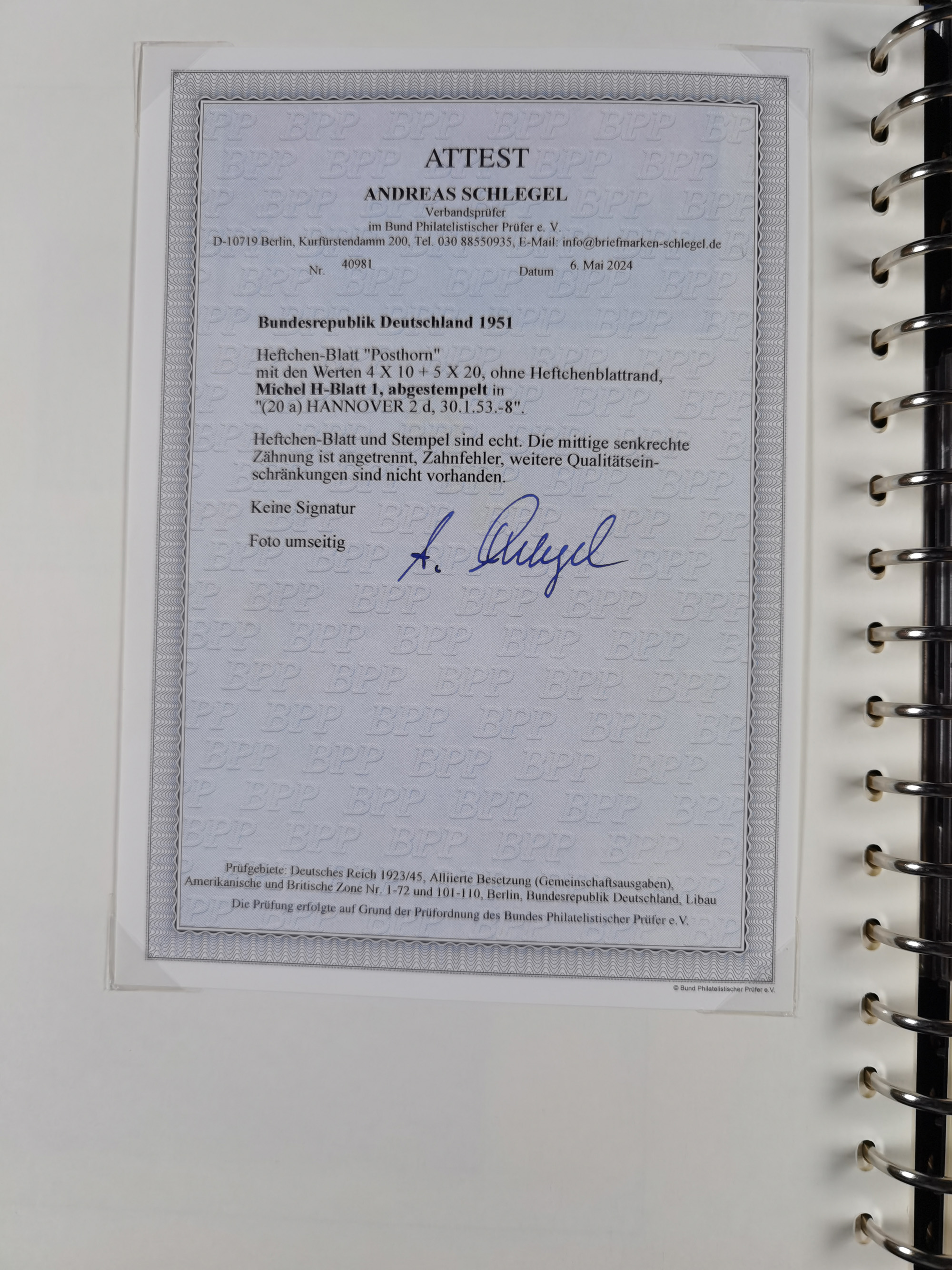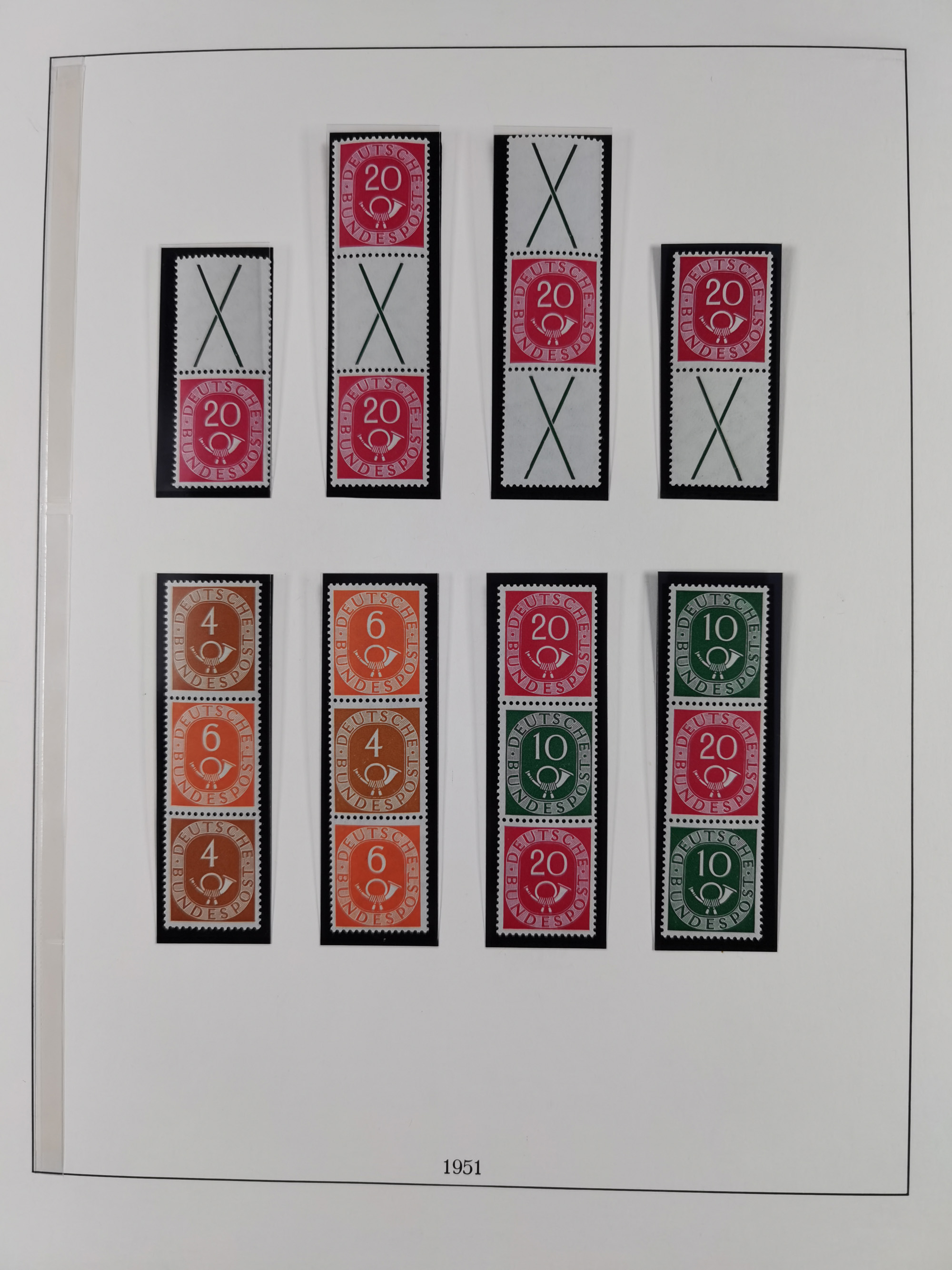 1951/54, gestempelte und meist postfrische Sammlung Zusammendrucke Posthorn und Heuss mit vielen geprüften Stücken wie H-Bl. 1 gestempelt Attest A. Schlegel BPP, S8PFI postfrisch, Attest H-D. Schlegel BPP, Mi. S6 postfrisch, Attest H.-D. Schlegel BPP, Mi. S6 und S7 gestempelt, je Befund A. Schlegel BPP, H.-Bl. 2 Befund H.- D. Schlegel BPP, WZ4 postfrisch, Befund H.-D. Schlegel BPP und W1/S9 postfrisch Befund H.-D. Schlegel BPP.