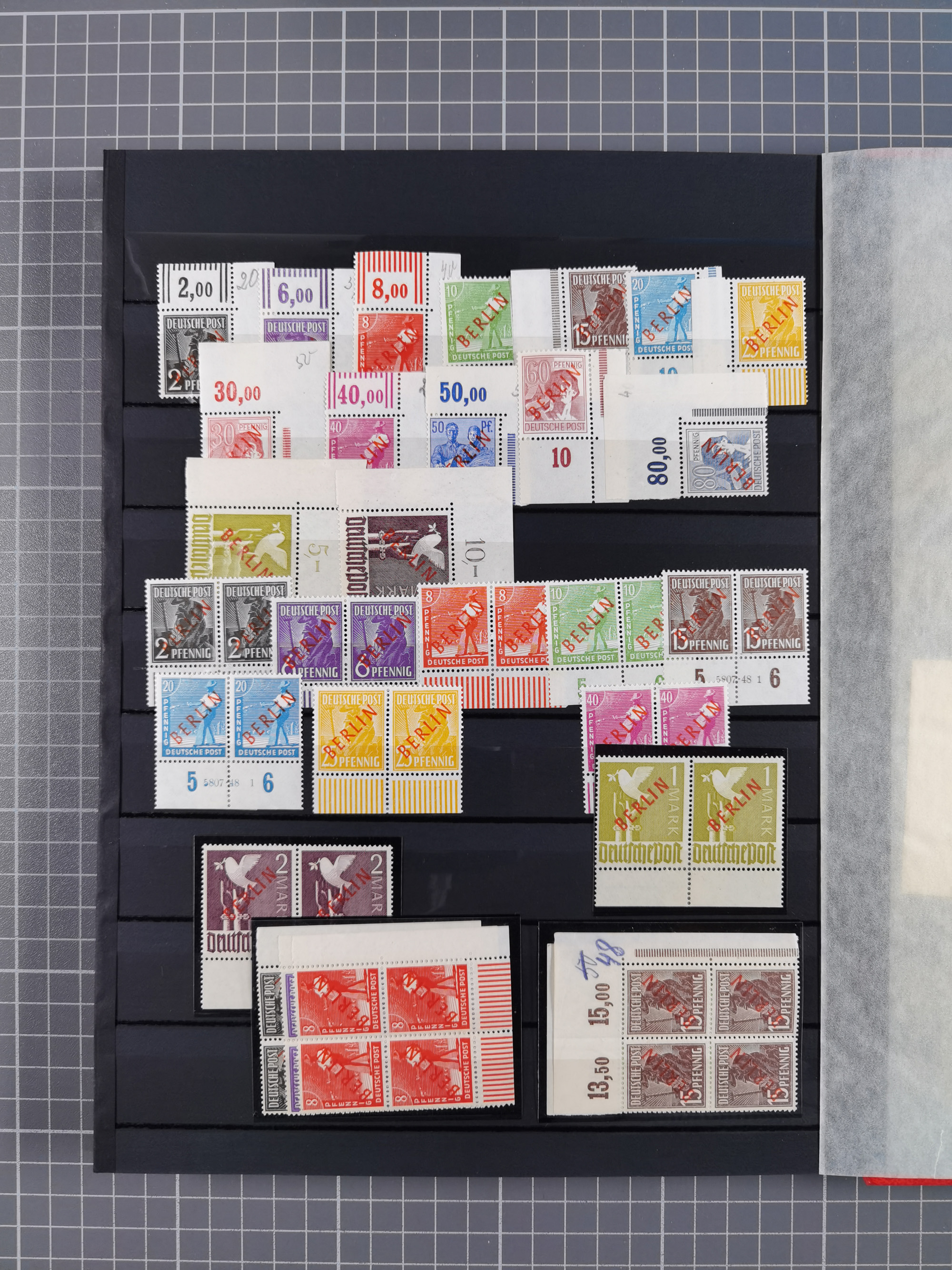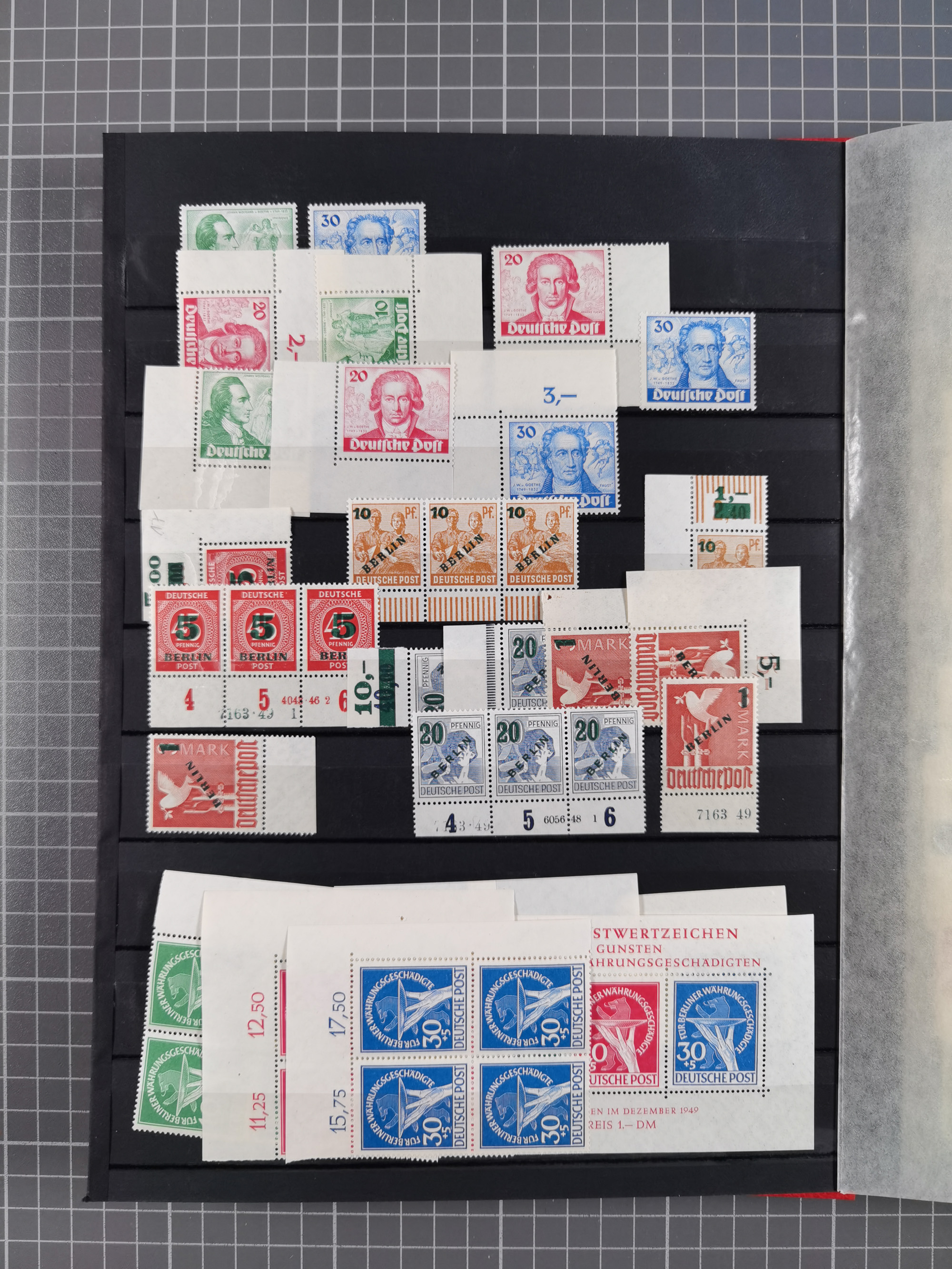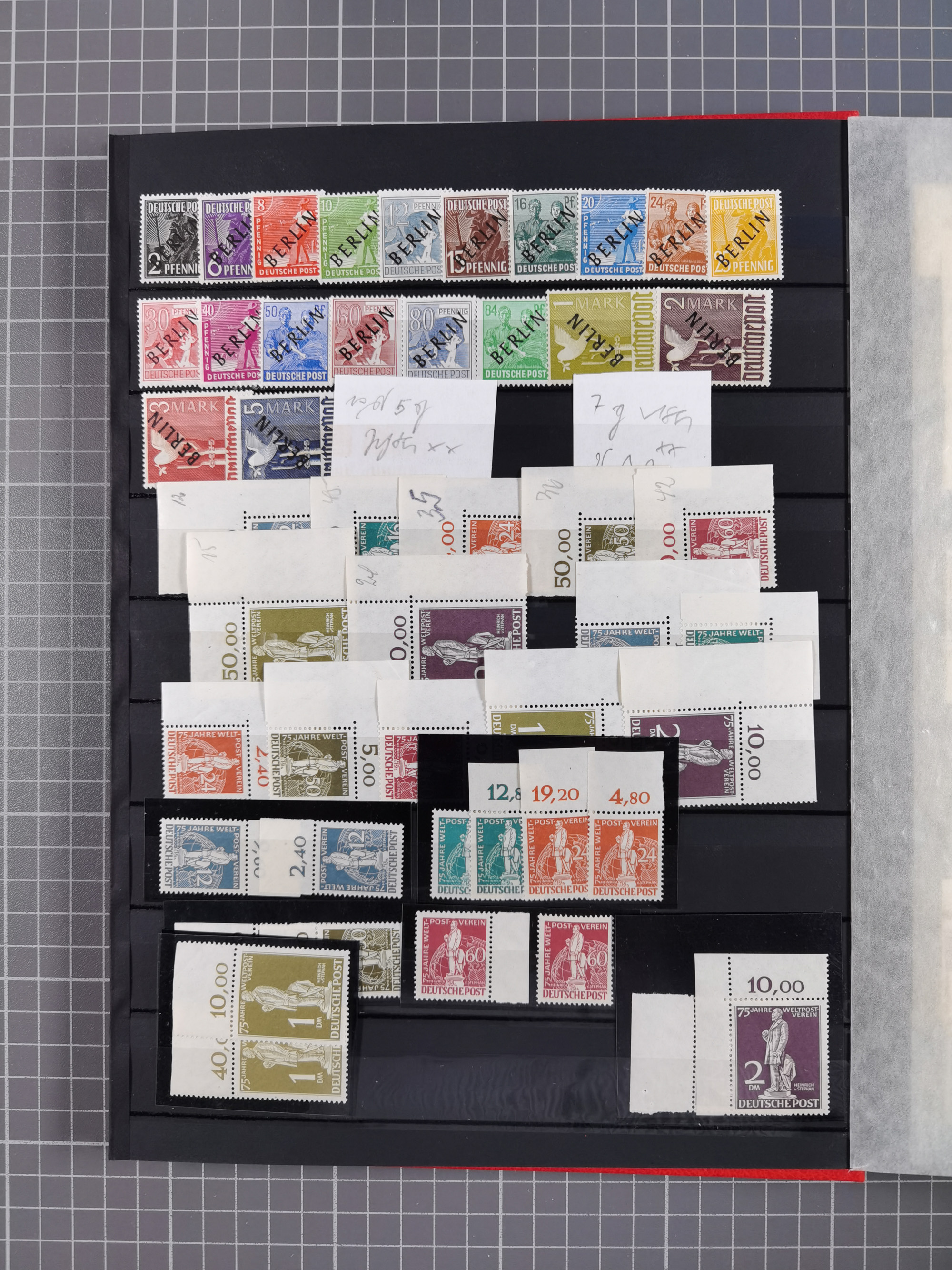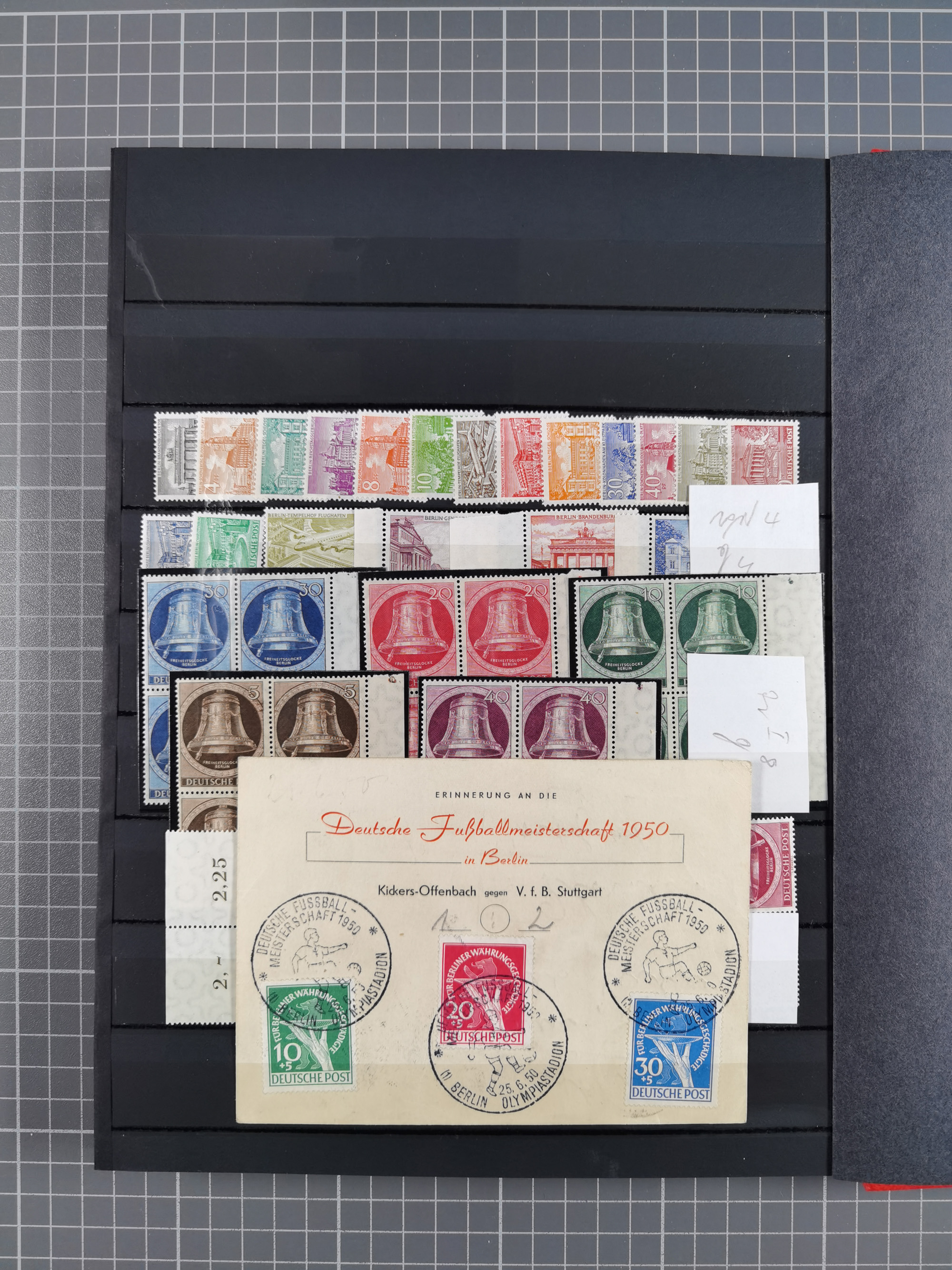 1949/60, Bestand auf Steckkarten mit Berlin Schwarzaufdrucke geprüft Schlegel, Goethe signiert Bühler, Helfer der Menschheit in Viererblöcken etc., meist sehr sauber erhalten.