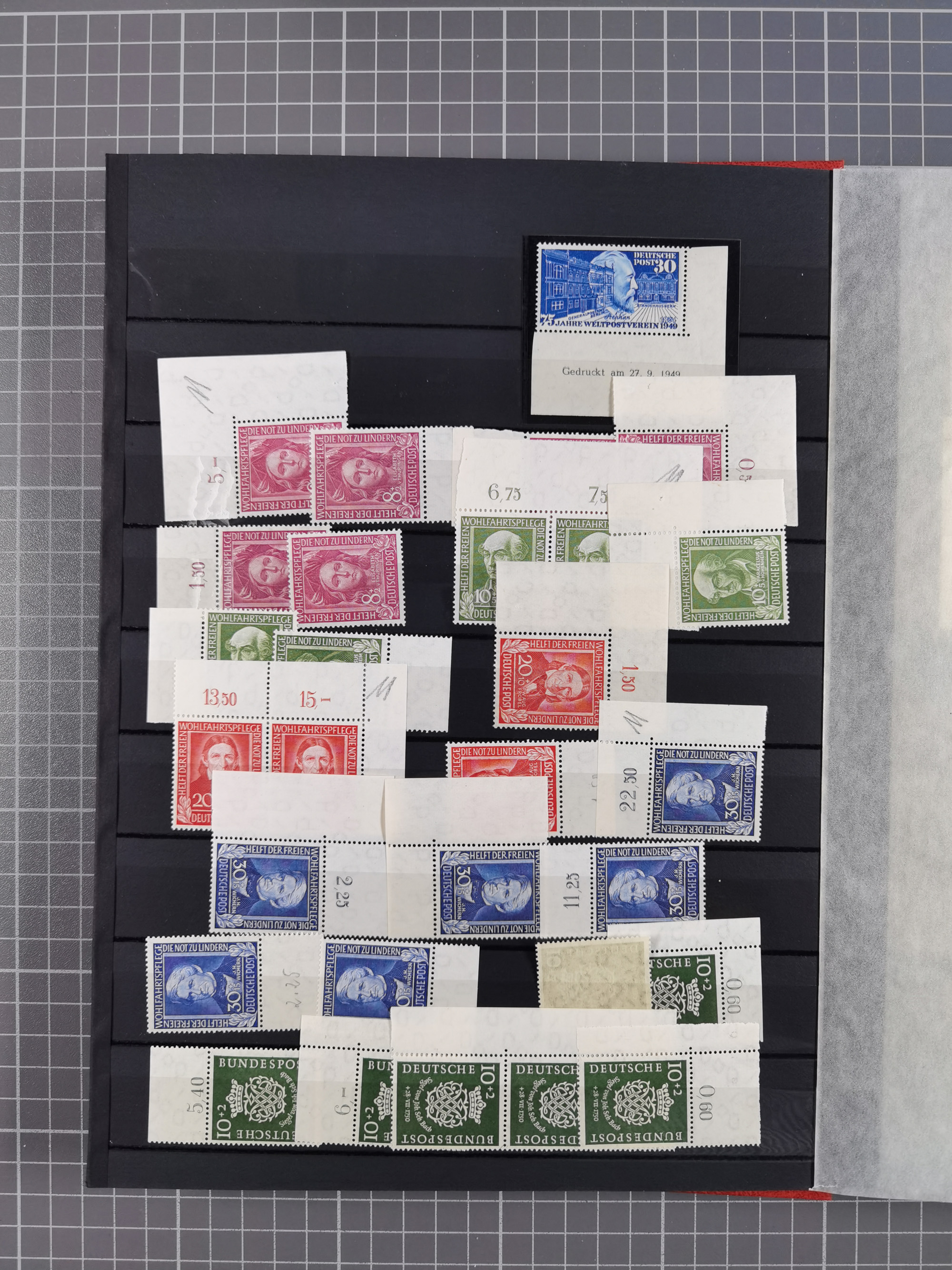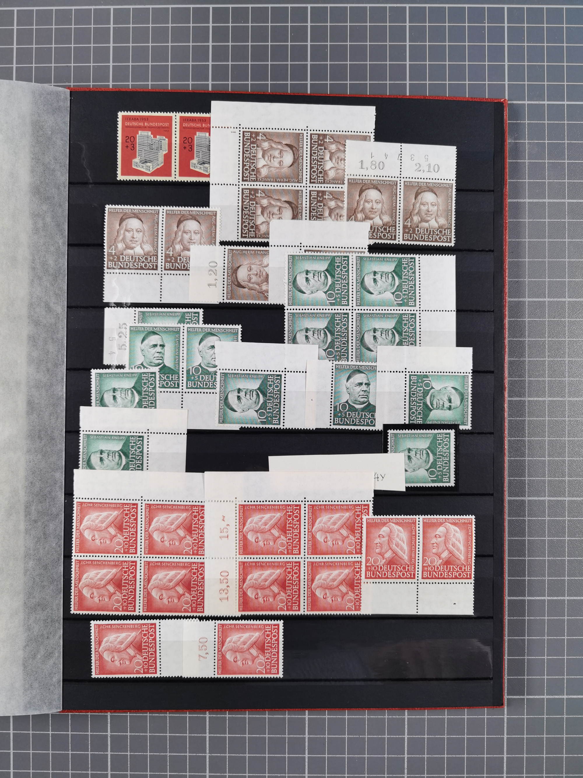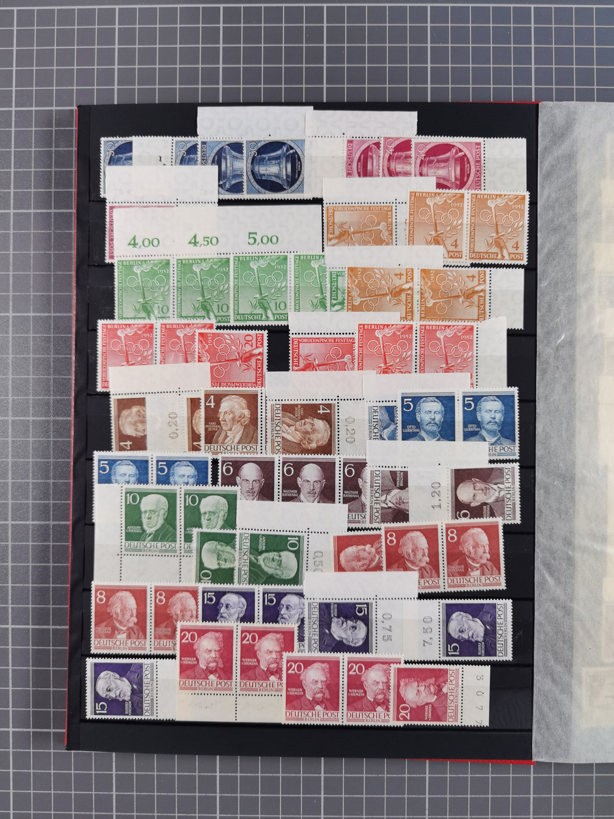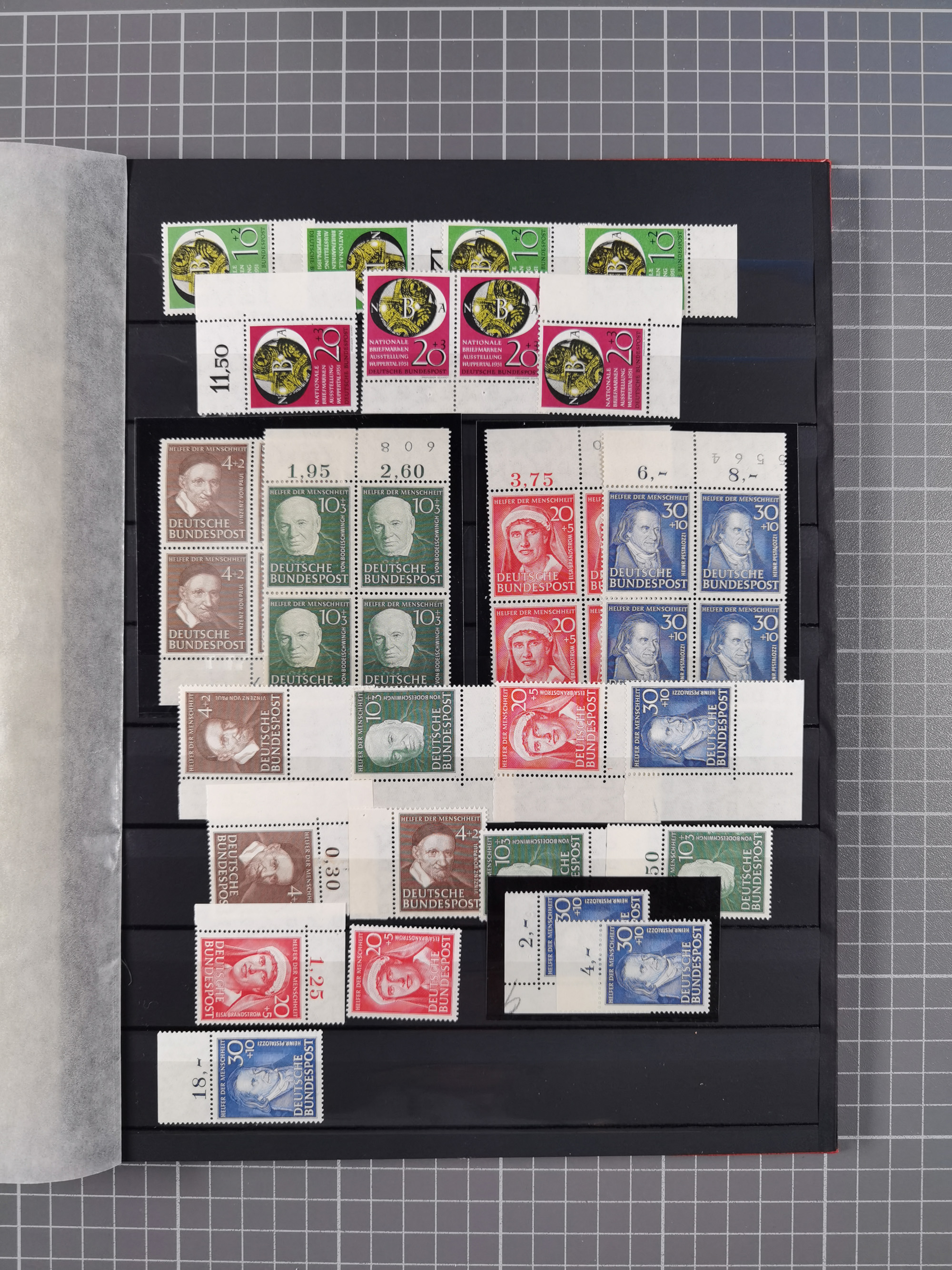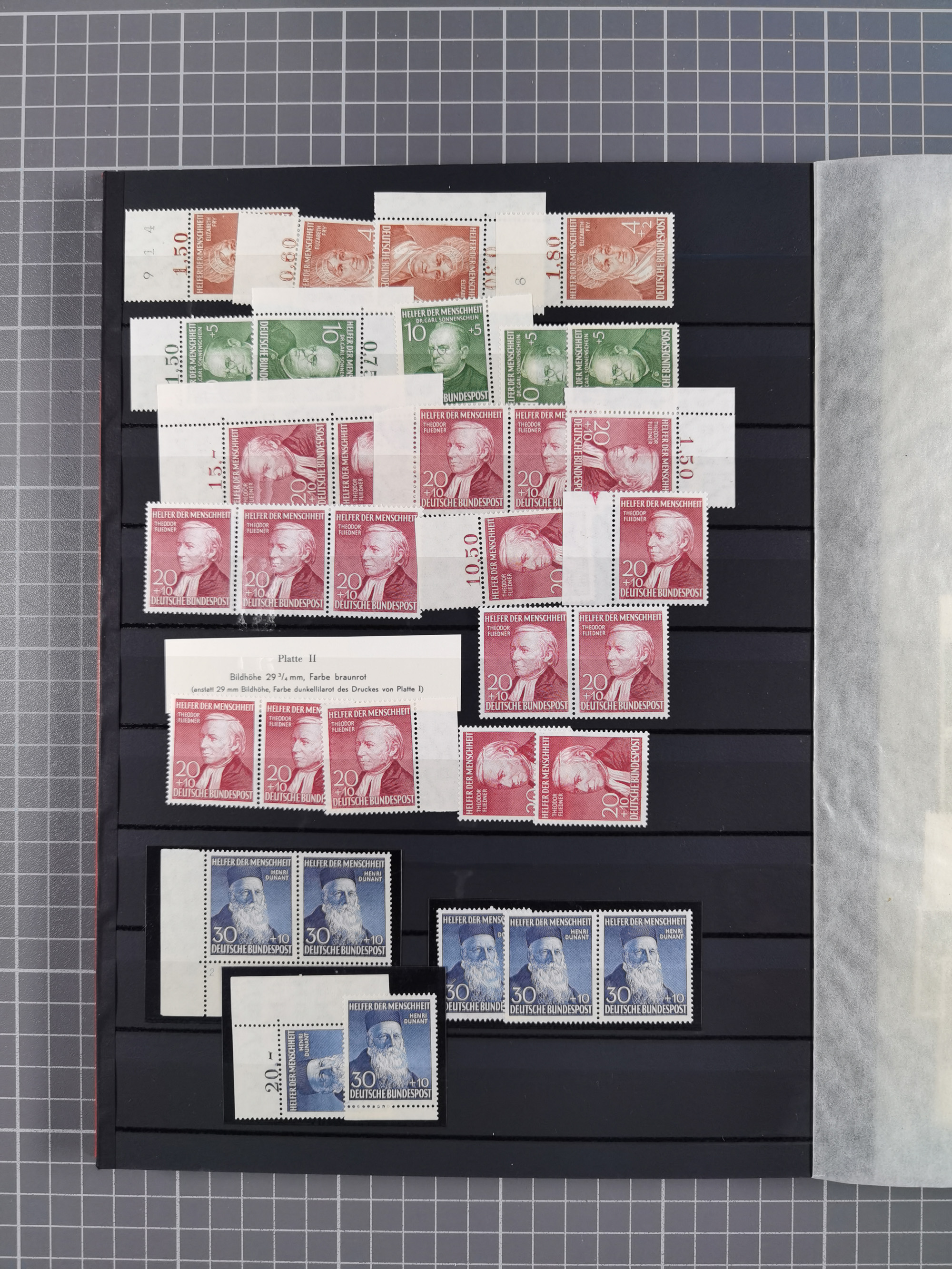 1949/60, Bestand auf Steckkarten mit Berlin Schwarzaufdrucke geprüft Schlegel, Goethe signiert Bühler, Helfer der Menschheit in Viererblöcken etc., meist sehr sauber erhalten.