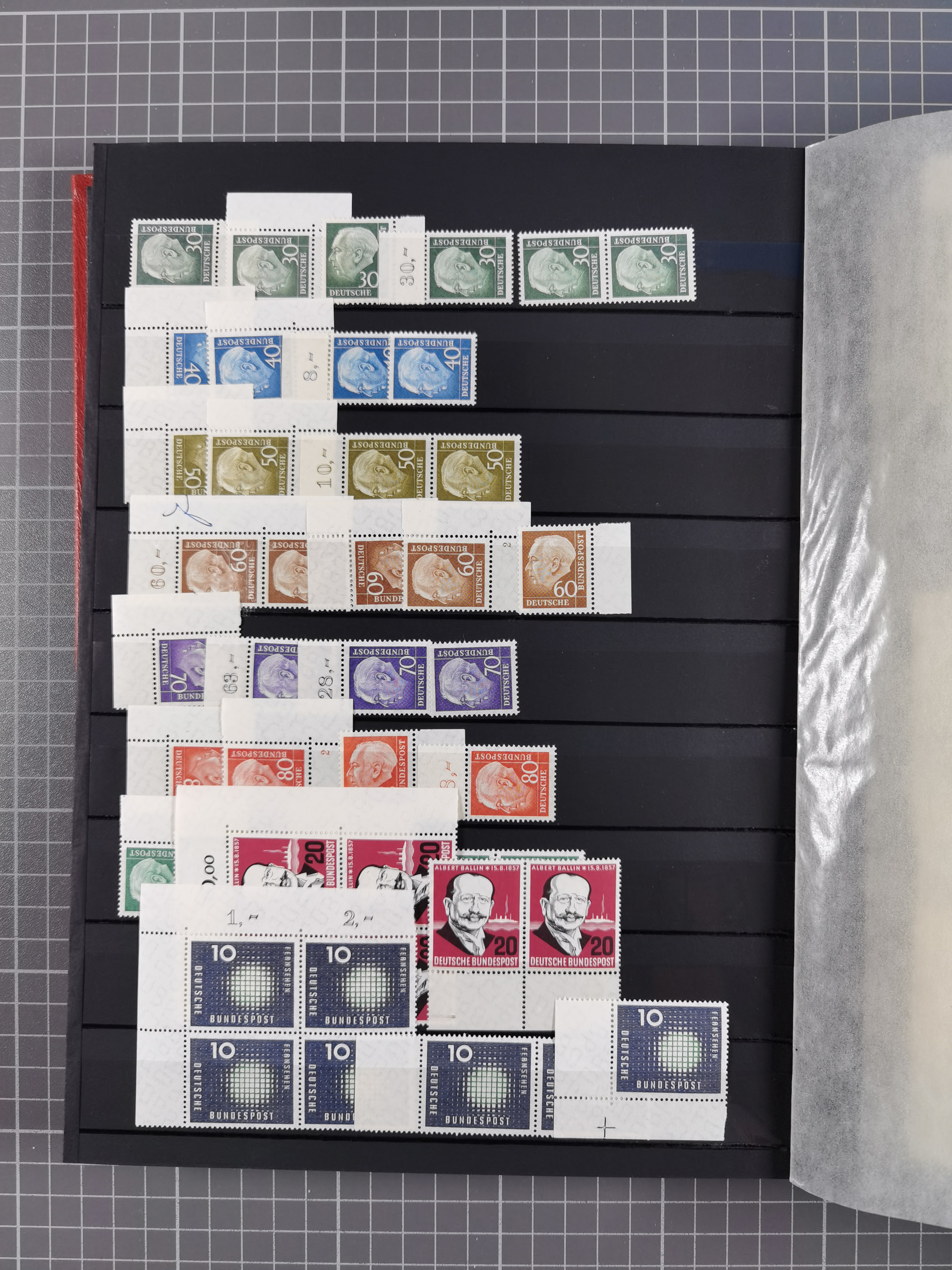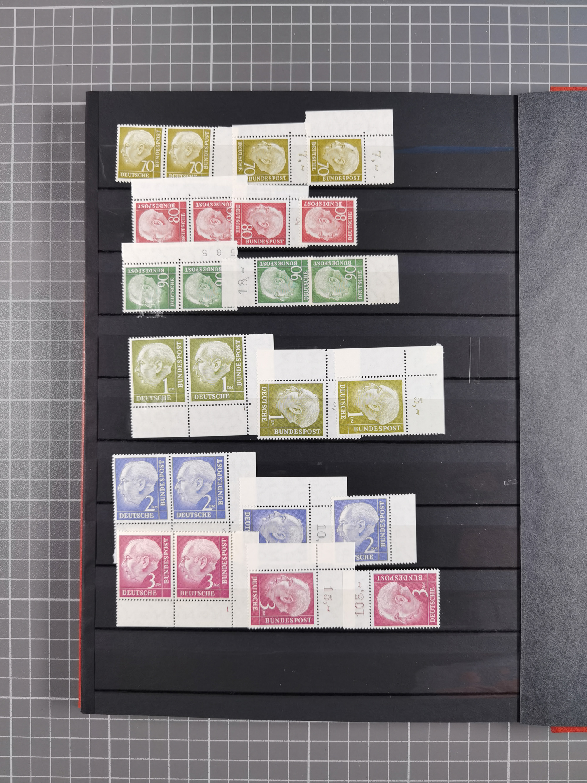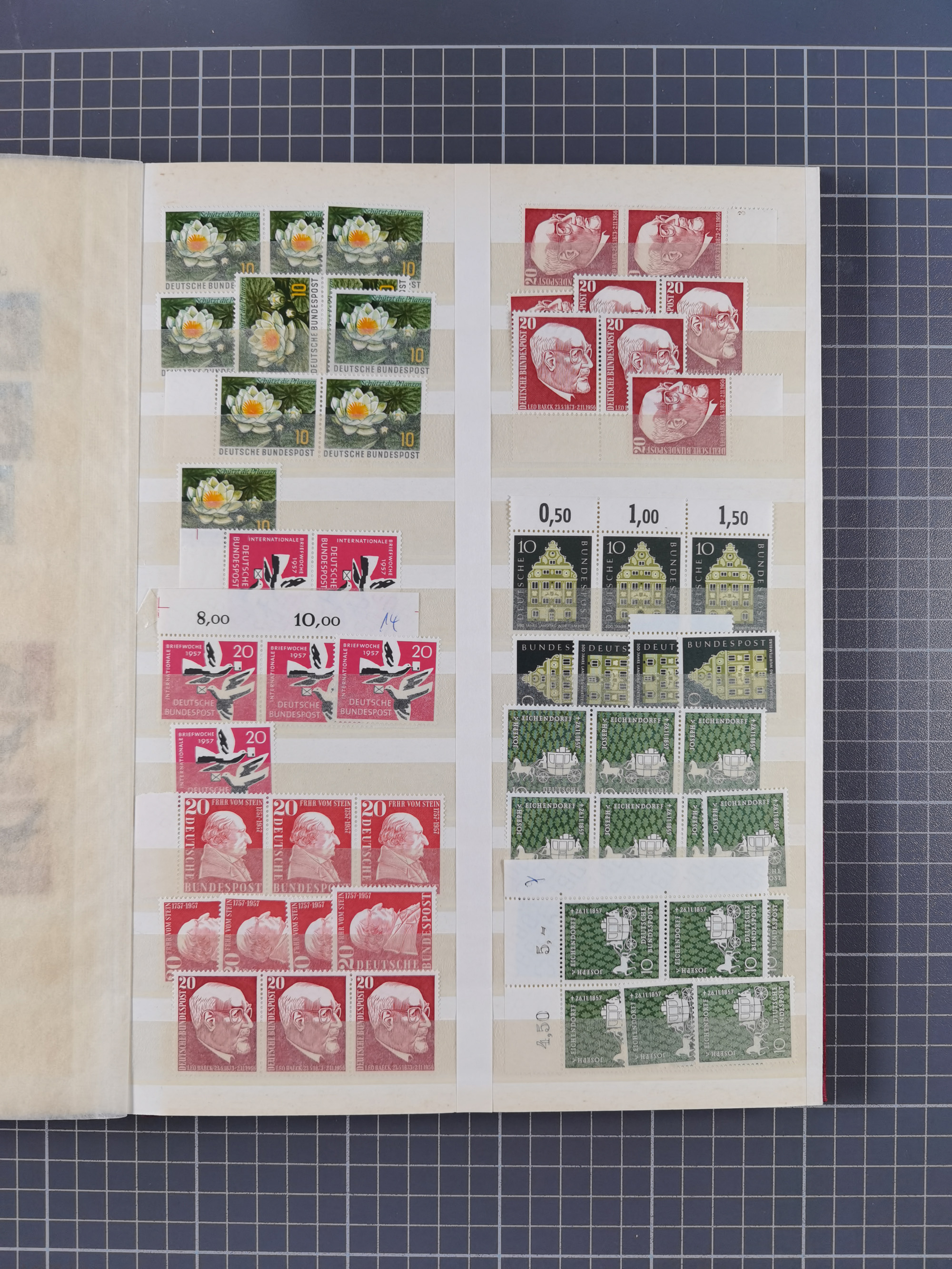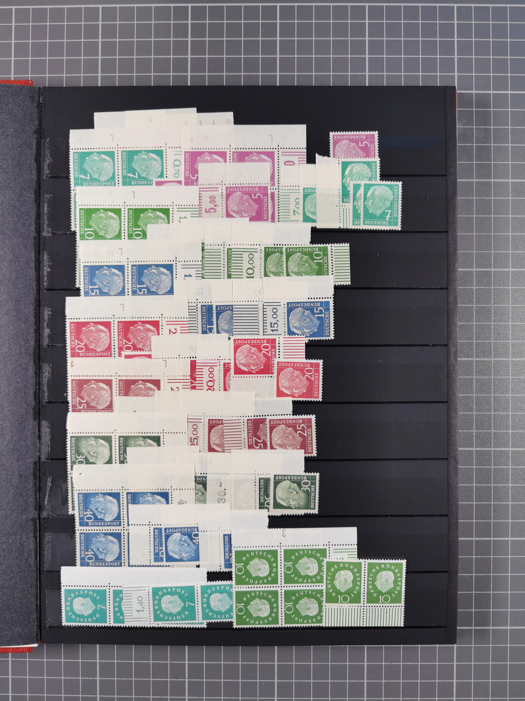 1954/60, Heuß, meist postfrische Lagerpartie, dabei etwa 13 kpl. Sätze und vier 4er-Blocks 50 Pfg., teils signiert, 3 Atteste A.Schlegel BPP