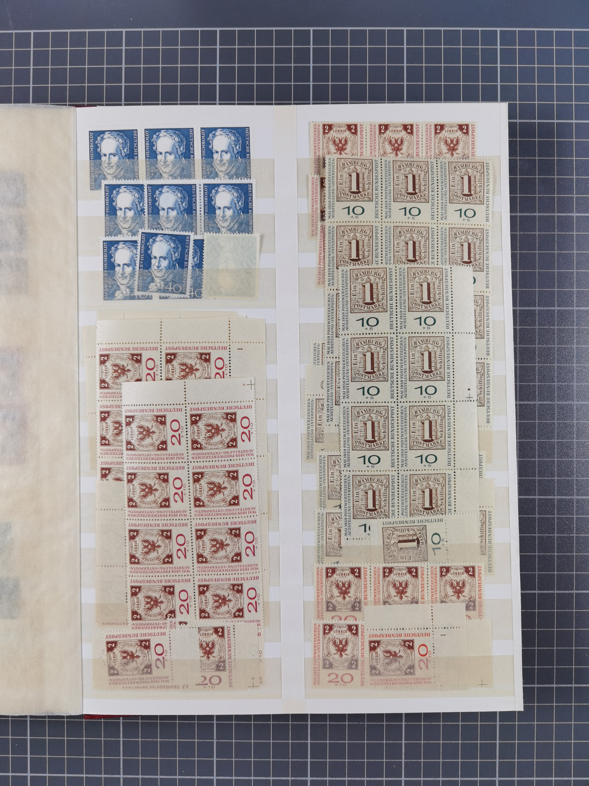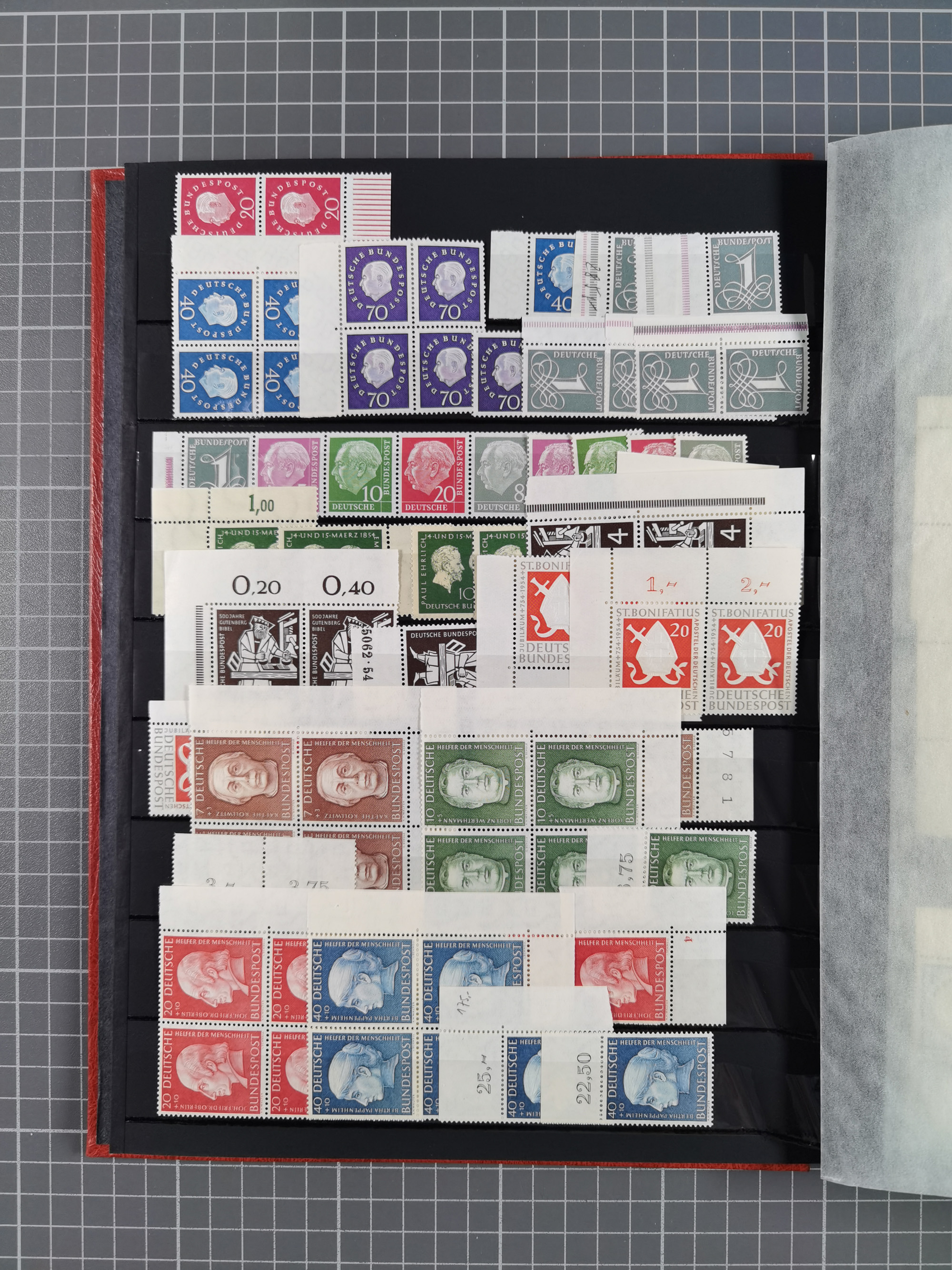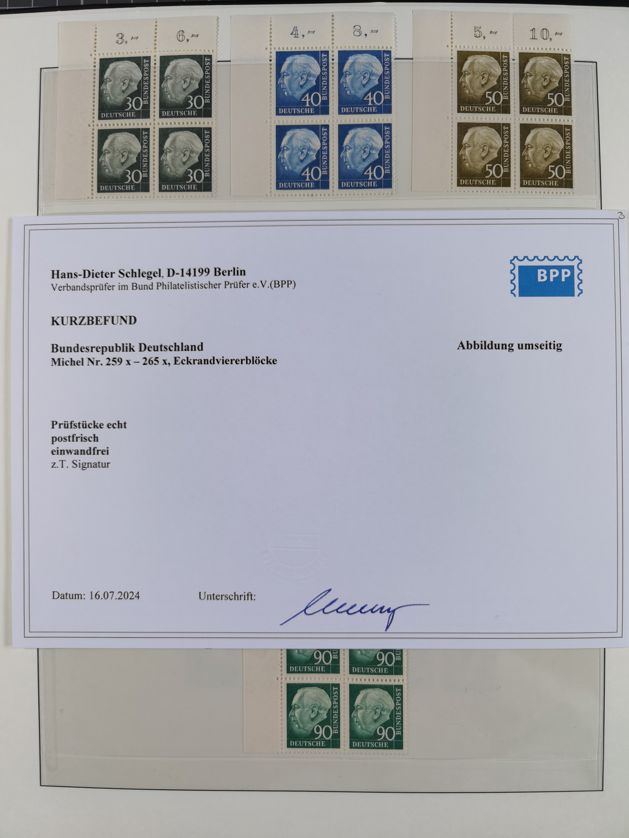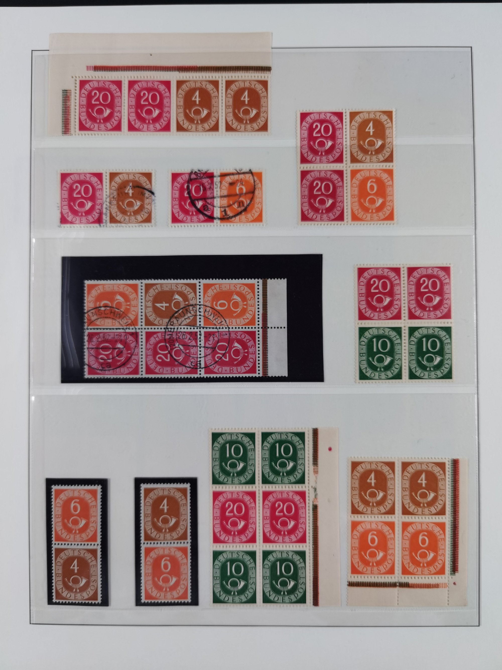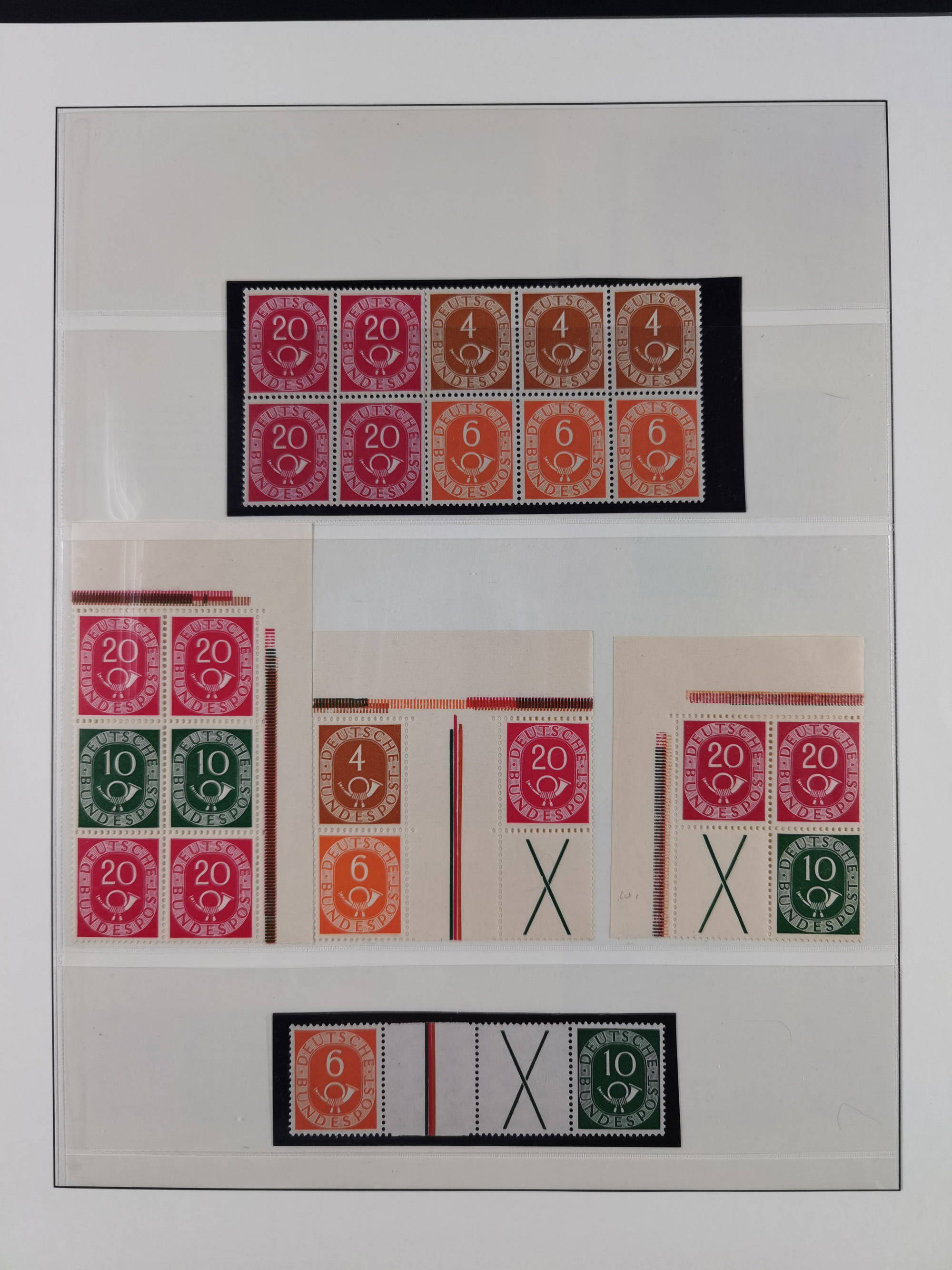 1951/2023, reichhaltiger postfrischer/ungebrauchter und gestempelter Sammlungsbestand mit Viererblocks, Bogenecken, Oberrandstücken, Fo.-Nr., Pl.-Nr., waagerechten Paaren ab Posthorn, dabei u.a. Posthorn in Viererblocks ohne 25, 70 und 80 Pfg. kpl., (90 Pfg. FA Schlegel BPP), sowie in waagerechten Paaren bis auf 80 Pfg. kpl., Mi.-Nr. 191 und 192 in 6er-Blocks, 259x 4er-Bl., 305 waagr. Paar, 306 Eckr.-4er-Bl., Heuss teils in 4er, 6er und 10er-Blocks, Heuss Lumogen Eckrand-4er-Blocksatz postfrisch, Bedeutende Deutsche ZD, etc. etc., sowie einige Briefe mit interessanten MeF, Einheiten und FDC, etliches mehrfach und teils auf Loskarten, vieles signiert sowie 4 Atteste und 58 (Kurz-)Befunde Schlegel BPP, gute Erhaltung, in zwei Kartons