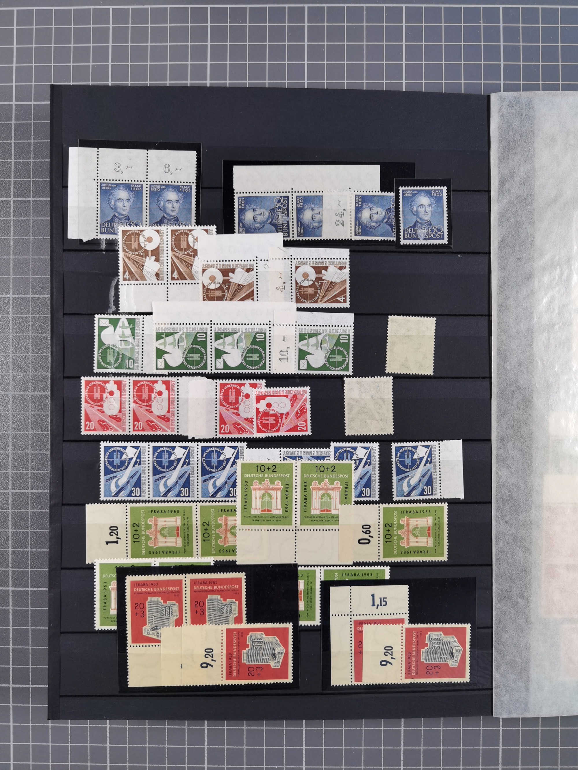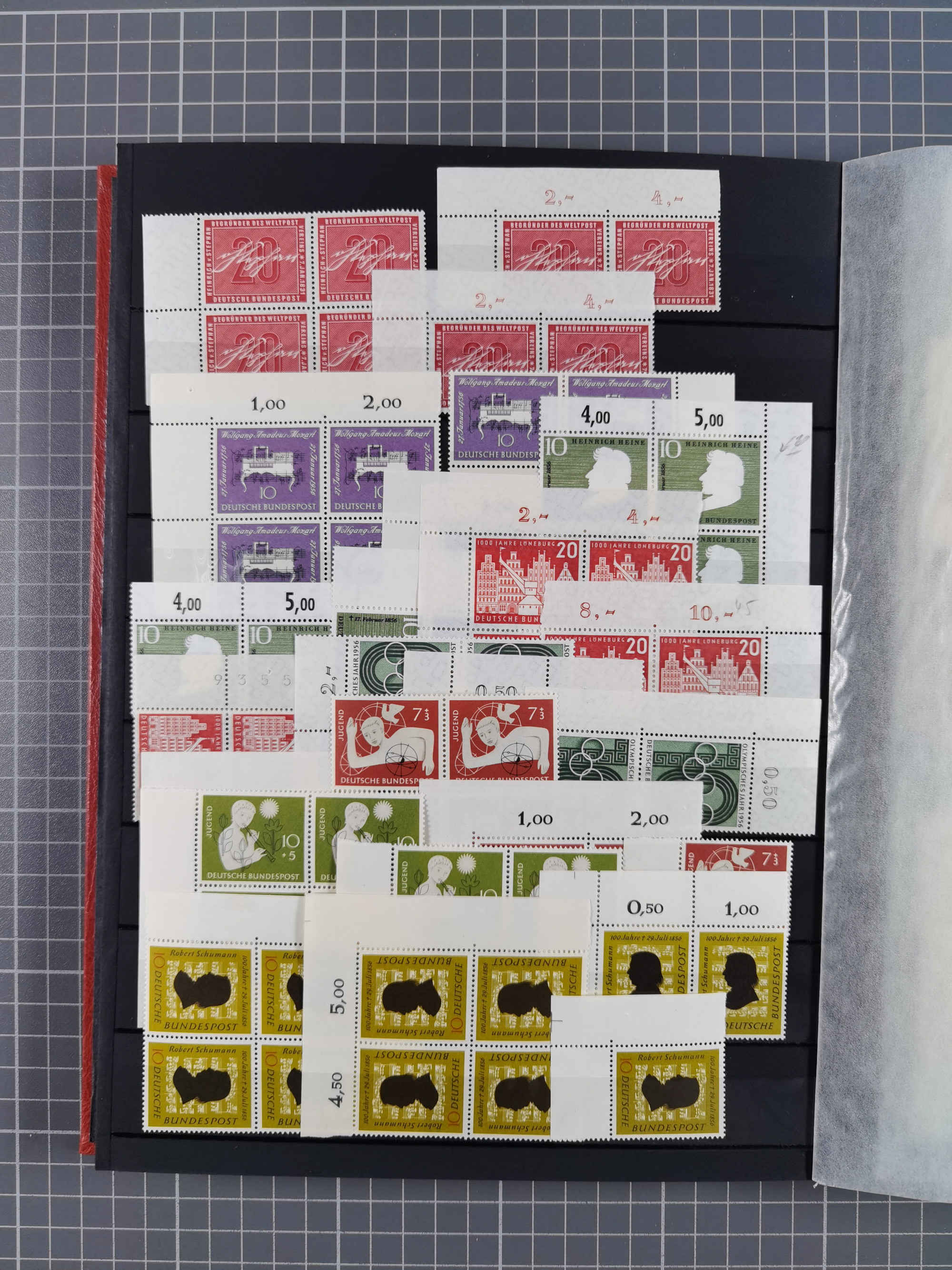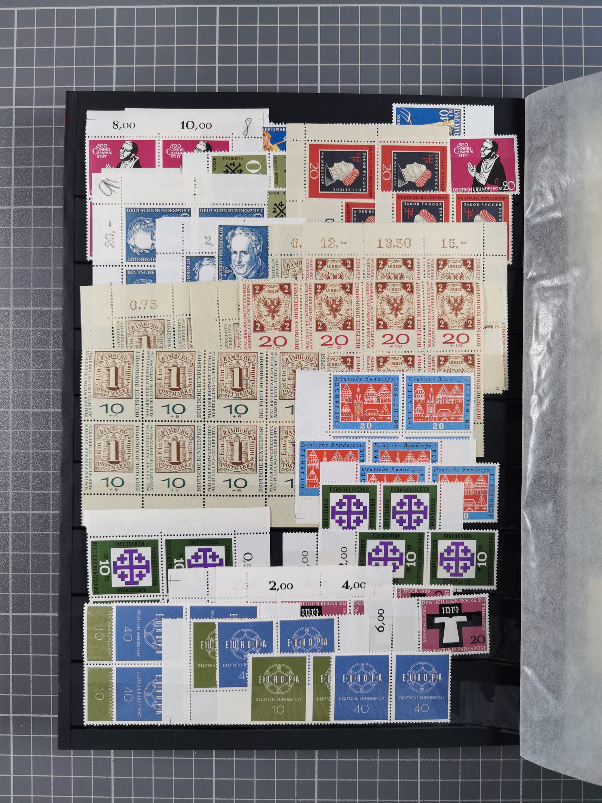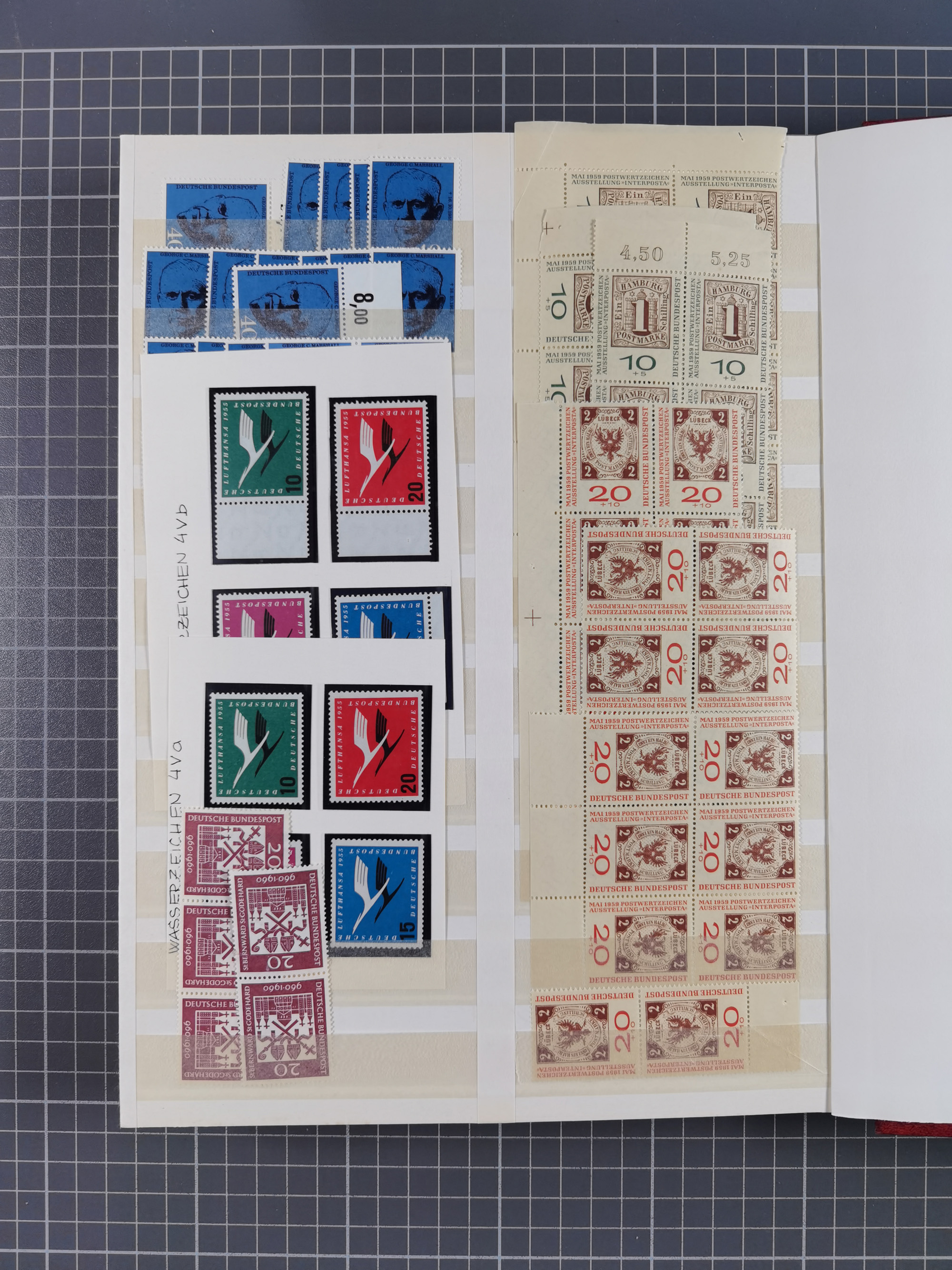 1951/2023, reichhaltiger postfrischer/ungebrauchter und gestempelter Sammlungsbestand mit Viererblocks, Bogenecken, Oberrandstücken, Fo.-Nr., Pl.-Nr., waagerechten Paaren ab Posthorn, dabei u.a. Posthorn in Viererblocks ohne 25, 70 und 80 Pfg. kpl., (90 Pfg. FA Schlegel BPP), sowie in waagerechten Paaren bis auf 80 Pfg. kpl., Mi.-Nr. 191 und 192 in 6er-Blocks, 259x 4er-Bl., 305 waagr. Paar, 306 Eckr.-4er-Bl., Heuss teils in 4er, 6er und 10er-Blocks, Heuss Lumogen Eckrand-4er-Blocksatz postfrisch, Bedeutende Deutsche ZD, etc. etc., sowie einige Briefe mit interessanten MeF, Einheiten und FDC, etliches mehrfach und teils auf Loskarten, vieles signiert sowie 4 Atteste und 58 (Kurz-)Befunde Schlegel BPP, gute Erhaltung, in zwei Kartons