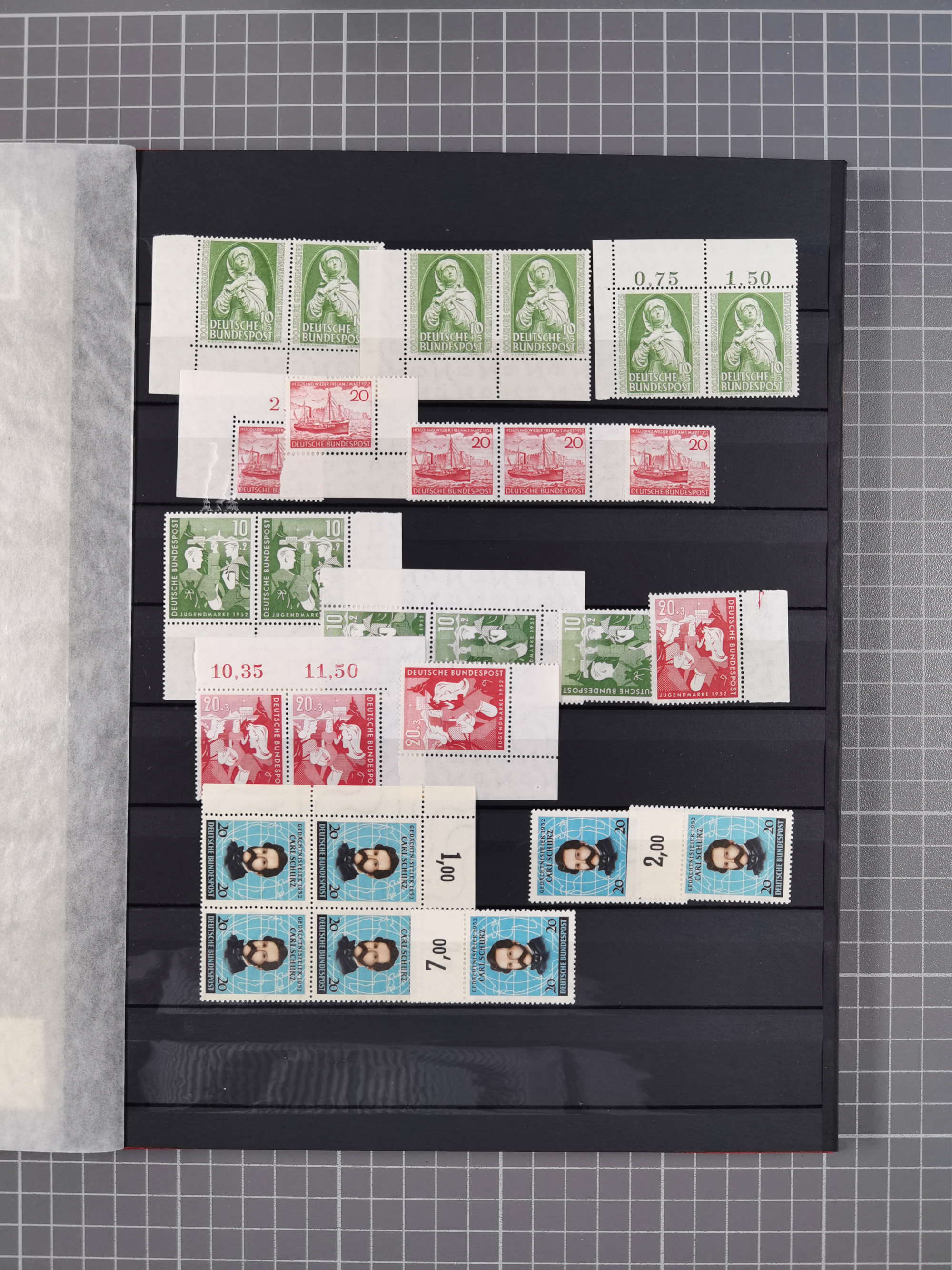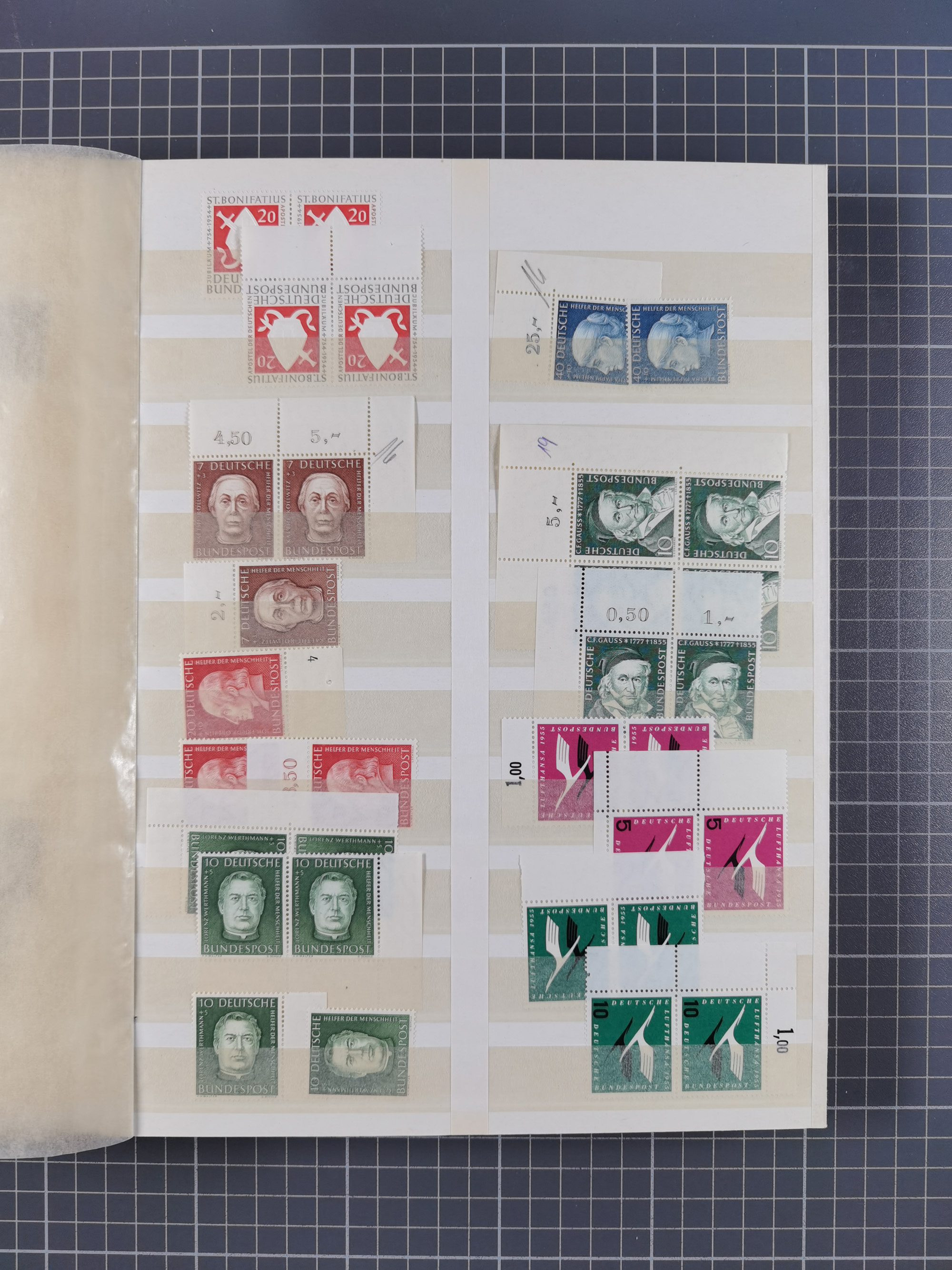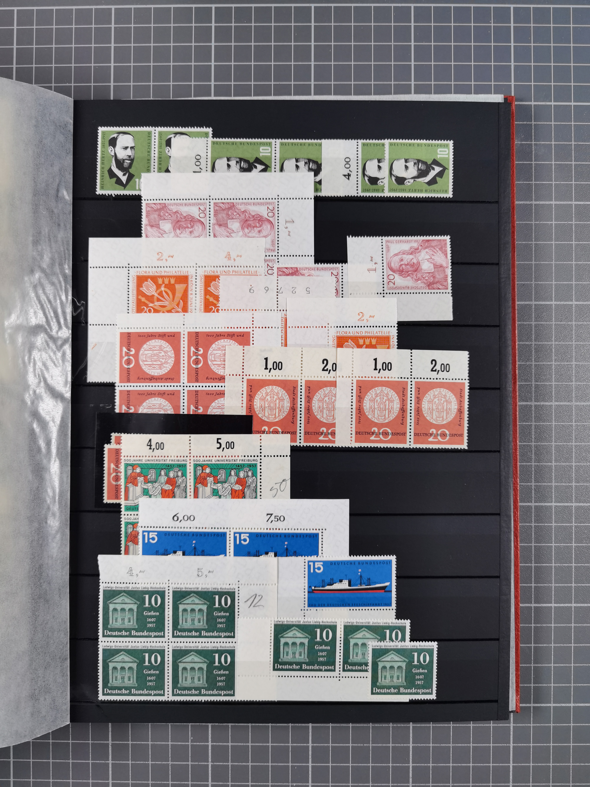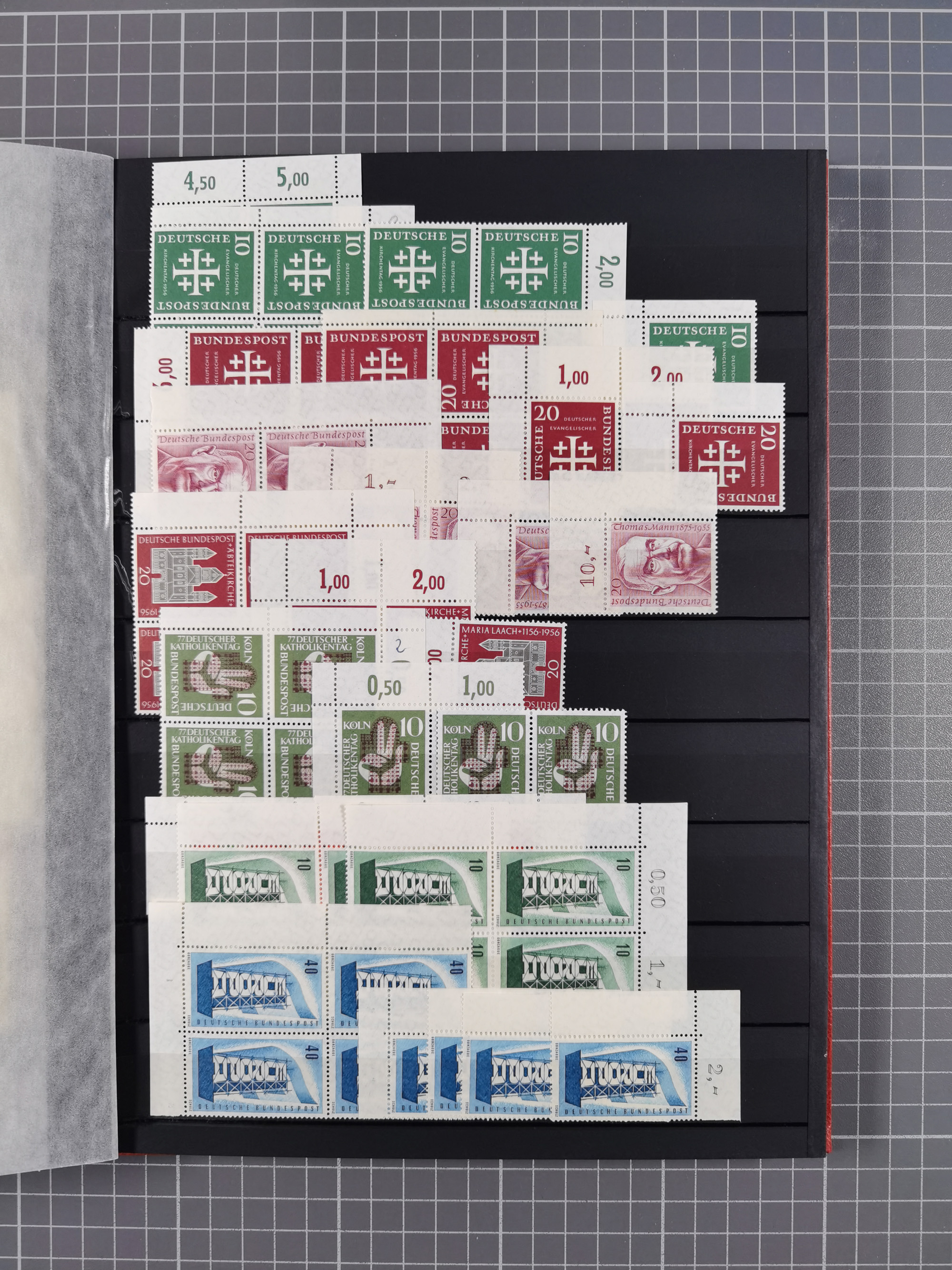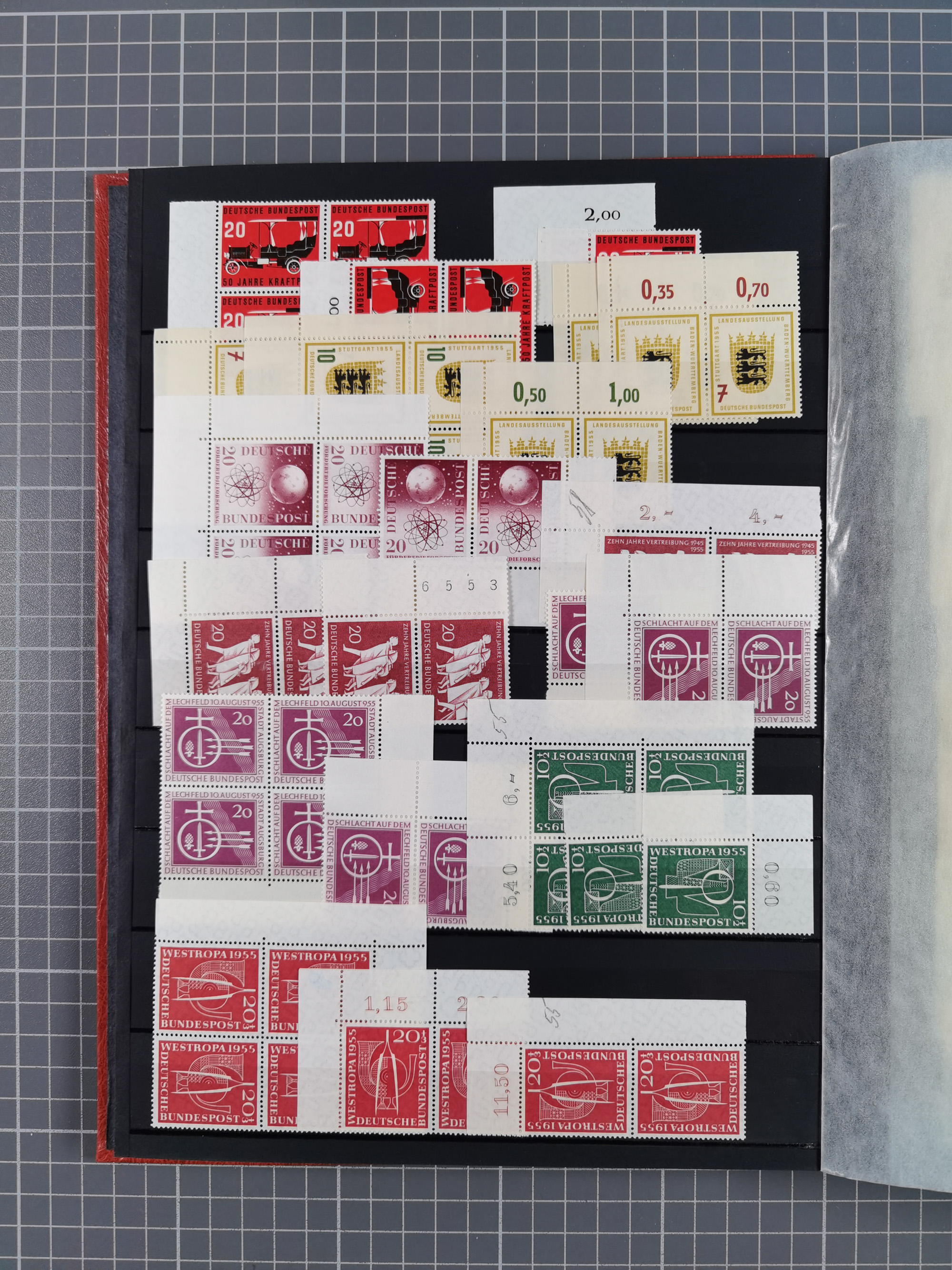 1951/2023, reichhaltiger postfrischer/ungebrauchter und gestempelter Sammlungsbestand mit Viererblocks, Bogenecken, Oberrandstücken, Fo.-Nr., Pl.-Nr., waagerechten Paaren ab Posthorn, dabei u.a. Posthorn in Viererblocks ohne 25, 70 und 80 Pfg. kpl., (90 Pfg. FA Schlegel BPP), sowie in waagerechten Paaren bis auf 80 Pfg. kpl., Mi.-Nr. 191 und 192 in 6er-Blocks, 259x 4er-Bl., 305 waagr. Paar, 306 Eckr.-4er-Bl., Heuss teils in 4er, 6er und 10er-Blocks, Heuss Lumogen Eckrand-4er-Blocksatz postfrisch, Bedeutende Deutsche ZD, etc. etc., sowie einige Briefe mit interessanten MeF, Einheiten und FDC, etliches mehrfach und teils auf Loskarten, vieles signiert sowie 4 Atteste und 58 (Kurz-)Befunde Schlegel BPP, gute Erhaltung, in zwei Kartons