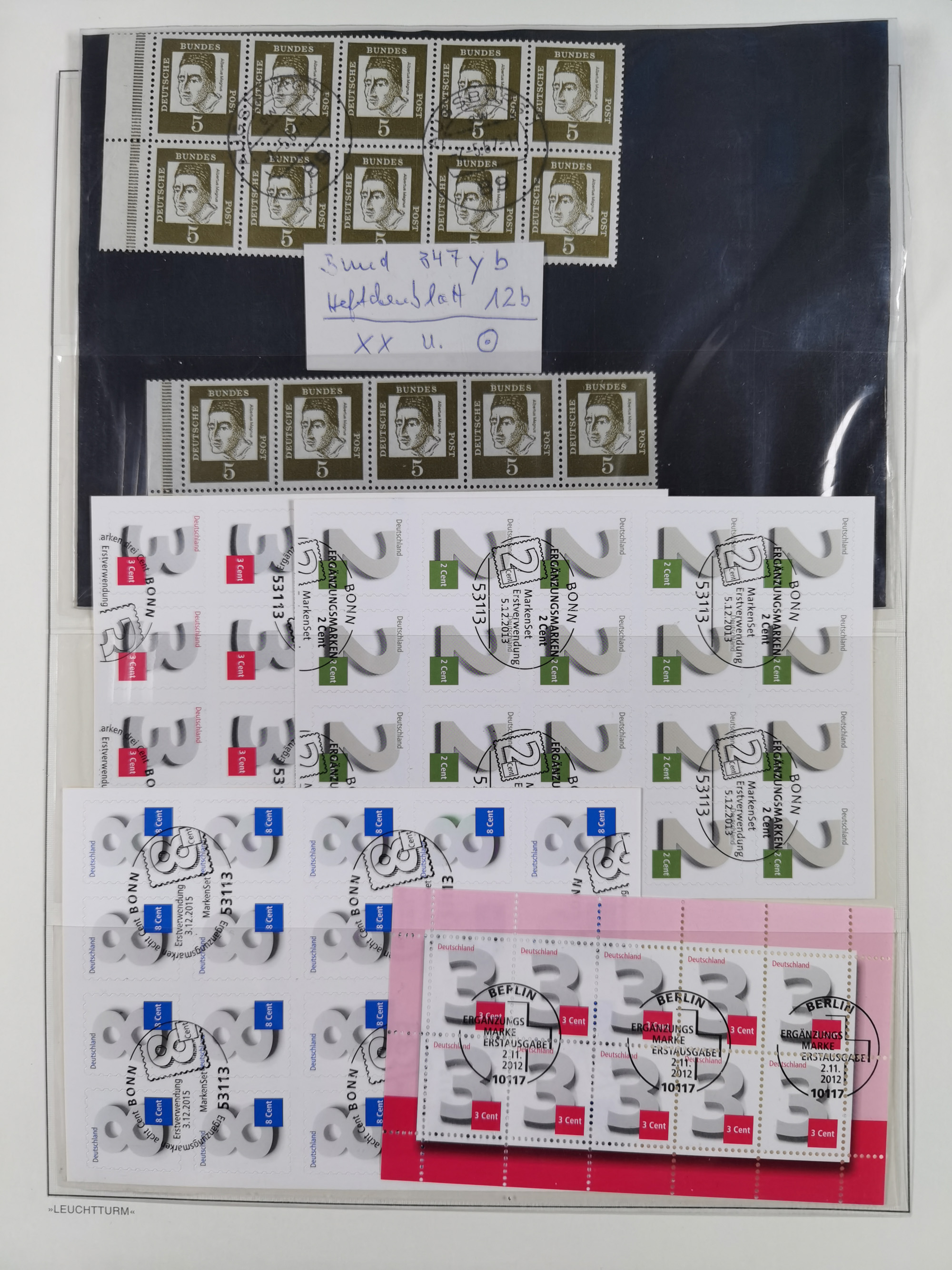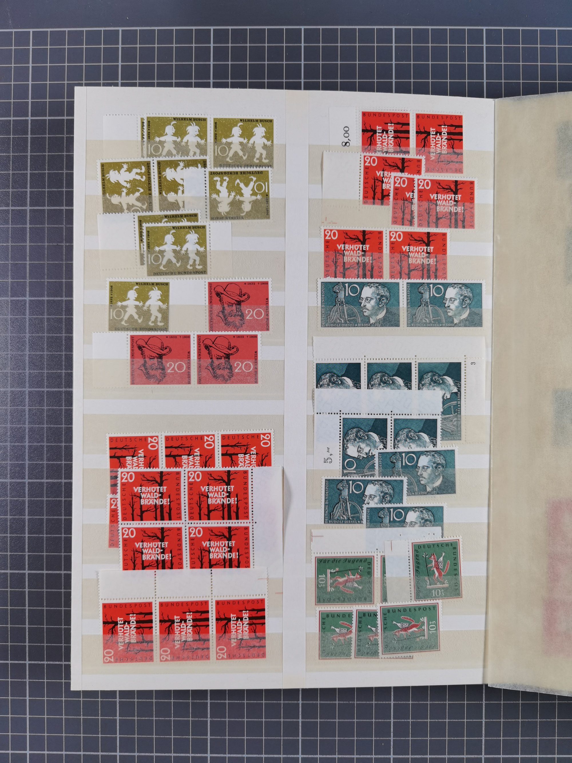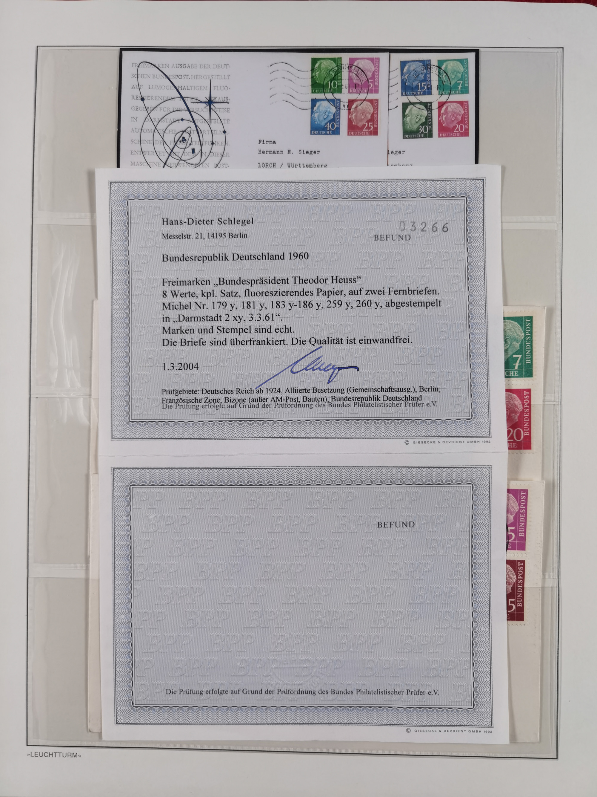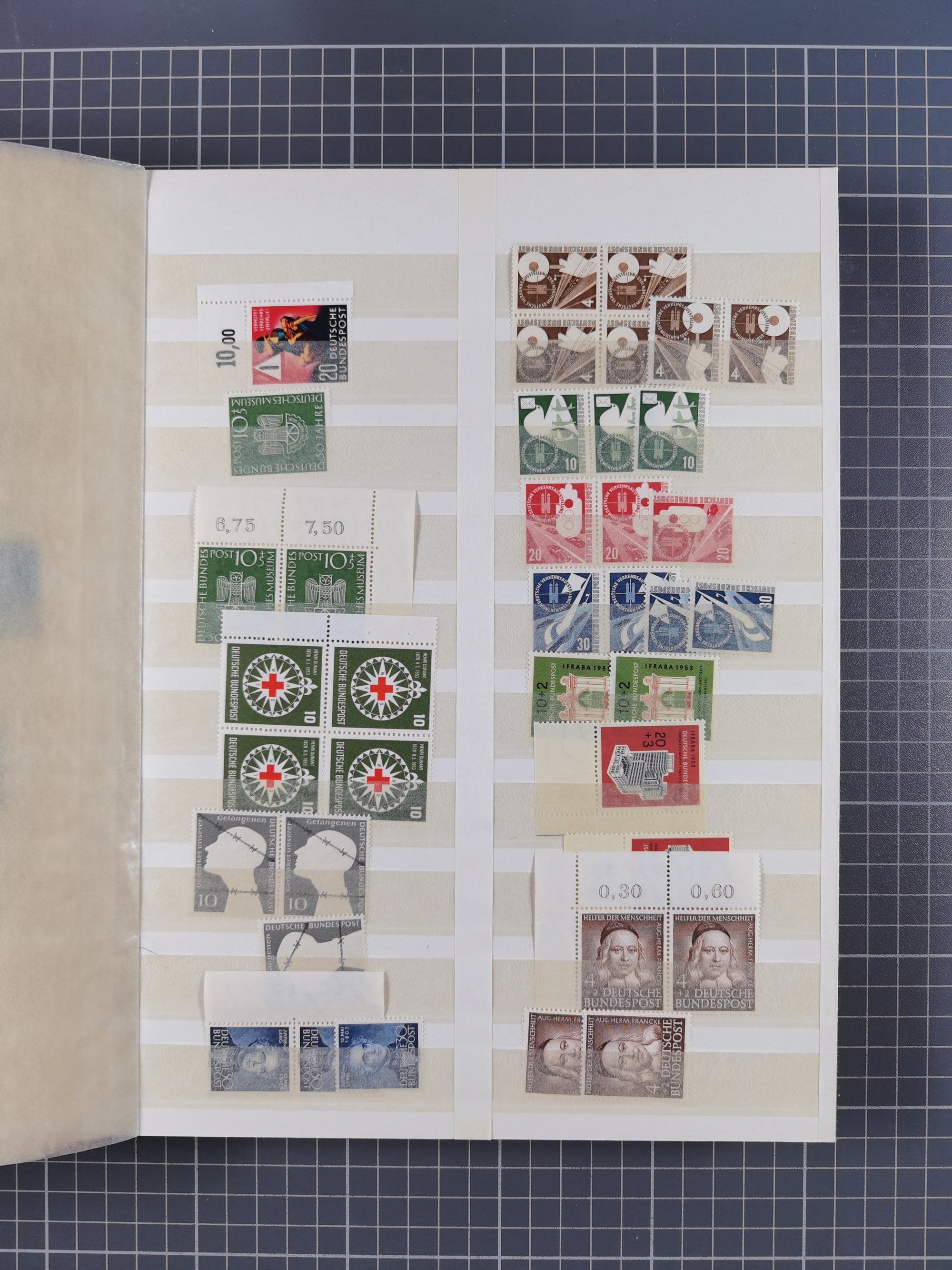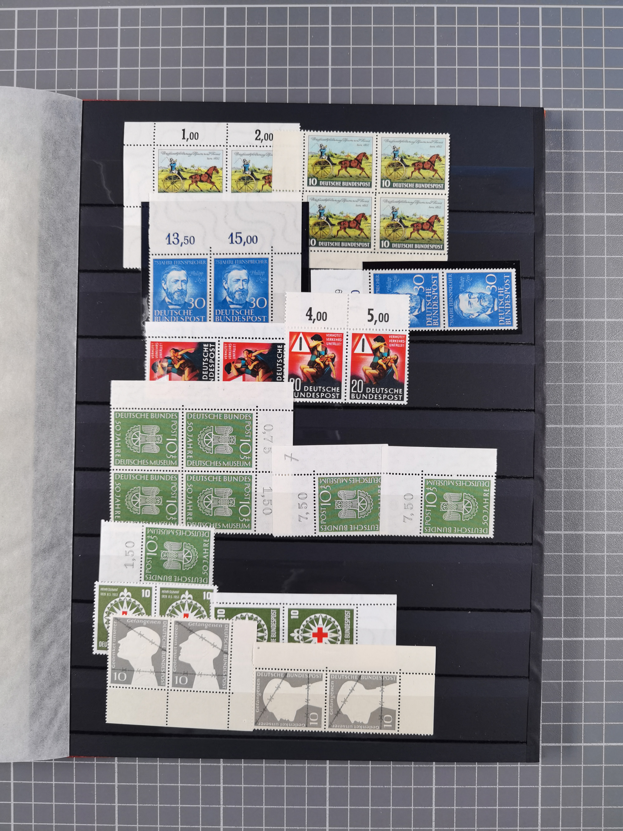 1951/2023, reichhaltiger postfrischer/ungebrauchter und gestempelter Sammlungsbestand mit Viererblocks, Bogenecken, Oberrandstücken, Fo.-Nr., Pl.-Nr., waagerechten Paaren ab Posthorn, dabei u.a. Posthorn in Viererblocks ohne 25, 70 und 80 Pfg. kpl., (90 Pfg. FA Schlegel BPP), sowie in waagerechten Paaren bis auf 80 Pfg. kpl., Mi.-Nr. 191 und 192 in 6er-Blocks, 259x 4er-Bl., 305 waagr. Paar, 306 Eckr.-4er-Bl., Heuss teils in 4er, 6er und 10er-Blocks, Heuss Lumogen Eckrand-4er-Blocksatz postfrisch, Bedeutende Deutsche ZD, etc. etc., sowie einige Briefe mit interessanten MeF, Einheiten und FDC, etliches mehrfach und teils auf Loskarten, vieles signiert sowie 4 Atteste und 58 (Kurz-)Befunde Schlegel BPP, gute Erhaltung, in zwei Kartons