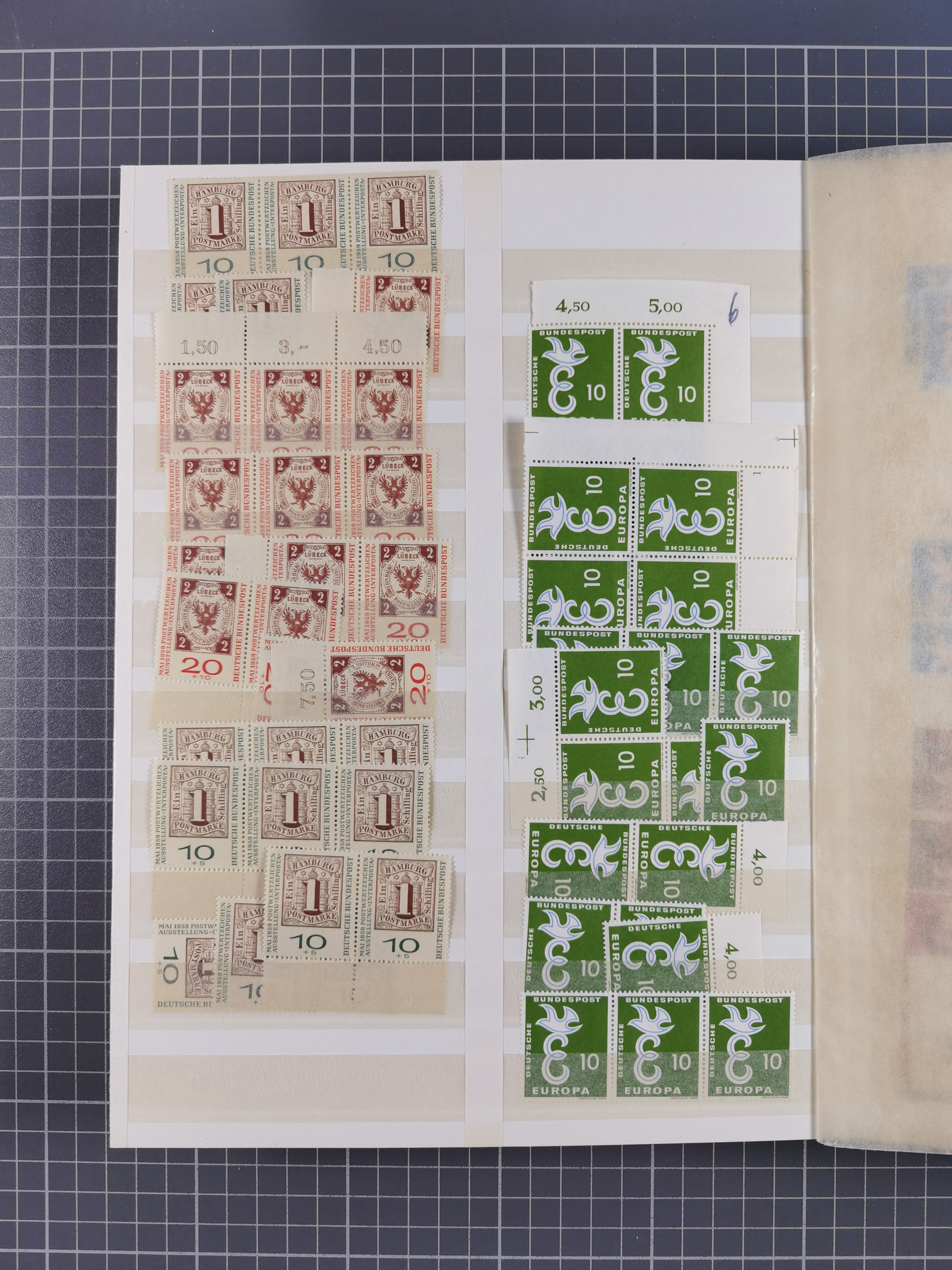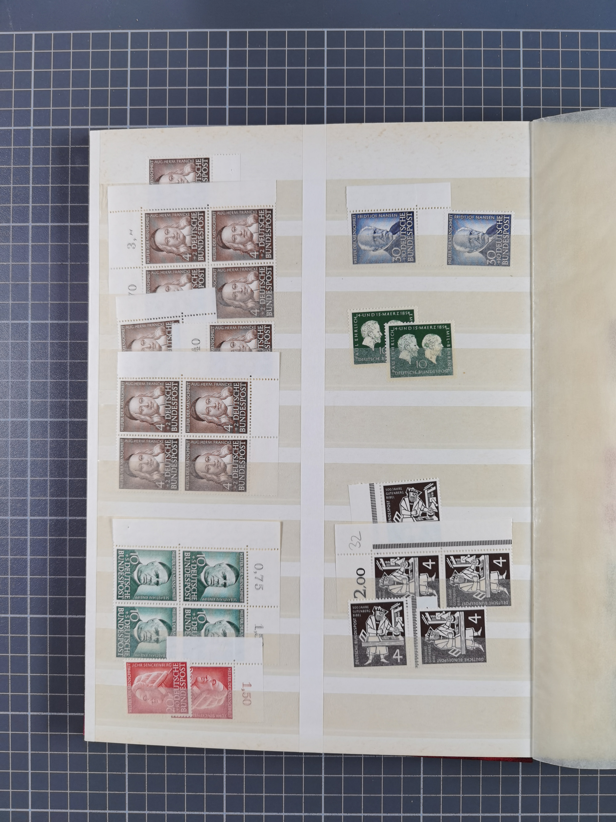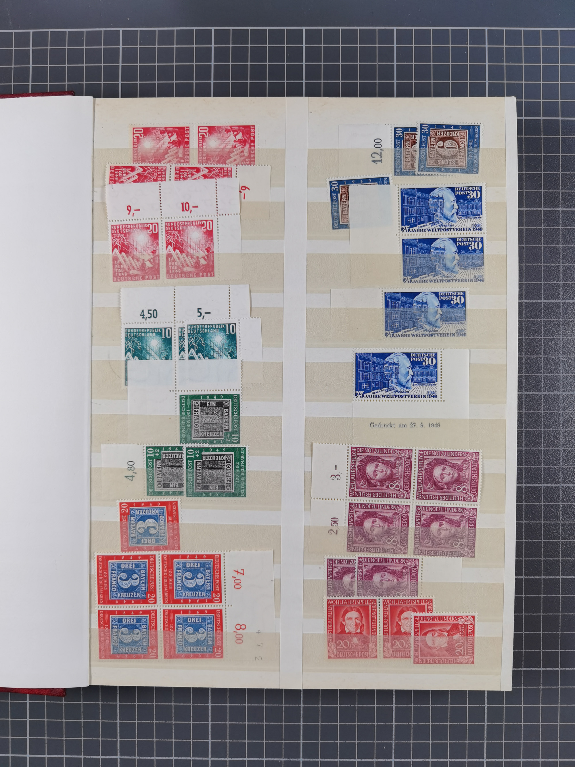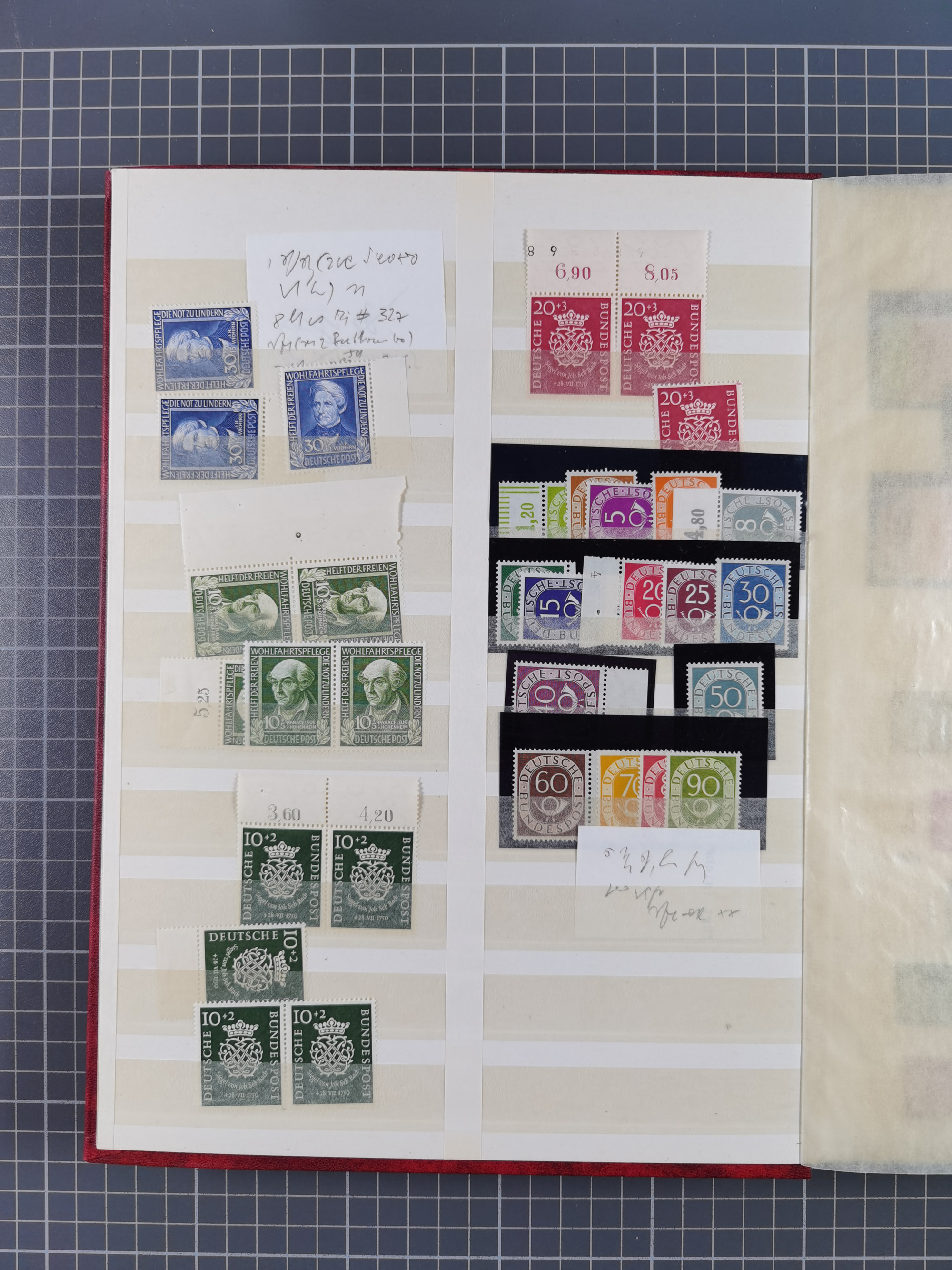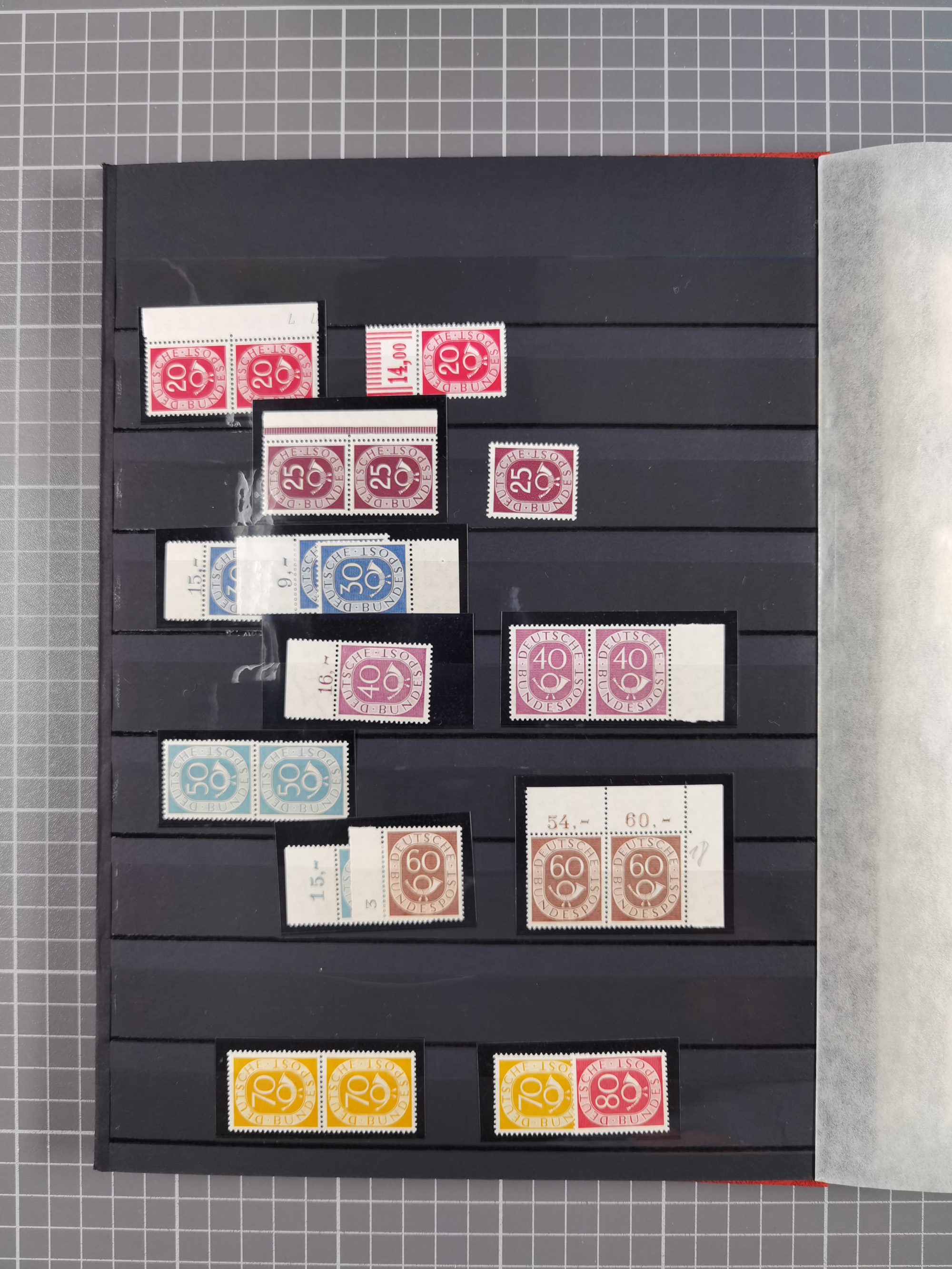 1948/65 (ca.), postfrische, wenig ungebrauchte und gestempelte reichhaltige Partie in vier Steckbüchern, dabei mehrere Posthorn-Sätze, Rotaufdruck im Eckrand-Viererblocksatz, Währungsgeschädigten-Block (5) etc, etc.