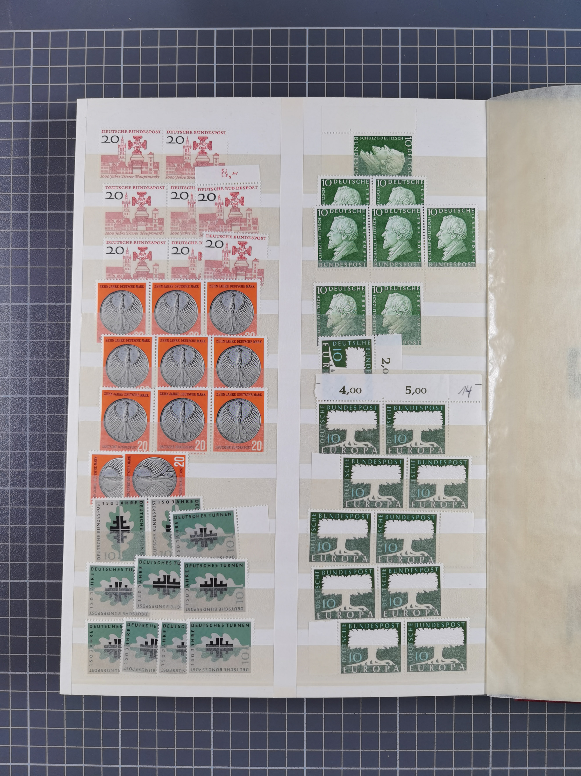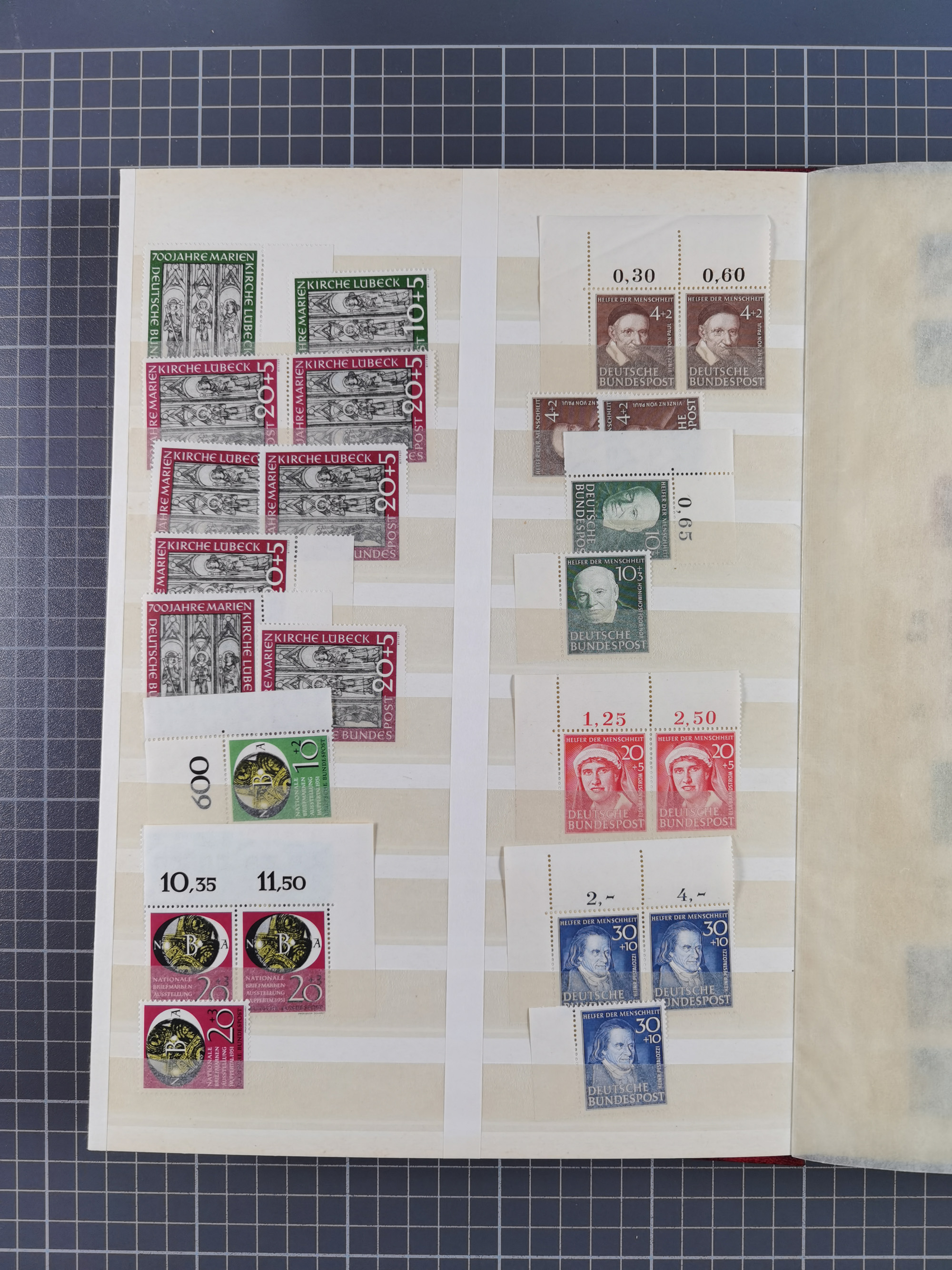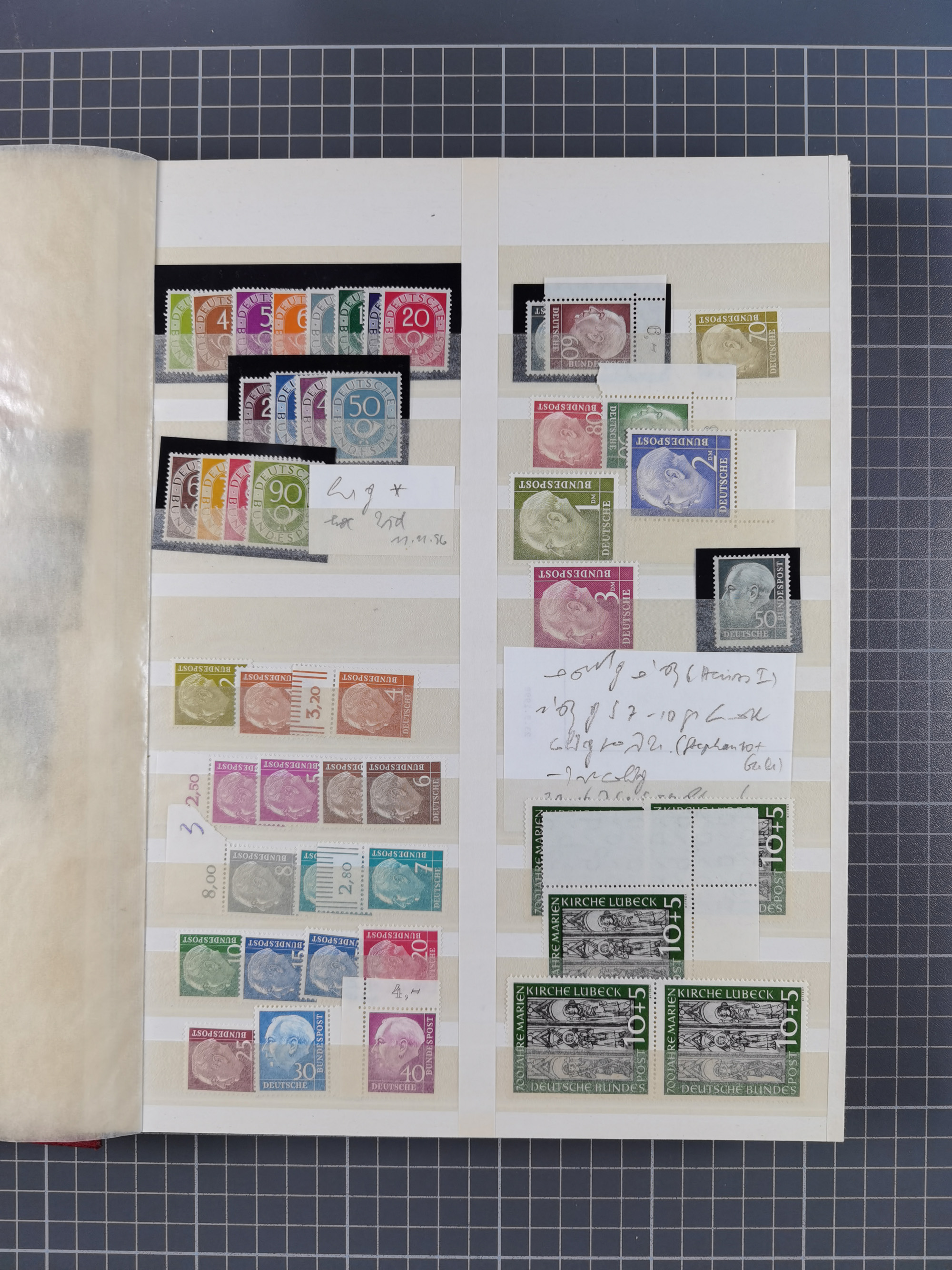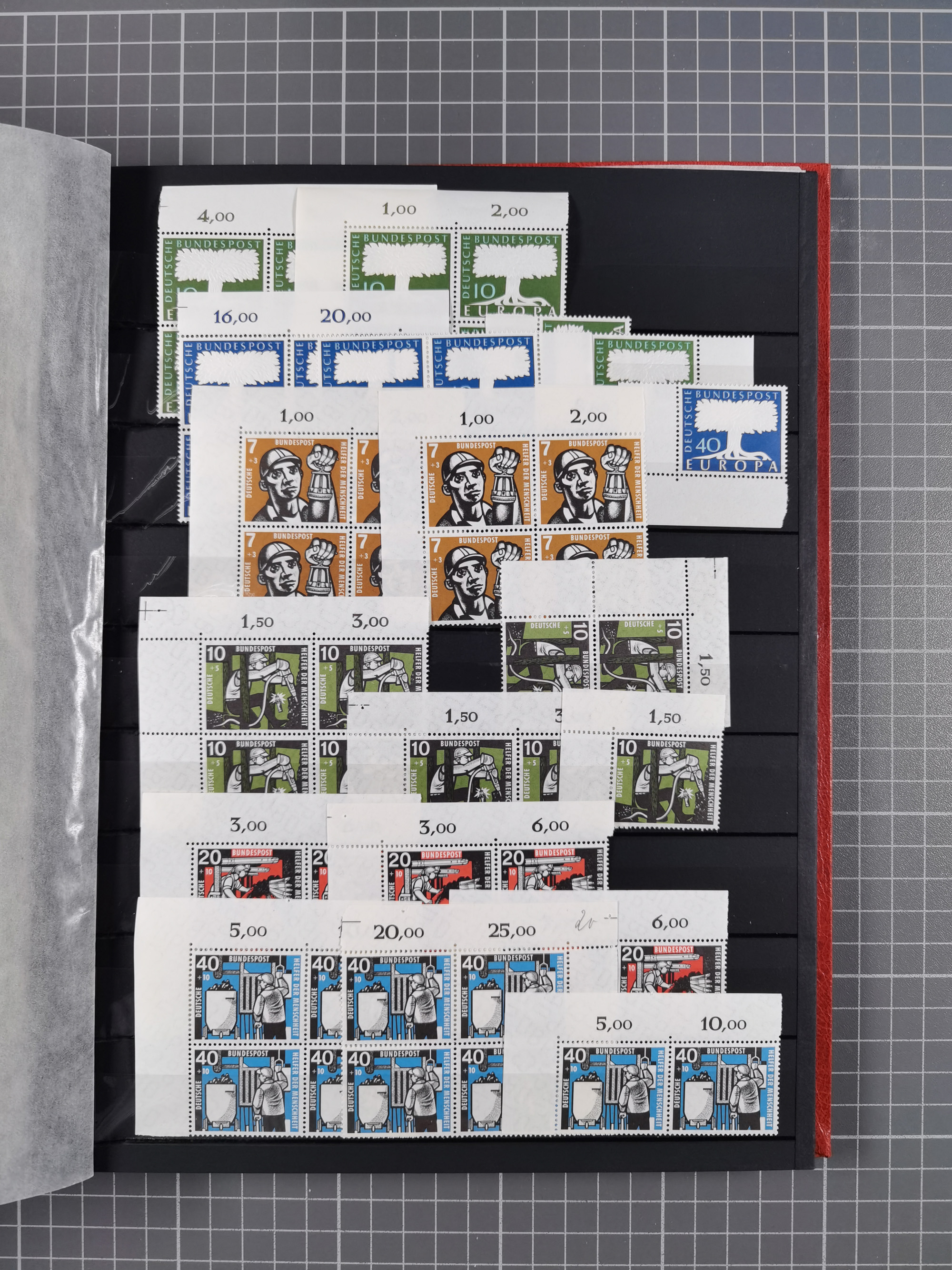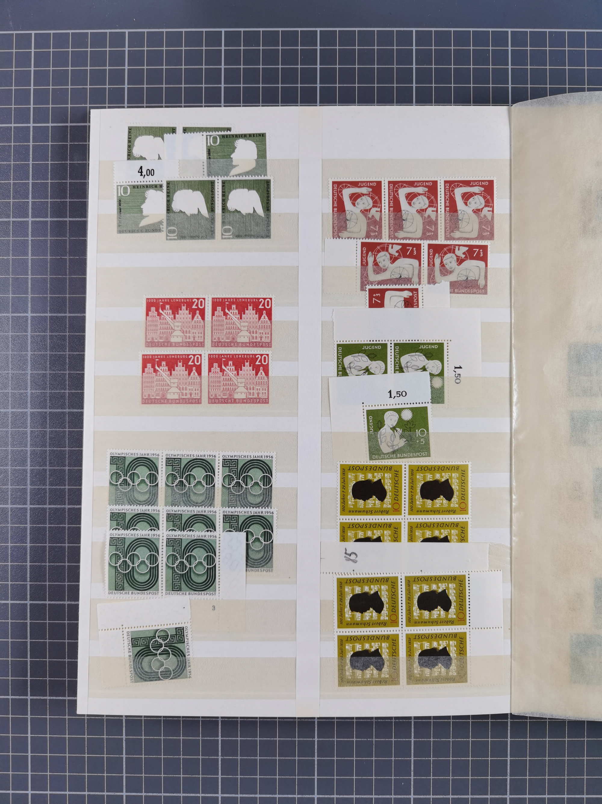 1948/65 (ca.), postfrische, wenig ungebrauchte und gestempelte reichhaltige Partie in vier Steckbüchern, dabei mehrere Posthorn-Sätze, Rotaufdruck im Eckrand-Viererblocksatz, Währungsgeschädigten-Block (5) etc, etc.