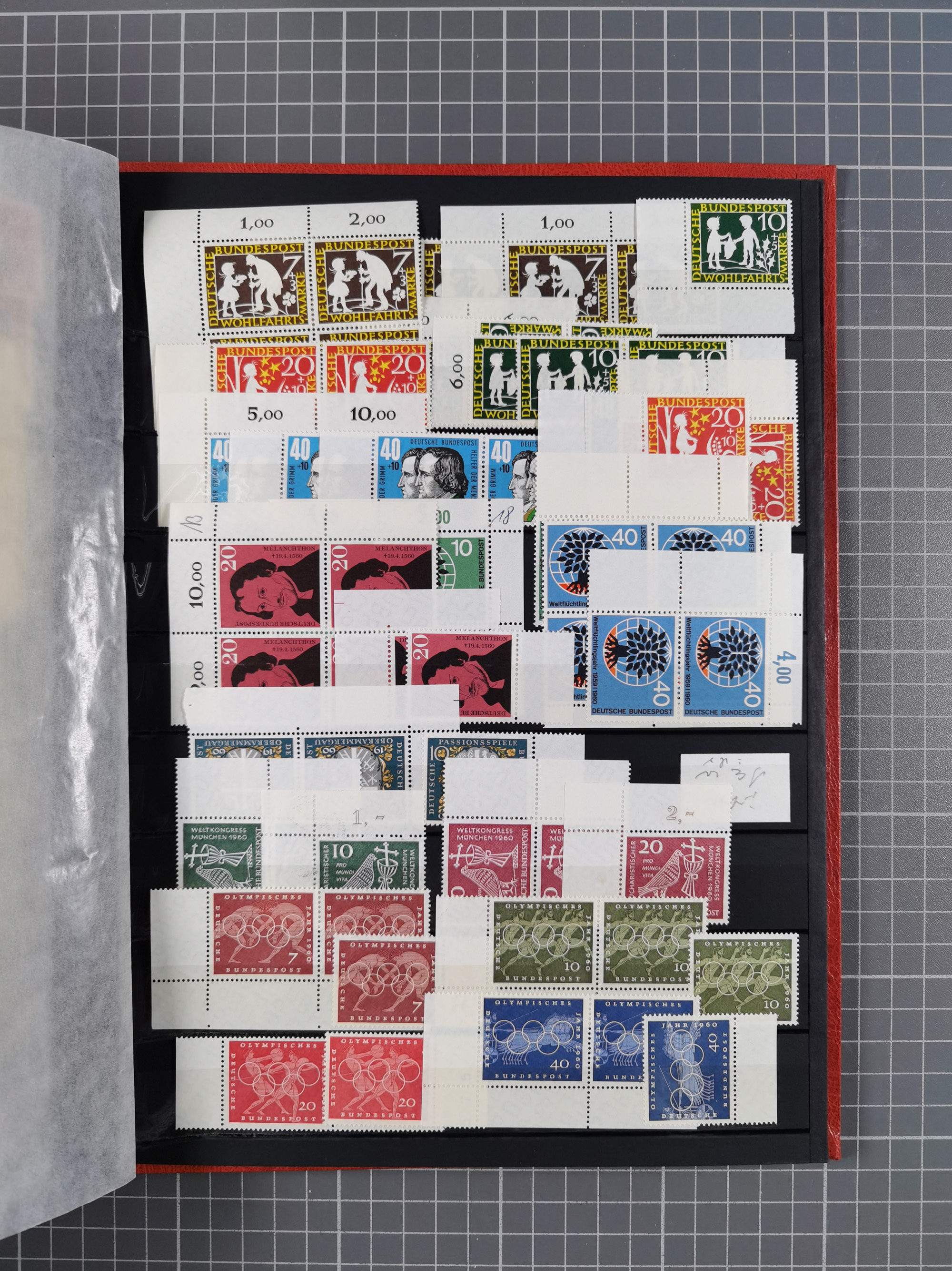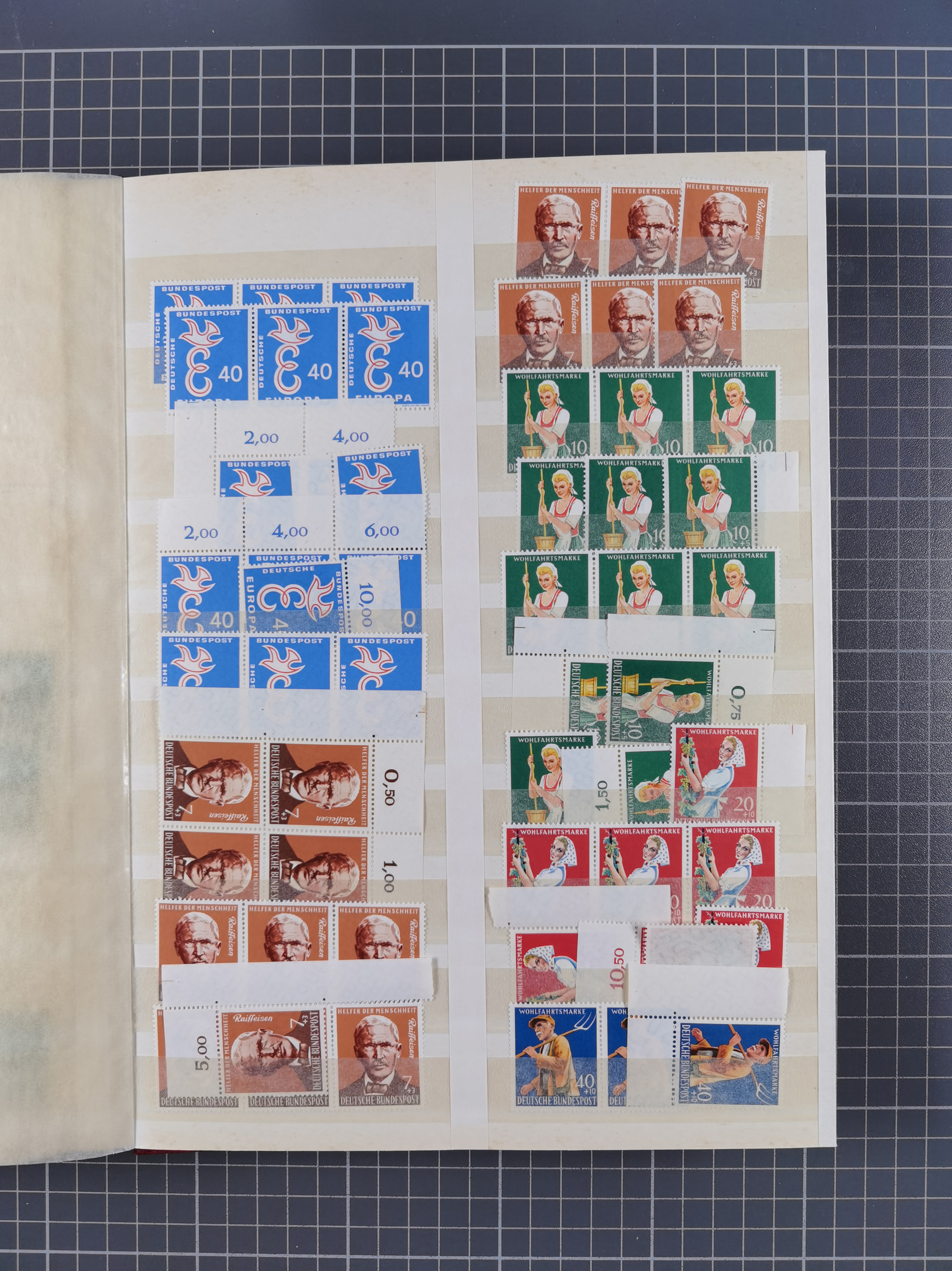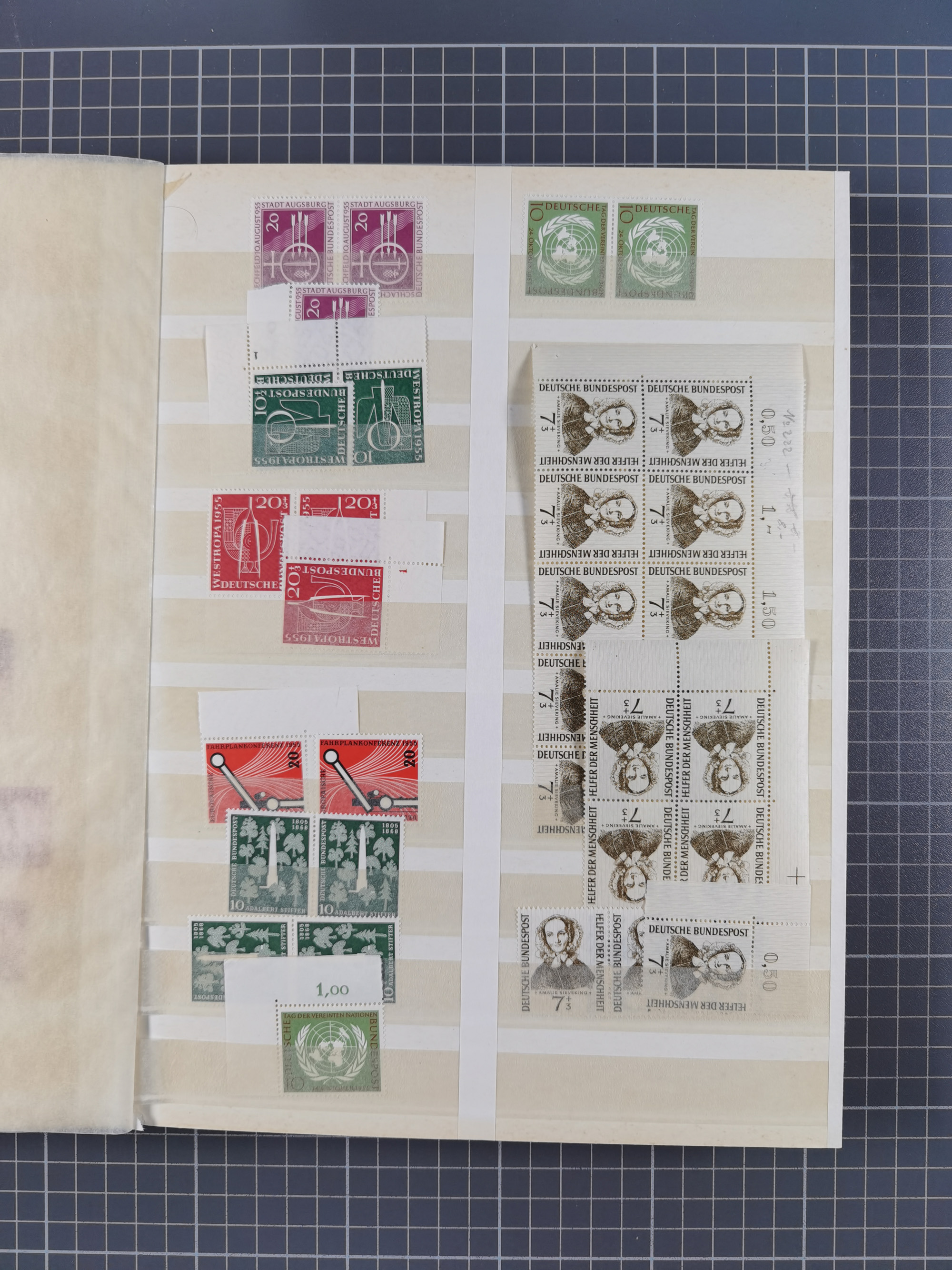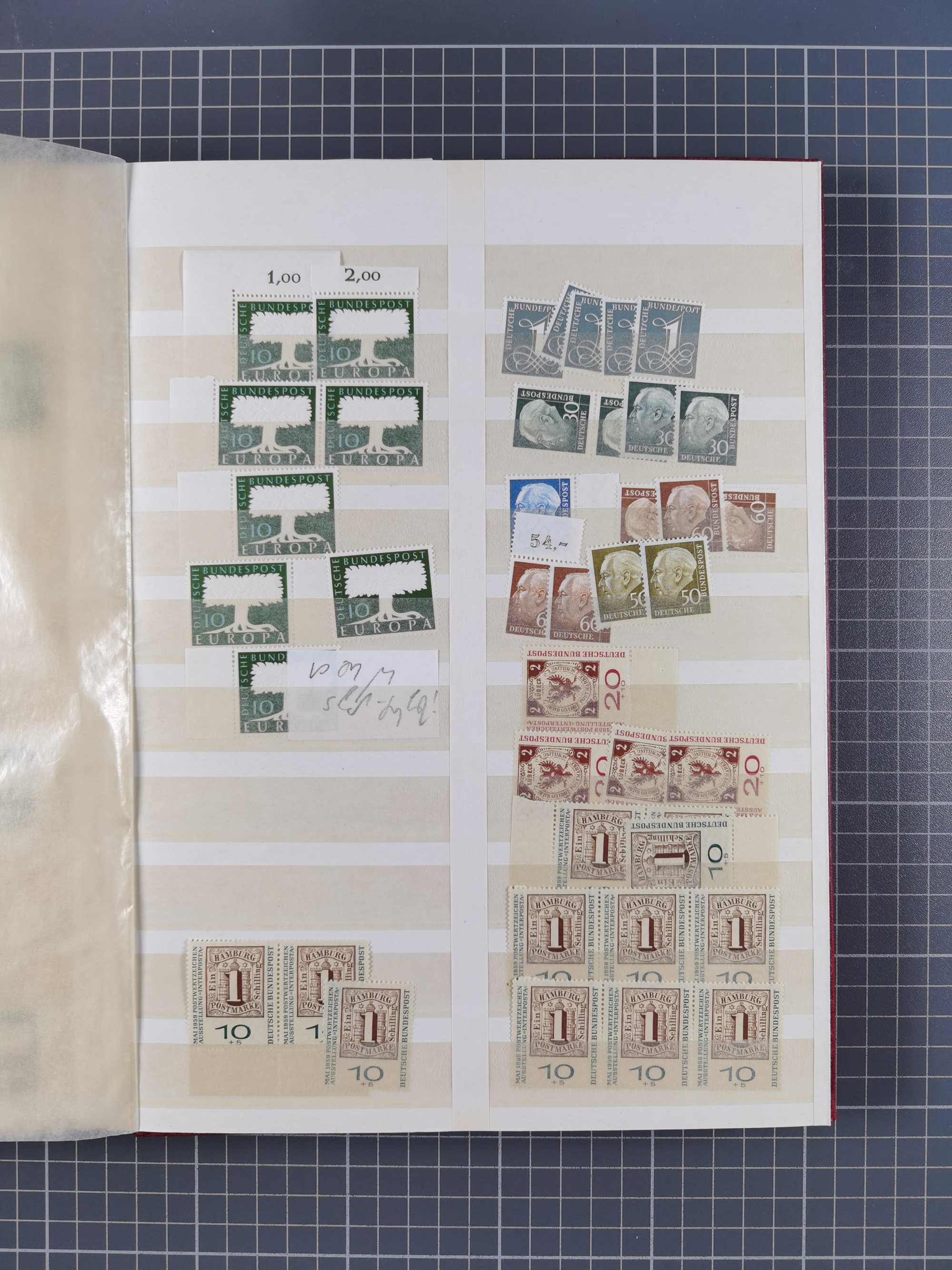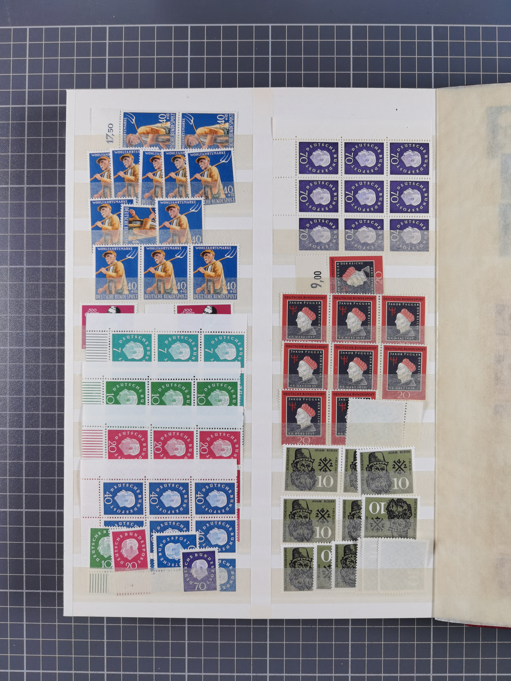 1948/65 (ca.), postfrische, wenig ungebrauchte und gestempelte reichhaltige Partie in vier Steckbüchern, dabei mehrere Posthorn-Sätze, Rotaufdruck im Eckrand-Viererblocksatz, Währungsgeschädigten-Block (5) etc, etc.