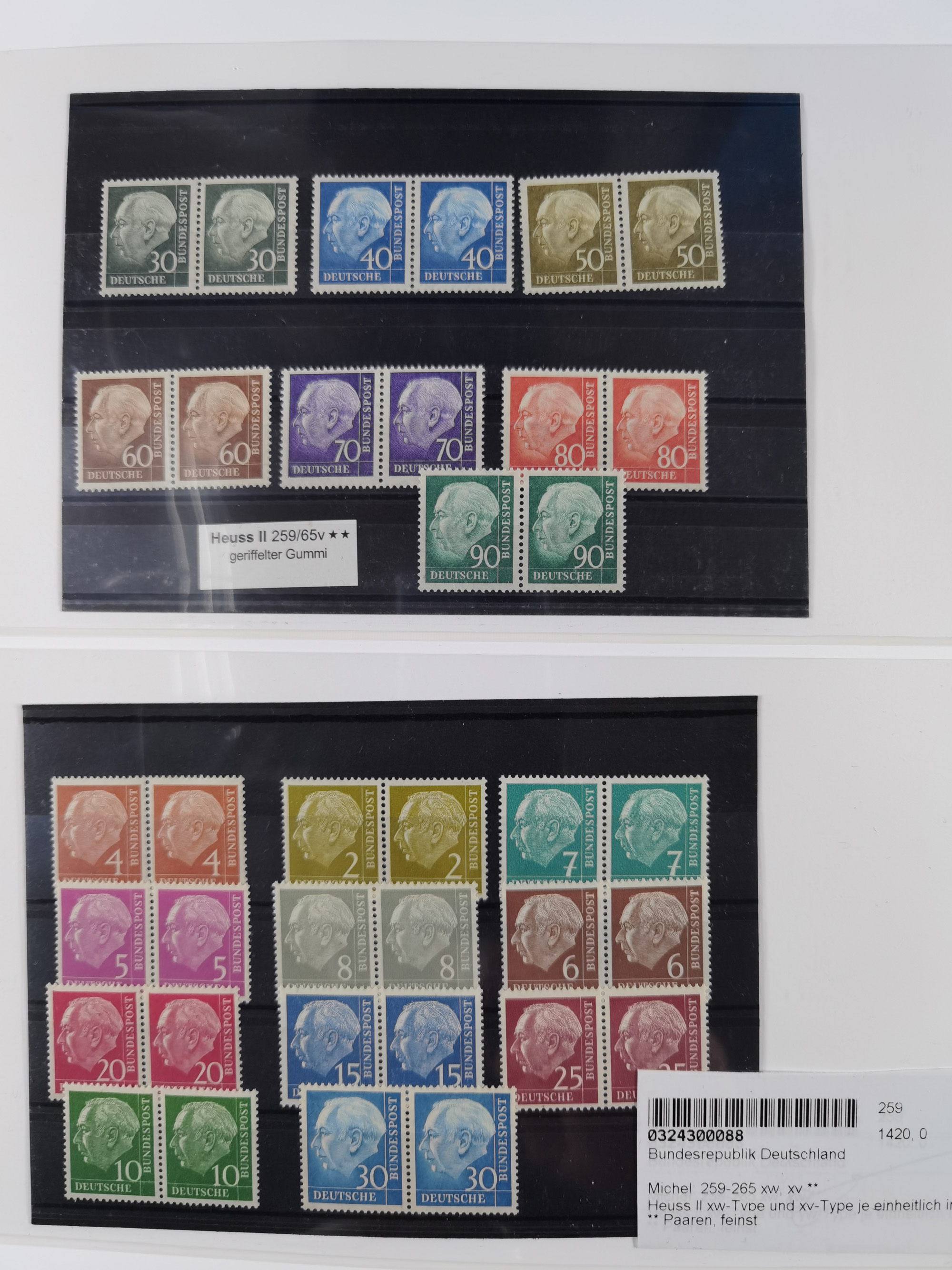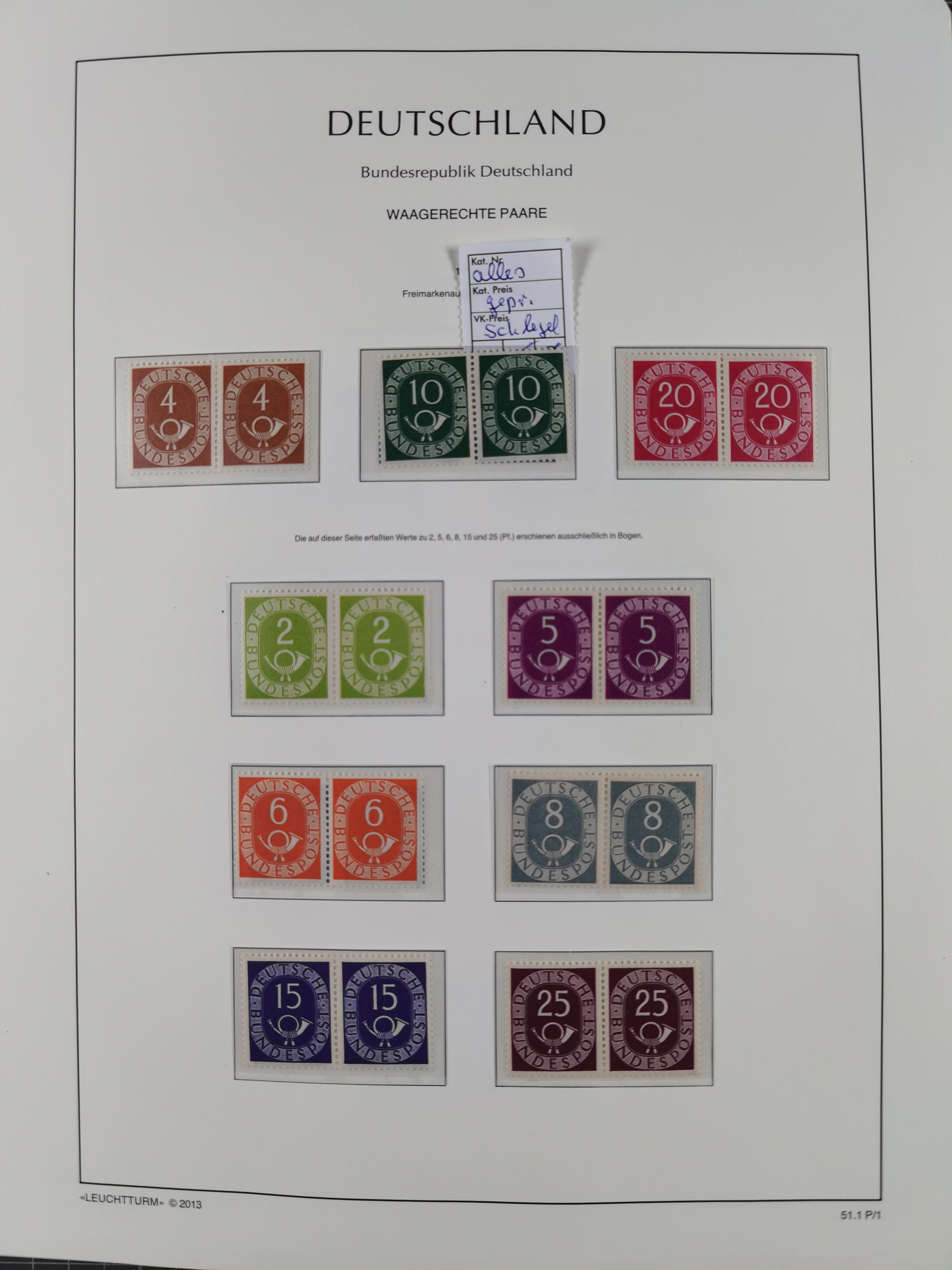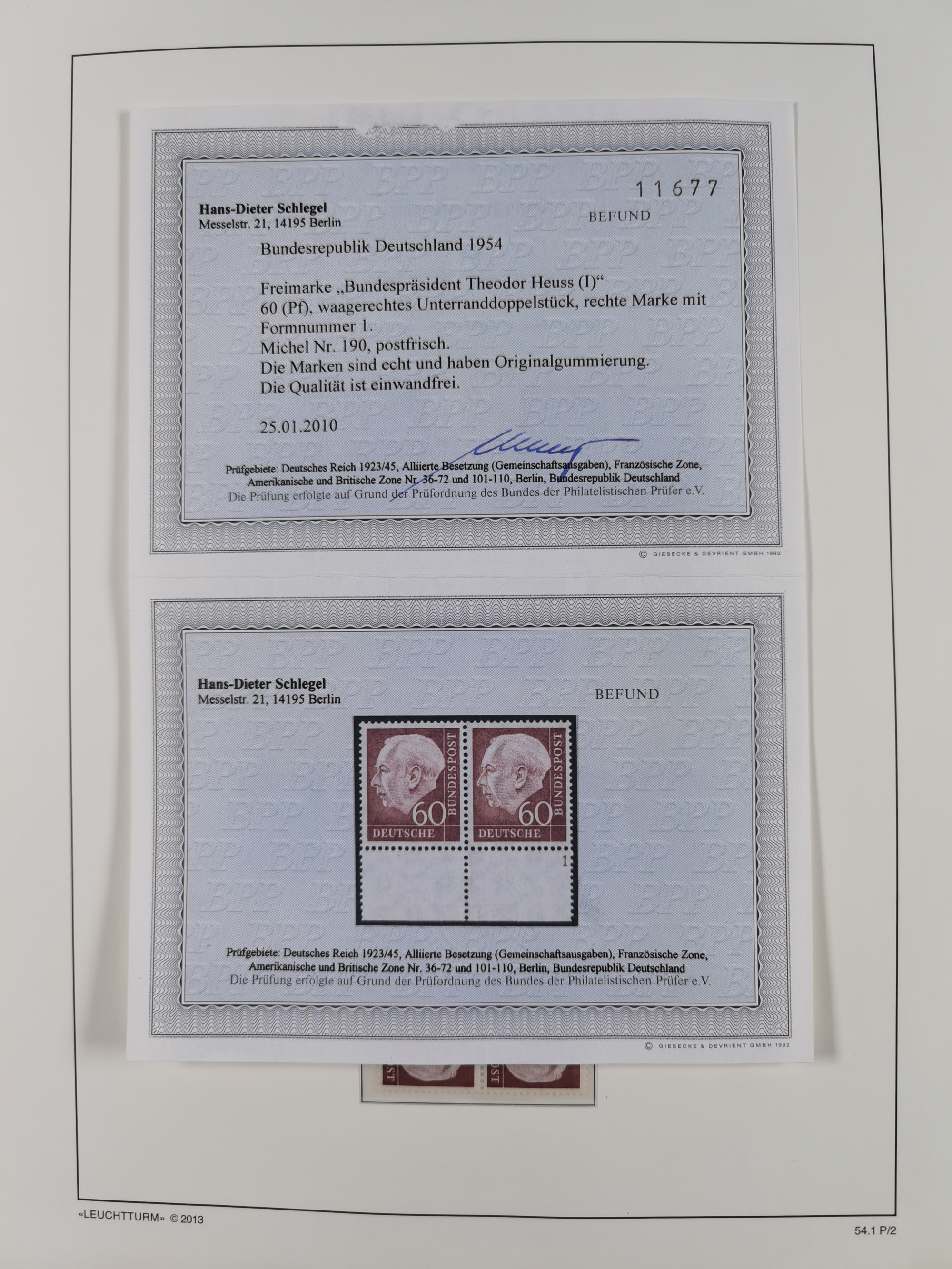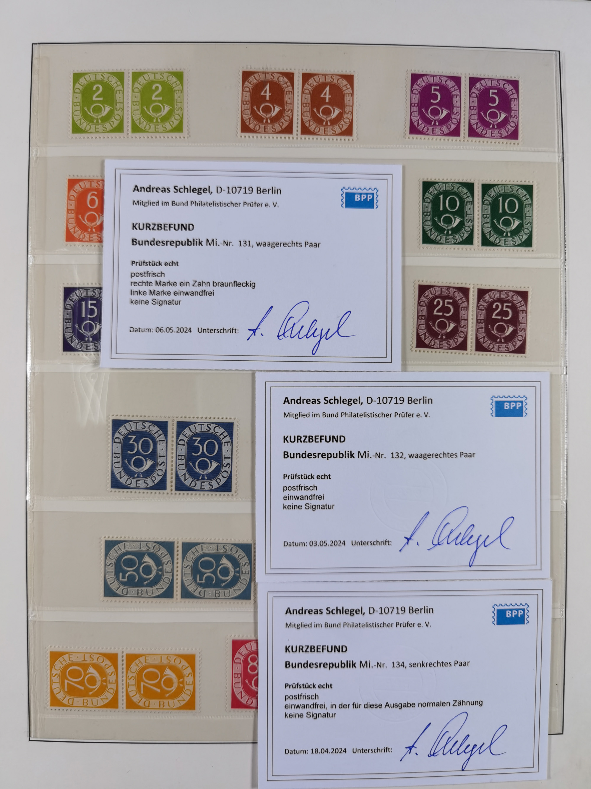 1951/2020, je postfrische und gestempelte Sammlung “waagerechte Paare”, dabei u.a. Posthornsatz postfrisch (20 Pfg. kleine gummimatte Stelle) bestens sign. Schlegel BPP, sowie Heuss I in Paaren (60 Pfg. Unterrandstück mit Fo.-Nr. “1” und FB H.-D. Schlegel BPP), Heuss II und III, über bedeutende Deutsche bis Blumen, sowie gestempelt Posthorn und Heuss I, II und III in waagerechten Paaren, Heuss Lumogen in Unterrandpaaren sauber gestempelt (FA H.-D. Schlegel BPP) und bedeutende Deutsche bis Blumen, ferner Heftchenblätter und Markenheftchen, einiges signiert, im Vordruckalbum