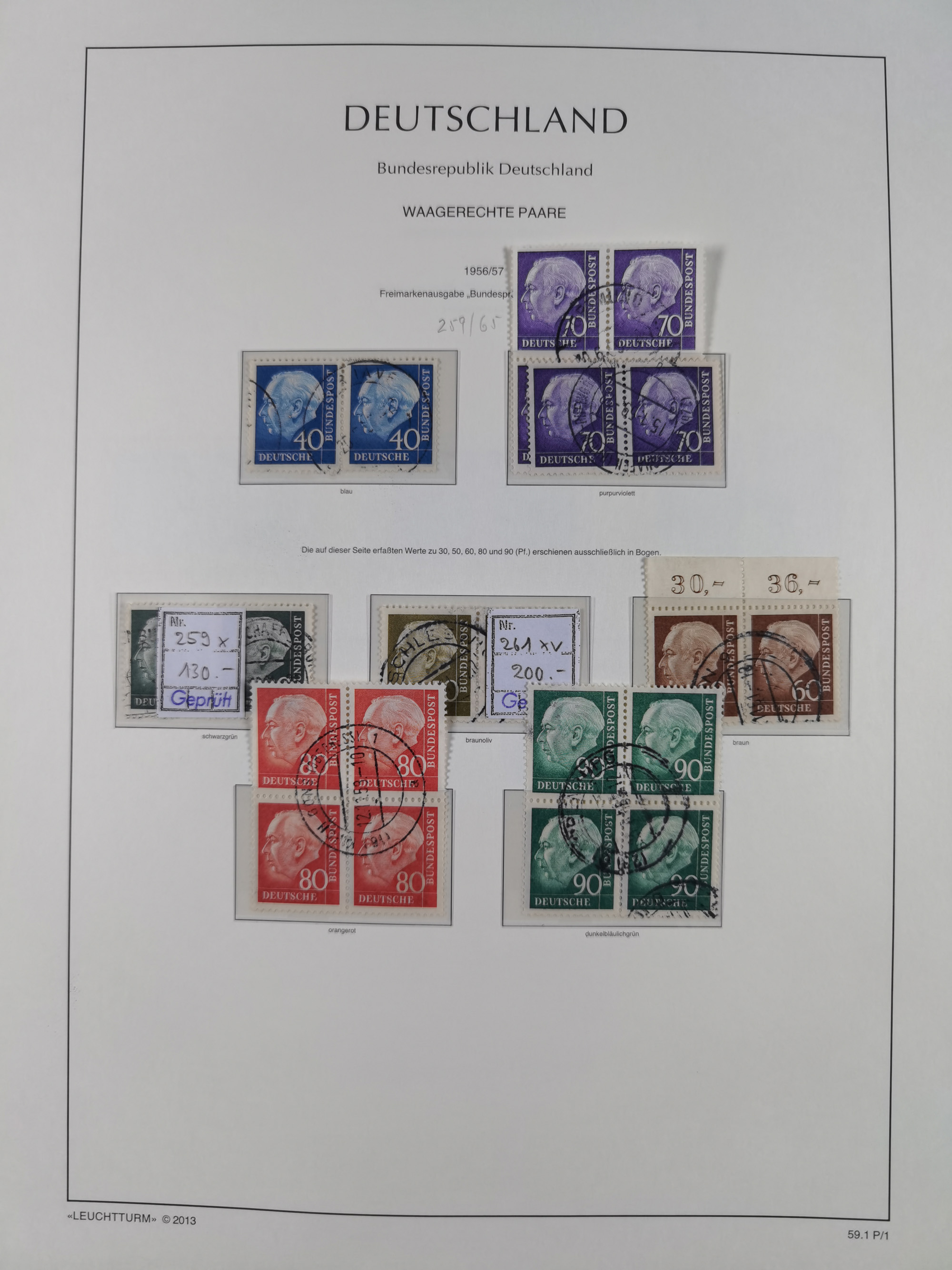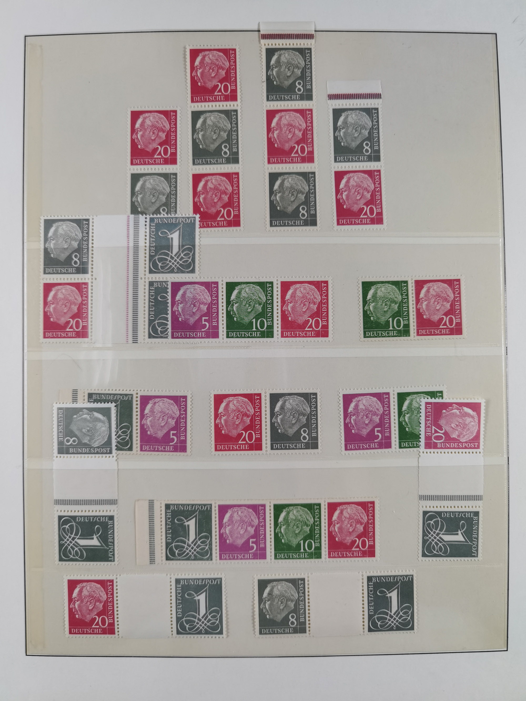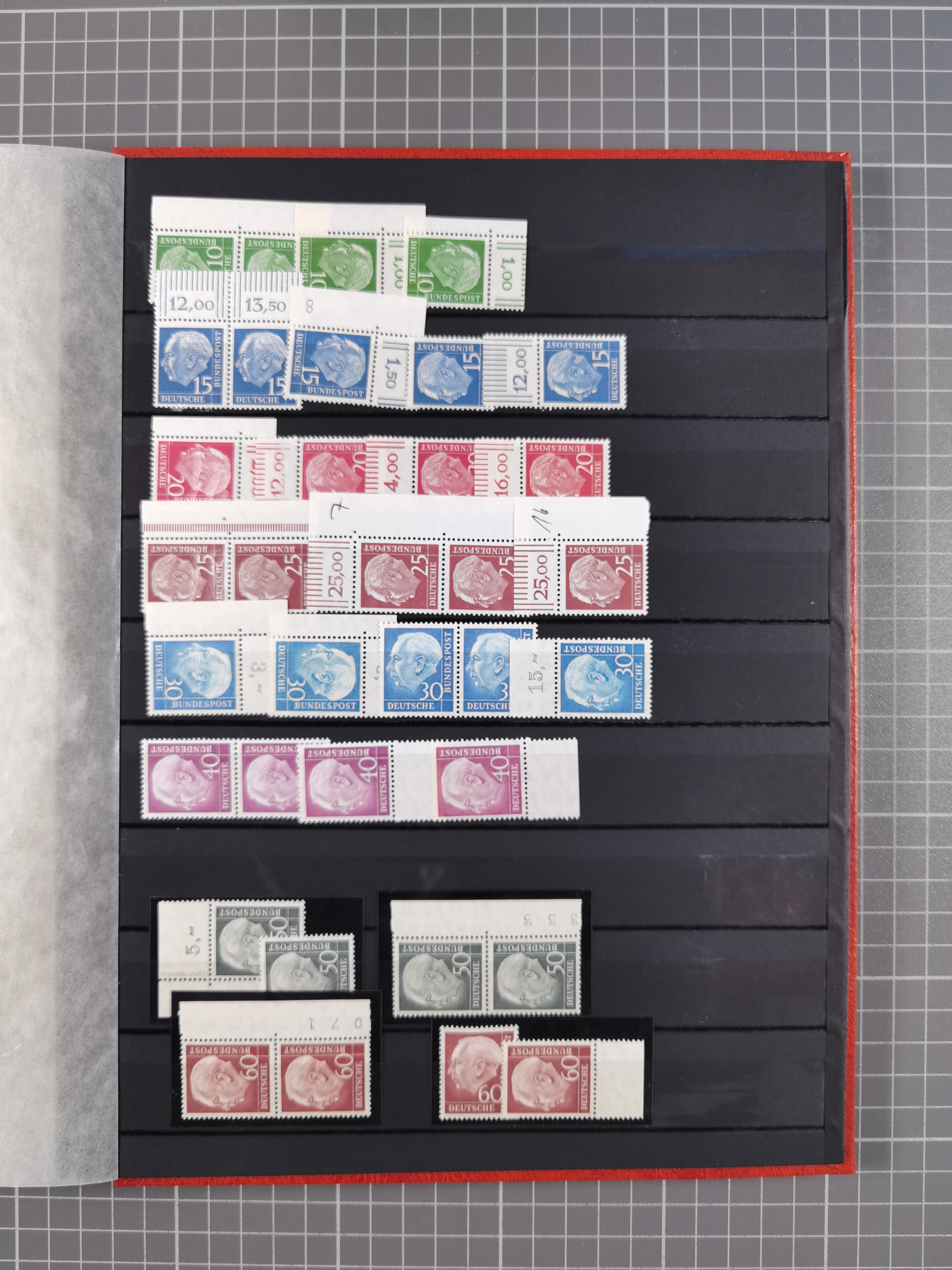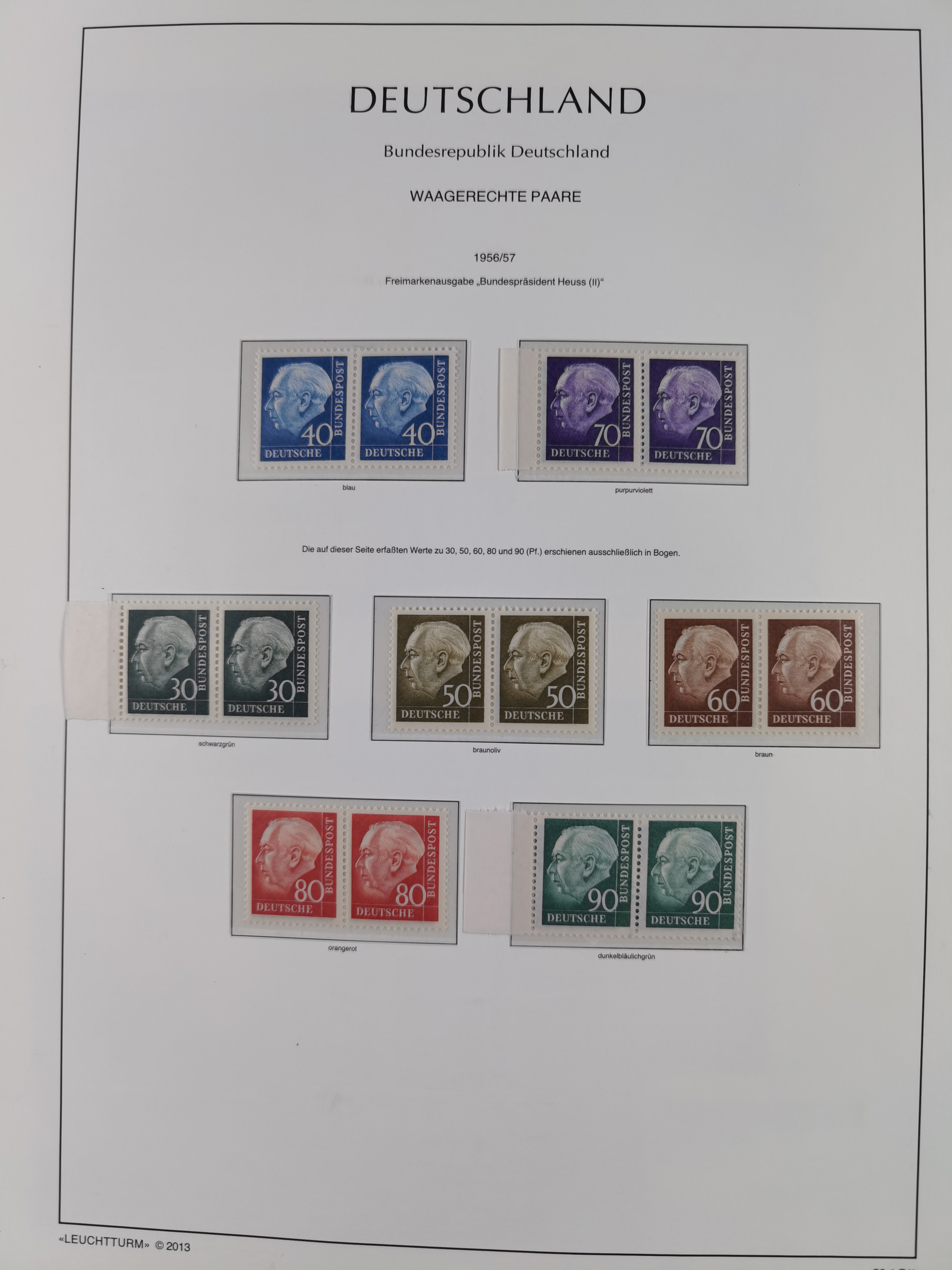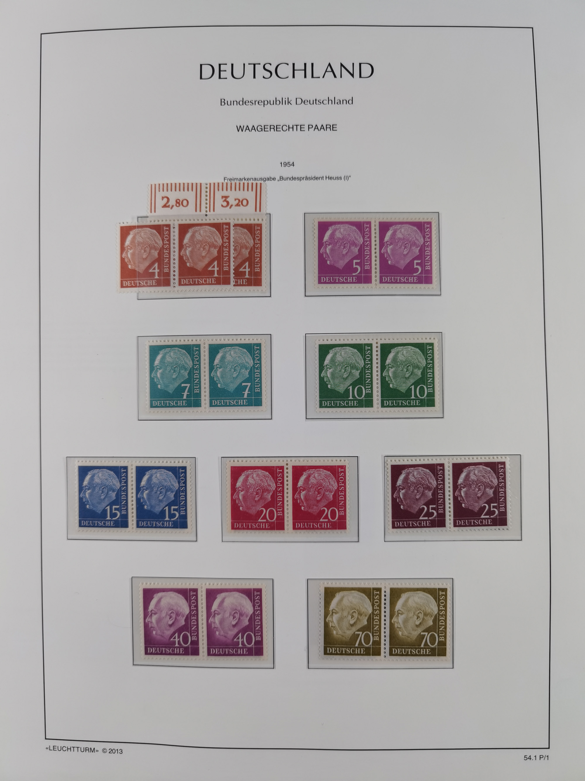 1951/2020, je postfrische und gestempelte Sammlung “waagerechte Paare”, dabei u.a. Posthornsatz postfrisch (20 Pfg. kleine gummimatte Stelle) bestens sign. Schlegel BPP, sowie Heuss I in Paaren (60 Pfg. Unterrandstück mit Fo.-Nr. “1” und FB H.-D. Schlegel BPP), Heuss II und III, über bedeutende Deutsche bis Blumen, sowie gestempelt Posthorn und Heuss I, II und III in waagerechten Paaren, Heuss Lumogen in Unterrandpaaren sauber gestempelt (FA H.-D. Schlegel BPP) und bedeutende Deutsche bis Blumen, ferner Heftchenblätter und Markenheftchen, einiges signiert, im Vordruckalbum