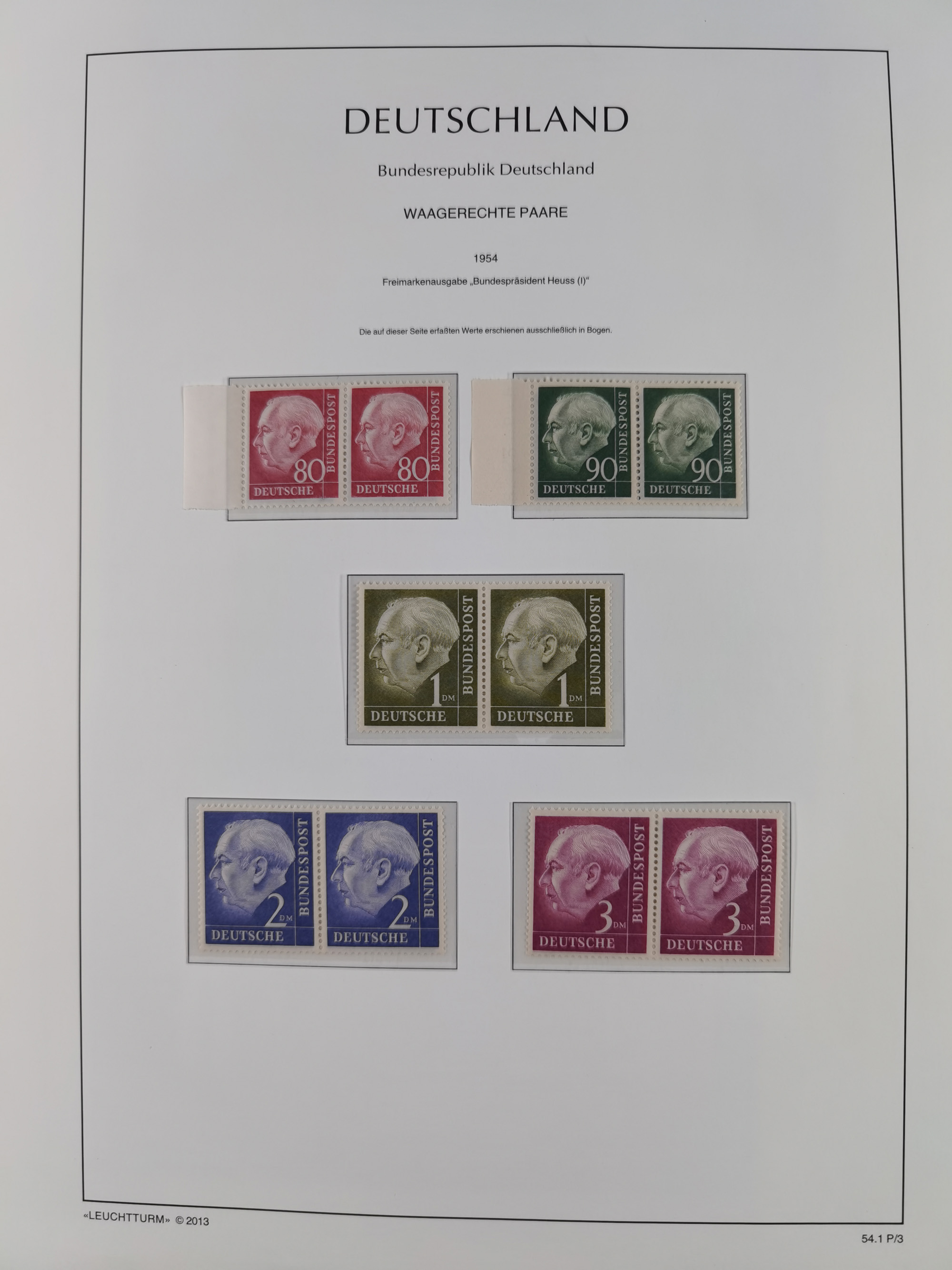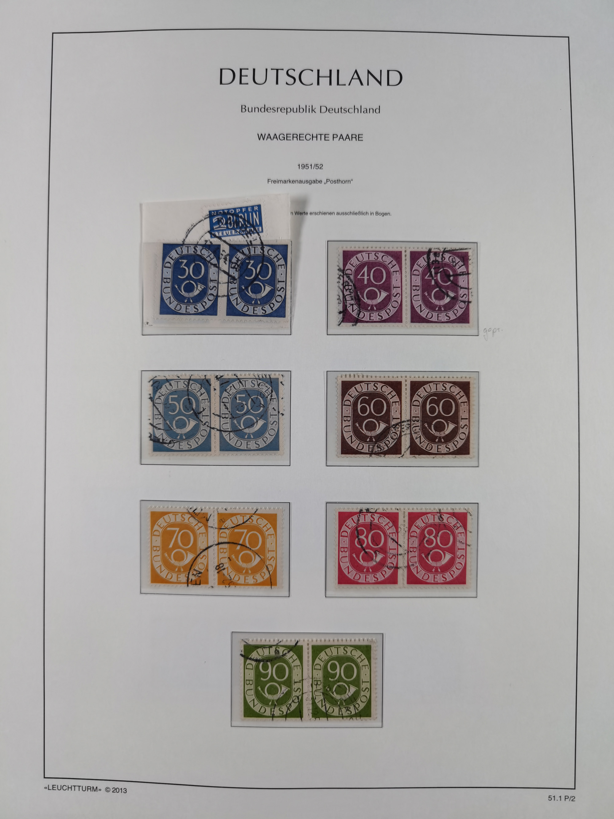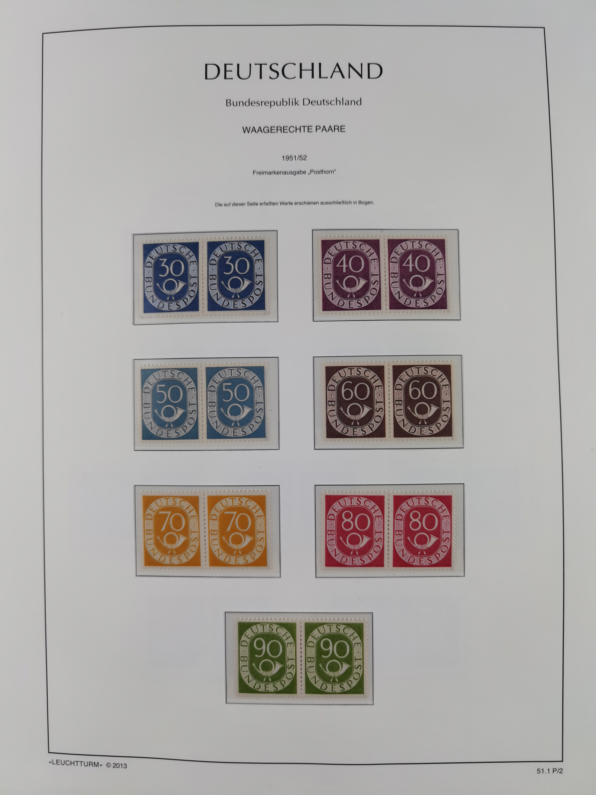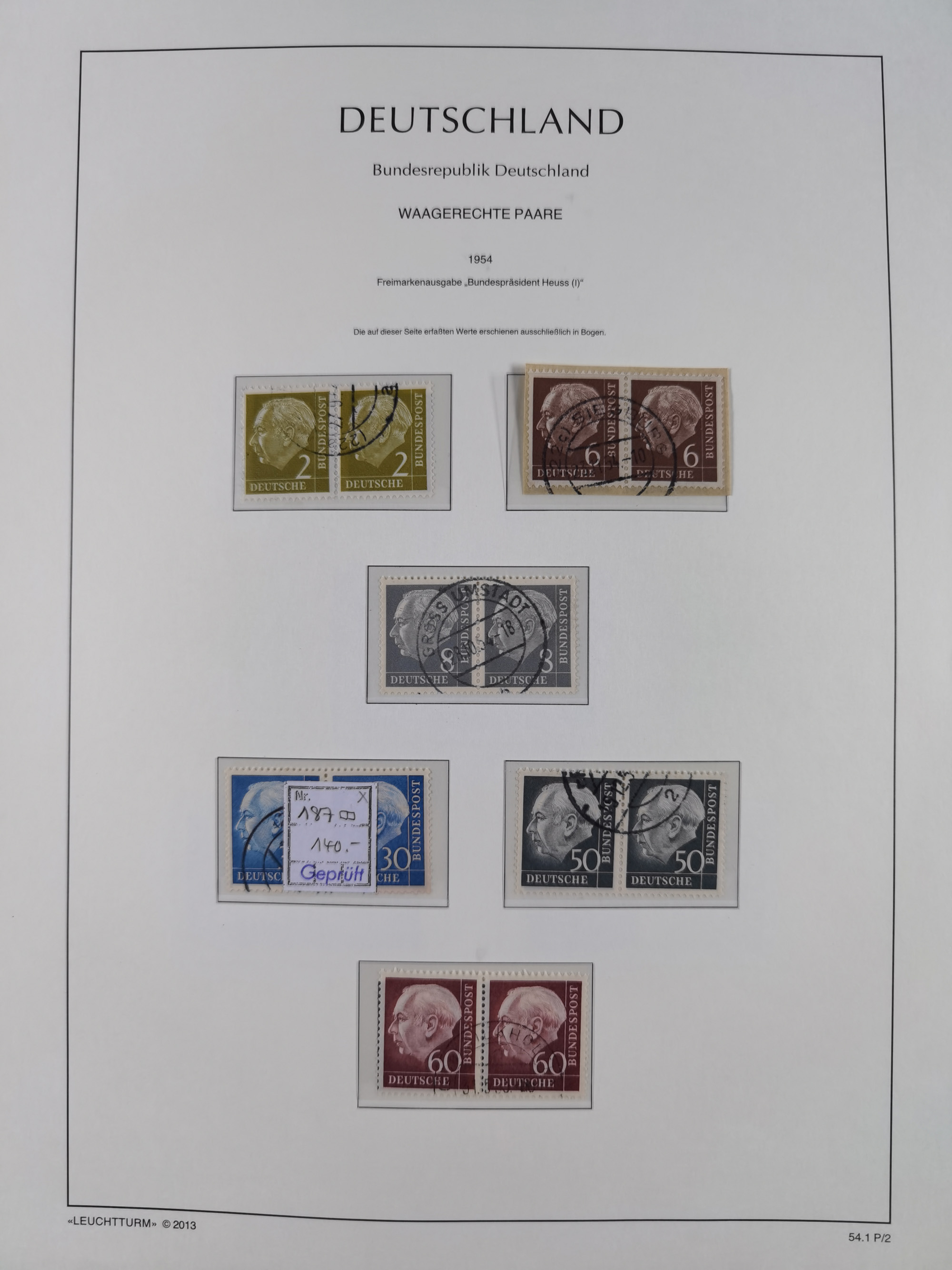 1951/2020, je postfrische und gestempelte Sammlung “waagerechte Paare”, dabei u.a. Posthornsatz postfrisch (20 Pfg. kleine gummimatte Stelle) bestens sign. Schlegel BPP, sowie Heuss I in Paaren (60 Pfg. Unterrandstück mit Fo.-Nr. “1” und FB H.-D. Schlegel BPP), Heuss II und III, über bedeutende Deutsche bis Blumen, sowie gestempelt Posthorn und Heuss I, II und III in waagerechten Paaren, Heuss Lumogen in Unterrandpaaren sauber gestempelt (FA H.-D. Schlegel BPP) und bedeutende Deutsche bis Blumen, ferner Heftchenblätter und Markenheftchen, einiges signiert, im Vordruckalbum