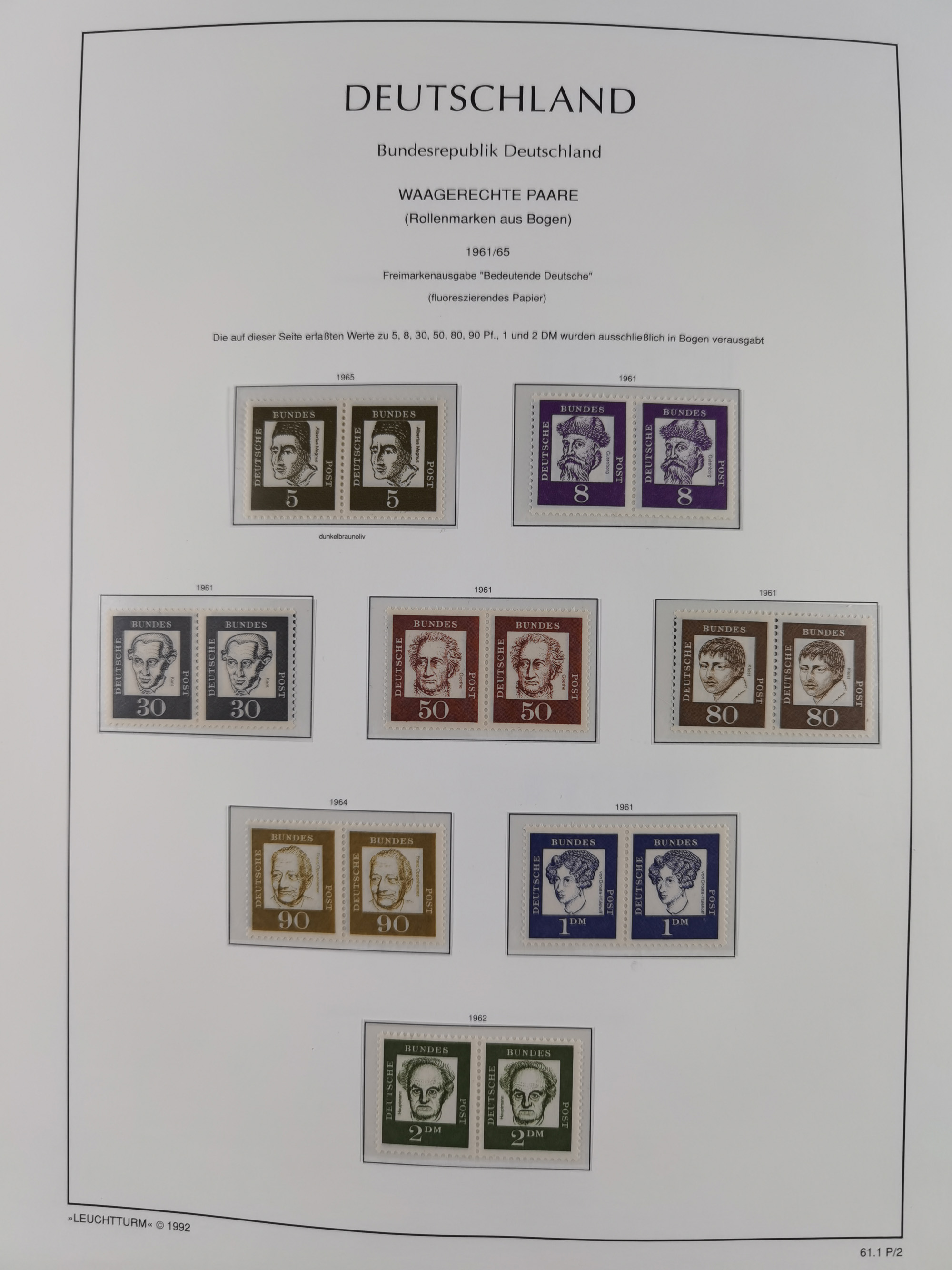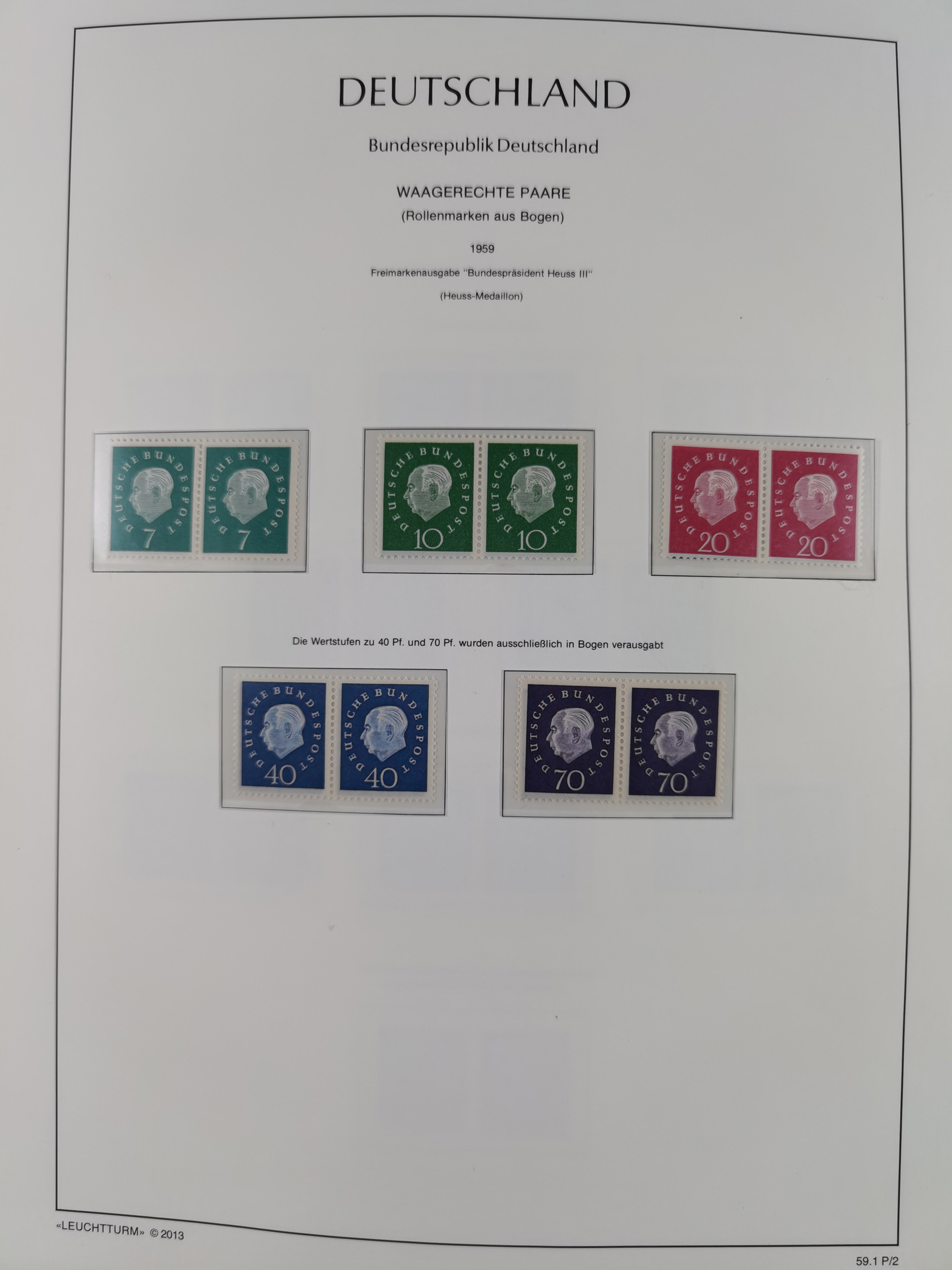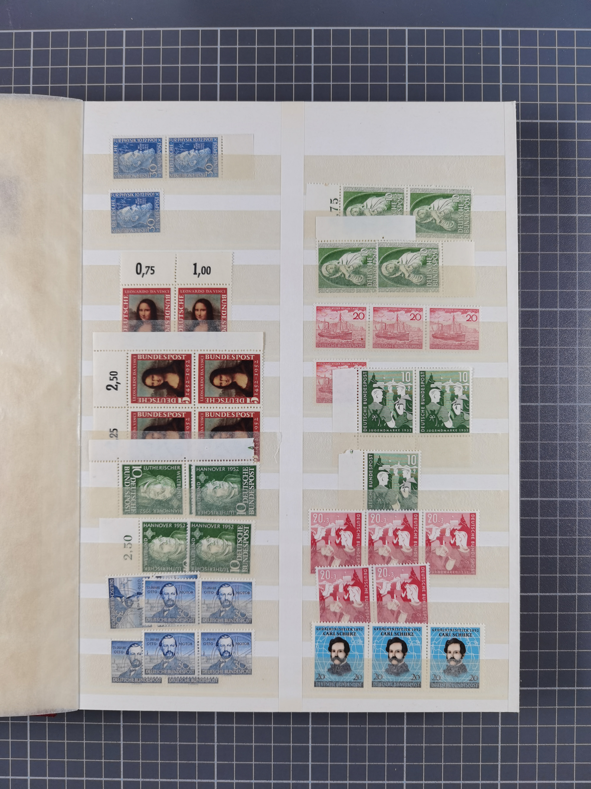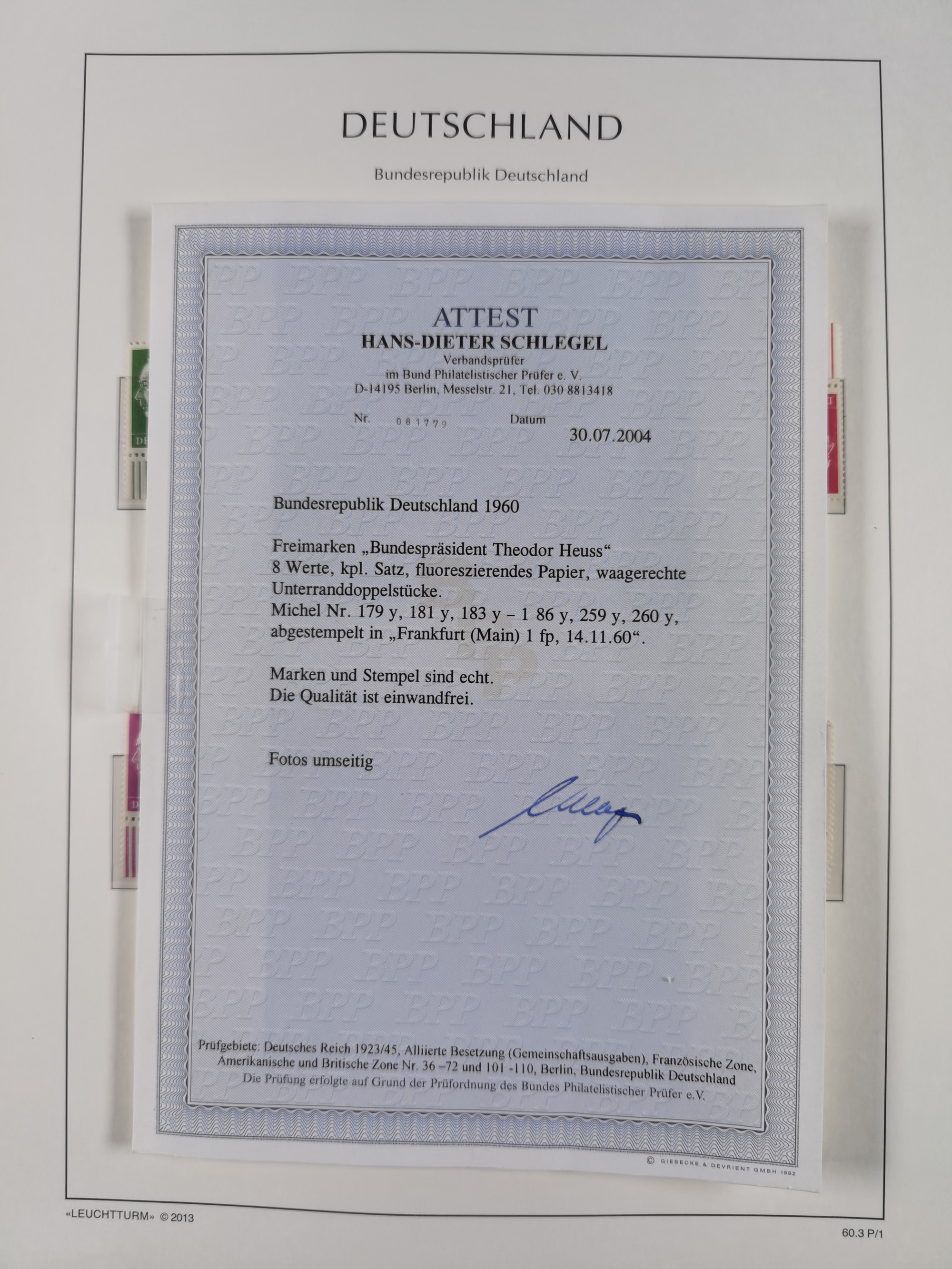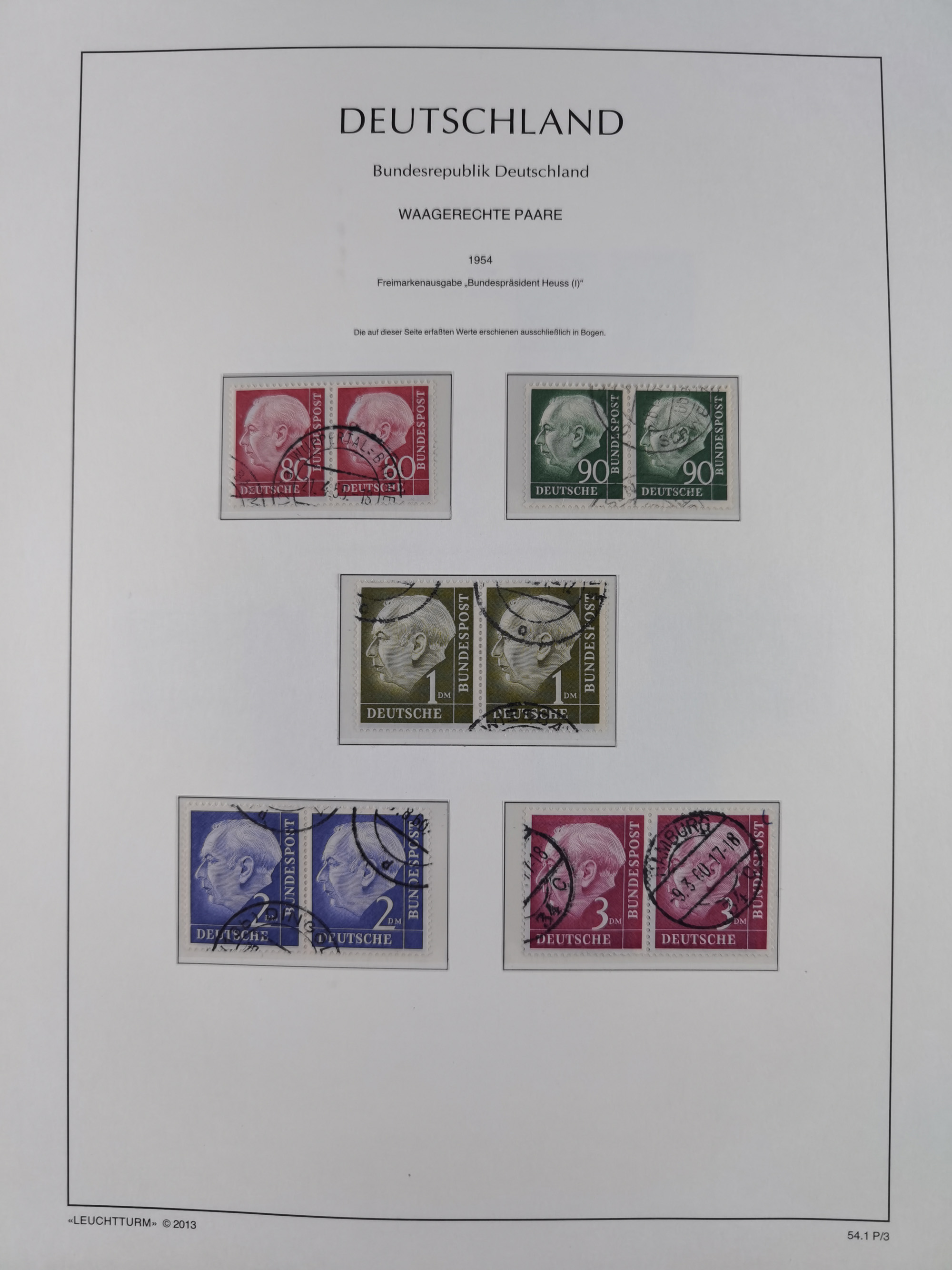 1951/2020, je postfrische und gestempelte Sammlung “waagerechte Paare”, dabei u.a. Posthornsatz postfrisch (20 Pfg. kleine gummimatte Stelle) bestens sign. Schlegel BPP, sowie Heuss I in Paaren (60 Pfg. Unterrandstück mit Fo.-Nr. “1” und FB H.-D. Schlegel BPP), Heuss II und III, über bedeutende Deutsche bis Blumen, sowie gestempelt Posthorn und Heuss I, II und III in waagerechten Paaren, Heuss Lumogen in Unterrandpaaren sauber gestempelt (FA H.-D. Schlegel BPP) und bedeutende Deutsche bis Blumen, ferner Heftchenblätter und Markenheftchen, einiges signiert, im Vordruckalbum