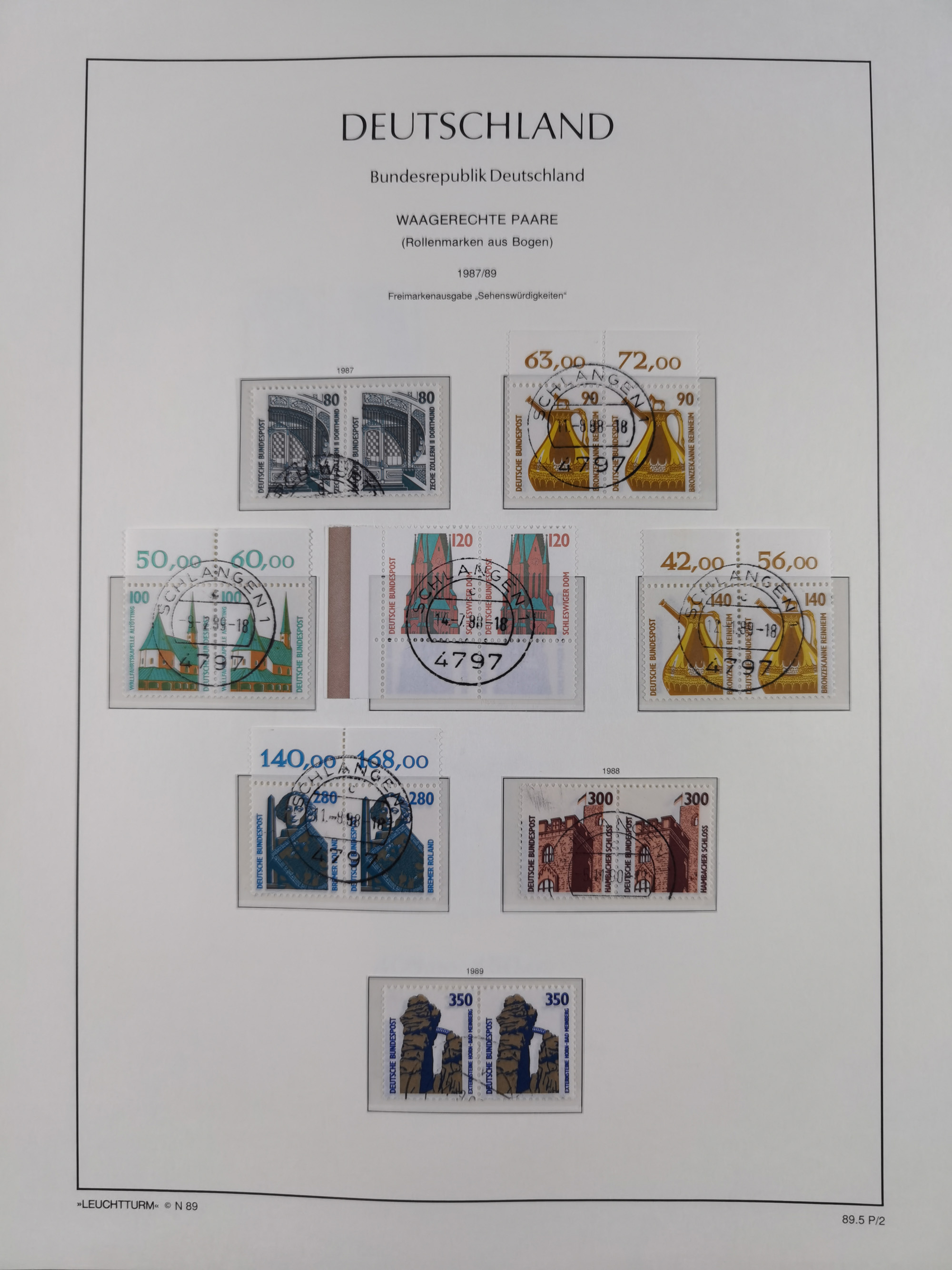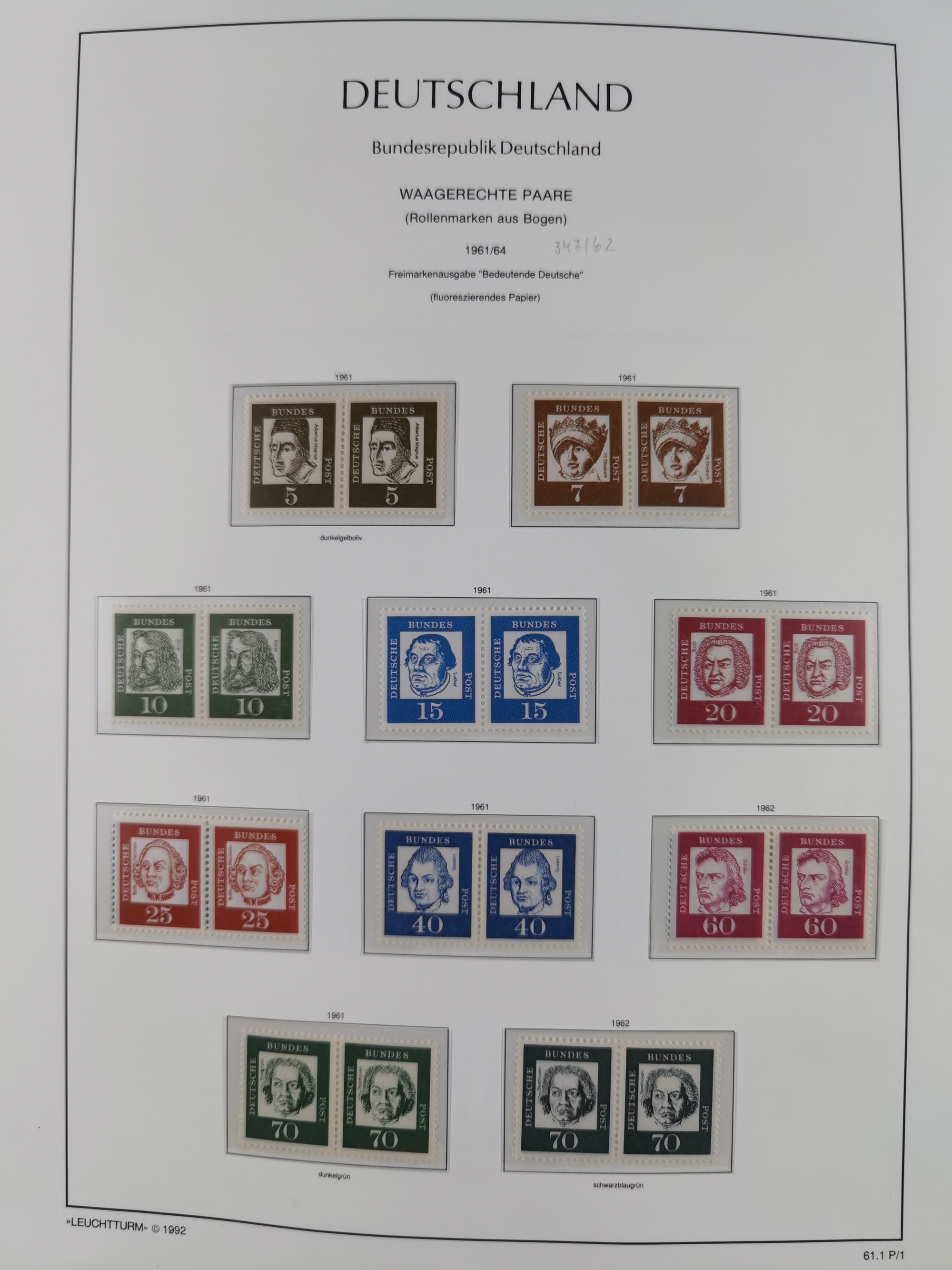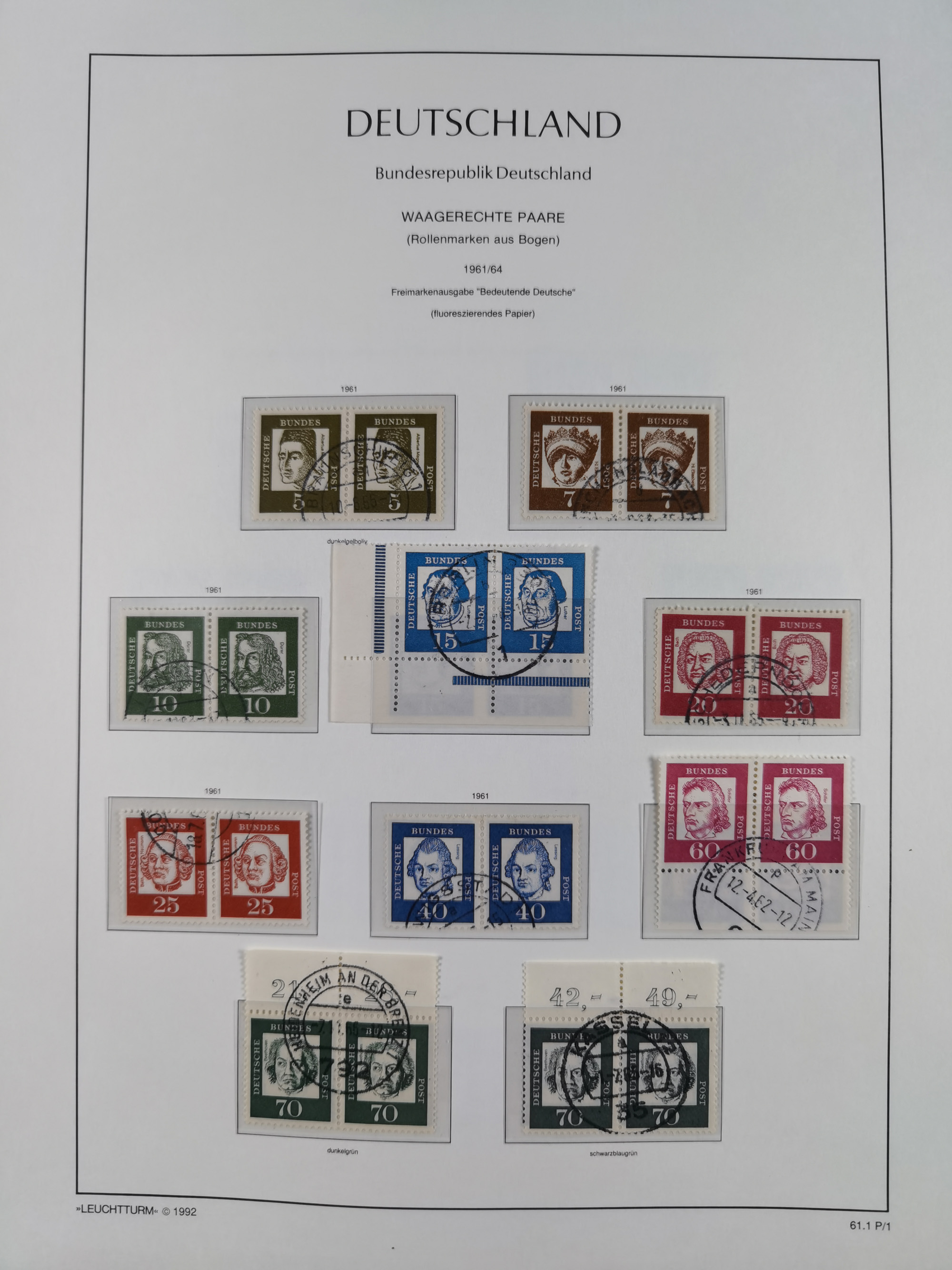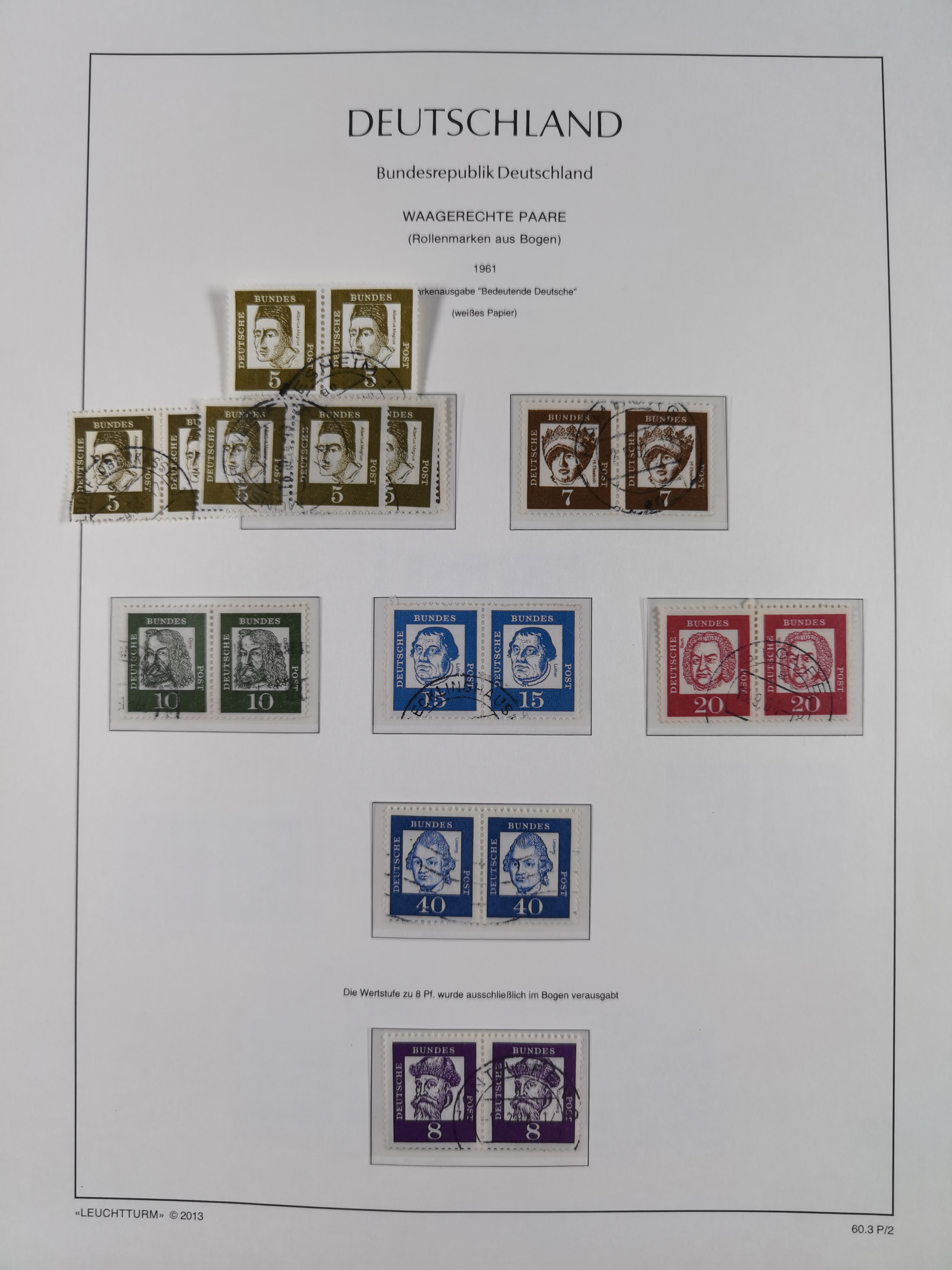 1951/2020, je postfrische und gestempelte Sammlung “waagerechte Paare”, dabei u.a. Posthornsatz postfrisch (20 Pfg. kleine gummimatte Stelle) bestens sign. Schlegel BPP, sowie Heuss I in Paaren (60 Pfg. Unterrandstück mit Fo.-Nr. “1” und FB H.-D. Schlegel BPP), Heuss II und III, über bedeutende Deutsche bis Blumen, sowie gestempelt Posthorn und Heuss I, II und III in waagerechten Paaren, Heuss Lumogen in Unterrandpaaren sauber gestempelt (FA H.-D. Schlegel BPP) und bedeutende Deutsche bis Blumen, ferner Heftchenblätter und Markenheftchen, einiges signiert, im Vordruckalbum