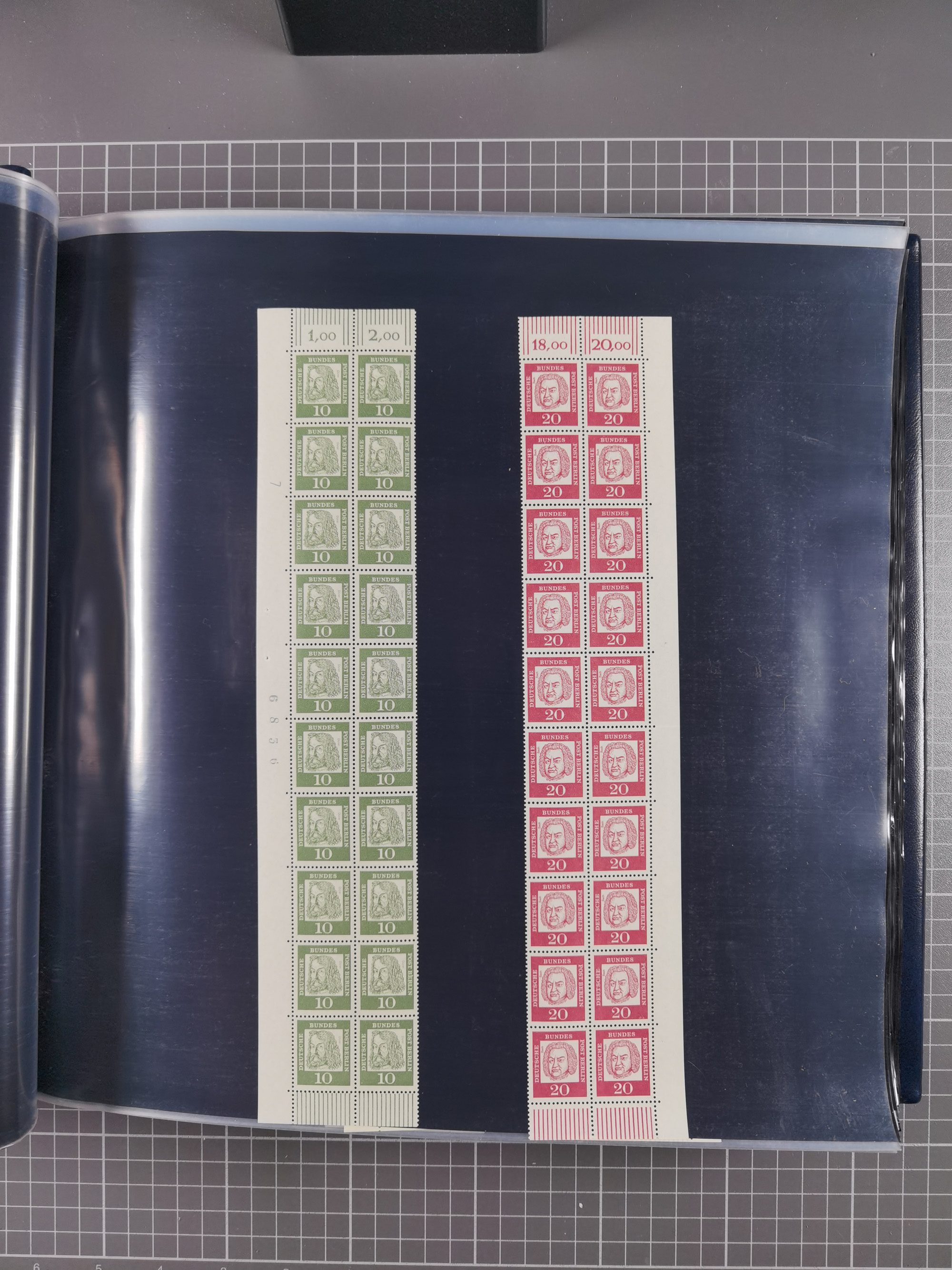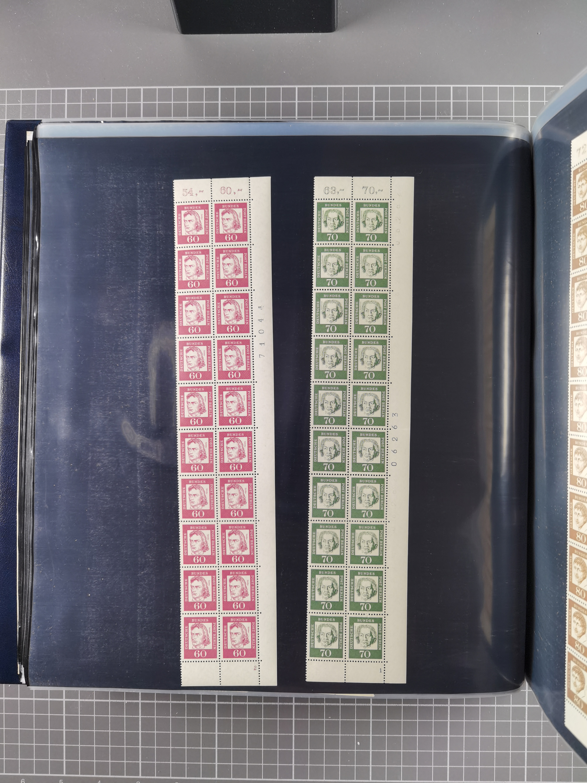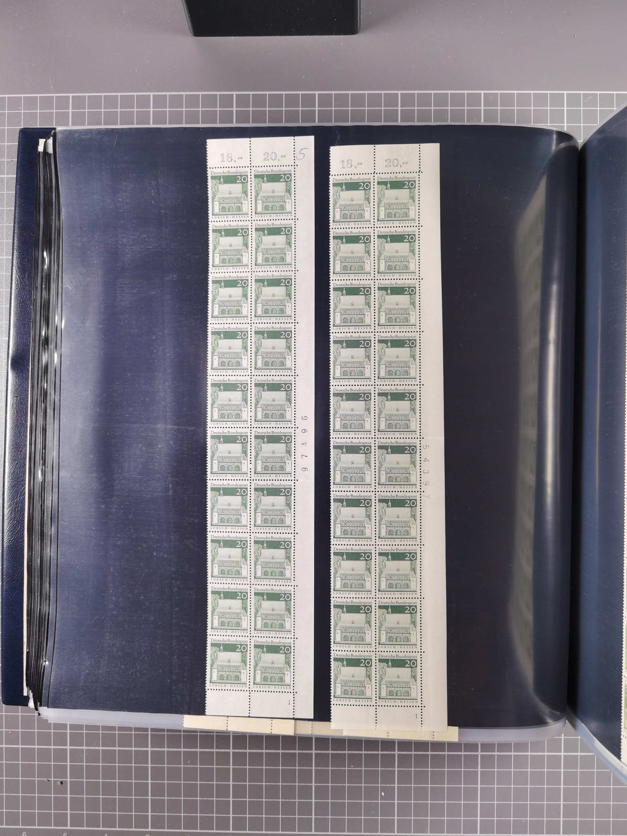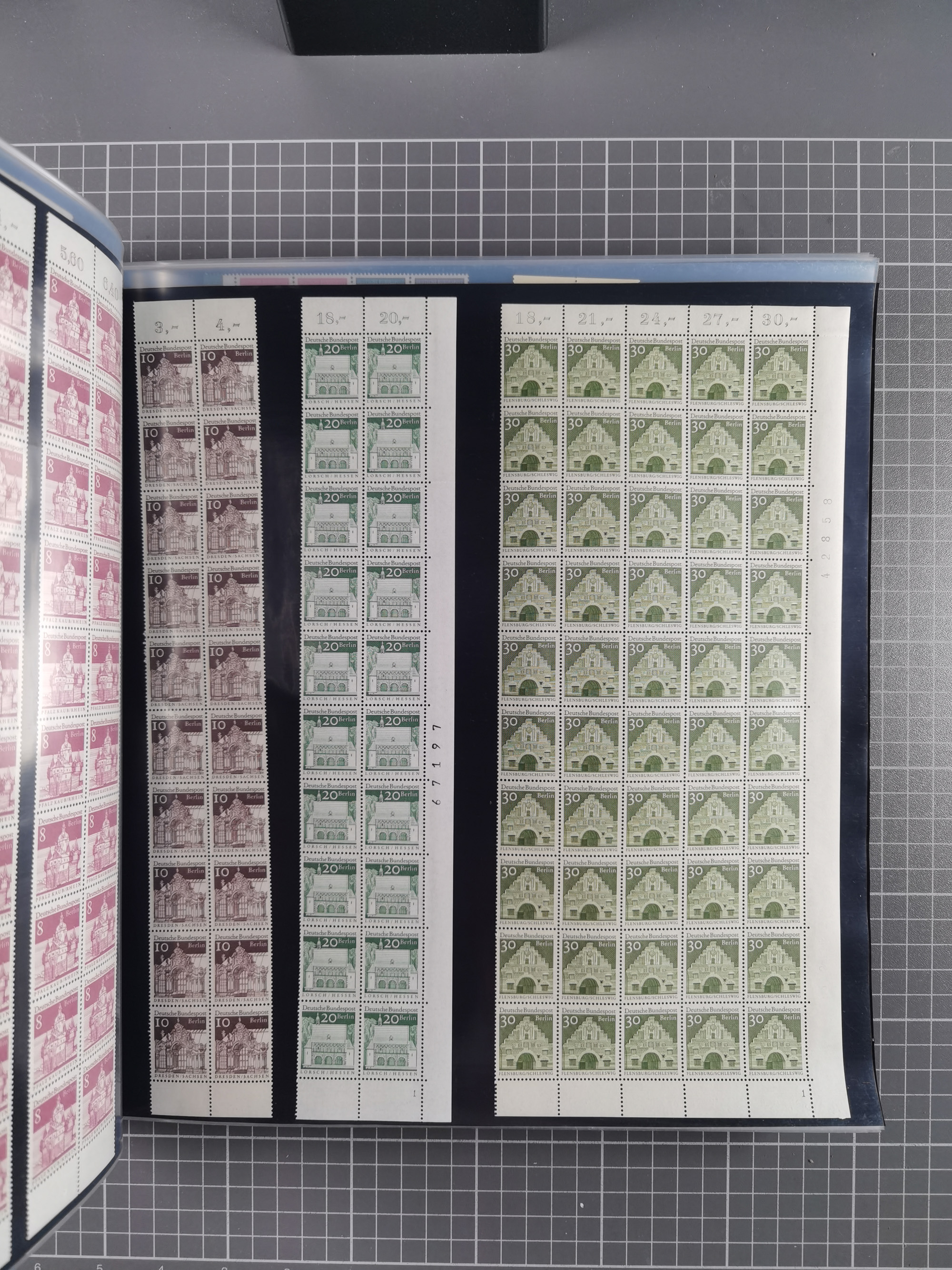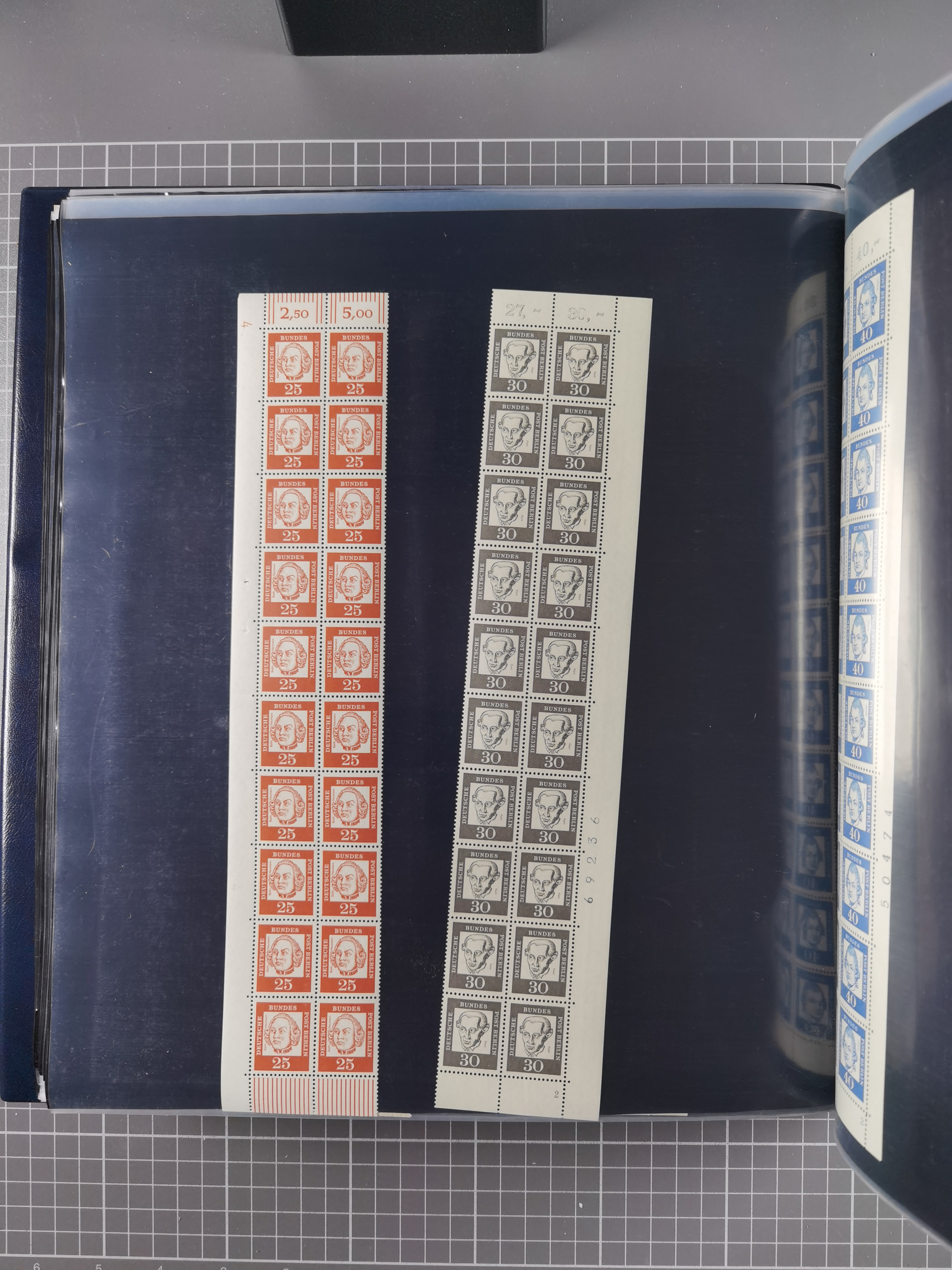 1960/75. postfrische Bogenteile der Dauerserien ab Bedeutende Deutsche, dabei Formnummern und Berlin mit u.a. Mi.-Nr. 246-49 jeweils im 20er-Bogenteil rechts mit 10 waagerechten Paaren, in Bogenmappe