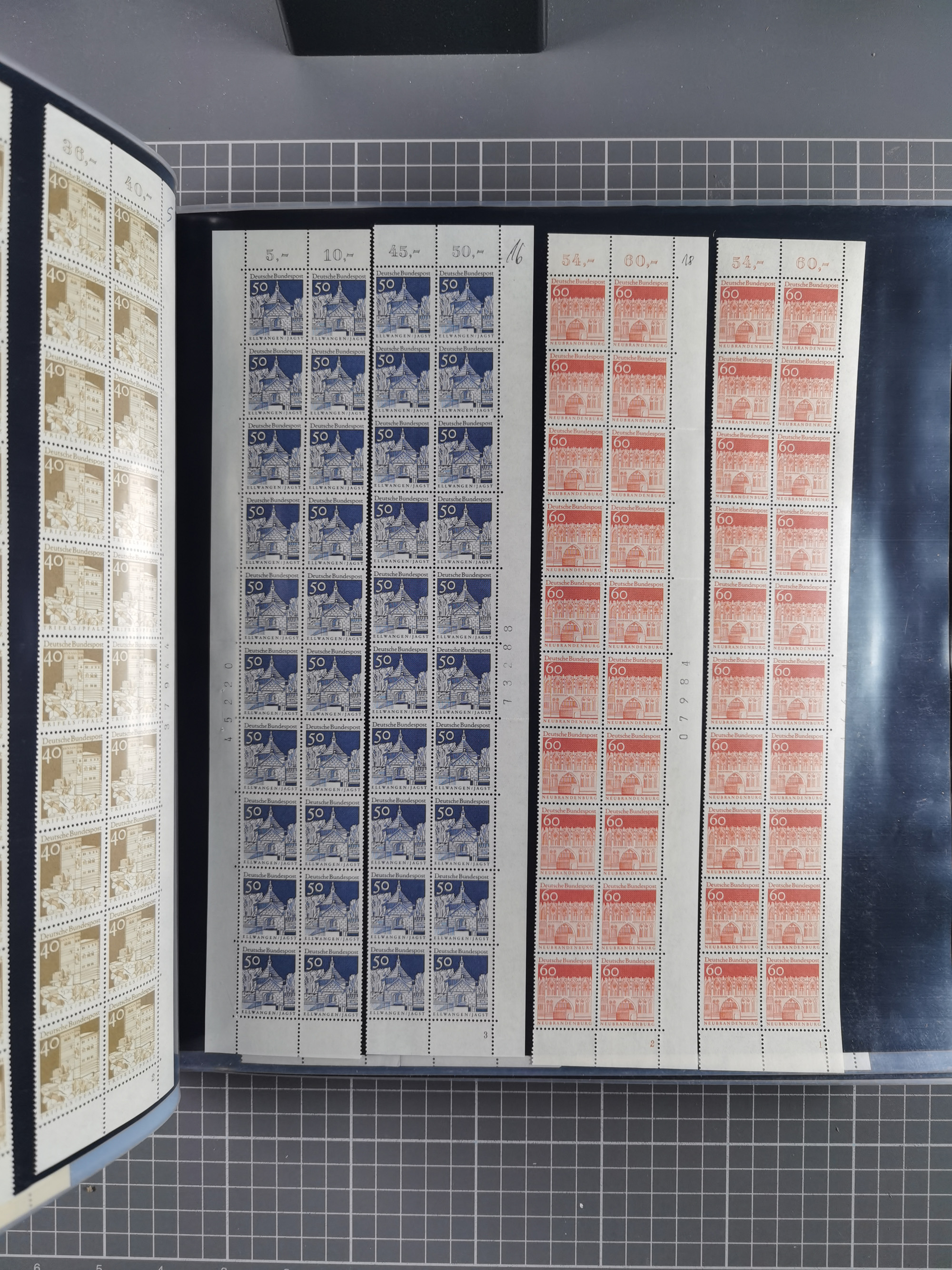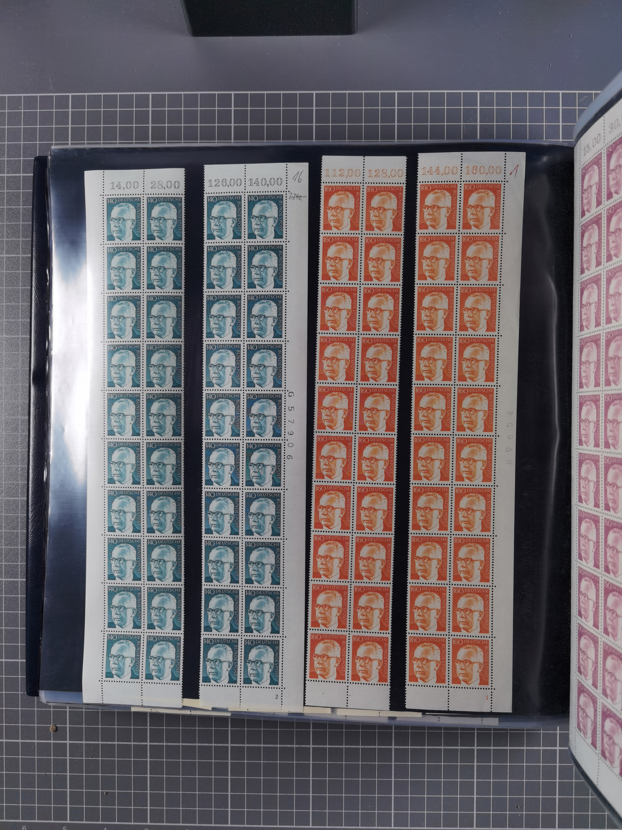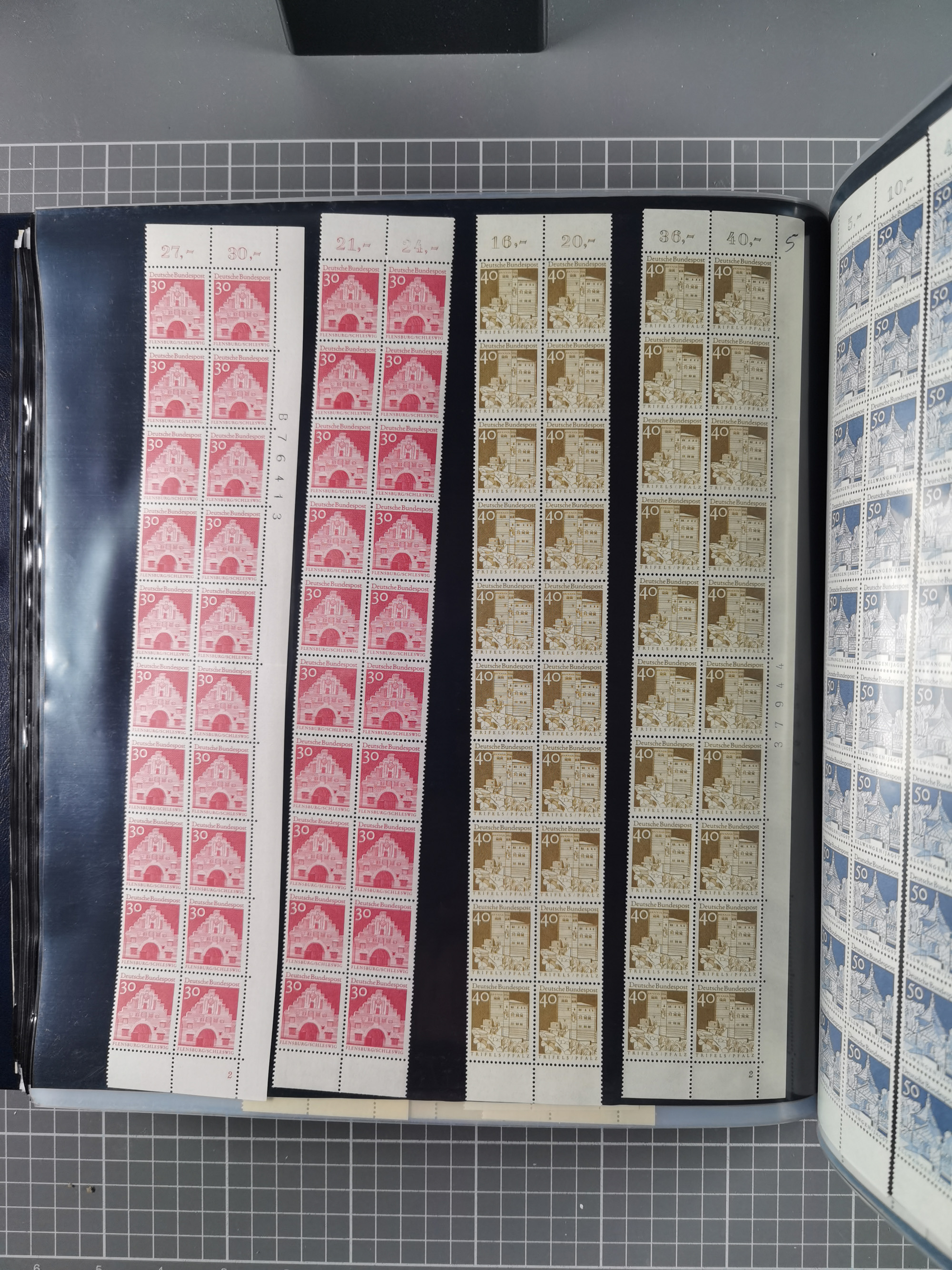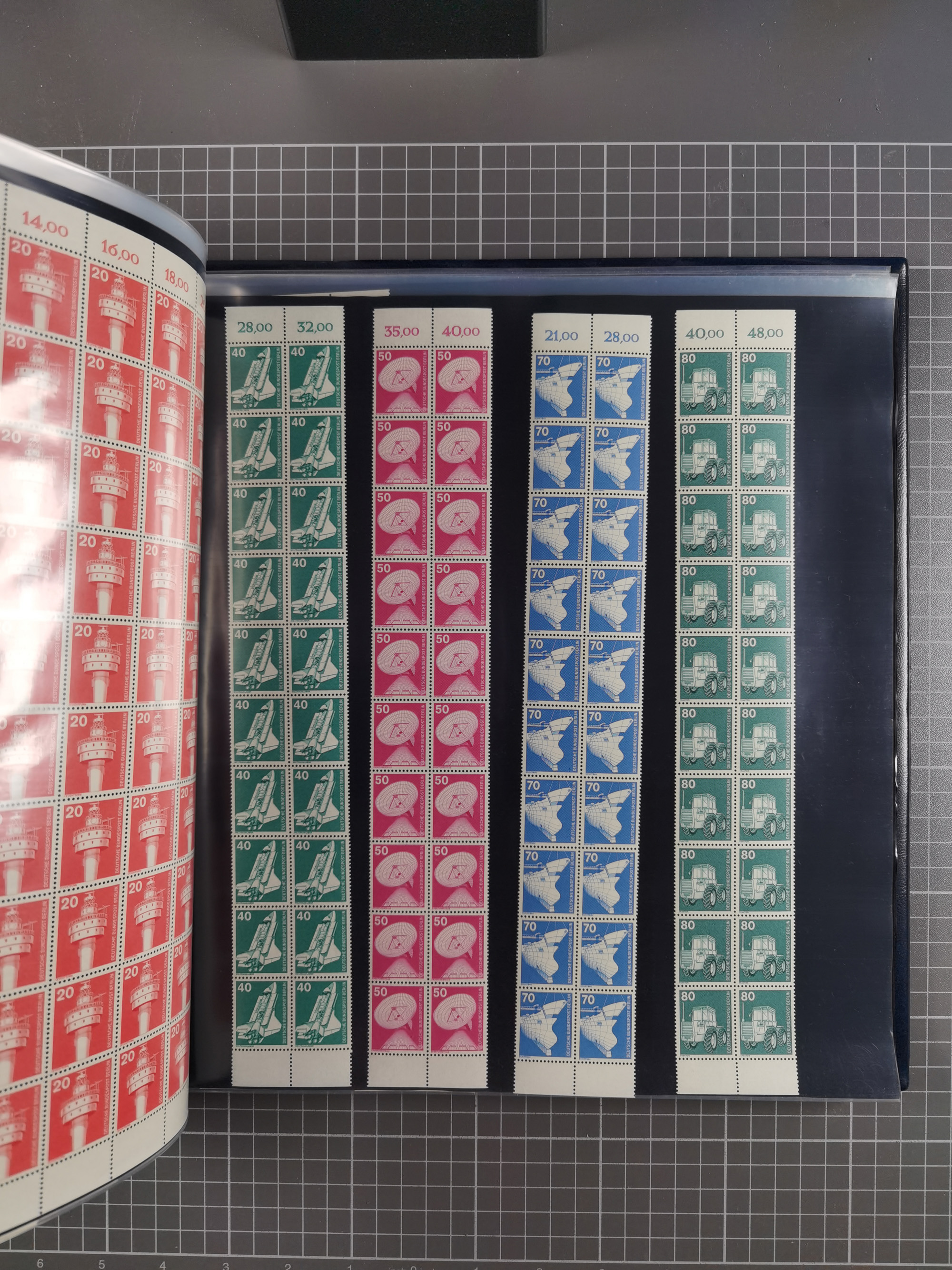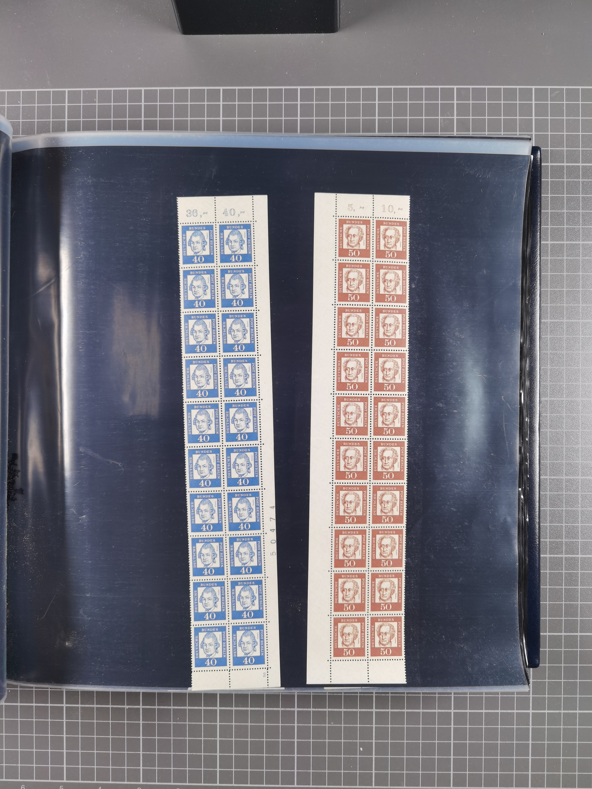 1960/75. postfrische Bogenteile der Dauerserien ab Bedeutende Deutsche, dabei Formnummern und Berlin mit u.a. Mi.-Nr. 246-49 jeweils im 20er-Bogenteil rechts mit 10 waagerechten Paaren, in Bogenmappe