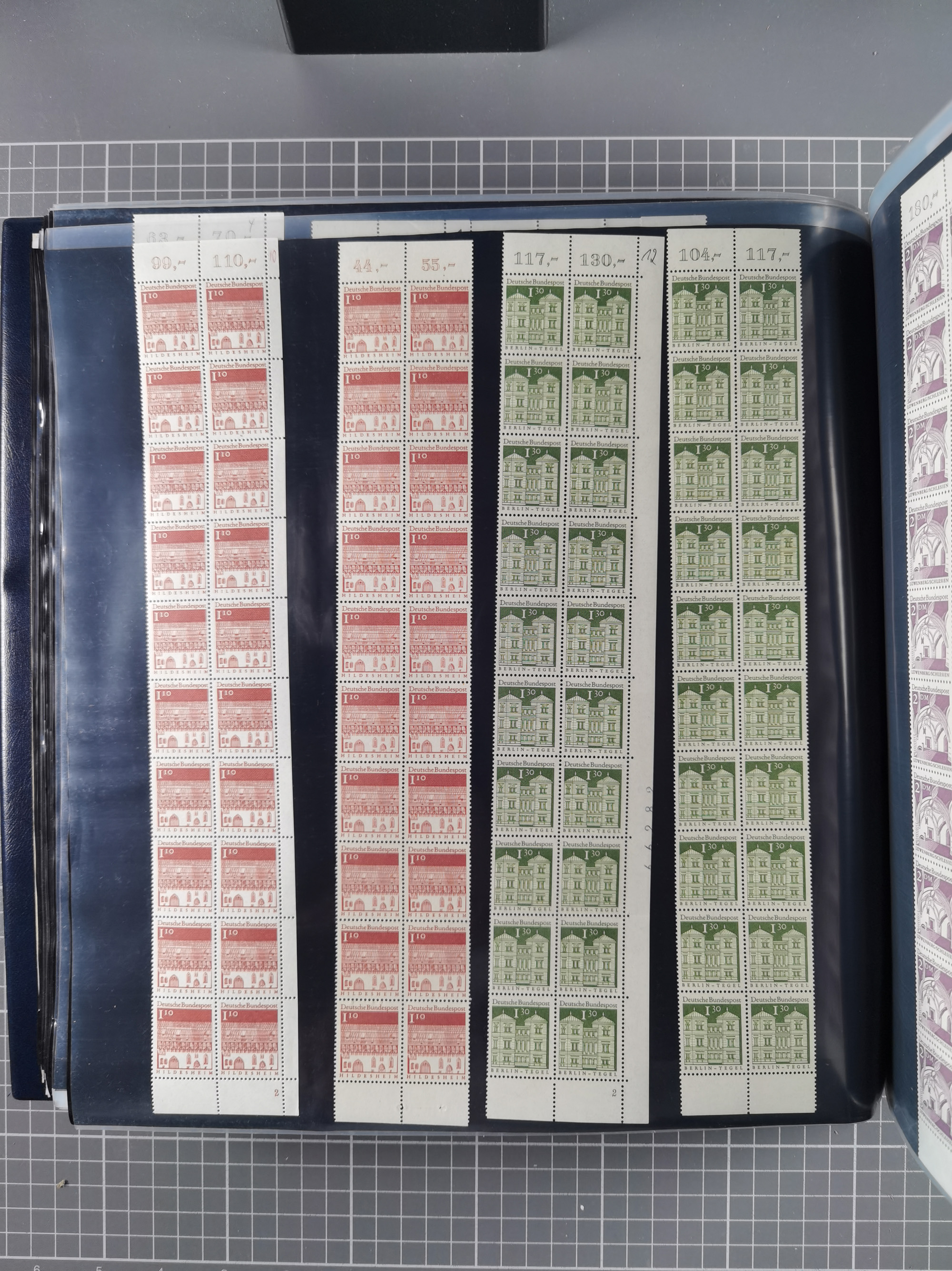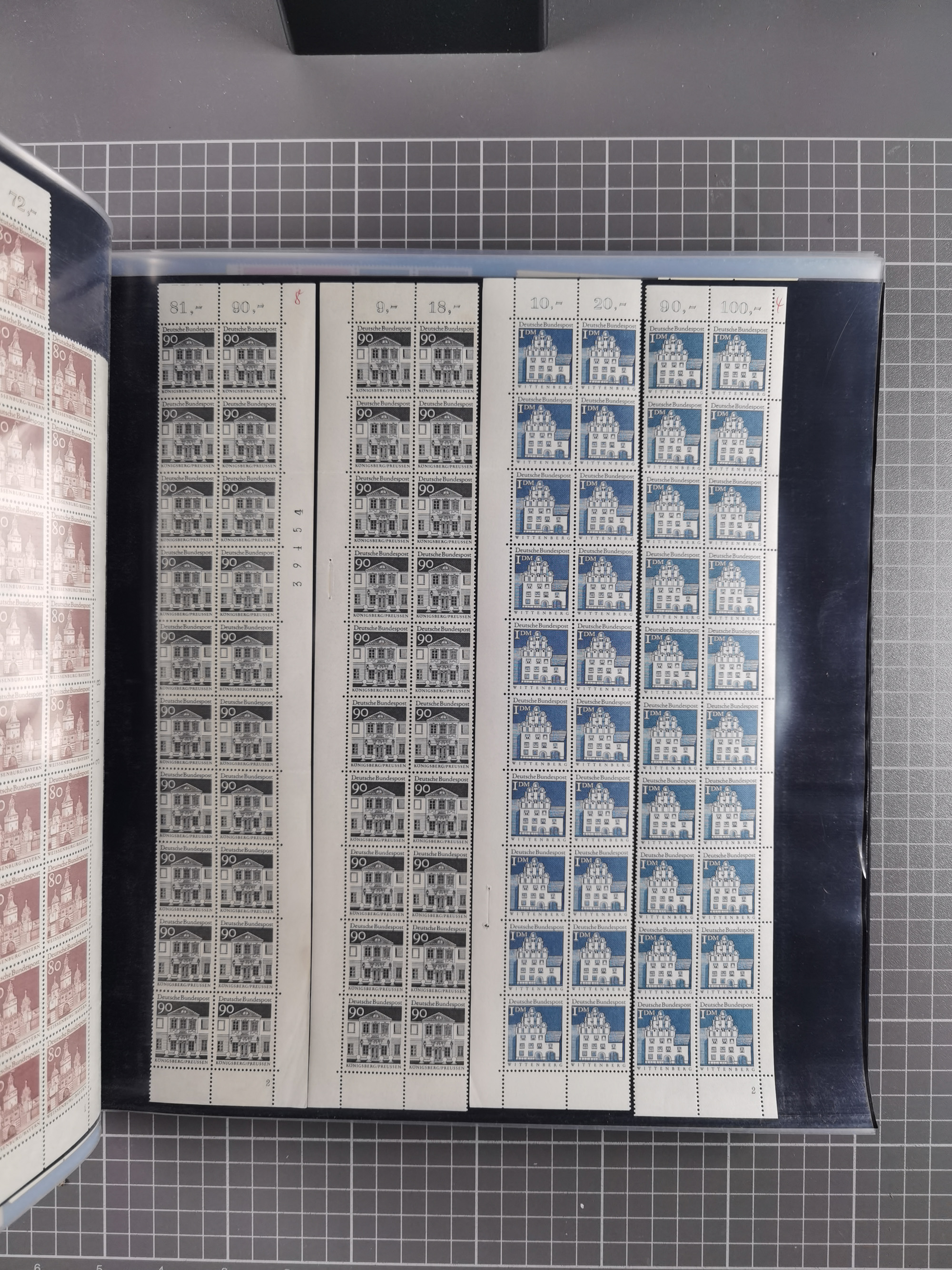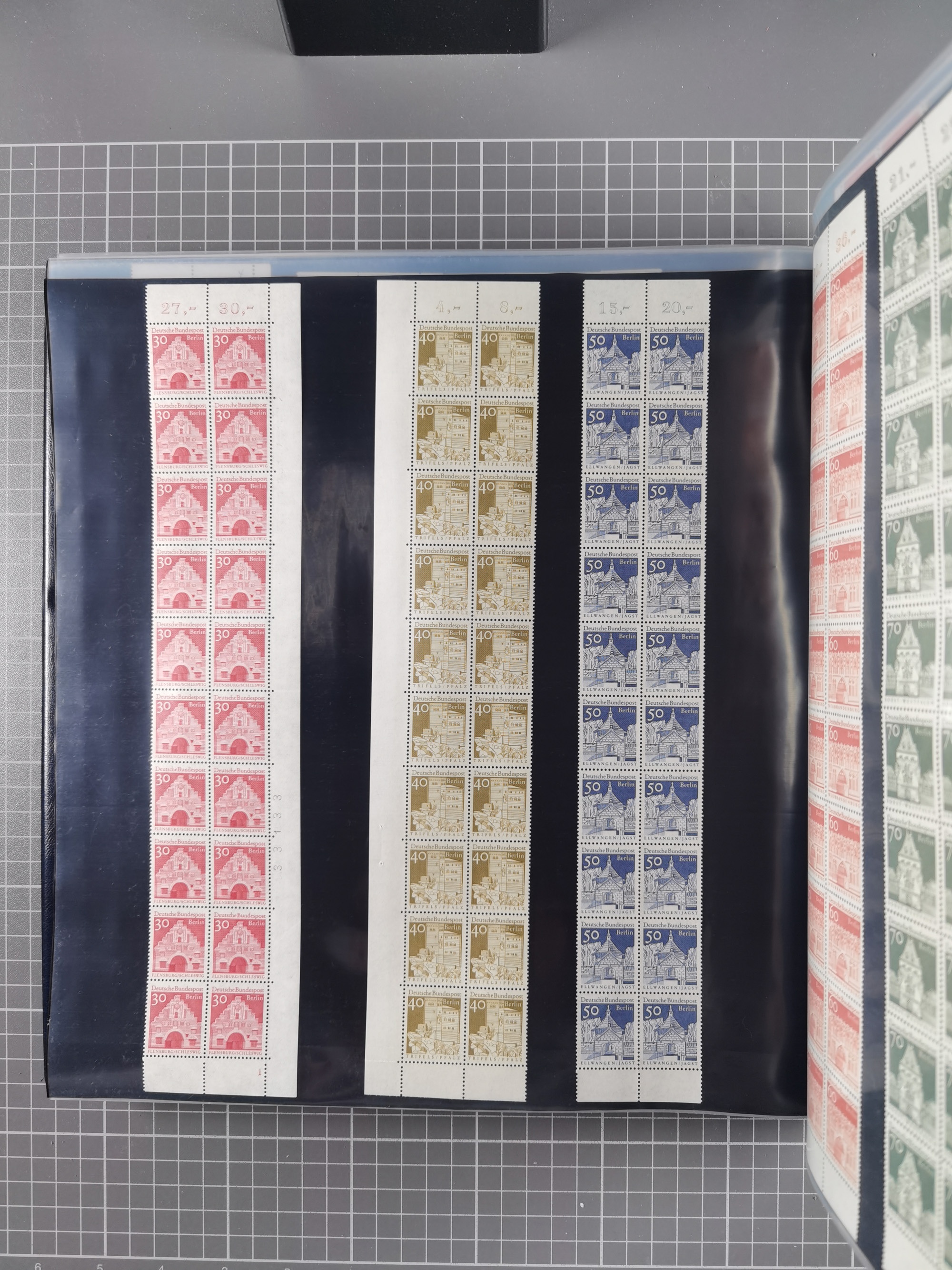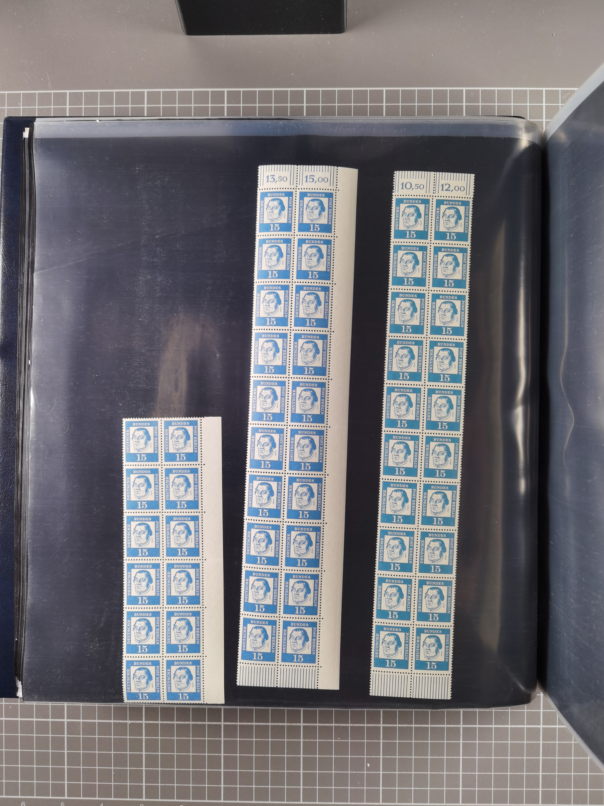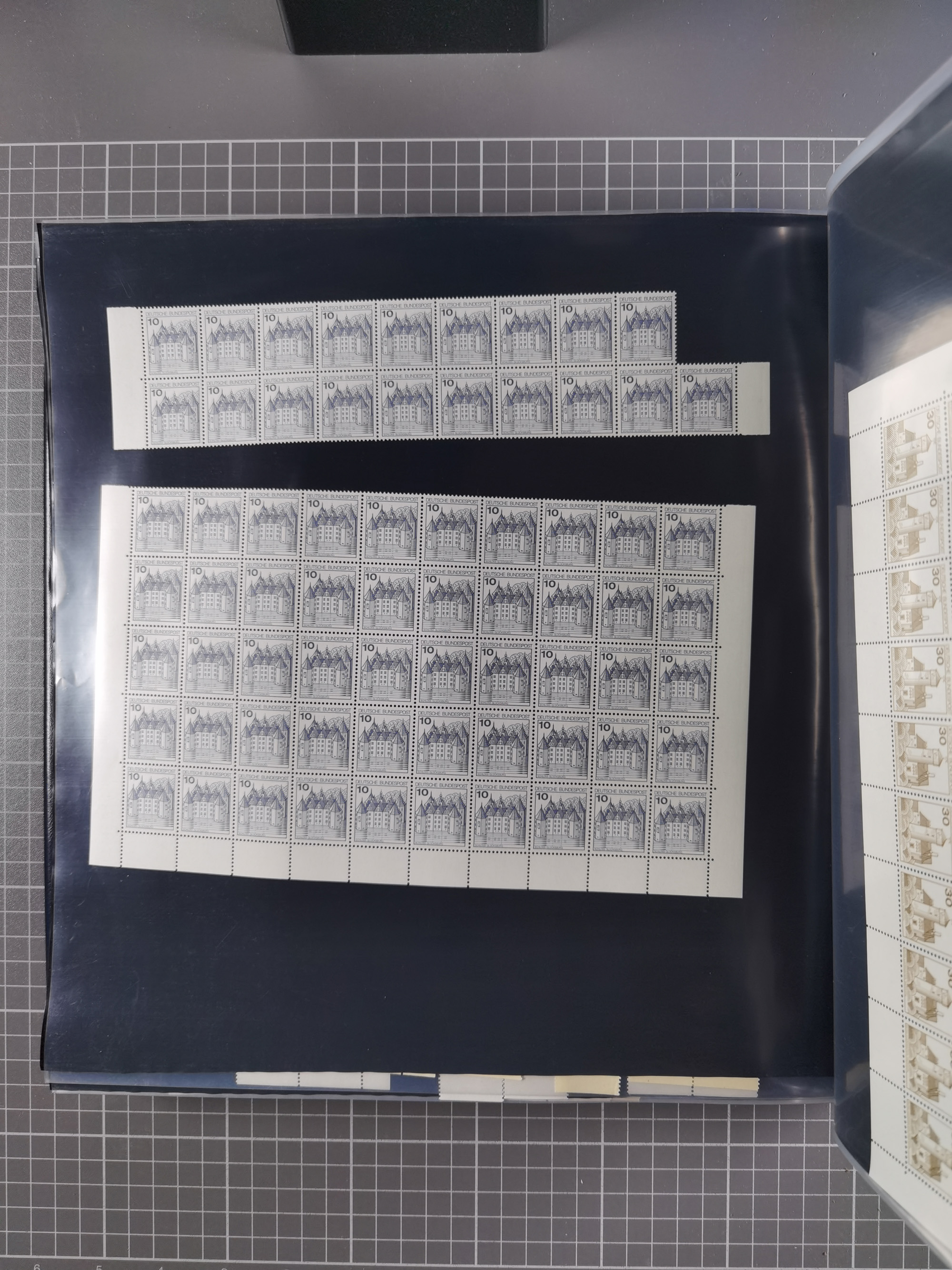 1960/75. postfrische Bogenteile der Dauerserien ab Bedeutende Deutsche, dabei Formnummern und Berlin mit u.a. Mi.-Nr. 246-49 jeweils im 20er-Bogenteil rechts mit 10 waagerechten Paaren, in Bogenmappe