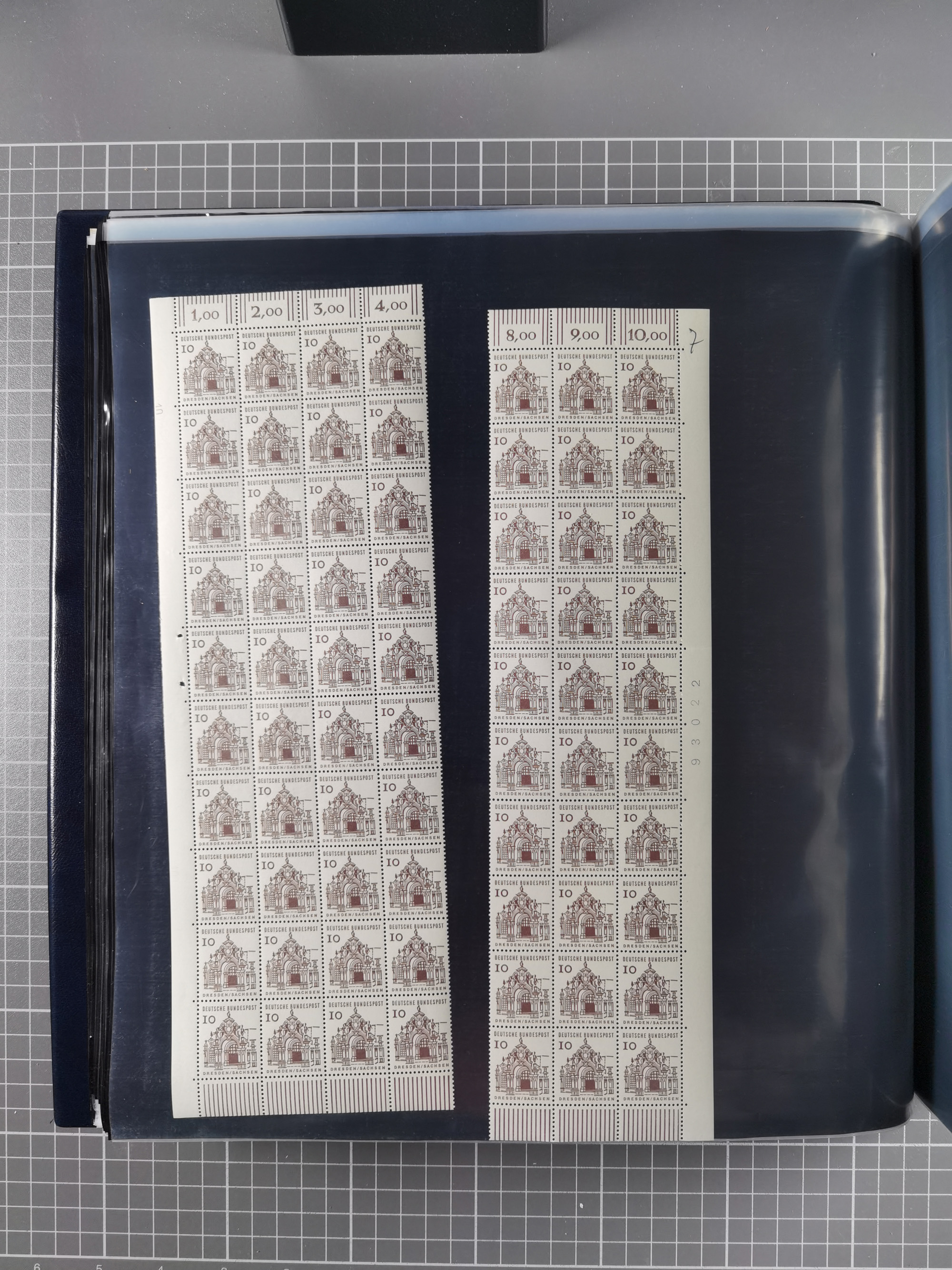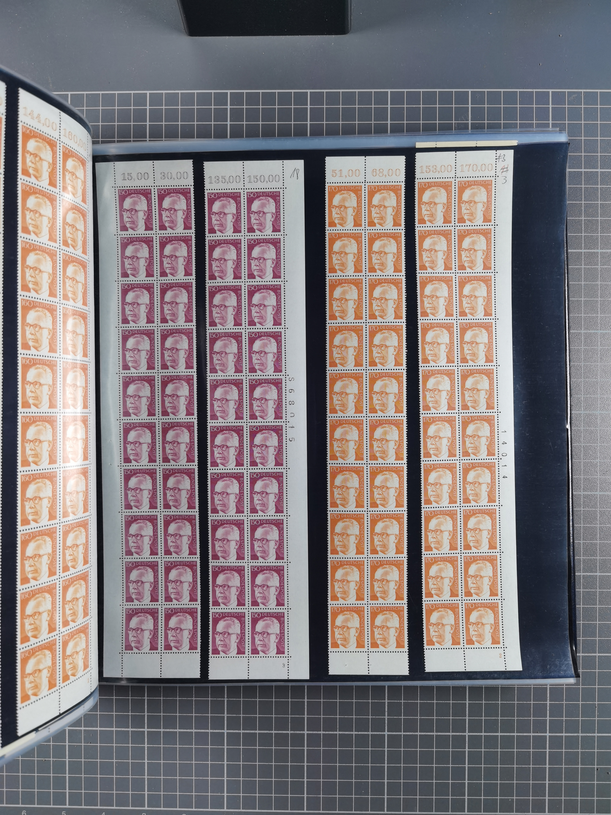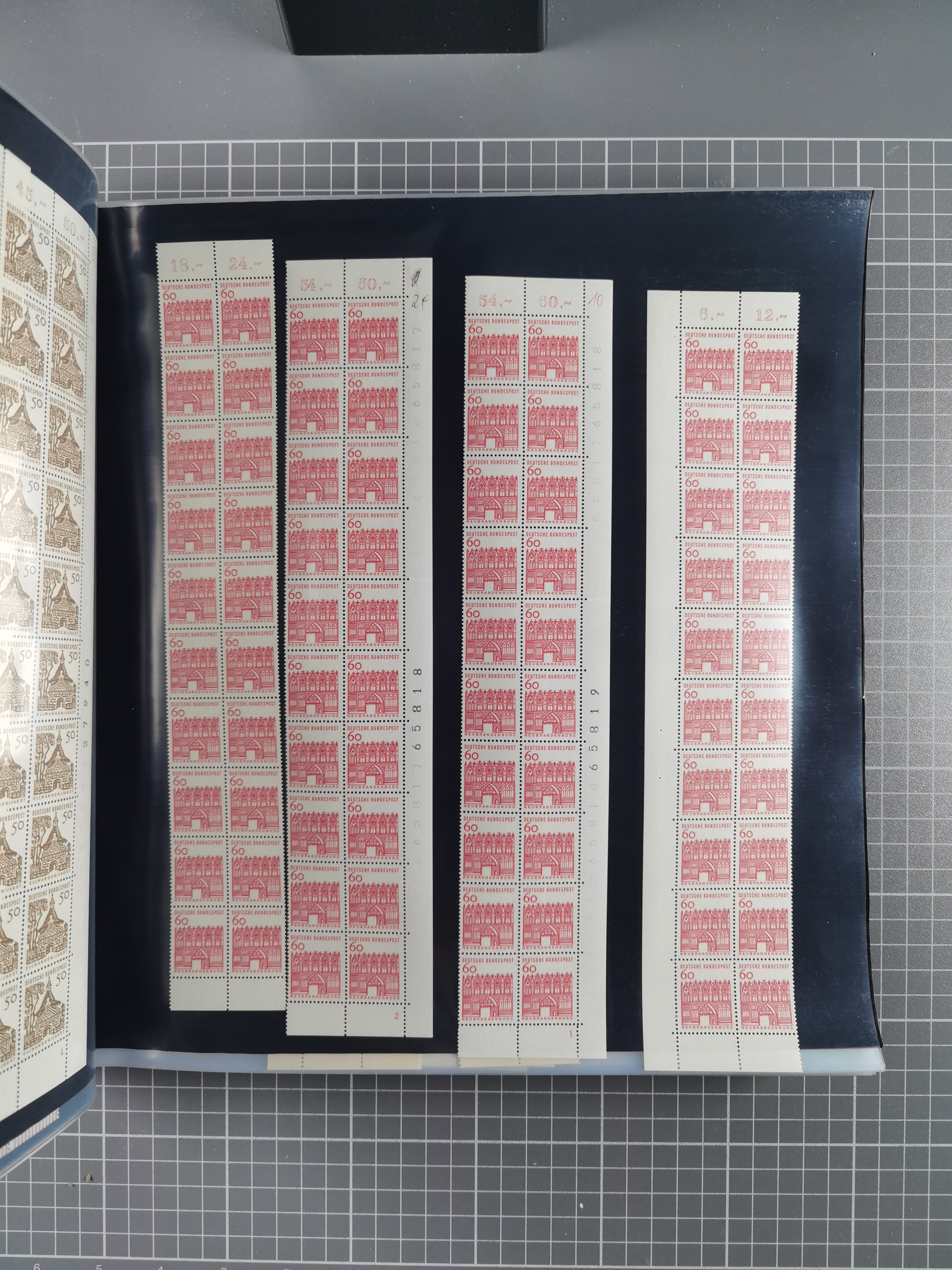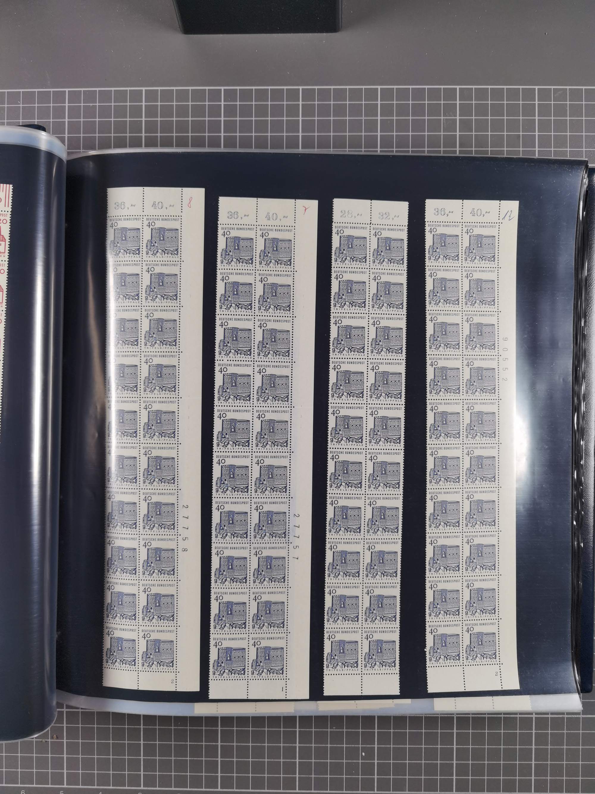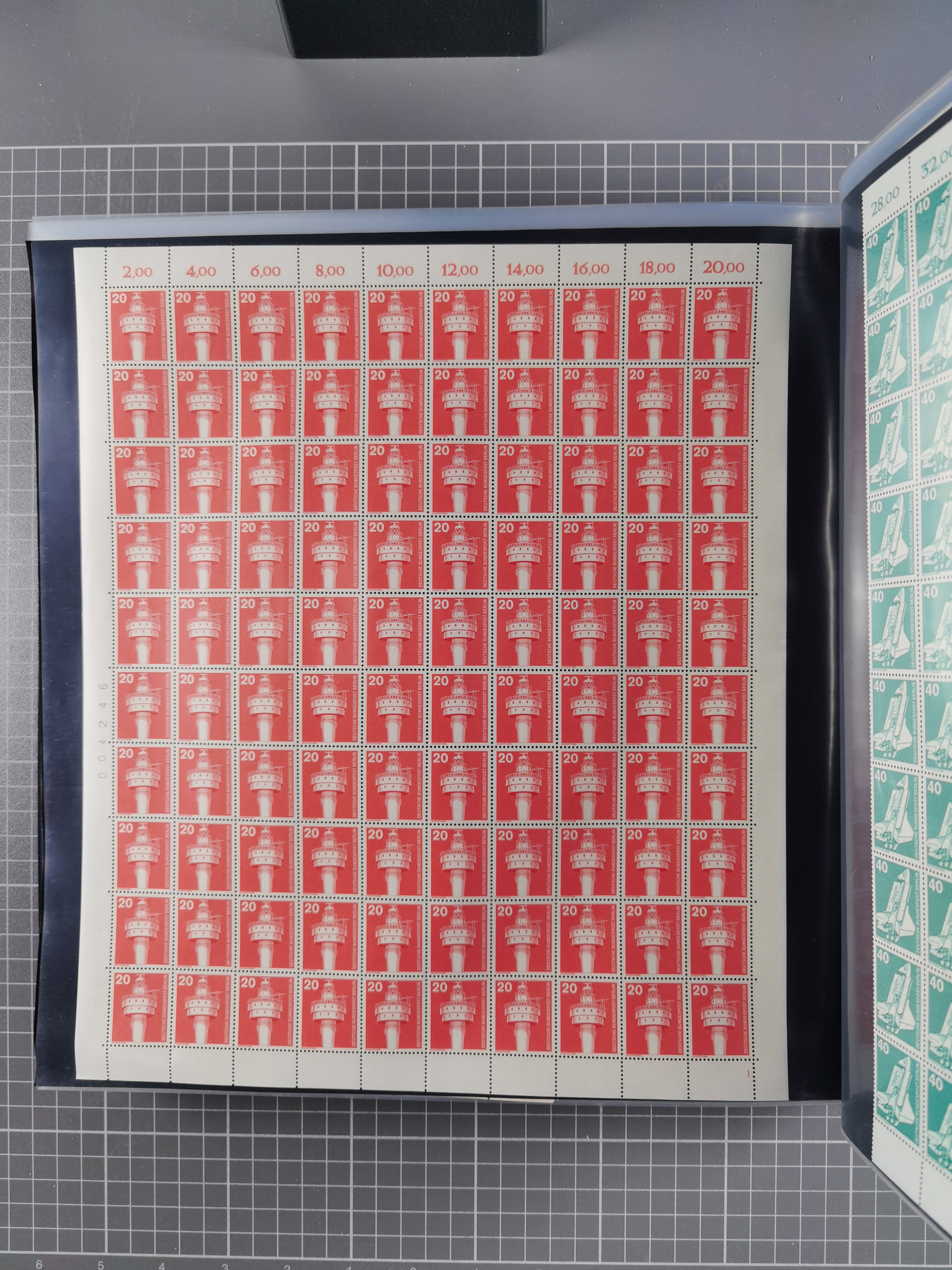 1960/75. postfrische Bogenteile der Dauerserien ab Bedeutende Deutsche, dabei Formnummern und Berlin mit u.a. Mi.-Nr. 246-49 jeweils im 20er-Bogenteil rechts mit 10 waagerechten Paaren, in Bogenmappe