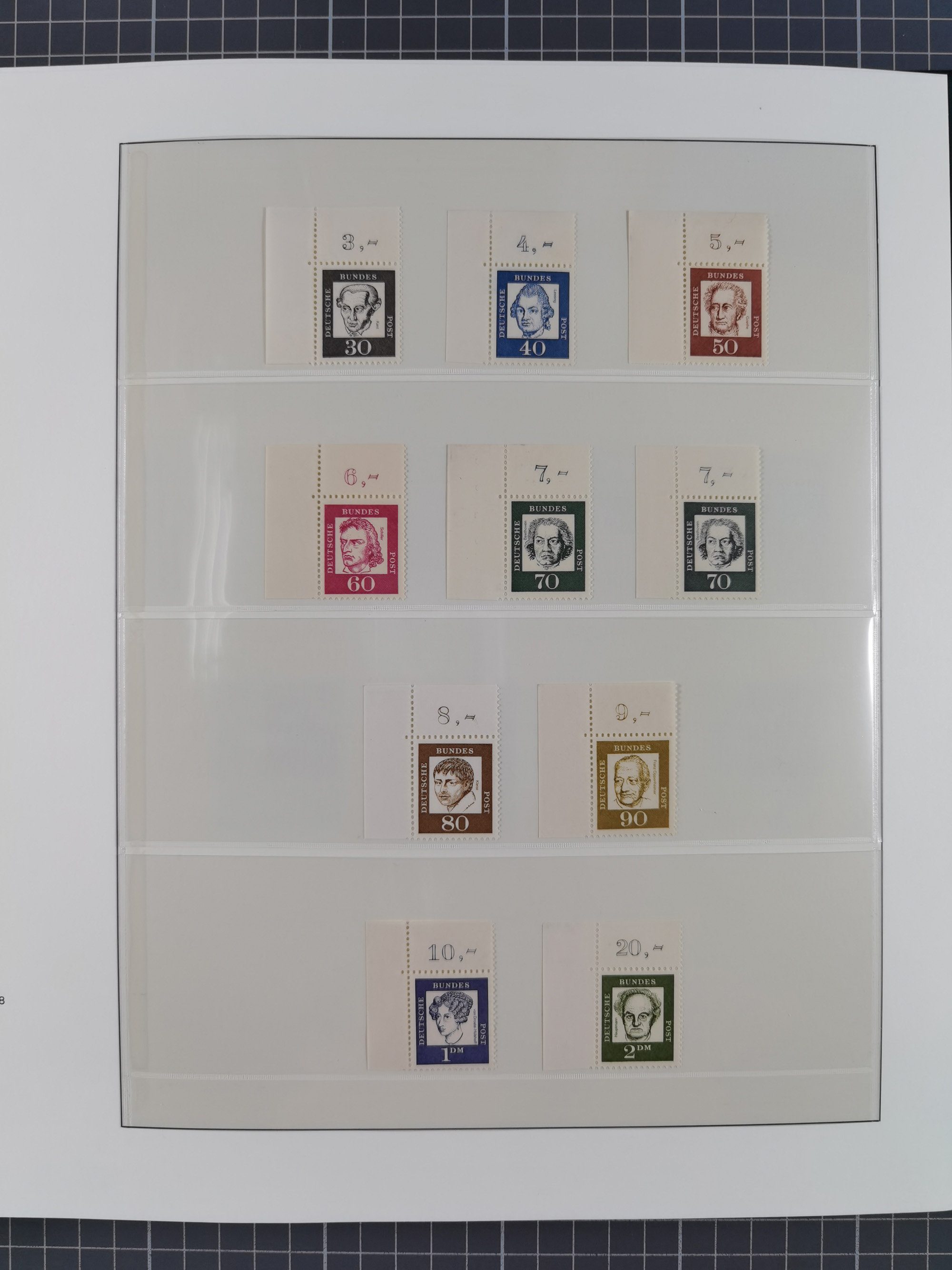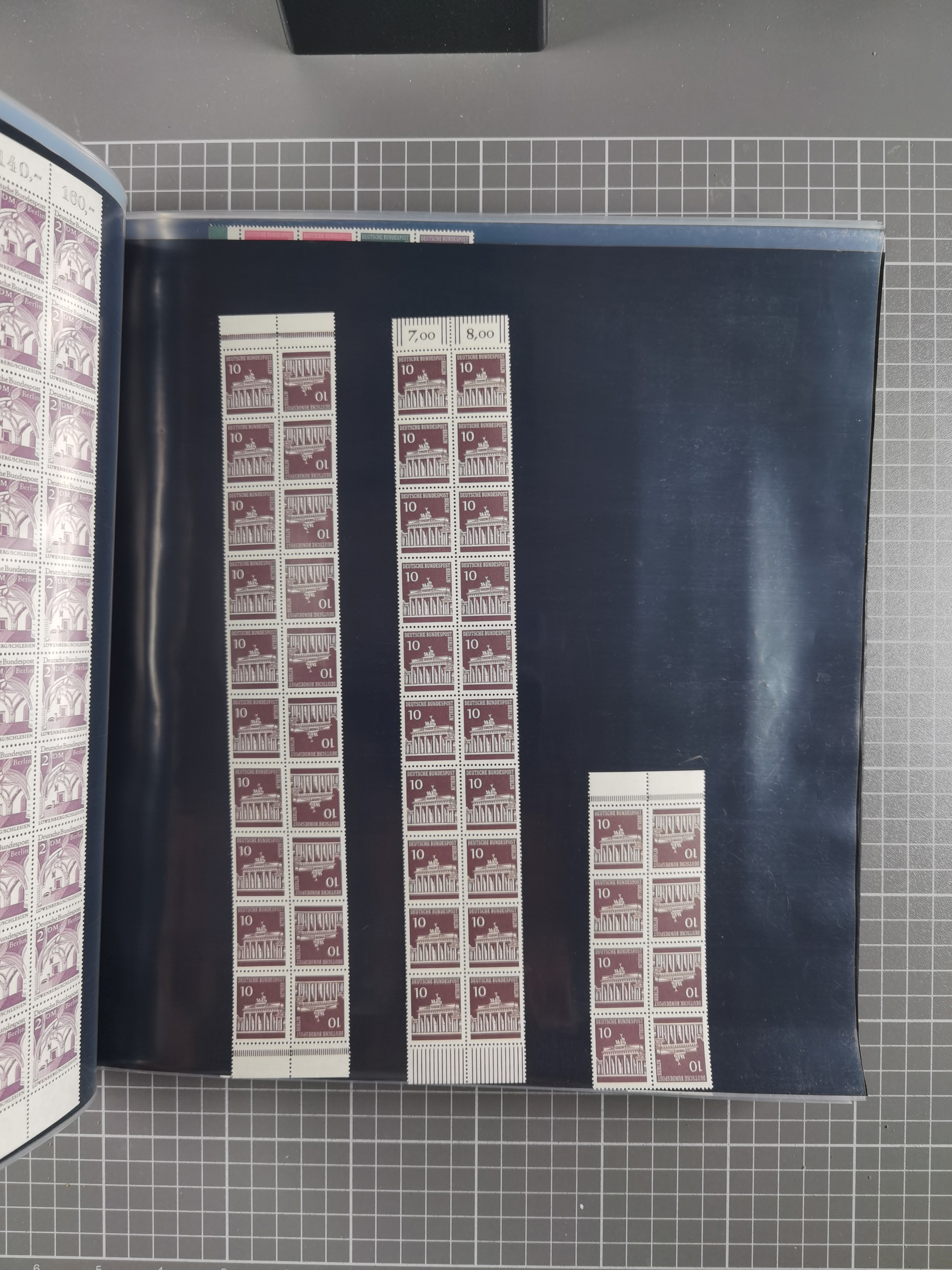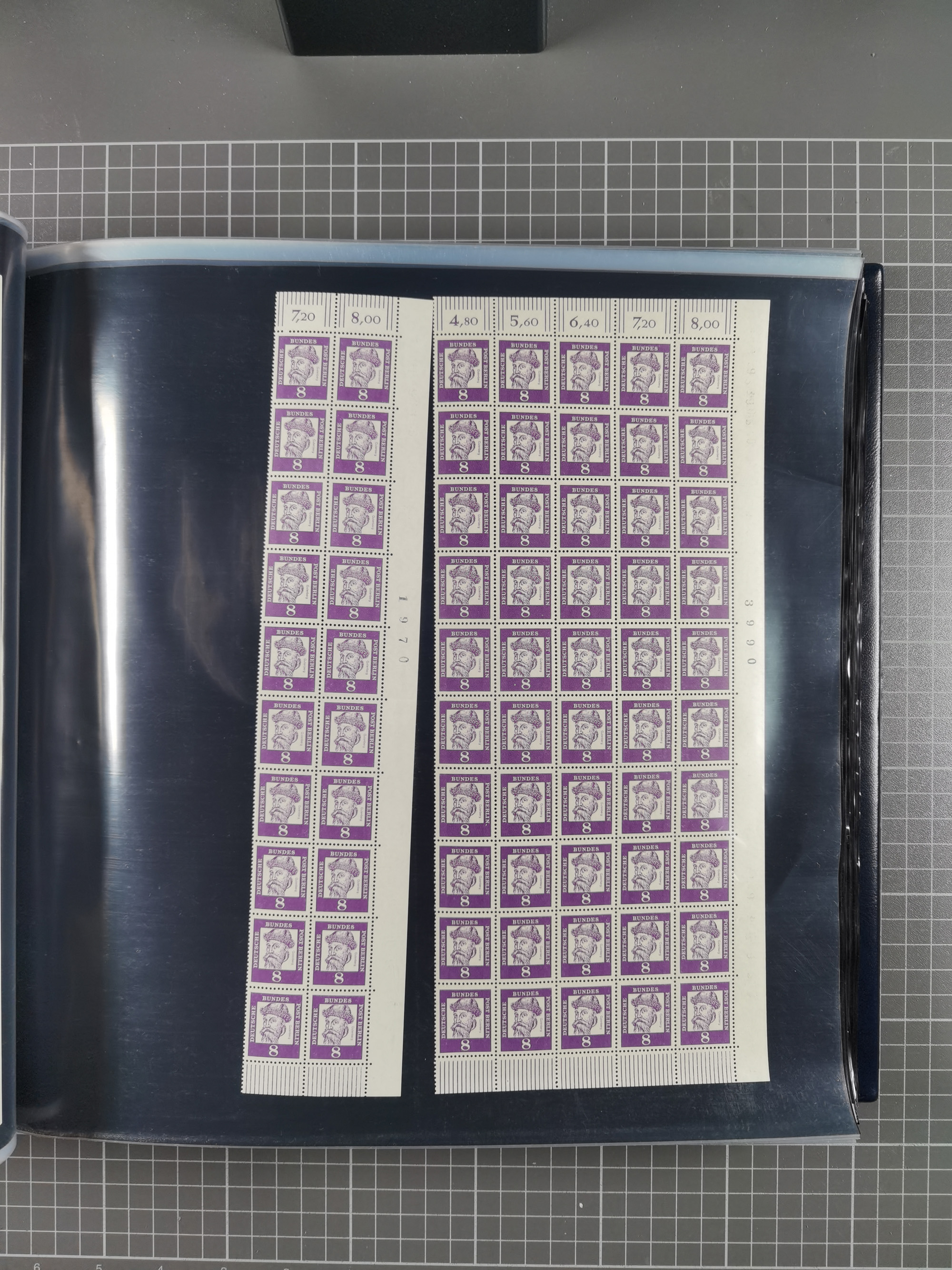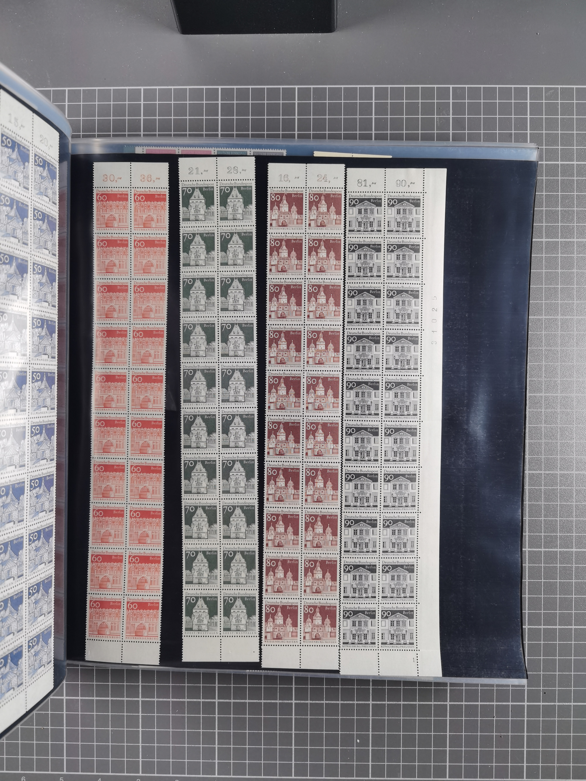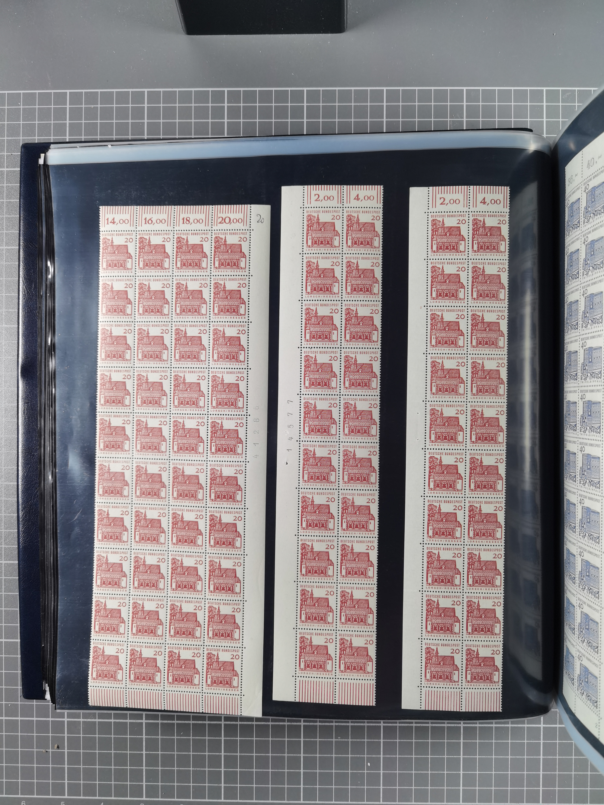 1960/75. postfrische Bogenteile der Dauerserien ab Bedeutende Deutsche, dabei Formnummern und Berlin mit u.a. Mi.-Nr. 246-49 jeweils im 20er-Bogenteil rechts mit 10 waagerechten Paaren, in Bogenmappe