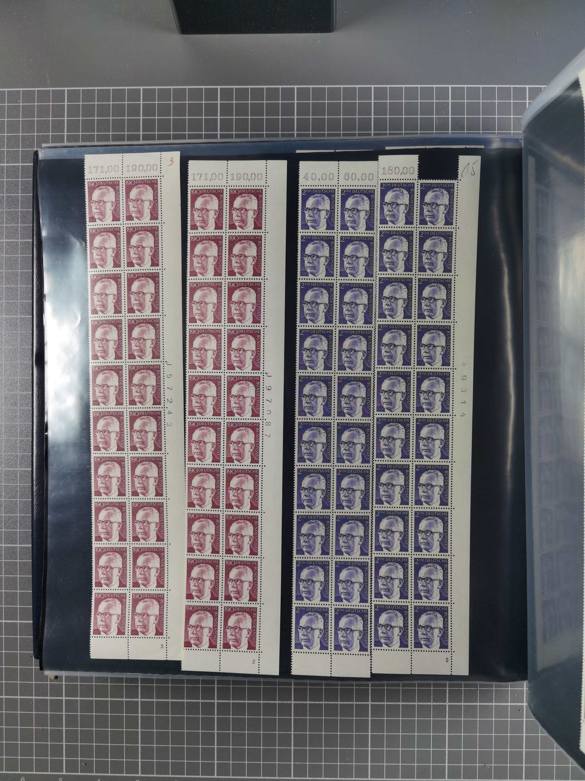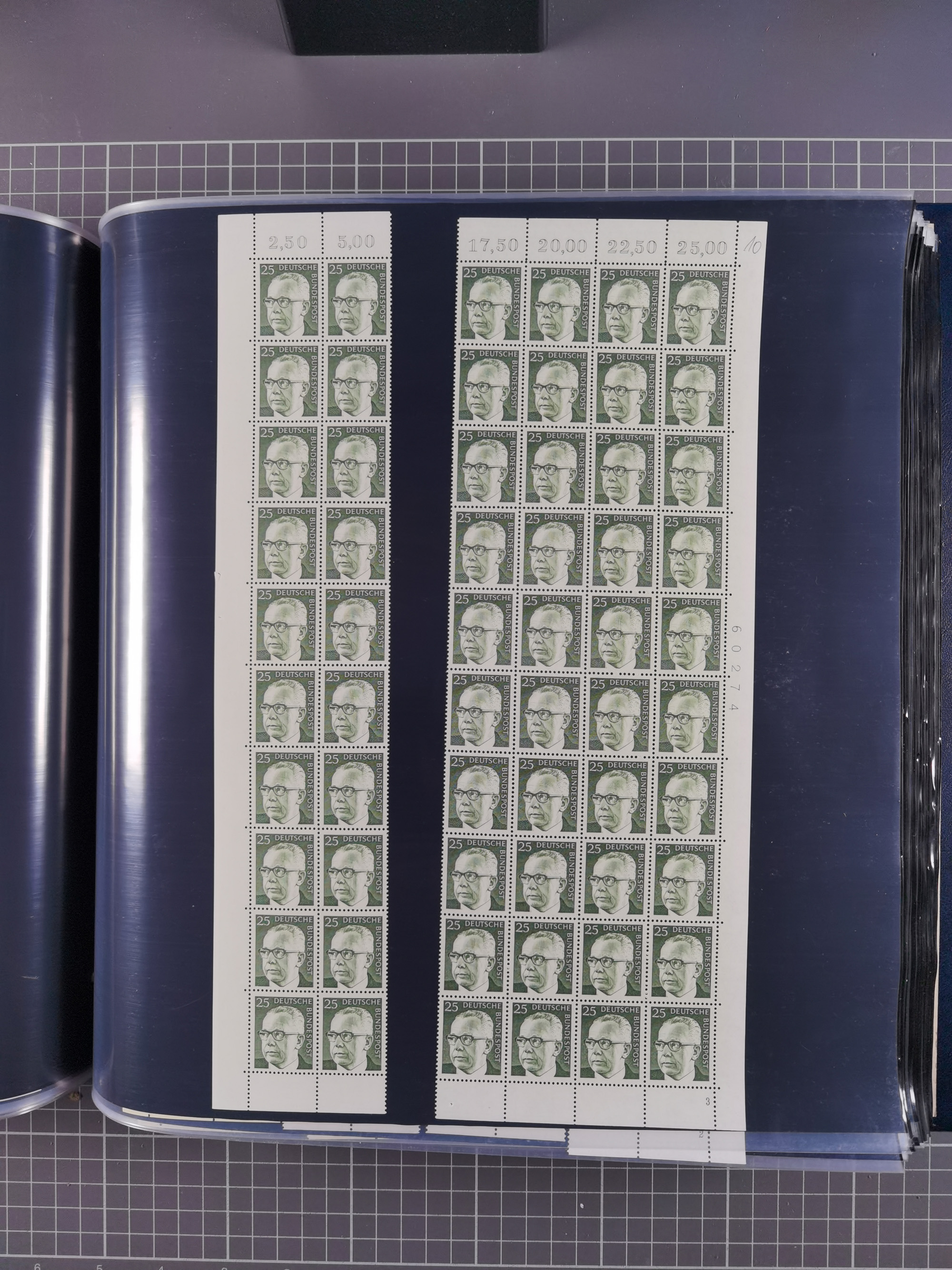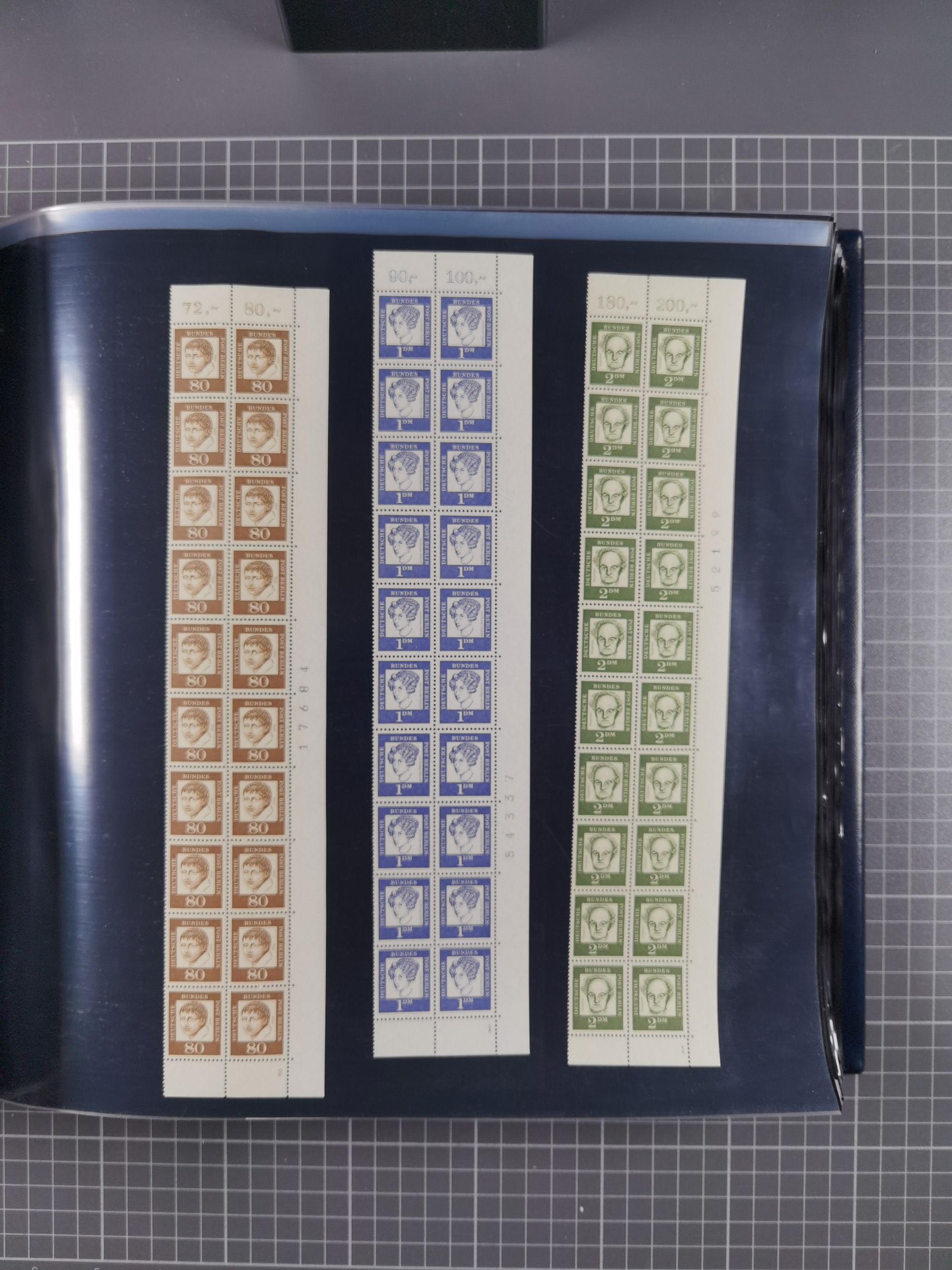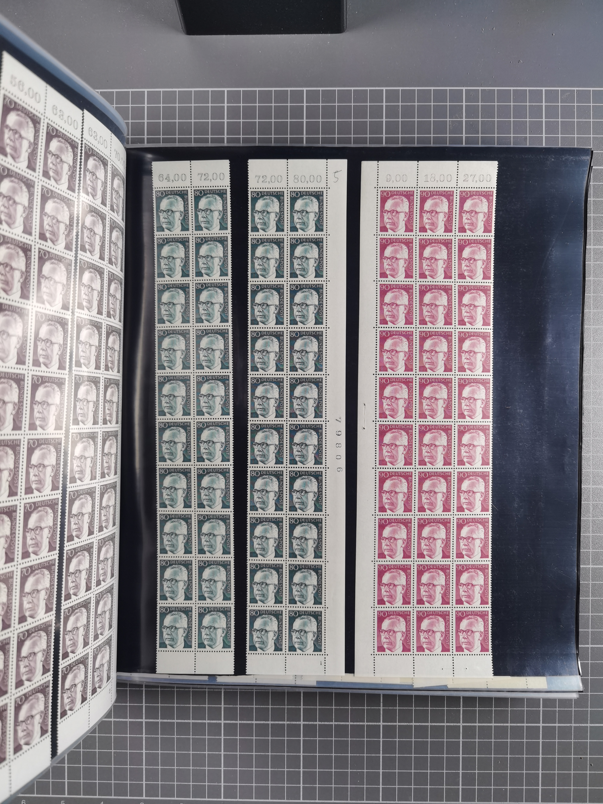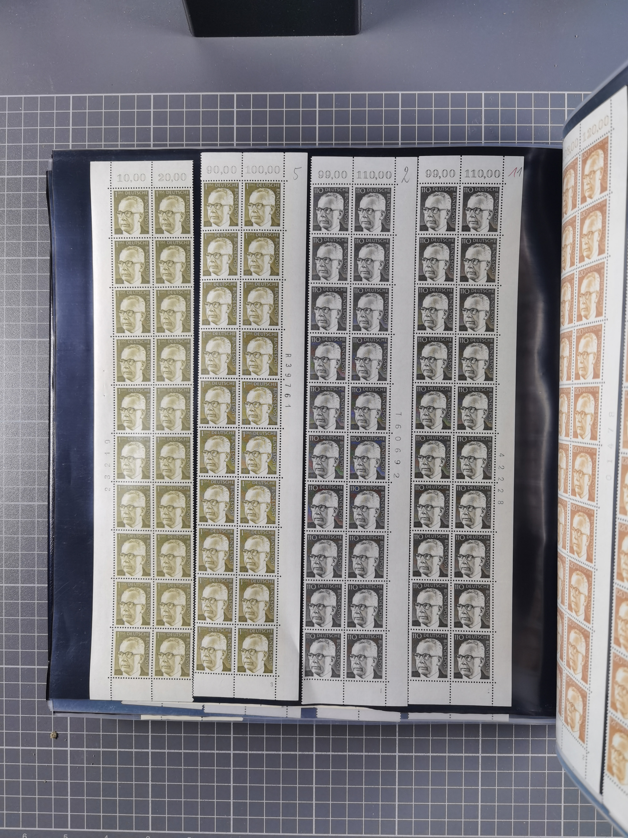 1960/75. postfrische Bogenteile der Dauerserien ab Bedeutende Deutsche, dabei Formnummern und Berlin mit u.a. Mi.-Nr. 246-49 jeweils im 20er-Bogenteil rechts mit 10 waagerechten Paaren, in Bogenmappe