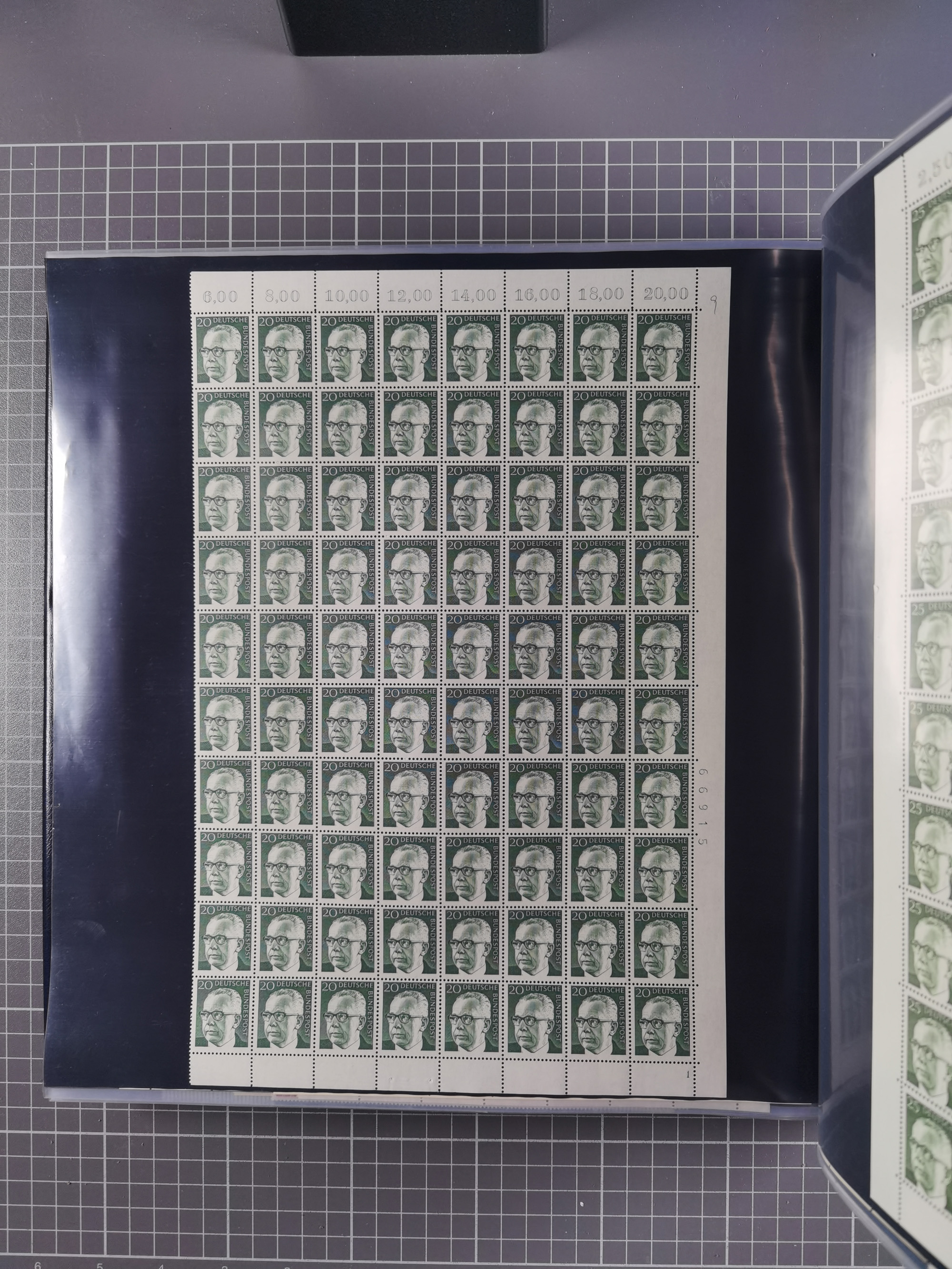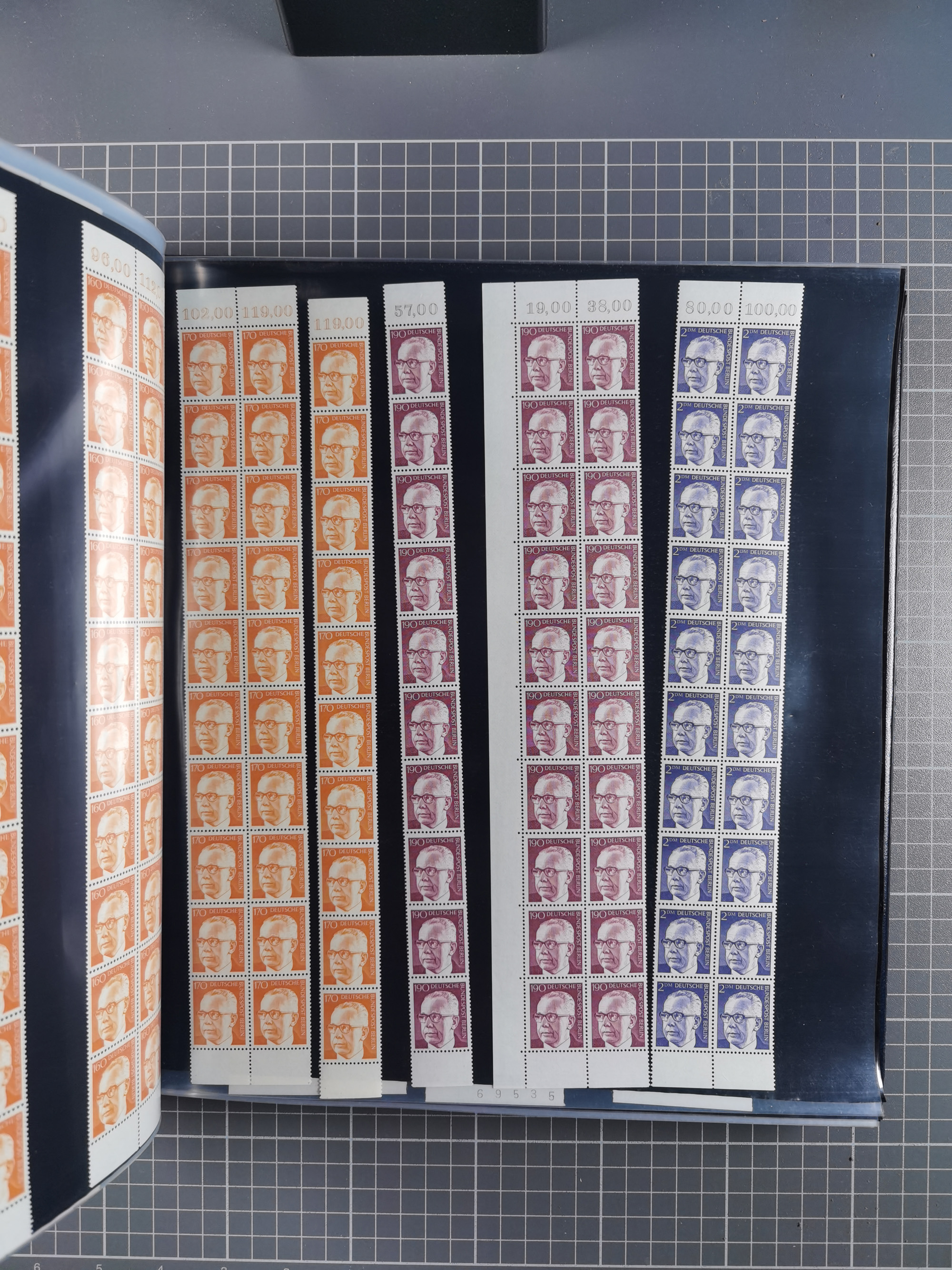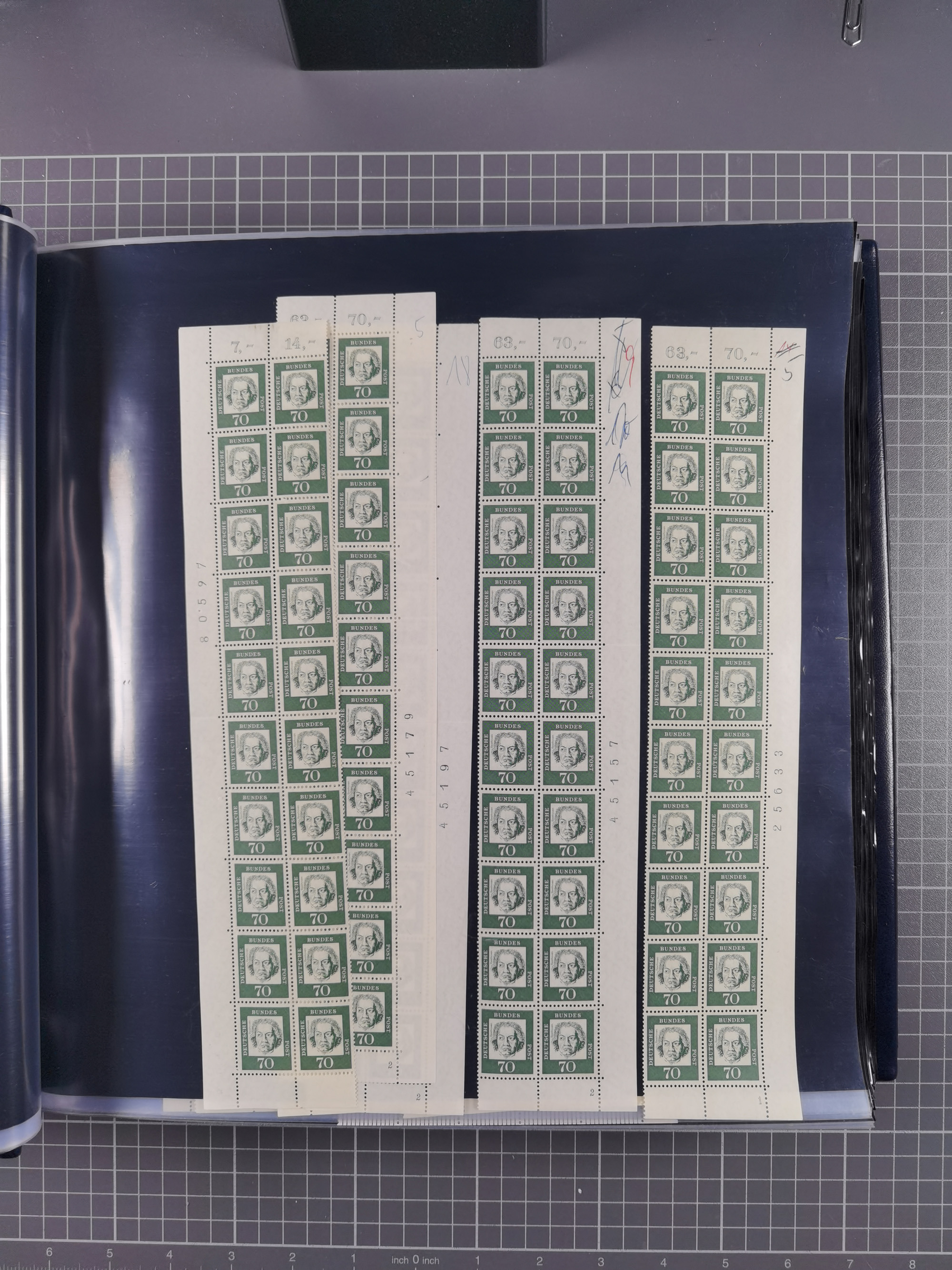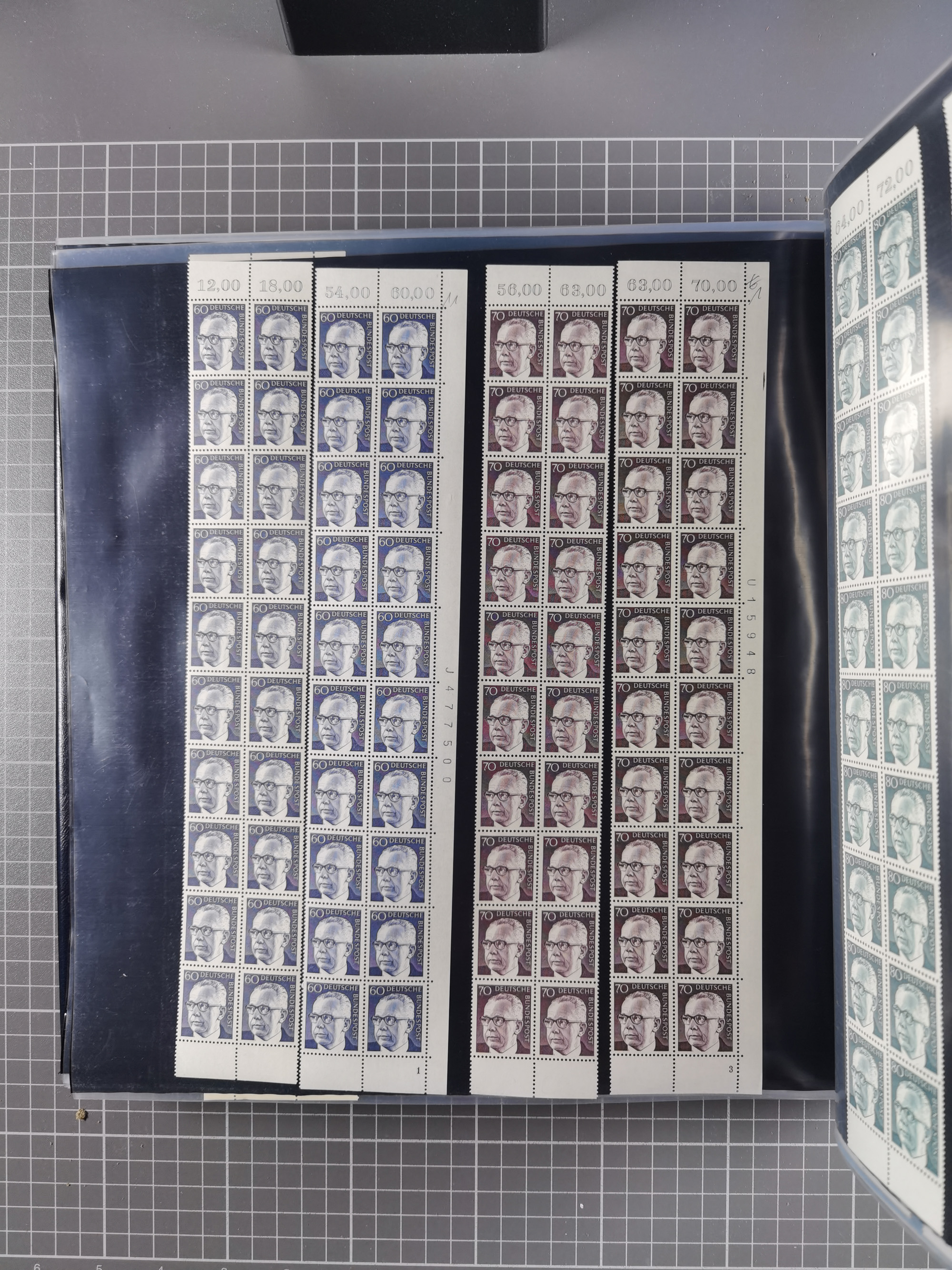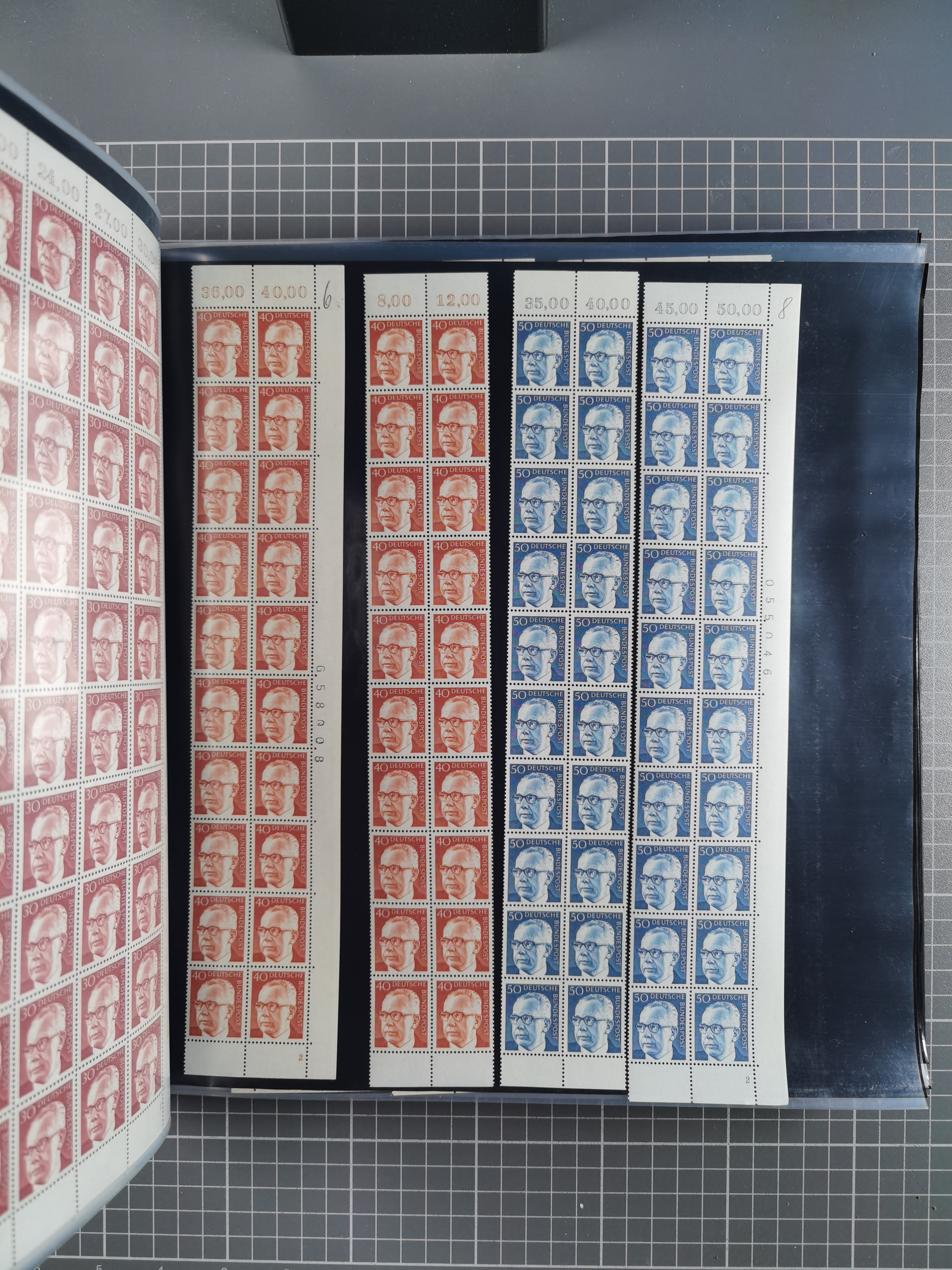 1960/75. postfrische Bogenteile der Dauerserien ab Bedeutende Deutsche, dabei Formnummern und Berlin mit u.a. Mi.-Nr. 246-49 jeweils im 20er-Bogenteil rechts mit 10 waagerechten Paaren, in Bogenmappe