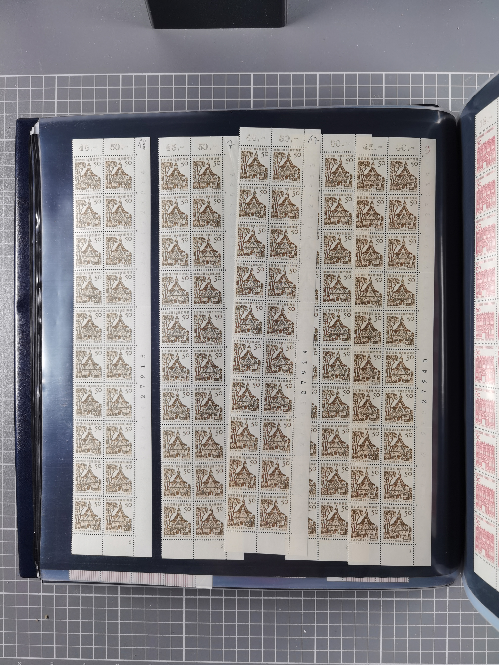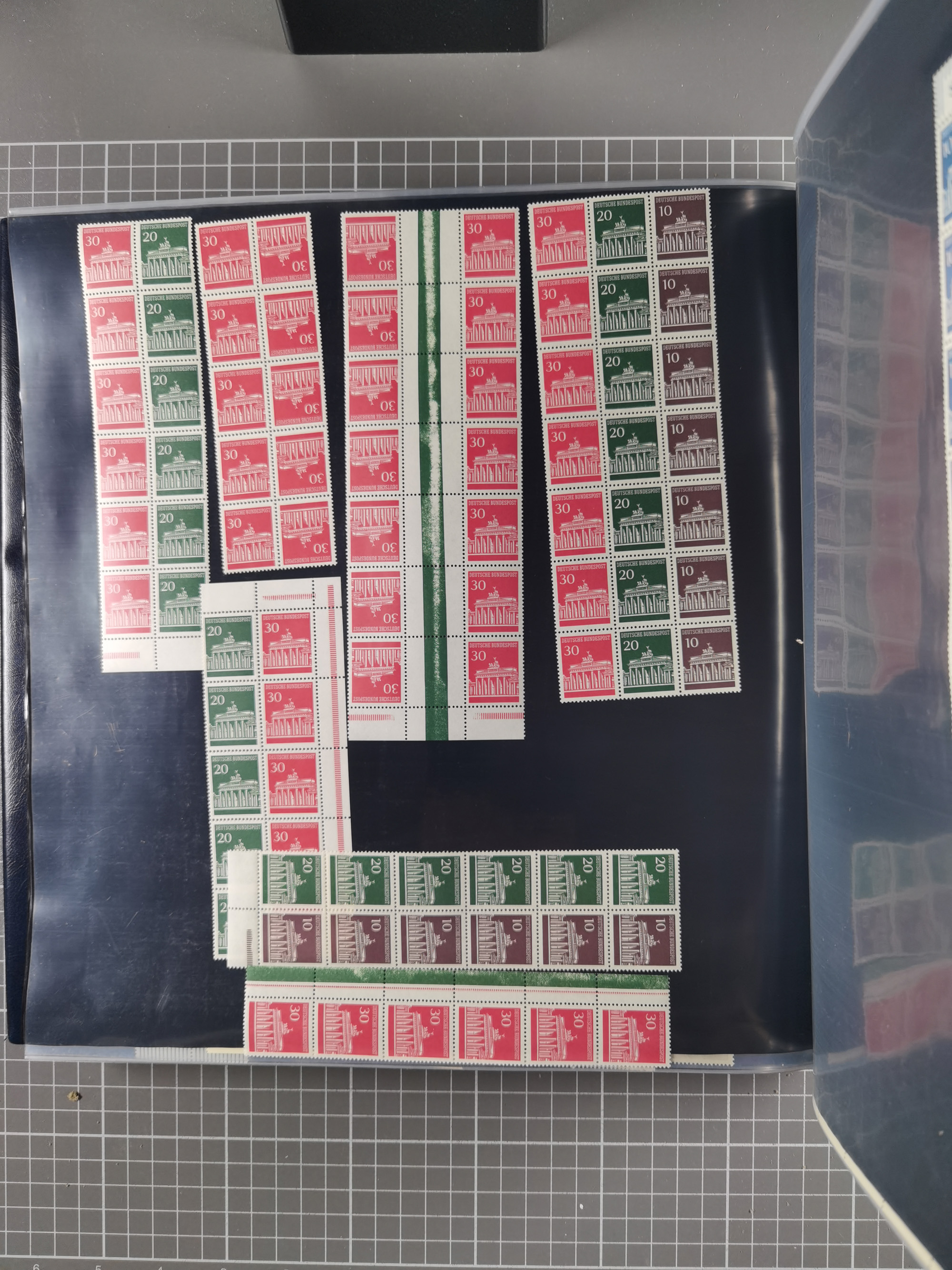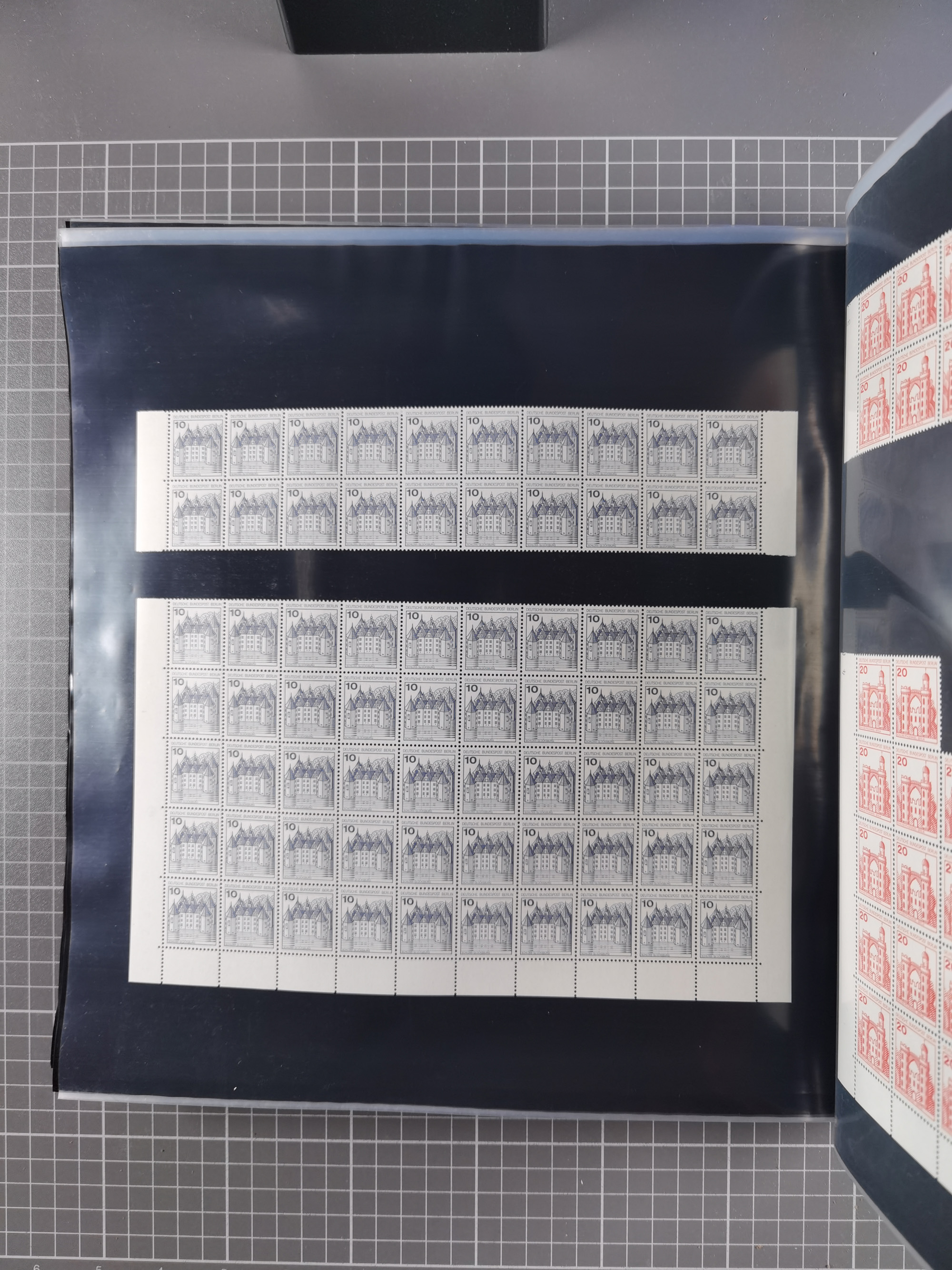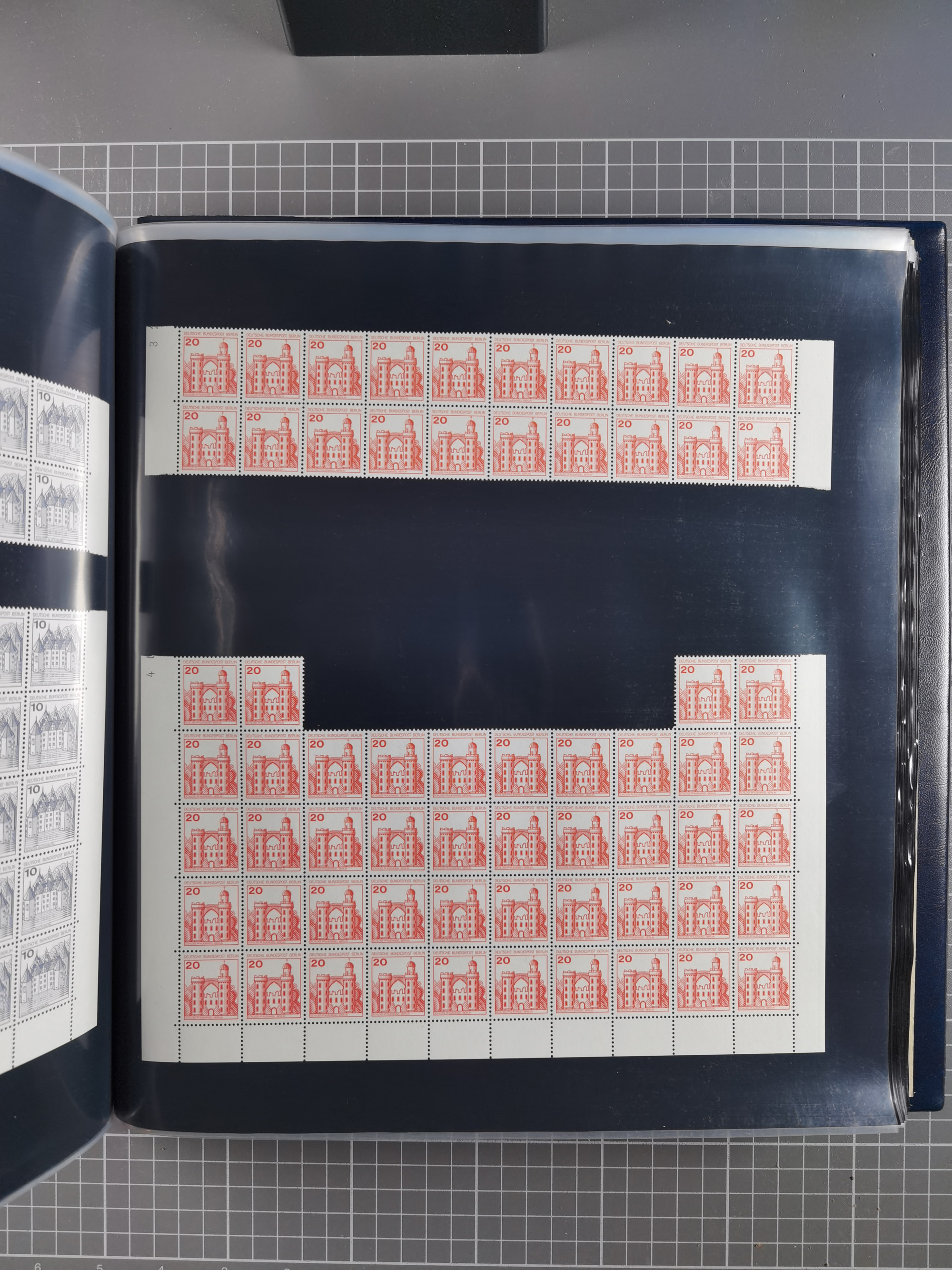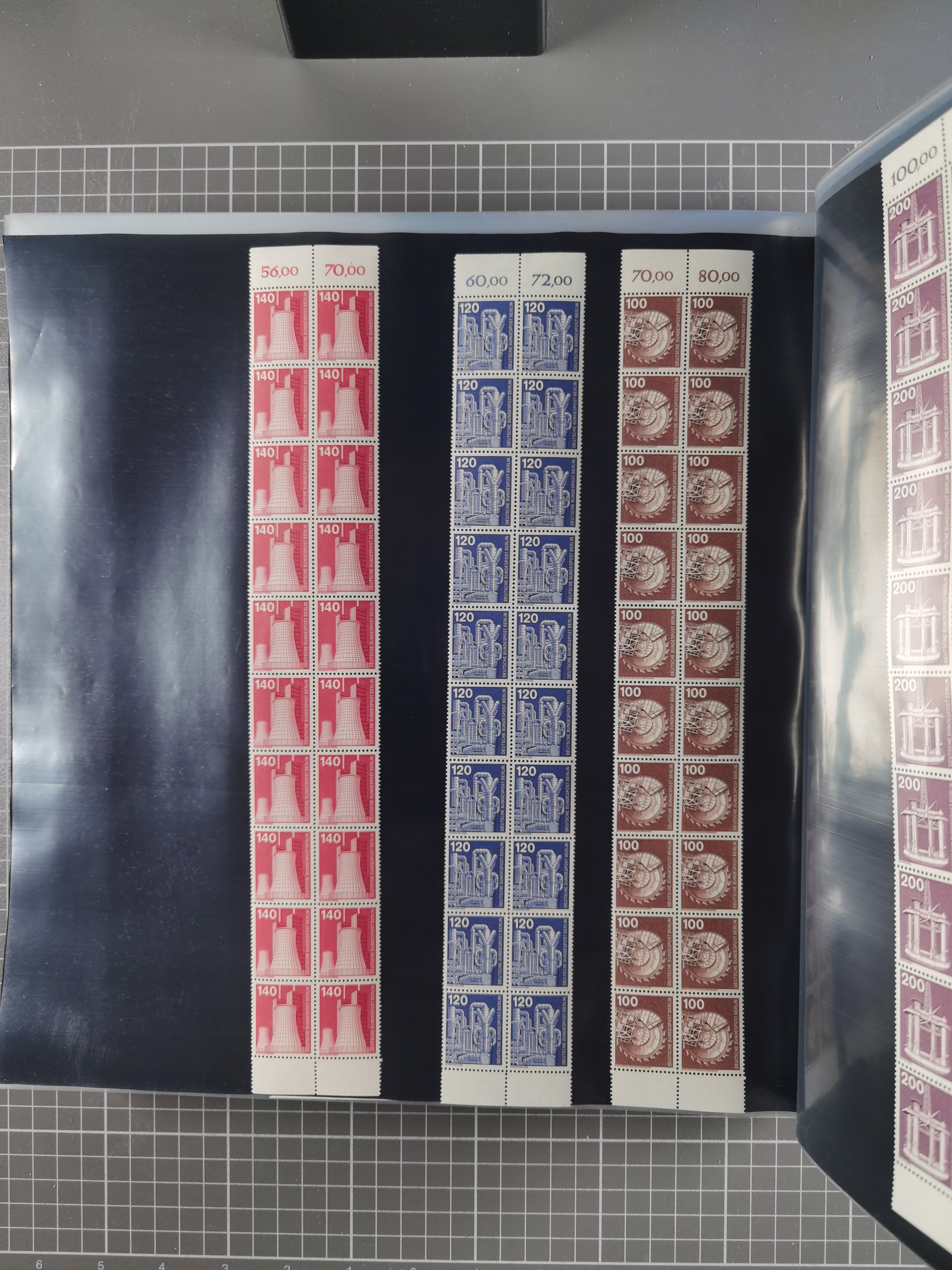 1960/75. postfrische Bogenteile der Dauerserien ab Bedeutende Deutsche, dabei Formnummern und Berlin mit u.a. Mi.-Nr. 246-49 jeweils im 20er-Bogenteil rechts mit 10 waagerechten Paaren, in Bogenmappe