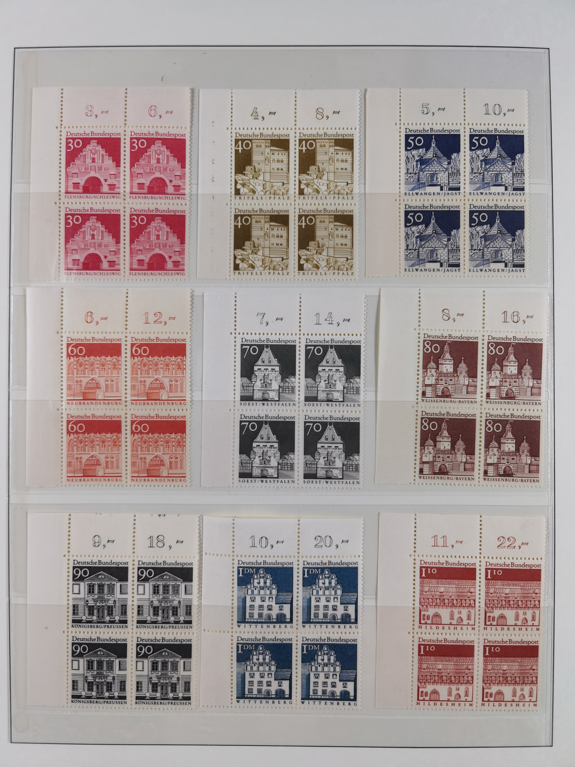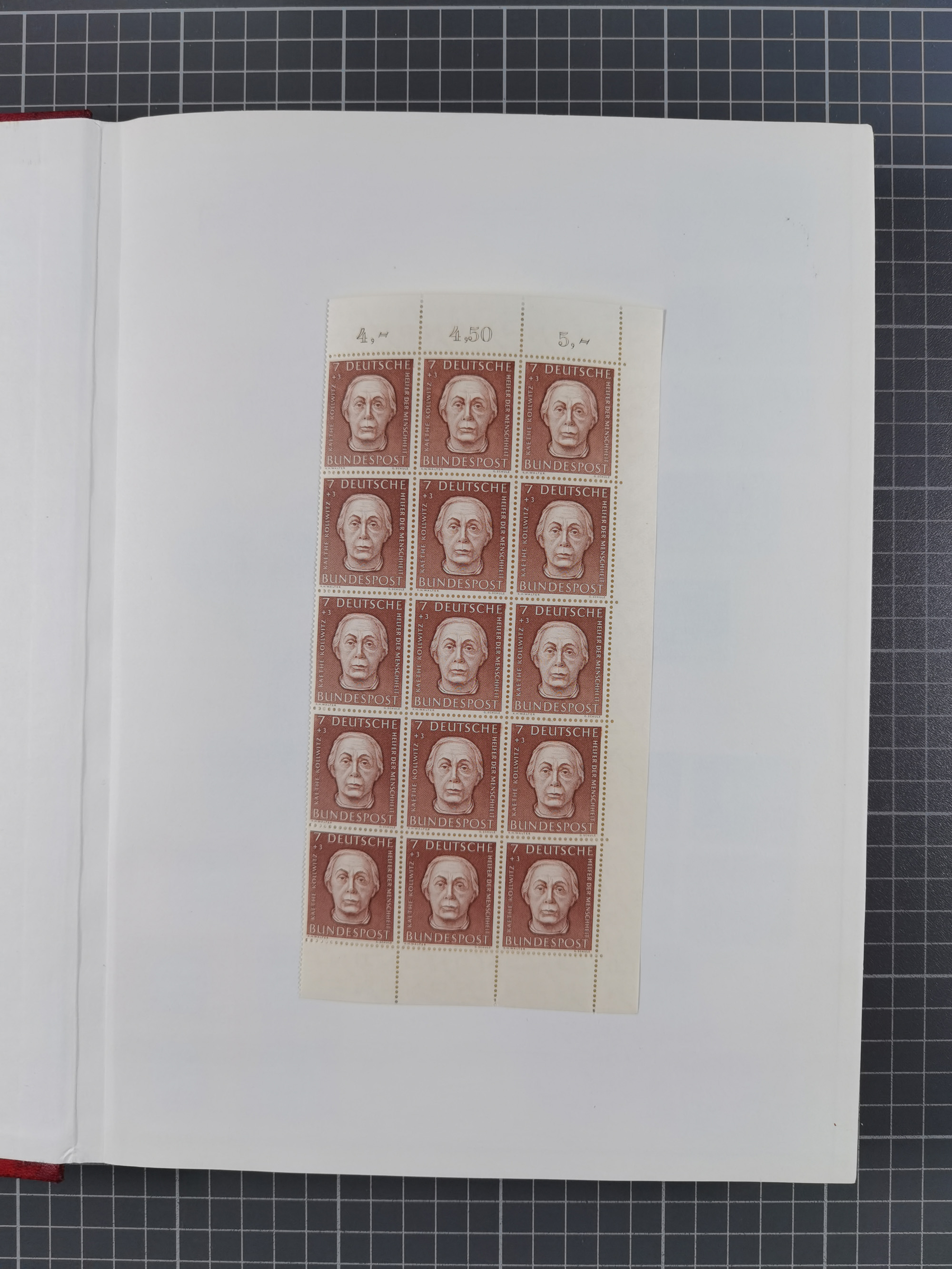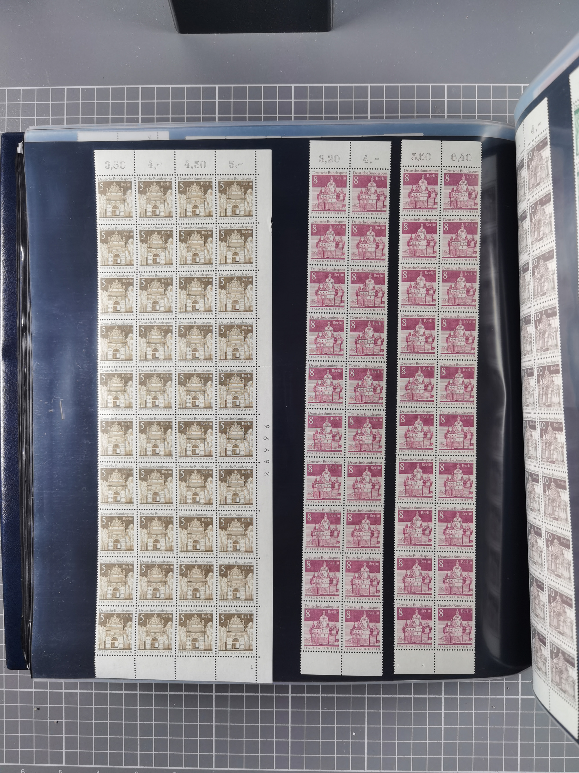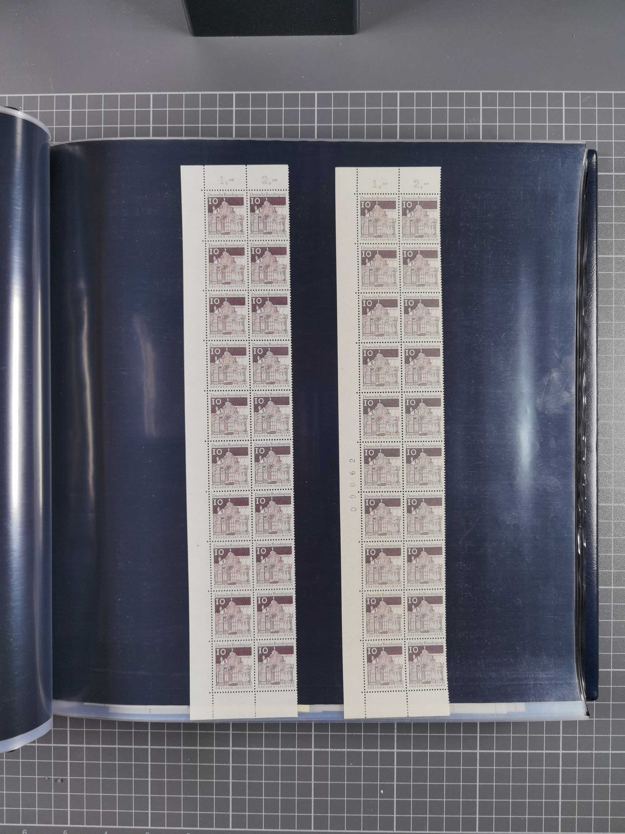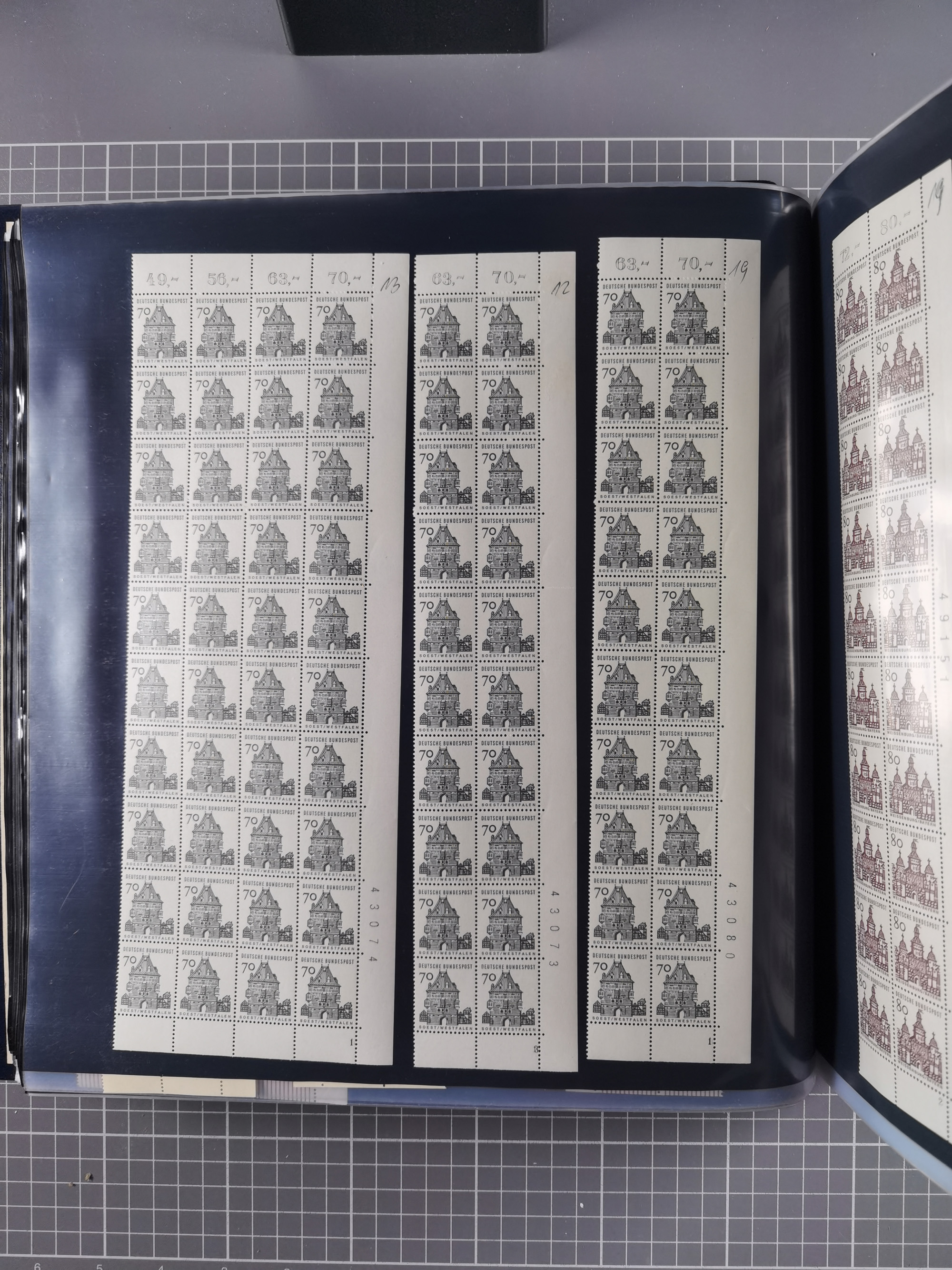 1960/75. postfrische Bogenteile der Dauerserien ab Bedeutende Deutsche, dabei Formnummern und Berlin mit u.a. Mi.-Nr. 246-49 jeweils im 20er-Bogenteil rechts mit 10 waagerechten Paaren, in Bogenmappe