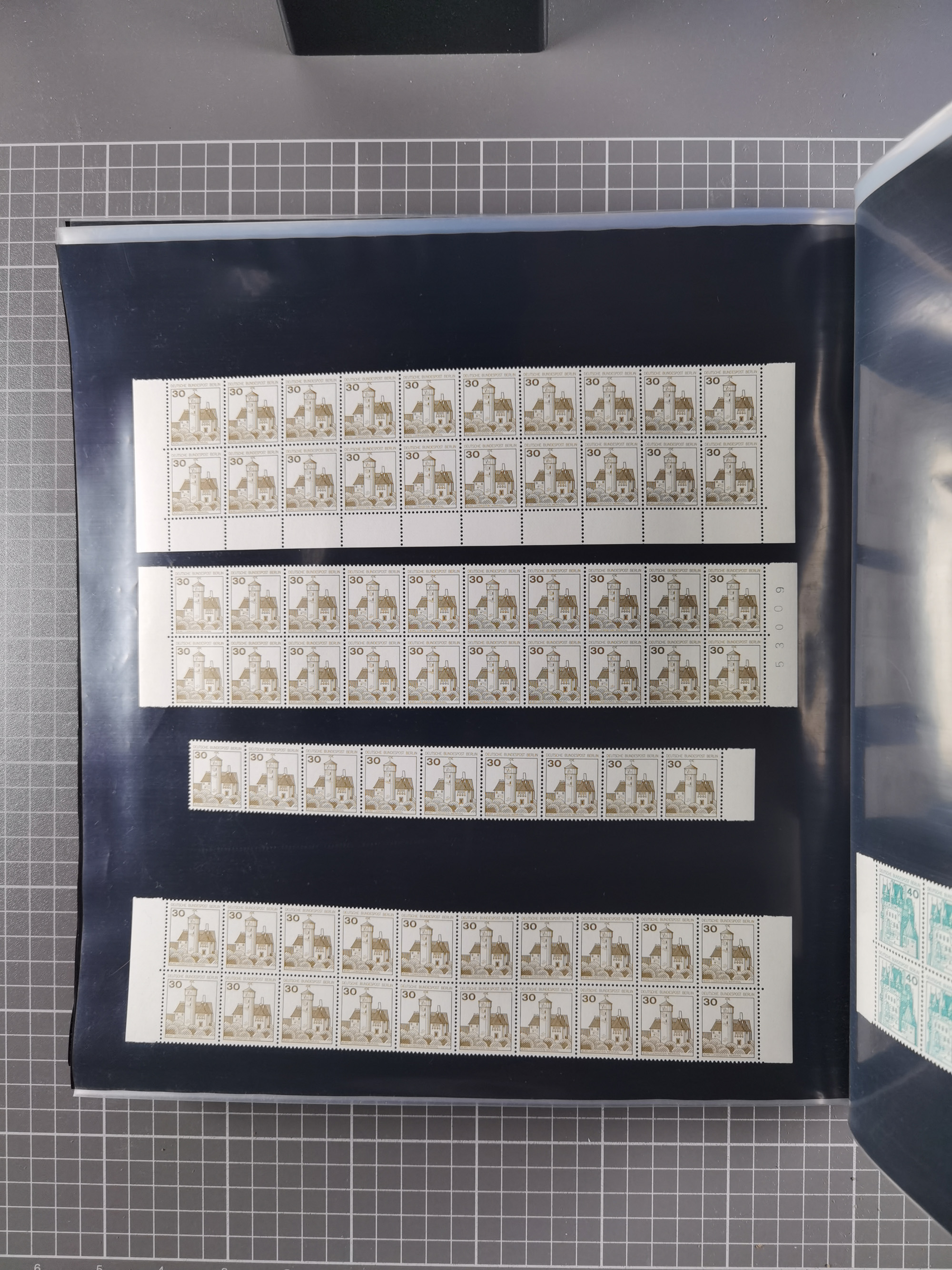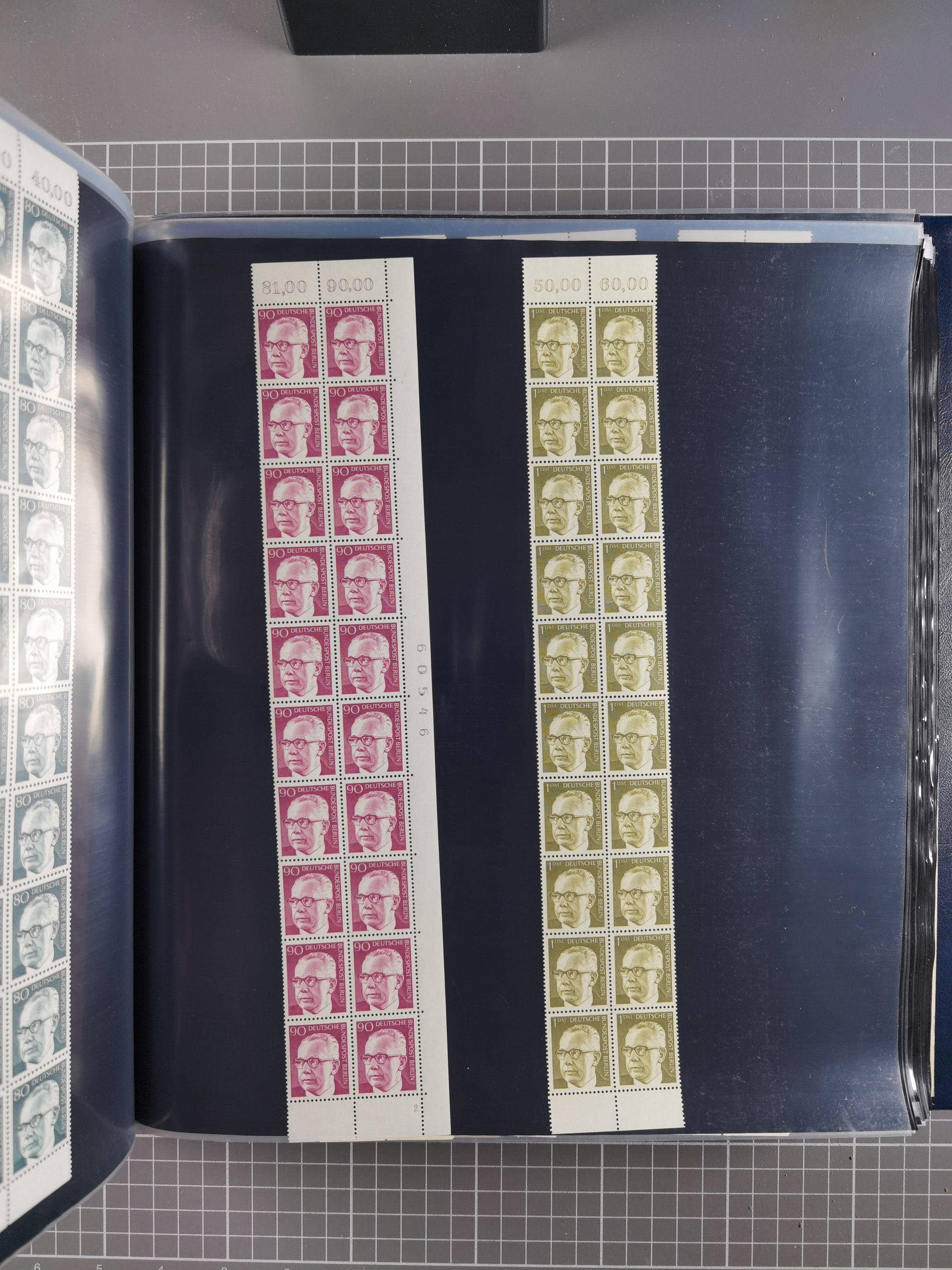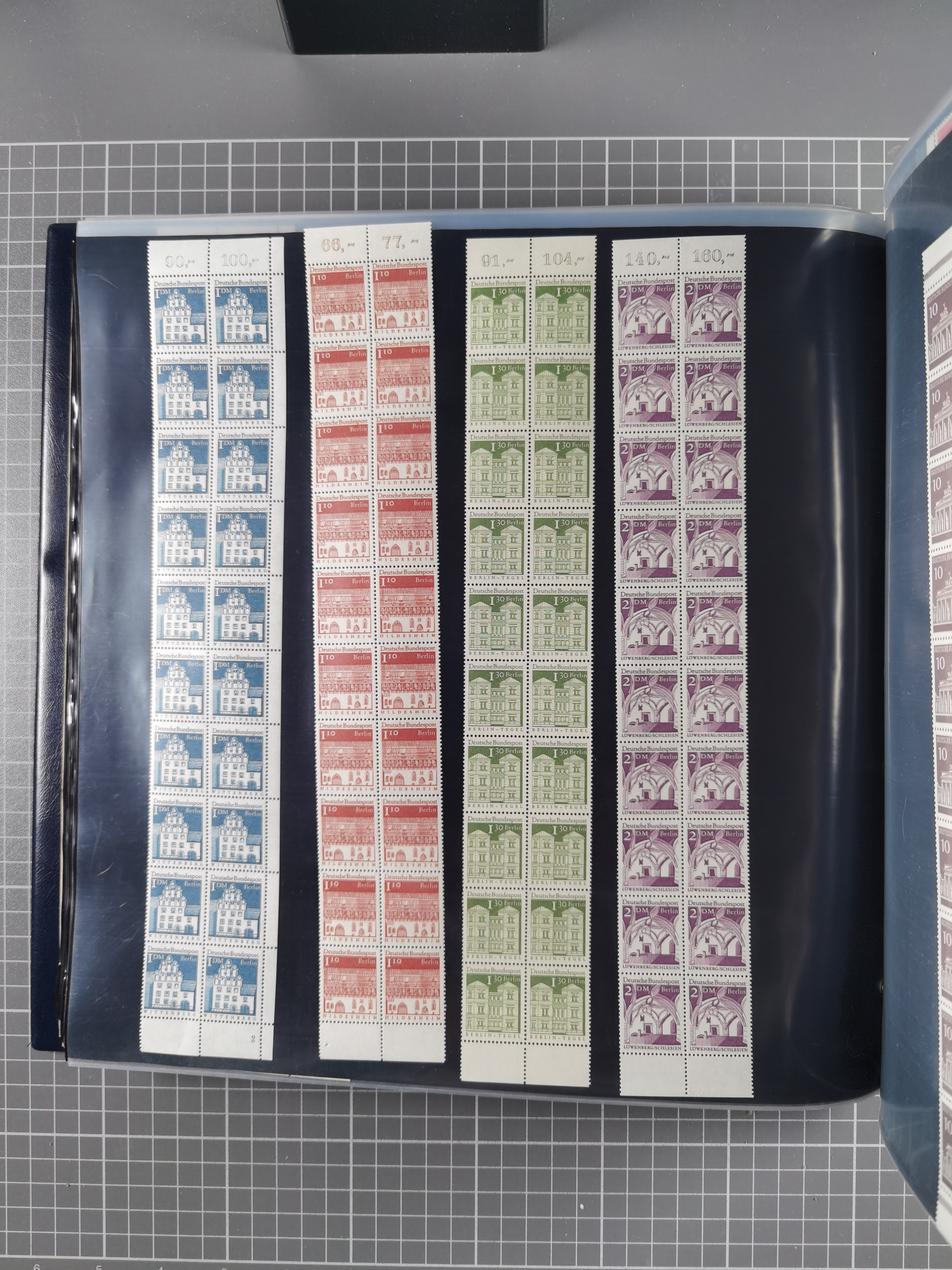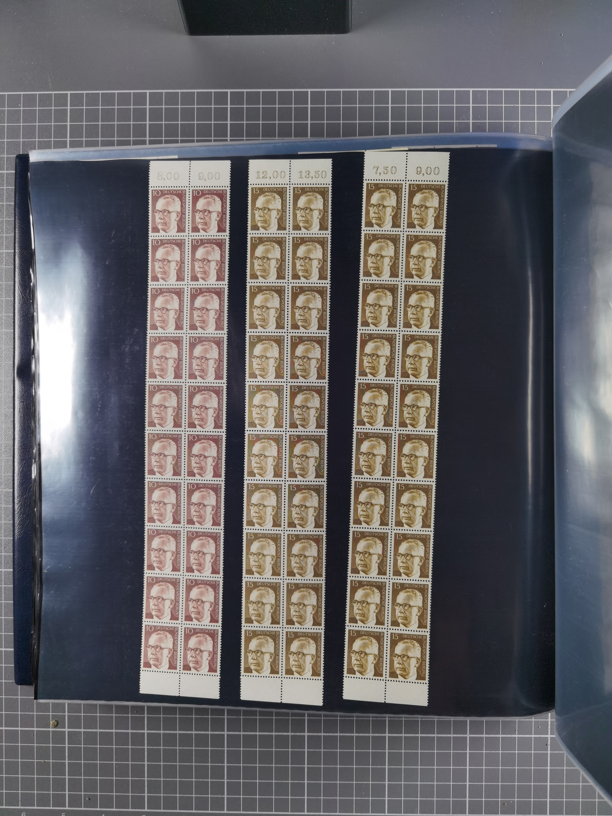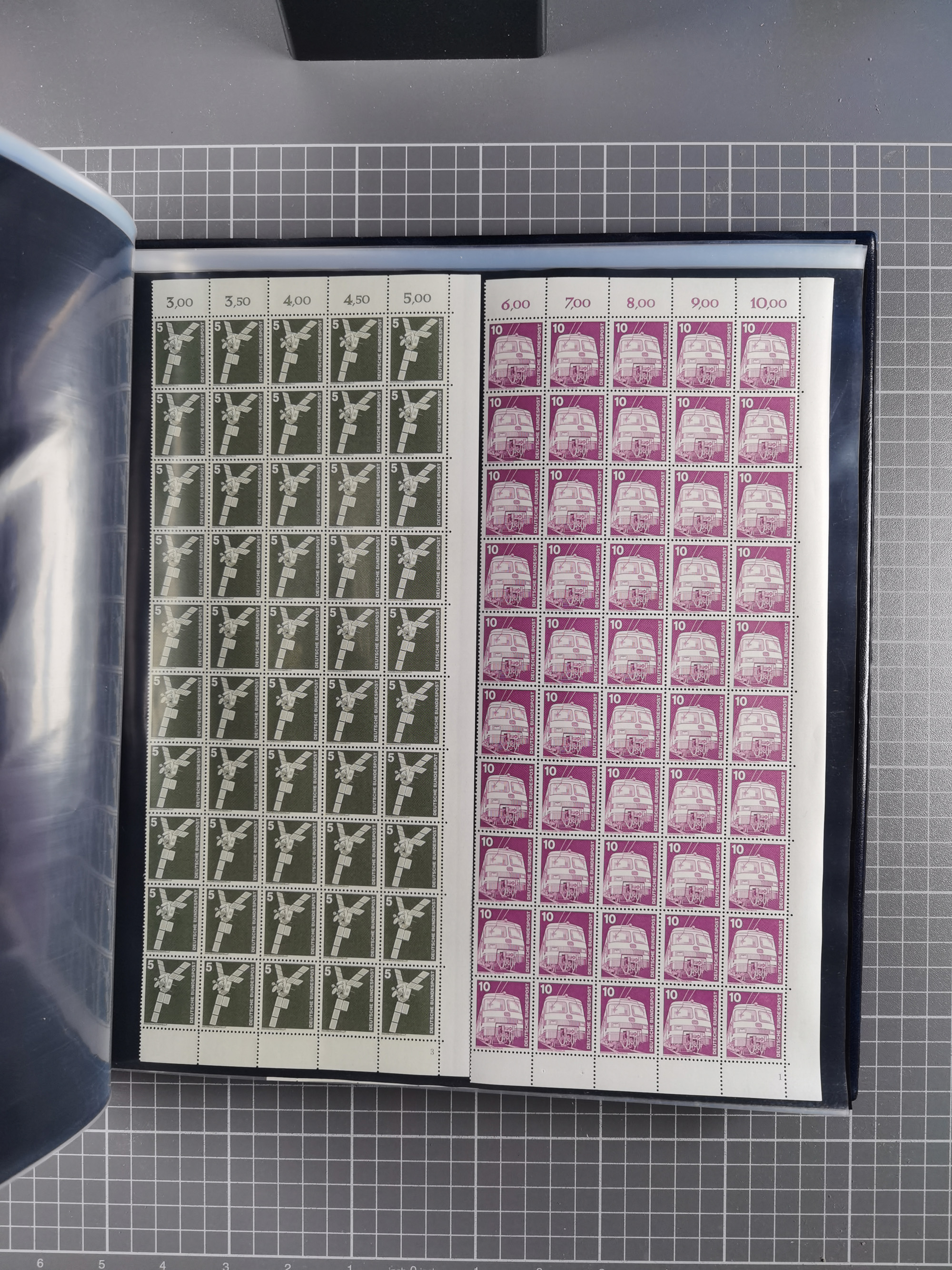 1960/75. postfrische Bogenteile der Dauerserien ab Bedeutende Deutsche, dabei Formnummern und Berlin mit u.a. Mi.-Nr. 246-49 jeweils im 20er-Bogenteil rechts mit 10 waagerechten Paaren, in Bogenmappe